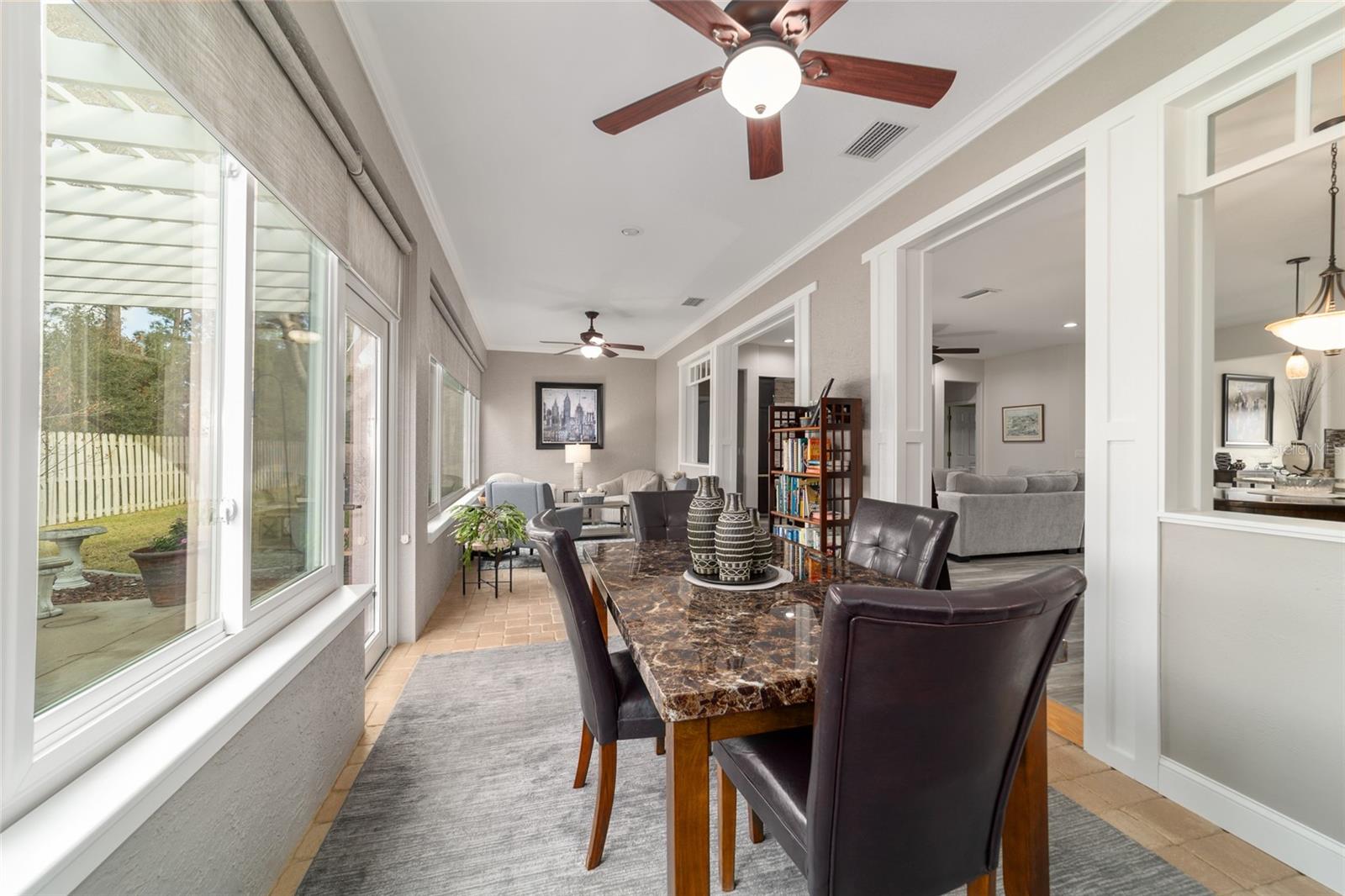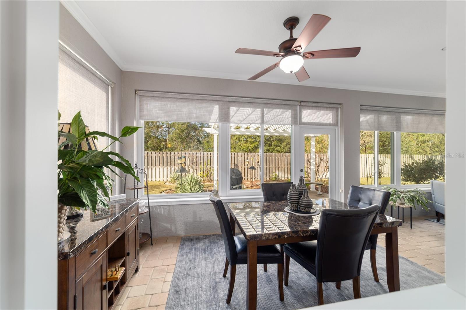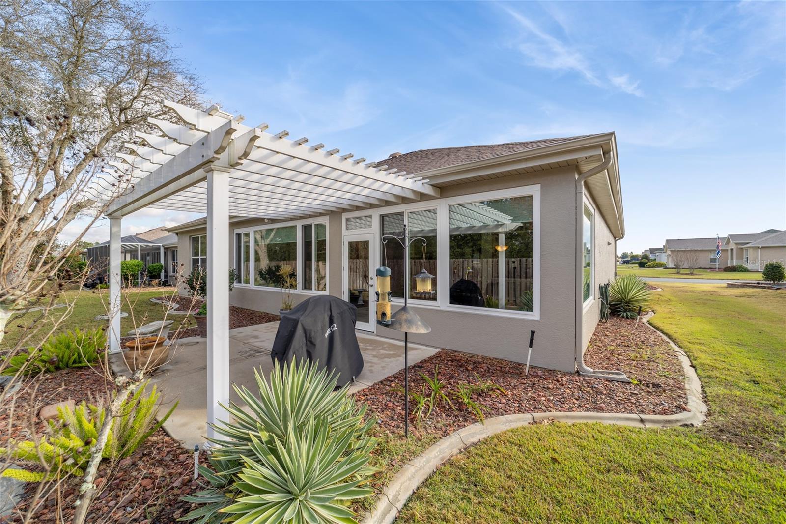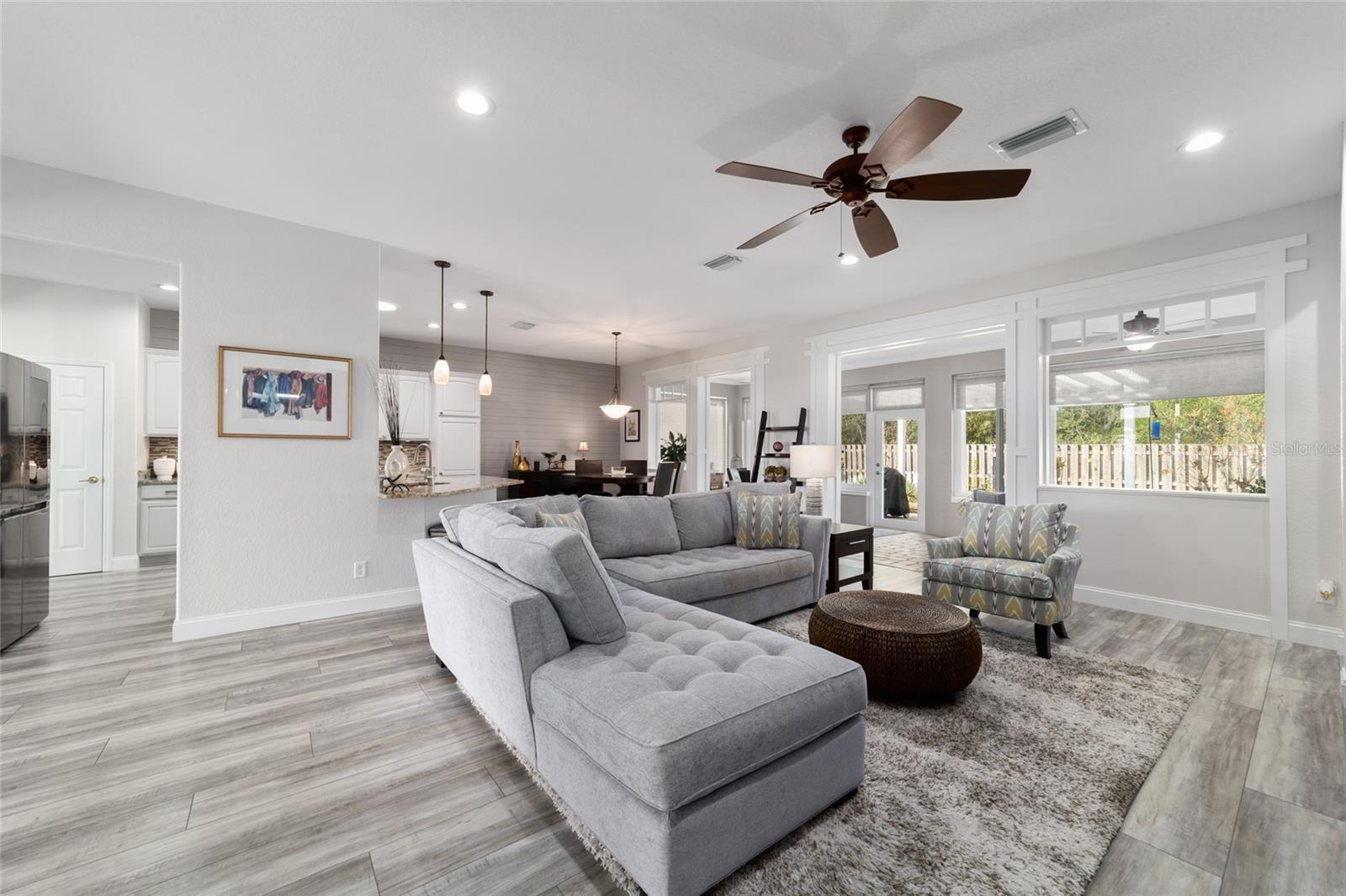 Welcome to this beautifully maintained Hanover floor plan3/2 Located in the highly desirable 55+ Del Webb Spruce Creek Golf & Country Club. This stucco home offers 1958 sq. ft. of living space, including the light filled Florida room, perfect for relaxing or entertaining. From the moment you arrive, you’ll notice the outstanding curb appeal, complete with a painted driveway and walkway, updated landscaping .Inside the open floor plan is enhanced by custom woodwork , recessed lighting, Interior highlights include Luxury vinyl plank flooring throughout newly purchased appliances, plus washer and dryer tiled back splash, and large kitchen. Updated bathrooms, including an en-suite with a beautiful walk-in shower and new fixtures. Plantation shutters, updated lighting, and ceiling fans , Enjoy seamless entertaining with the open Florida room, kitchen pass-through, and a private outdoor patio-perfect for morning coffee, grilling out, or evening gatherings. Major updates for peace of mind are roofing re-shingled (2021) HVAC (2017), This home combines modern updates with a highly functional layout, all within a vibrant community offering golf, recreation, and endless amenities.