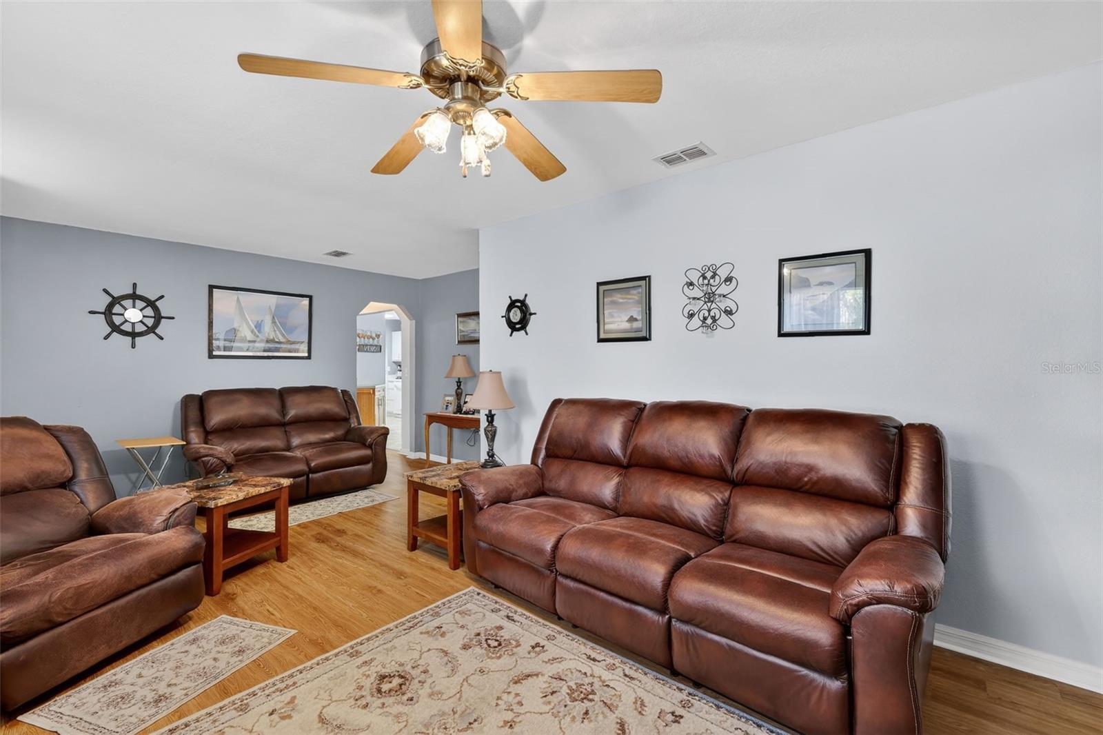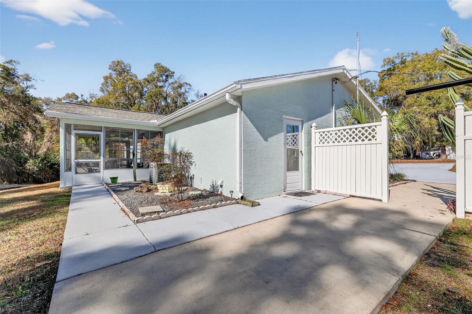 BRING TOUR TOOTHBRUSH and move right in! ALL FURNISHINGS STAY AS WELL AS SHEETS, TOWELS, DISHES, LAWN EQUIPMENT. BRING YOUR TOYS TOO! THERE IS A 24 x25 GARAGE WITH 50 AMP POWER, PEDESTRIAN DOOR, ROLL UP DOORS AND 2 ADDITONAL UTILTIY BUILDINGS. Well is protected by pump house and the tank is in the garage. The yard has vinyl fencing on left side and part of rear yard. This 3 bedroom 2 bath home has been well cared inside and outside and move in ready. There is a Galley Kitchen and room for table in kitchen. Sliding glass doors open to a Lanai that has vinyl windows and an open patio for grilling as well. The master with ensuite bath is split from the guest bedrooms. There are 2 lots being sold as one. The lots can be divided if the buyer wants to divide. There is a utility easement on the right lot in the event that Marion County Utilities decides to put in water and sewer lines. The air conditioner was totally reworked in 2025 ROOF replaced 12/24 Electric bill averages $100 per month!