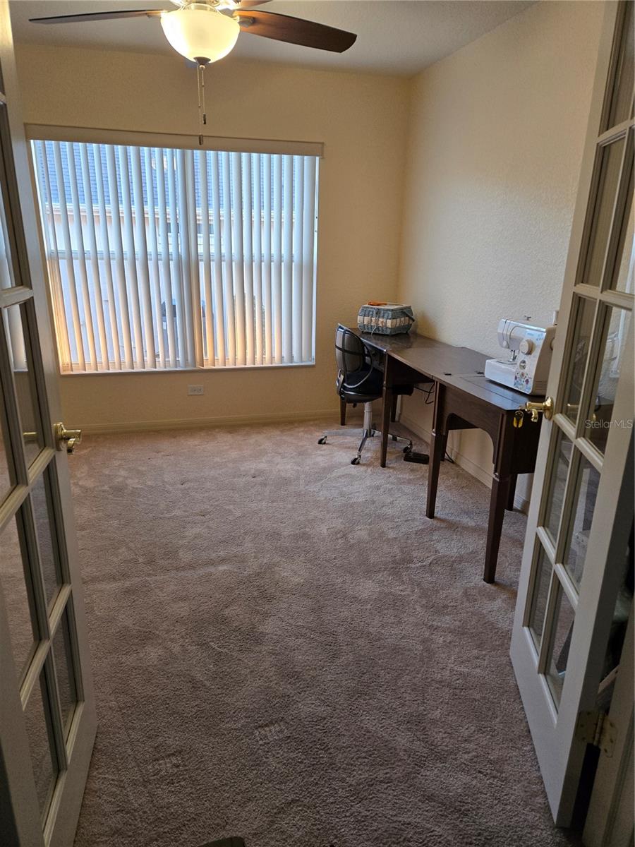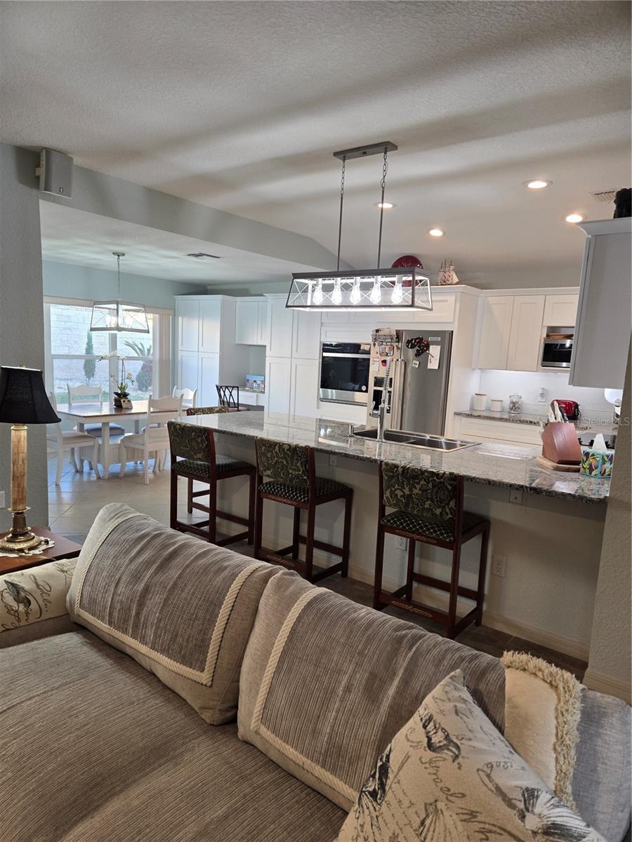 Located in the desirable Del Webb Spruce Creek Golf & Country Club in Summerfield, this extensively updated expanded Citation Model combines quality craftsmanship with thoughtful design. Surrounded by scenic golf views, ponds, and tree-lined streets, the community sets the tone for relaxed, active living. Inside, the home offers 2 bedrooms, 2 bathrooms, a den, and an added 10' x 15' flex room that includes a 9-foot closet along with built-in cabinetry and countertops, providing valuable additional living space perfect for work or creative pursuits. Natural light fills the home, enhancing the open and inviting layout. 2025 Roof, 2021 A/C. The fully remodeled kitchen features 23 solid wood cabinets, a generous 10.5-foot granite breakfast bar, specialty cabinetry, two pantries, and a built-in work desk. Under-cabinet and upper cabinet lighting add warmth and sophistication, making this kitchen both practical and impressive. Designed for entertaining, triple sliding glass doors lead to a screened lanai, while an additional set of quadruple sliders opens to a spacious 29’ x 18’ poured concrete patio. Surround sound in the common areas adds to the entertainment appeal. Recent improvements include gutters, garage door opener, and bottom garage seal installed in 2025, along with a whole-house water filtration system and electrical surge protection. The garage also features a dedicated dog wash station, and the landscaping has been thoughtfully designed for low-maintenance upkeep. With quality upgrades throughout and meticulous care evident in every detail, this home offers comfort, functionality, and peace of mind in one exceptional package.