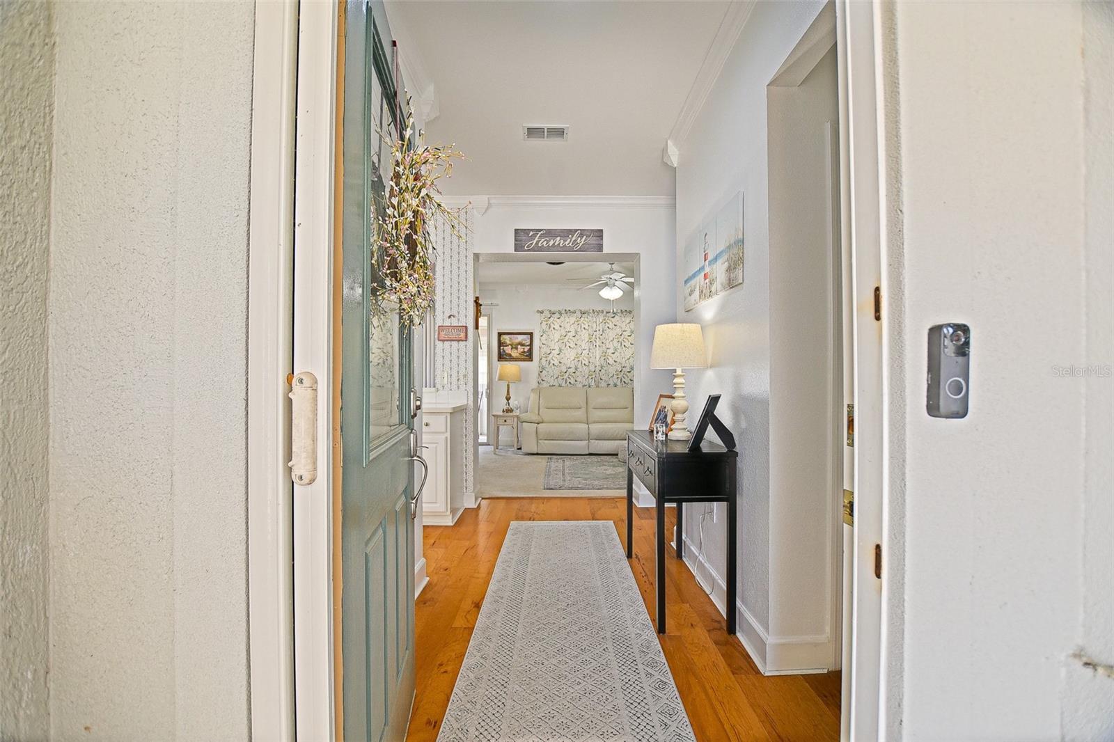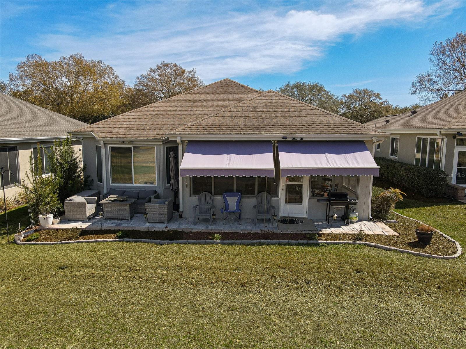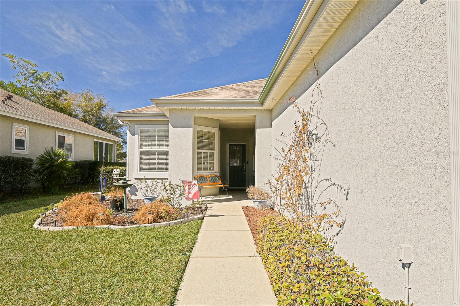 Stunning Golf course Patio Home-Former Model in Del Webb Spruce Creek Golf & Country Club! Beautifully maintained and ideally located on the 9th fairway of the Memorial Golf Course, this charming Kingston patio floor plan offers the perfect blend of comfort, updates, and scenic golf course living. Originally a Del Webb model home, this residence features 9-foot ceilings, mature landscaping, and thoughtful designer touches throughout. From the moment you arrive, the home showcases inviting curb appeal with mature landscape, and inviting front porch, and a screened garage door. Enter through the leaded glass front door and discover beautiful hickory hardwood flooring that flows throughout the hallway, kitchen, breakfast nook, and guest bathroom. The bright kitchen features white cabinetry, Carian countertops, new LED lighting, and a breakfast bar that overlooks the open living area, creating a comfortable space for everyday living and entertaining. The breakfast nook with charming wainscoting offers the perfect spot for casual dining. The primary suite includes elegant designer details, a bow window, crown molding, and peaceful golf course views. Both bathrooms are spacious, and the entire home features crown molding and 6 inch baseboards, adding a refined touch throughout. Step outside to the lania for added living space and additional views with glass windows. Enjoy the Florida lifestyle with breathtaking golf course views from the outdoor patio-perfect for relaxing and enjoying sunsets over the fairway, the retractable awnings allow all day use of this outdoor space. Recent updated and features include: Roof (2014), water heater (2023), LED lighting throughout, New faucets, new toilets with bidets, shower head, new shower door in primary bath with grab bar, water softener, garage sink, extra refrigerator, and portable generator. This home is available turnkey, making it a fantastic opportunity for a seasonal or full-time residence. Additionally, included is the golf cart with a rebuilt motor (approximately 3 years ago). All of this at a great value, don't miss your opportunity to own a piece of tranquility!