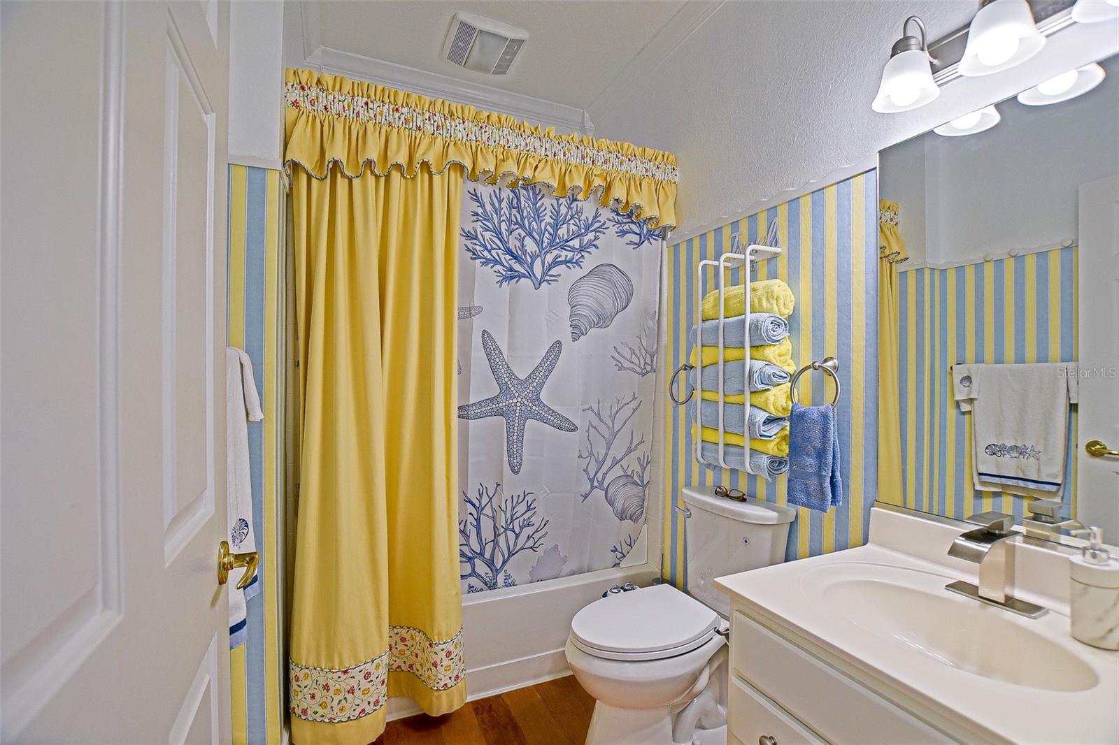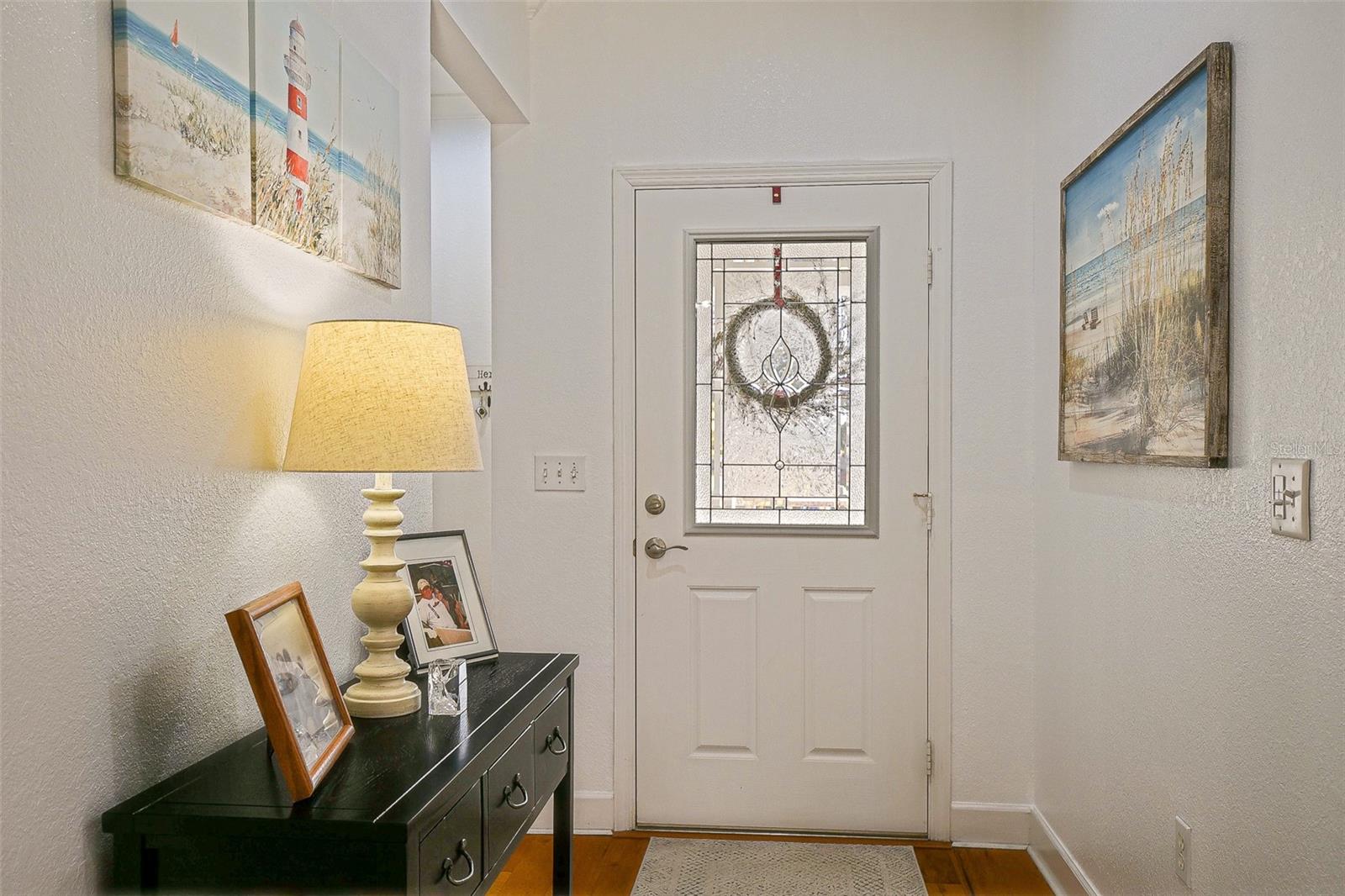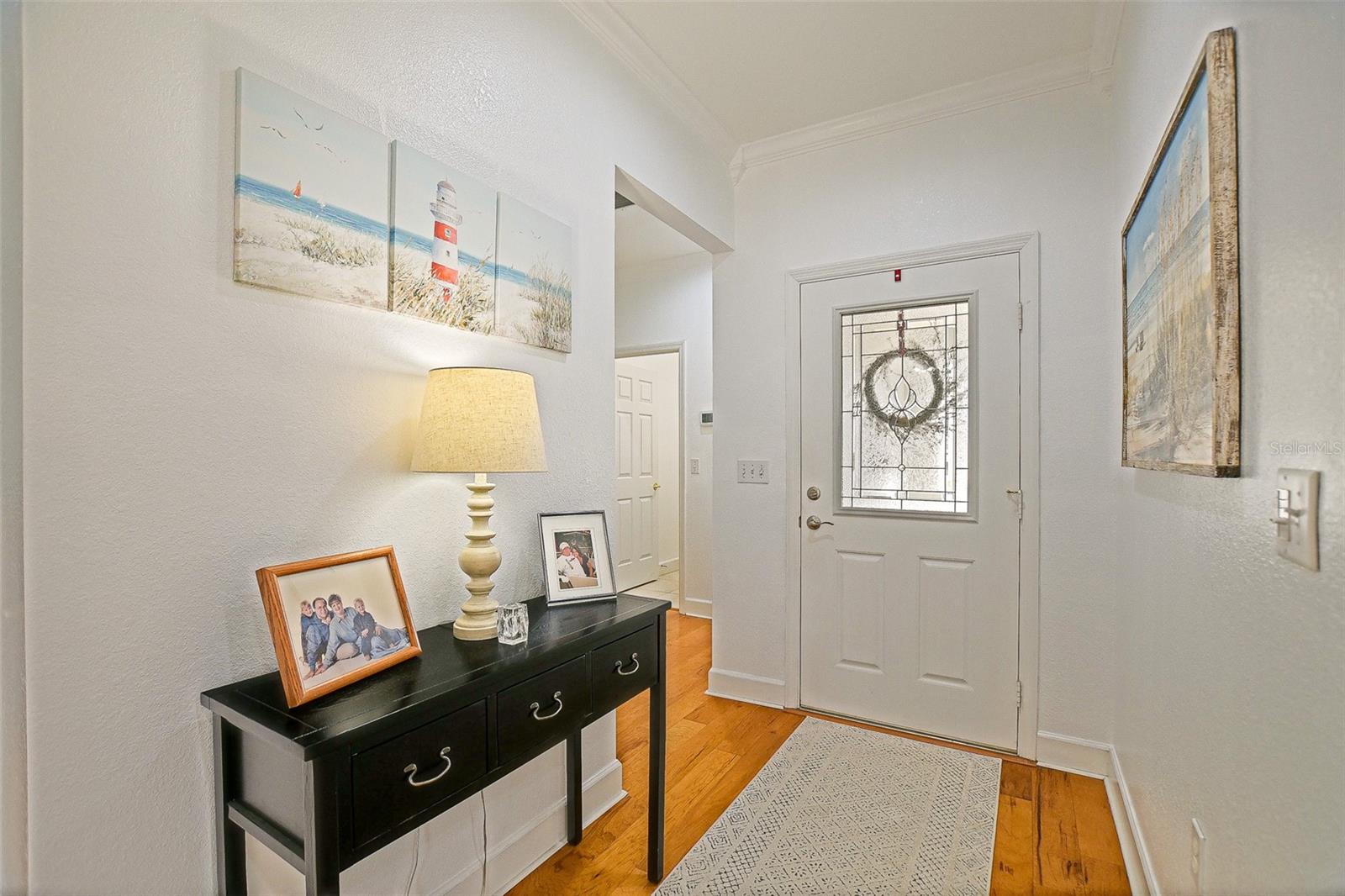 Stunning Golf course Patio Home-Former Model in Del Webb Spruce Creek Golf & Country Club! Beautifully maintained and ideally located on the 9th fairway of the Memorial Golf Course, this charming Kingston patio floor plan offers the perfect blend of comfort, updates, and scenic golf course living. Originally a Del Webb model home, this residence features 9-foot ceilings, mature landscaping, and thoughtful designer touches throughout. From the moment you arrive, the home showcases inviting curb appeal with mature landscape, and inviting front porch, and a screened garage door. Enter through the leaded glass front door and discover beautiful hickory hardwood flooring that flows throughout the hallway, kitchen, breakfast nook, and guest bathroom. The bright kitchen features white cabinetry, Carian countertops, new LED lighting, and a breakfast bar that overlooks the open living area, creating a comfortable space for everyday living and entertaining. The breakfast nook with charming wainscoting offers the perfect spot for casual dining. The primary suite includes elegant designer details, a bow window, crown molding, and peaceful golf course views. Both bathrooms are spacious, and the entire home features crown molding and 6 inch baseboards, adding a refined touch throughout. Step outside to the lania for added living space and additional views with glass windows. Enjoy the Florida lifestyle with breathtaking golf course views from the outdoor patio-perfect for relaxing and enjoying sunsets over the fairway, the retractable awnings allow all day use of this outdoor space. Recent updated and features include: Roof (2014), water heater (2023), LED lighting throughout, New faucets, new toilets with bidets, shower head, new shower door in primary bath with grab bar, water softener, garage sink, extra refrigerator, and portable generator. This home is available turnkey, making it a fantastic opportunity for a seasonal or full-time residence. Additionally, included is the golf cart with a rebuilt motor (approximately 3 years ago). All of this at a great value, don't miss your opportunity to own a piece of tranquility!