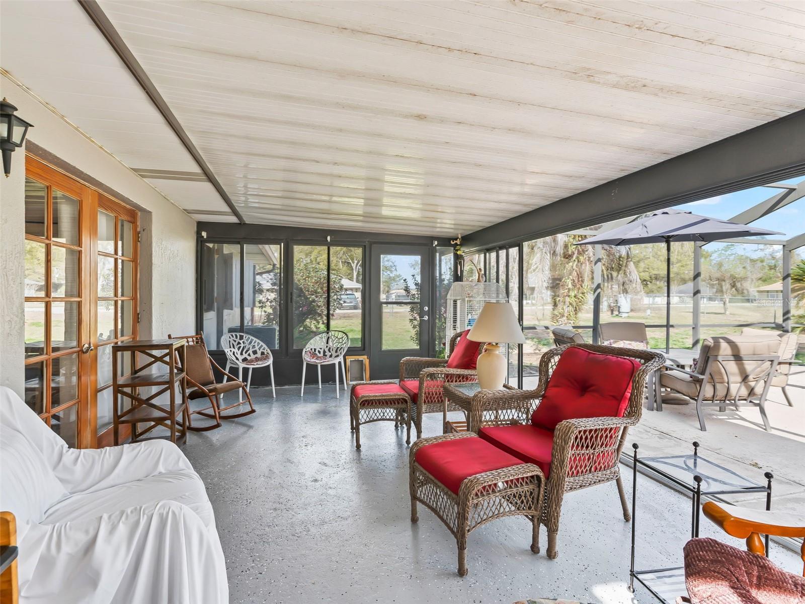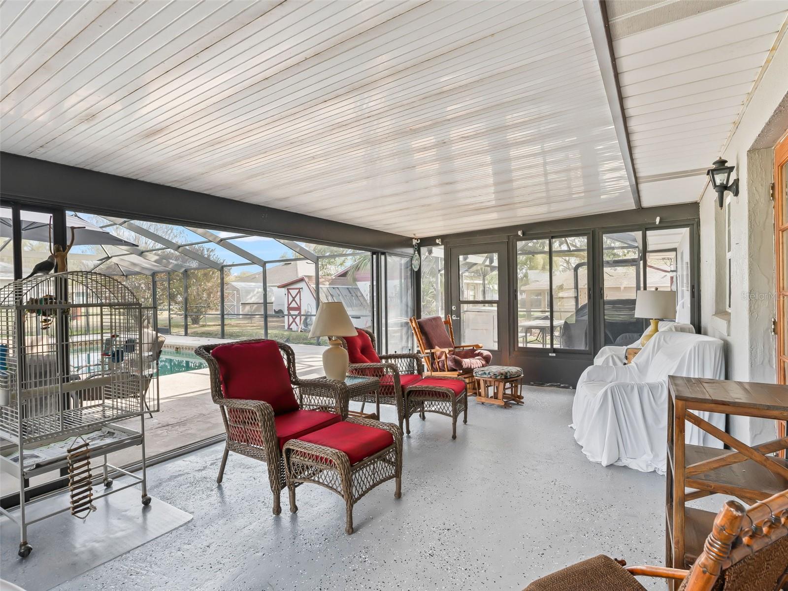 A lovingly refined 3 Bedroom / 2 Bathroom pool home situated in the HOA-free community of Orange Blossom Hills. This 1974 classic sits on a generous corner lot of nearly half an acre and offers a rare combination of indoor comfort and exceptional outdoor amenities. The fully fenced property is truly a hobbyist’s paradise, featuring mature landscaping, a spacious workshop, dedicated greenhouse, and a 2-car garage. The enclosed lanai opens to a large screened pool and entertaining area, creating the perfect setting to relax, host guests, or enjoy Florida’s beautiful weather with plenty of extra space to create, grow, and play! Inside, this home showcases the warmth and character of hardwood floors throughout and a stunning fully renovated kitchen that blends modern convenience with classic charm. Pride of ownership is evident in every detail. Best of all, enjoy the close proximity to The Villages with the freedom of no HOA fees or restrictions, offering both convenience and flexibility rarely found in today’s market.