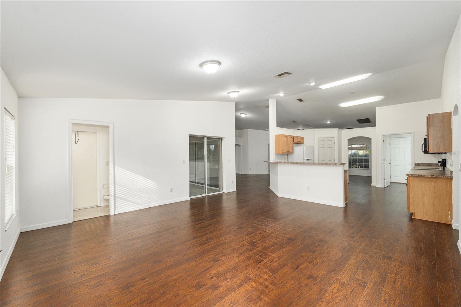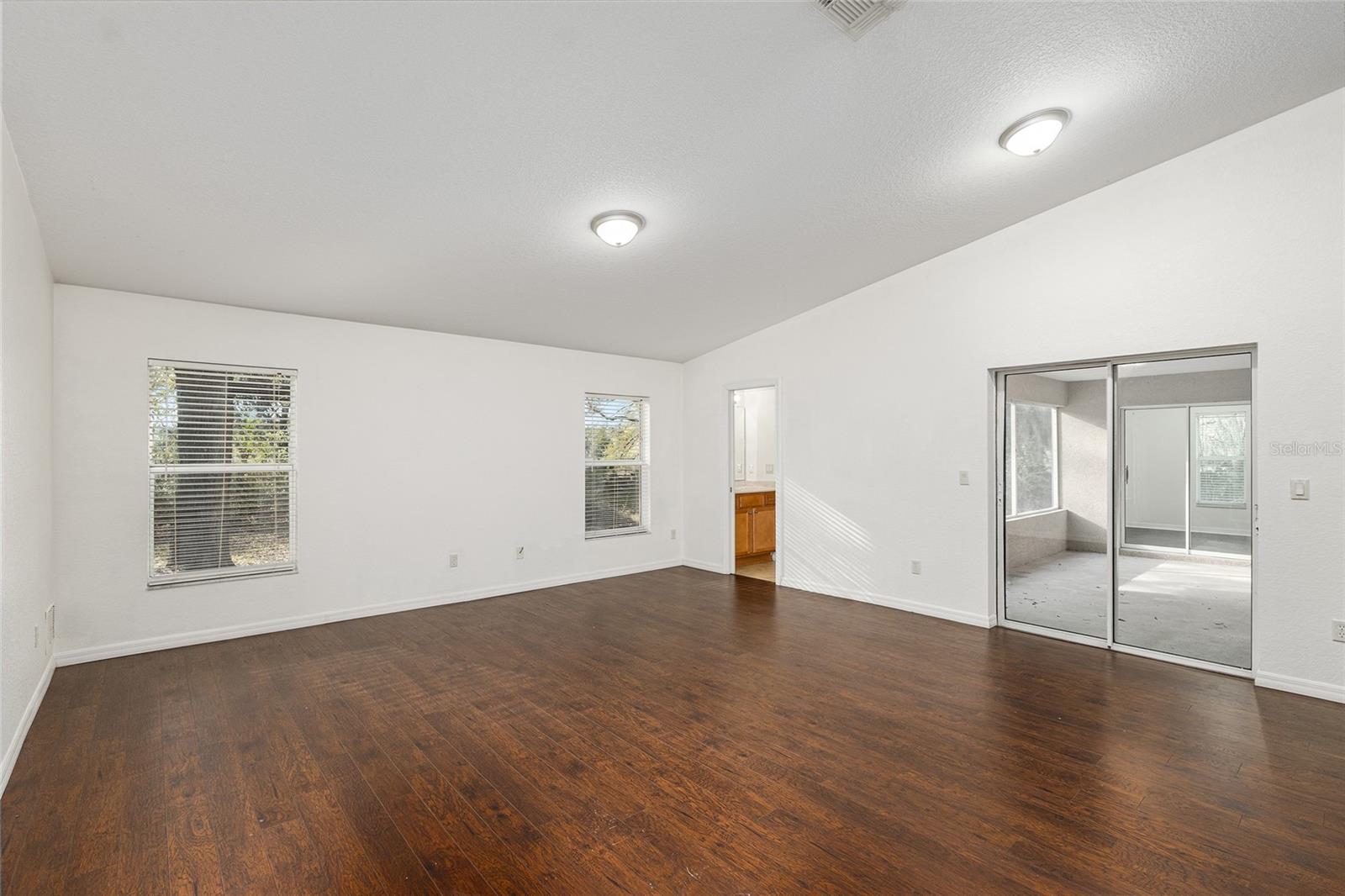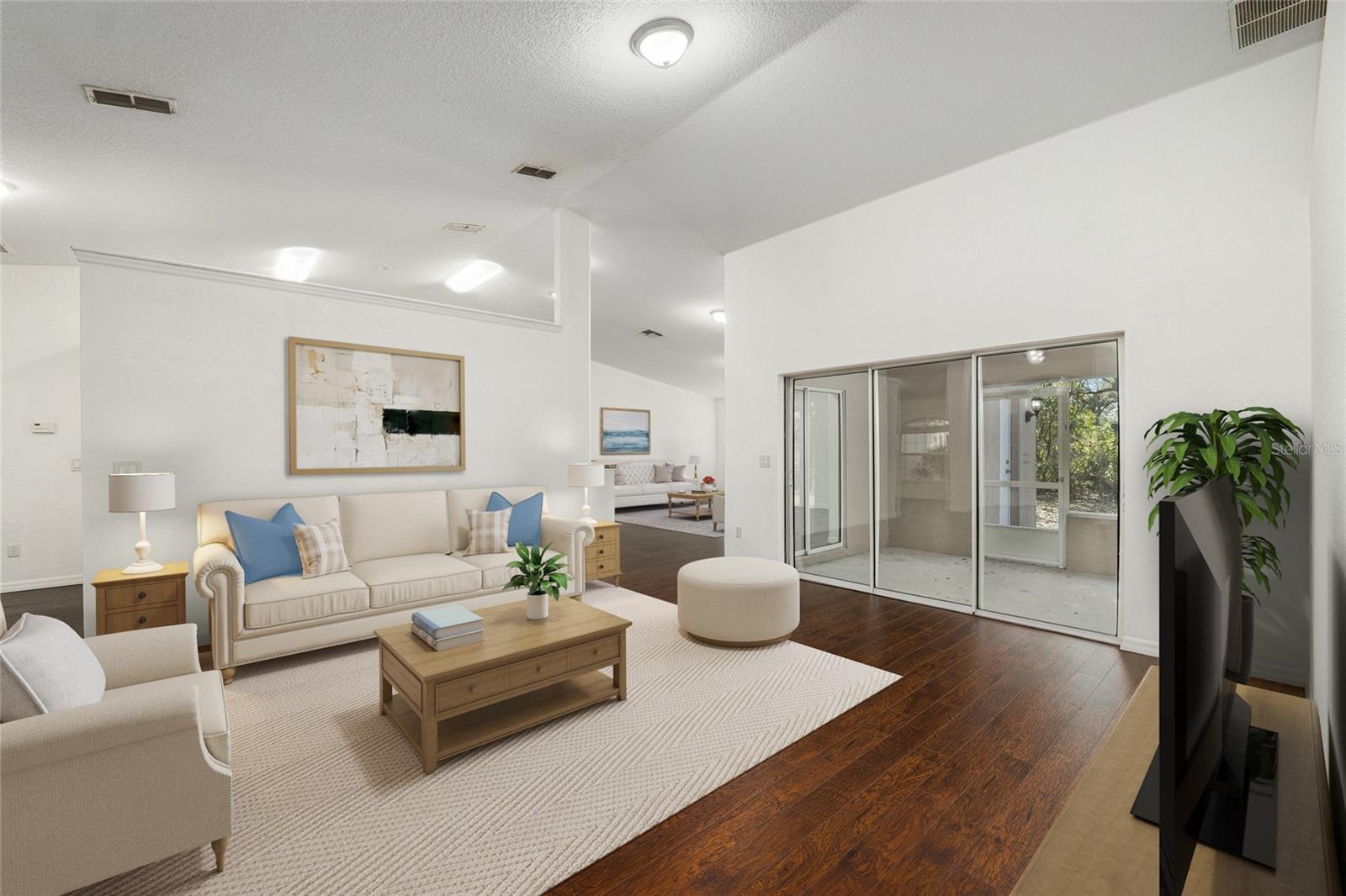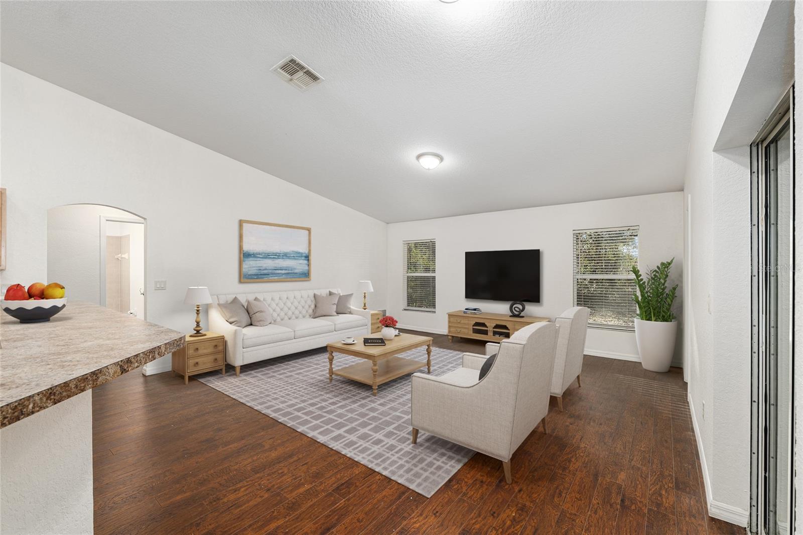 Beautiful 4-bedroom, 2.5-bath home nestled in the private and conveniently located La Casta Estates. With only one entrance in and out and NO HOA, this rare community offers both privacy and accessibility—just minutes from The Villages, Belleview, Ocala, and the interstate. Step inside to an open living room with high ceilings and a sliding glass door leading to the screened lanai, creating a bright and inviting atmosphere. The split floor plan offers added privacy, with the spacious primary suite tucked just off the living room. The suite features a private lanai entrance, 3 additional windows, 2 closets (including a walk-in), and an ensuite bath complete with dual sinks, marble countertops, a marble soaking tub, tiled walk-in shower, and linen closet. The heart of the home is the kitchen, offering wood cabinetry, a large pantry, stainless steel range, microwave, and dishwasher, with convenient access to the separate dining room. At the back of the home, the family room features high ceilings, lanai access, and a half bath with a marble vanity and exterior door—ideal for outdoor entertaining. The 4th bedroom is located at the front of the home with a pocket door, closet, and large front-facing window—perfect for a guest room, office, or flex space. Two additional bedrooms and a full bath with marble vanity and tiled tub/shower are privately situated off the family room. Additional upgrades include Pergo flooring throughout excluding bathrooms, fresh interior paint, gutters on the front and back of the home, a new roof (2023), laundry room with Samsung washer/dryer, mature landscaping providing ample shade, emergency handpump on well, and utility sink in garage. Don’t miss your opportunity to own this beautifully maintained home in one of the area’s hidden gems!