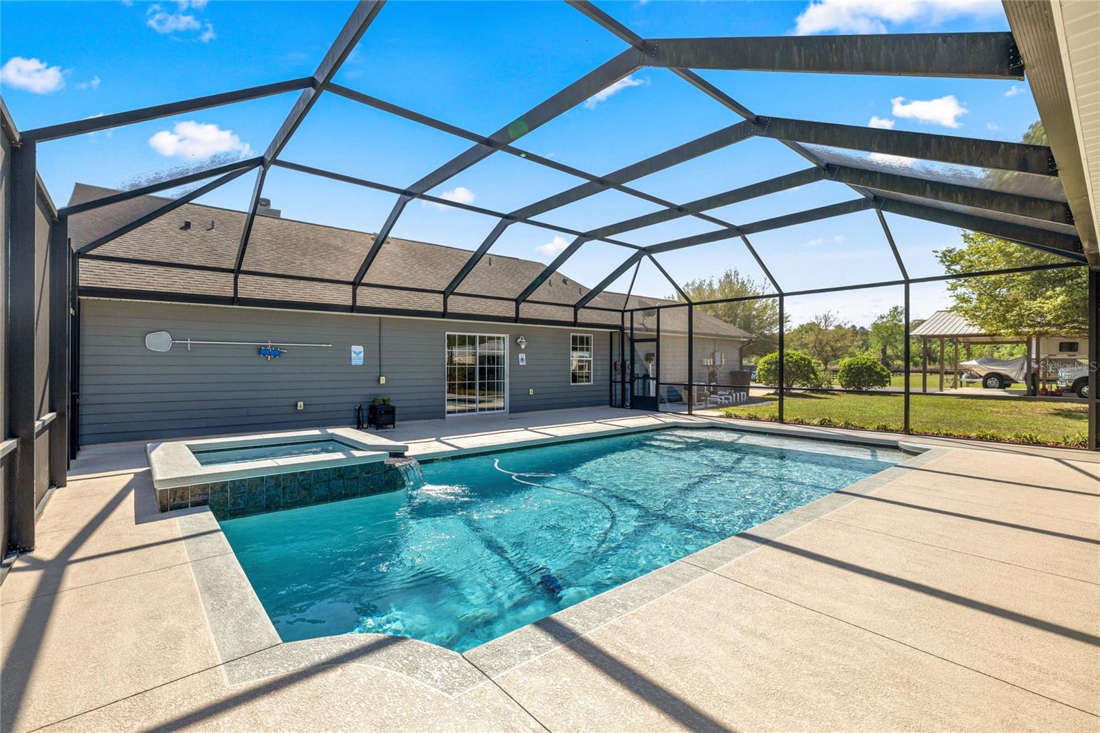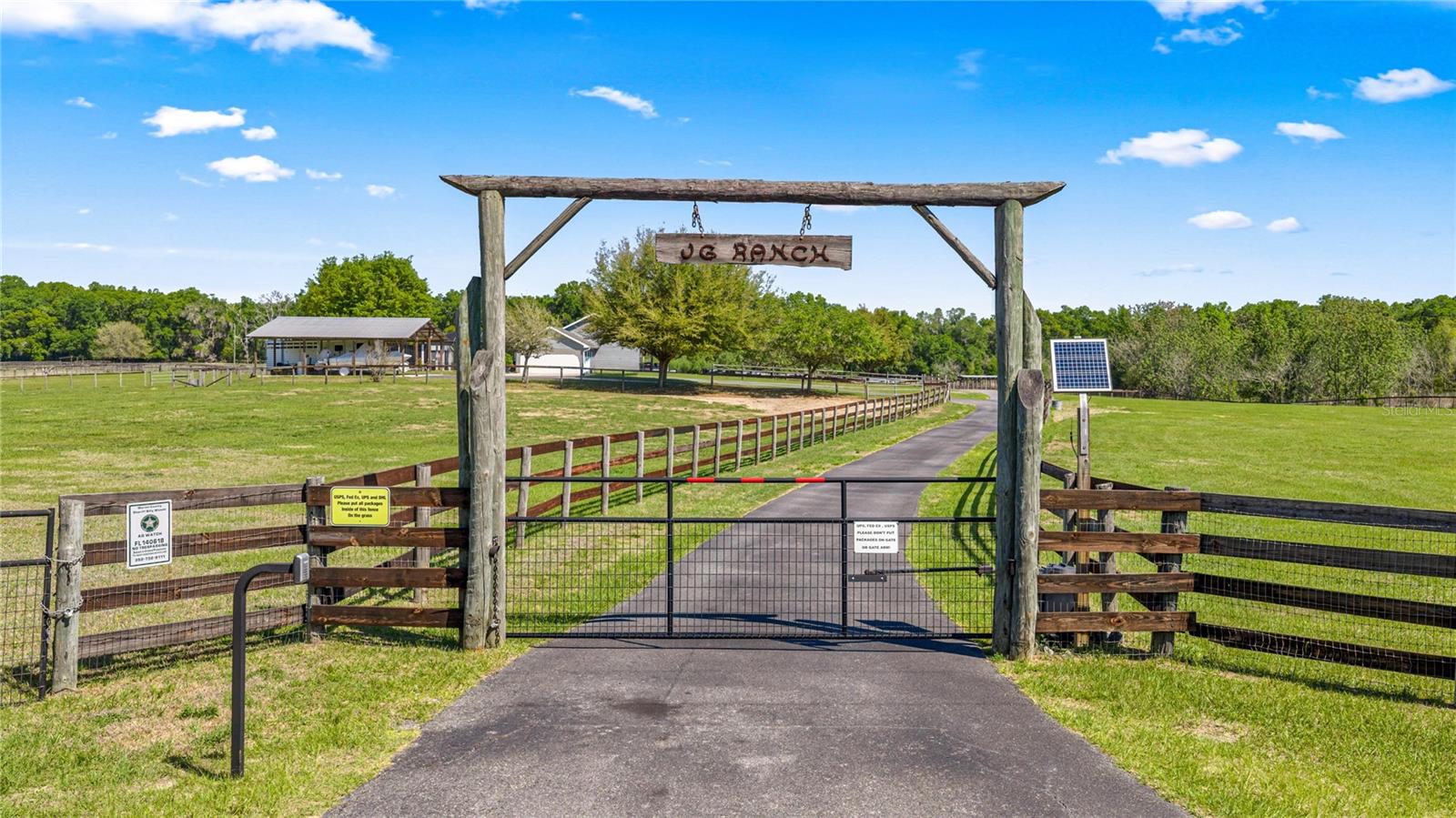 Welcome to JG Ranch, 15 +/- acres conveniently located centralized to Ocala, Lady Lake and The Villages. Enter the paved and gated drive to this cozy three bedroom, two bathroom split plan ranch house with wood burning fireplace. The house sits elevated on the property and offers lovely views from every window. Sliding doors off the kitchen take you to the screened enclosed outdoor living space offering a sparkling saltwater pool with Baja shelf and hot tub flanked by a pool house with full bathroom, summer kitchen, patio and outdoor shower. Toys, gooseneck horse trailer, dually and boat storage are no problem with the 36x36 pole barn and there’s an additional 12x16 hobby shed with A/C mini-split unit. The property is fenced and cross fenced, with 6 paddocks lining the asphalt drive to the barn. The center aisle wood frame barn features 5-(12x12) stalls with tack room, feed room and equipment storage. There is a metal panel round pen and 260 x 120 well drained field dirt over clay base arena where many Performance Horse Futurity prospects have been started and trained. Updates include new roof 2018 and HVAC 2017. Approximately 15 minutes to the Florida Horse Park, 30 minutes to WEC, 12-15 minutes to the turnpike/I-75, and 10 minutes to the Villages for restaurants, shopping and entertainment.