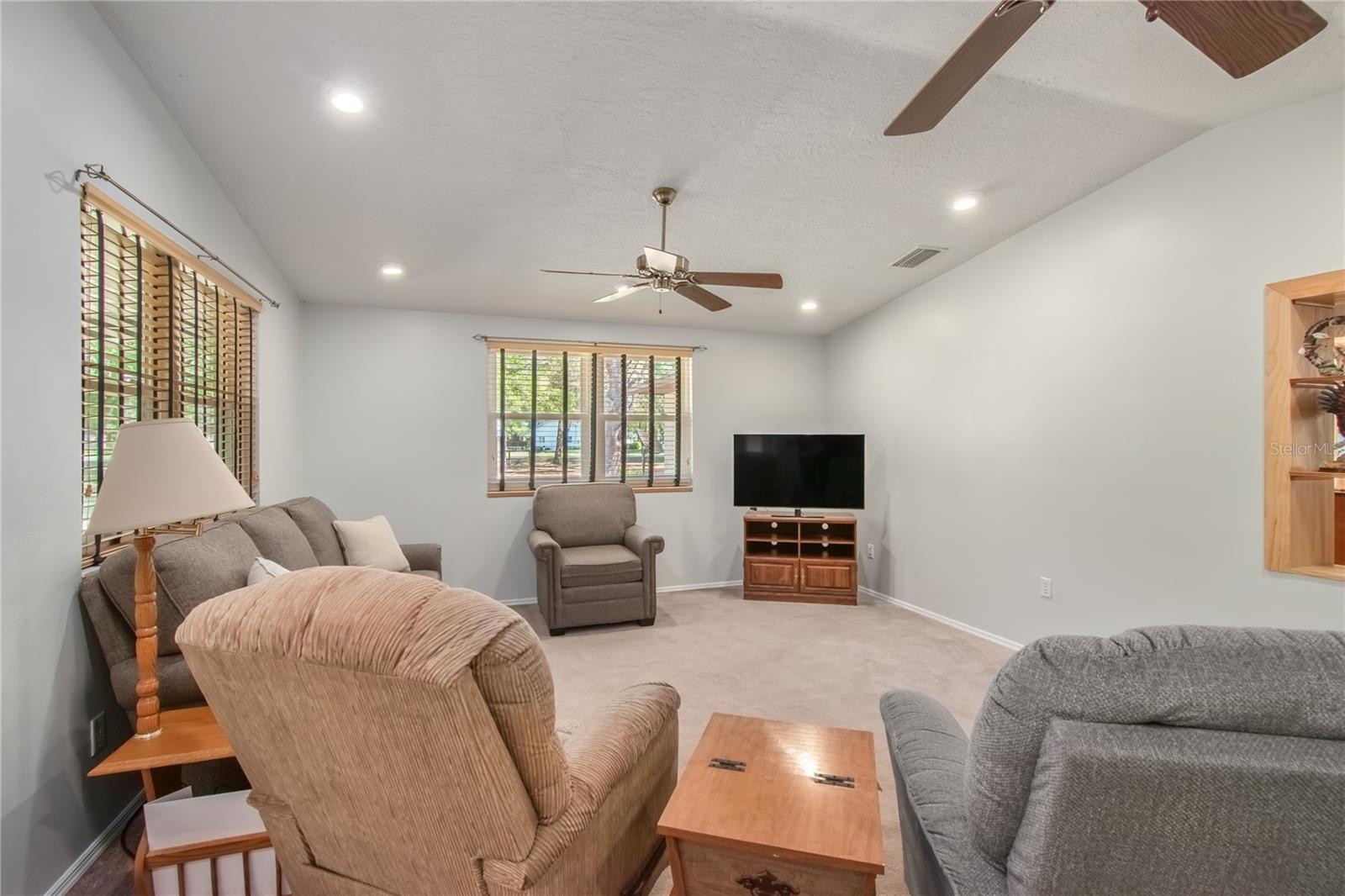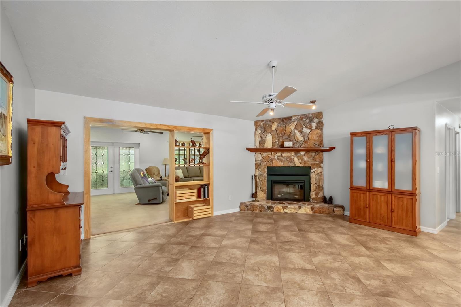 Set on approximately 2-acres in the quiet neighborhood of Vermillion Estates, this inviting countryside estate offers a convenient option for those looking to be near both Ocala and The Villages. Offering over 2,200 sqft of space, the 3-bedroom, 2-bath home features a thoughtfully designed split-bedroom layout with vaulted ceilings and lots of light throughout. The kitchen is nicely appointed for those who enjoy cooking with stainless steel appliances, ample cabinet and counter space, and a center island. The kitchen flows seamlessly into the dining and living areas, creating an open and functional layout ideal for everyday living and gatherings. The living room is anchored by a striking stone fireplace with electric insert, adding warmth and character to the space. A family room rests just beyond the living area, offering abundant natural light and plenty of space for relaxation. Those who work from home will enjoy the additional office, which features built-in shelving and could easily be used as an additional bedroom, hobby space, or play area as desired. Each bedroom is warm and inviting, but the primary suite features an extra spacious layout and a private en-suite bathroom. A dedicated laundry area adds even more convenience for everyday chores. Outdoor living is equally appealing, with a large screened-enclosed patio that provides plenty of space for outdoor seating and plenty of space for entertaining. Fenced and gated, the property features large yards that are gently shaded by mature trees, providing plenty of flexibility to enjoy the year-round sunny weather. An additional shed with covered area is in place for yard equipment and additional storage options. A short drive to either Ocala or The Villages opens up a variety of shopping, dining, entertainment, and medical options, and there are a variety of outdoor recreation options nearby. If you’re looking for the perfect blend of rural charm and everyday ease, look no further!