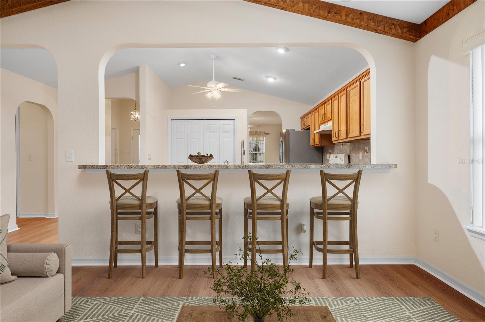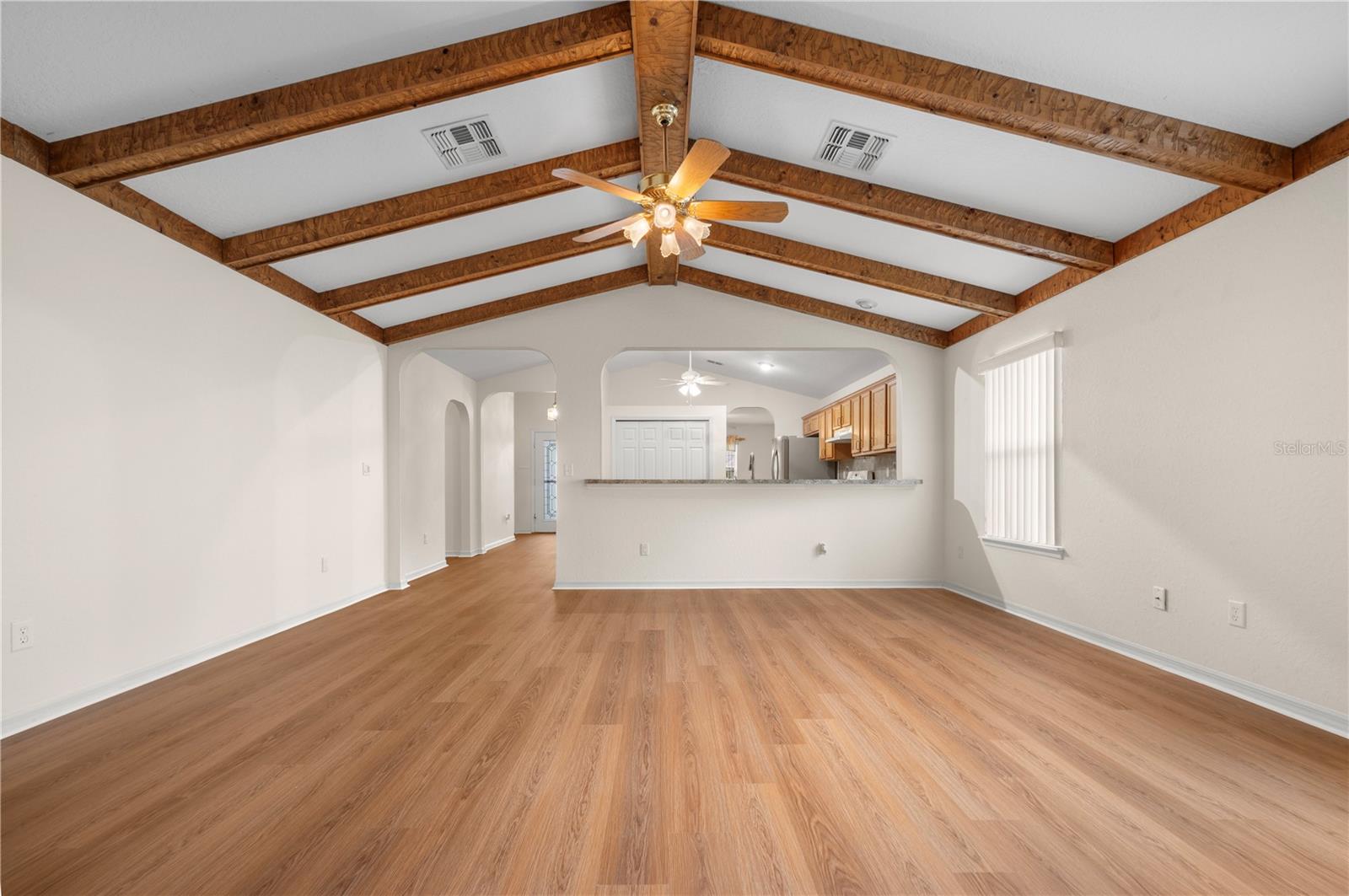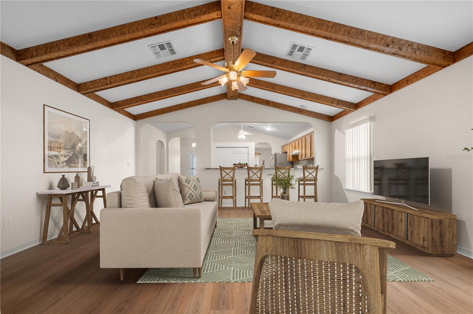 Under contract-accepting backup offers. Welcome to life in Stonecrest — one of Central Florida’s most sought-after 55+ active adult communities, nestled in the scenic rolling hills of Summerfield. This beautifully maintained 3-bedroom, 2-bathroom home offers the perfect blend of comfort, style, and community living - WITH BRAND NEW FLOORING. Step inside and you’ll immediately notice the light and airy feel of the open floor plan, made even more stunning by soaring vaulted ceilings with gorgeous exposed beams that add a touch of charm and character. The spacious living room flows seamlessly into the eat-in kitchen, where you’ll find plenty of counter space and natural light — perfect for your morning coffee or entertaining friends. The split-bedroom layout offers privacy for both you and your guests. The primary suite is generously sized and features an en suite bathroom and walk-in closet, while the two guest bedrooms sit on the opposite side of the home. Throughout the home, beautiful wood flooring adds warmth, with ceramic tile in the bathrooms for easy upkeep. You’ll also love the convenience of an indoor laundry room and the peace of mind that comes with a brand new roof in 2024 and a reverse osmosis water purification system already in place. Step out back to relax in your screened-in lanai with acrylic windows, allowing you to enjoy the Florida weather in comfort all year long. Living in Stonecrest means enjoying a country club lifestyle without ever leaving your neighborhood. This amenity-rich, gated golf cart community features a 12-acre world-class Recreation Complex, four sparkling pools (including a saltwater pool), two off-leash dog parks, state-of-the-art fitness center, two clubhouses, tournament-quality billiards, tennis, shuffleboard, bocce, and more. With a full-time onsite Activities Director, over 80 social clubs and interest groups, live entertainment, and a golf course with its own restaurant — every day can feel like a vacation. Don’t miss the chance to enjoy all that this vibrant lifestyle has to offer — schedule your private showing today! ***SELLER WILL HAVE THE BEAMS PAINTED ANY COLOR THE BUYER WANTS, WITH ACCEPTABLE OFFER***