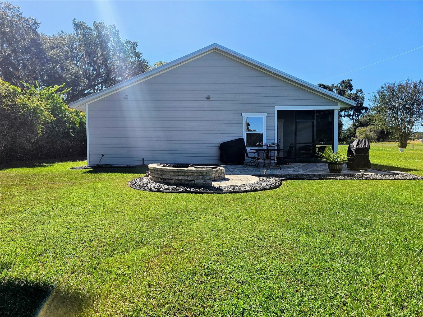 Don’t miss this beautiful 3-bedroom, 2-bathroom custom home with a 2-car garage, set on over half an acre. Built with comfort and style in mind, the open floor plan features high ceilings, modern finishes, laminate and tile flooring throughout, and a bright, welcoming living space. The kitchen includes granite countertops, a large island, ample cabinet space, and high-end stainless steel appliances. The spacious owner’s suite offers a walk-in closet and private bath with dual vanities and a large tiled shower, along with a beautiful pine ceiling that adds warmth and charm. Two additional bedrooms, a separate laundry room, and open living and dining areas provide function and flexibility. Outdoor features include a screened back porch with pine ceilings and lighting, a front patio with matching finishes, a thoughtfully designed paver-enclosed fire pit, and a beautiful custom matching storage and lean-to shed—perfect for tools, toys, or extra storage. Enjoy the freedom of a spacious 0.55-acre lot with plenty of room for RVs, outdoor projects, or future additions. Located near The Villages and Bushnell, with easy access to highways, shopping, and more.