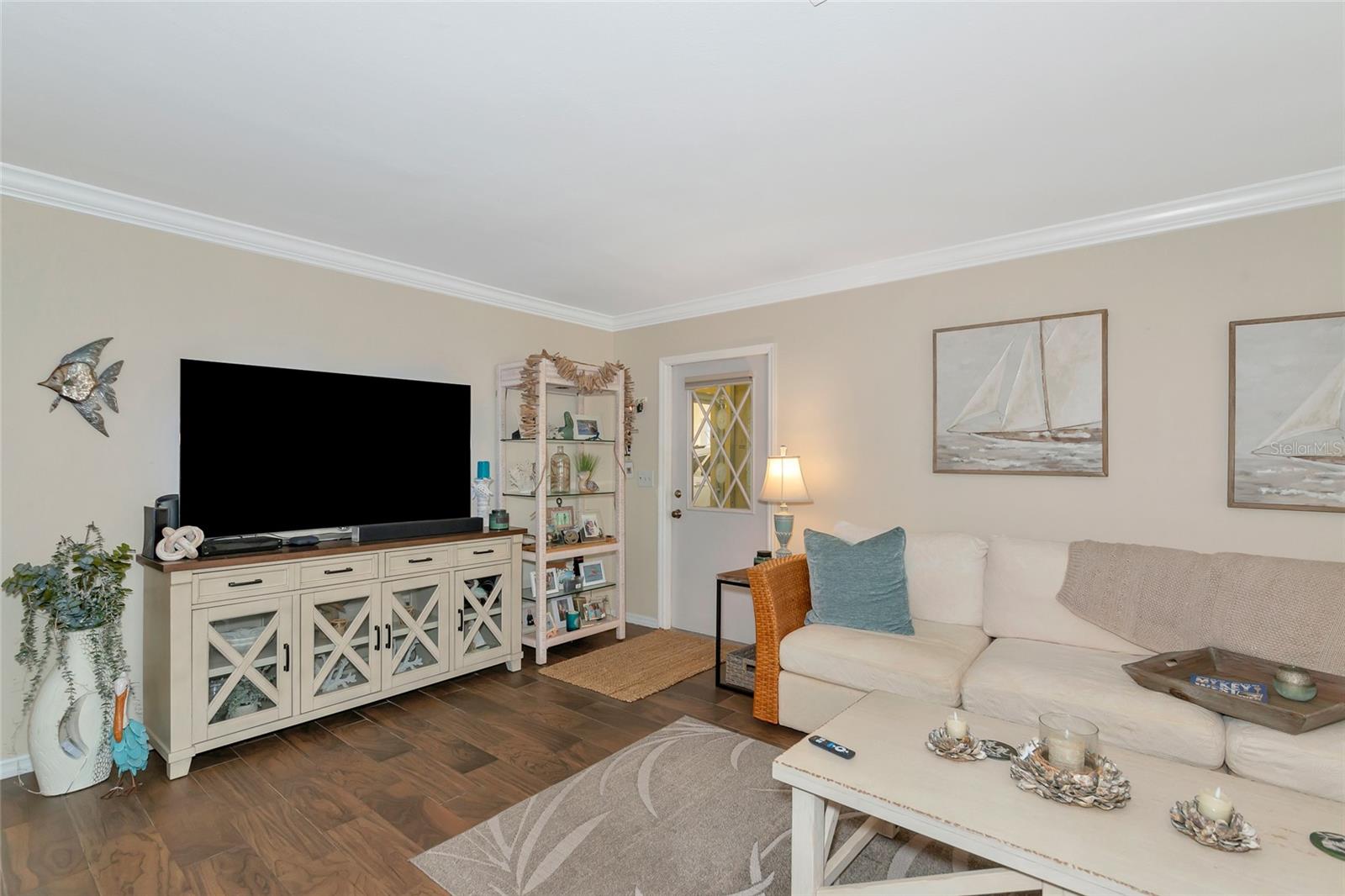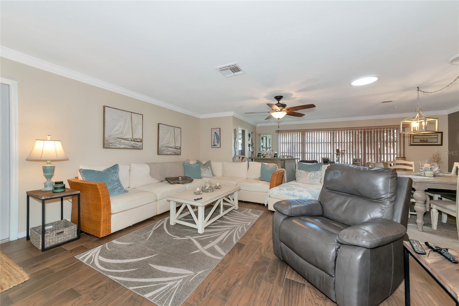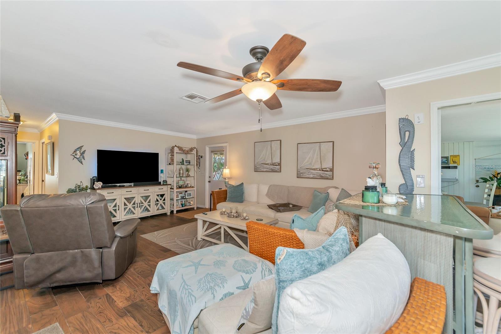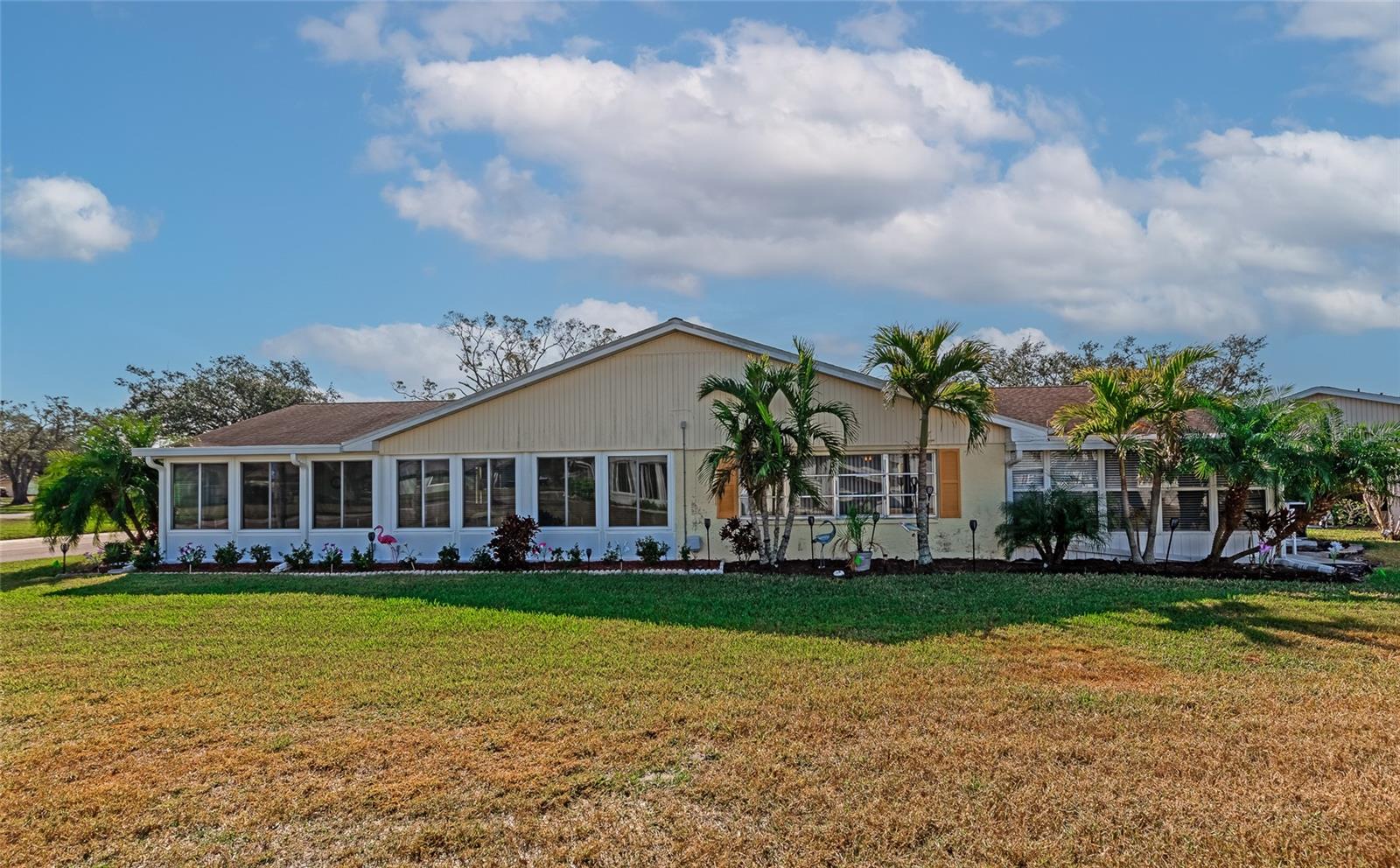 Welcome to Kings Point, a Beautiful 55+ Plus Community!!! This enchanting 2-bedroom, 2-bathroom home, combines comfort and style! When you first walk up this home you have an inviting screened in front porch—ideal for enjoying a cool glass of lemonade and unwinding. Step inside to a spacious living room and dining combo, ideal for intimate gatherings. Walls have been updated with crown molding throughout the home. The primary bedroom is complete with a walk-in closet and primary bathroom. The kitchen has all stainless steel appliances. As you head to the back of the home you will find a nice size sun/Florida room and can also be used as an office space. Don't miss out on this peaceful, well-designed home! The Community has fitness a center, swimming pool, golfing and so much more…. All your immediate needs are met in the area - hospital, medical facilities, churches, emergency squad, supermarkets, post office and restaurants. Golf carts are another means of transportation. Come join us and start enjoying your retirement years, Schedule your private viewing today!!! Please note that the Exterior is scheduled to be painted in April 2025 and that this is an Expanded HAMPTON Floorplan