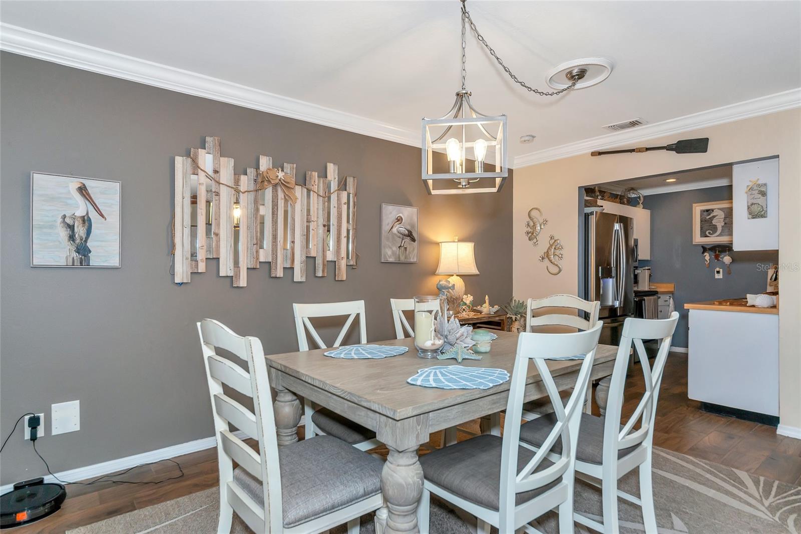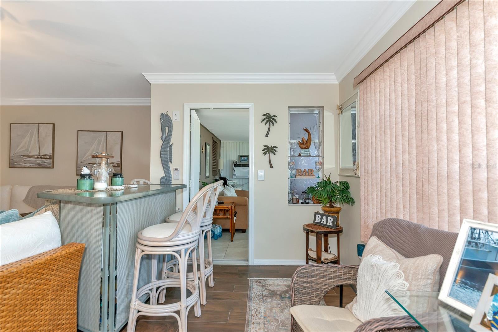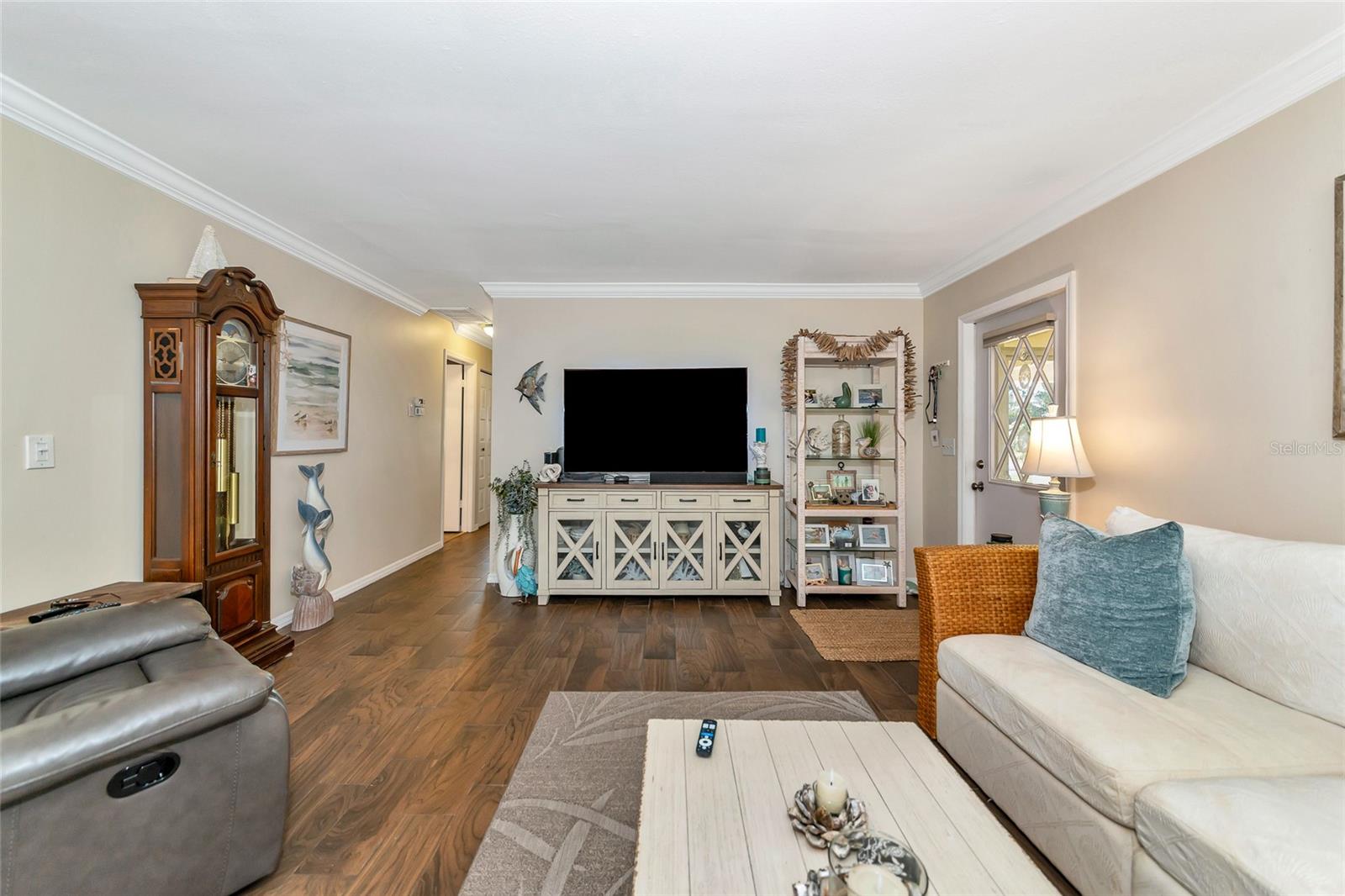 Welcome to Kings Point, a Beautiful 55+ Plus Community!!! This enchanting 2-bedroom, 2-bathroom home, combines comfort and style! When you first walk up this home you have an inviting screened in front porch—ideal for enjoying a cool glass of lemonade and unwinding. Step inside to a spacious living room and dining combo, ideal for intimate gatherings. Walls have been updated with crown molding throughout the home. The primary bedroom is complete with a walk-in closet and primary bathroom. The kitchen has all stainless steel appliances. As you head to the back of the home you will find a nice size sun/Florida room and can also be used as an office space. Don't miss out on this peaceful, well-designed home! The Community has fitness a center, swimming pool, golfing and so much more…. All your immediate needs are met in the area - hospital, medical facilities, churches, emergency squad, supermarkets, post office and restaurants. Golf carts are another means of transportation. Come join us and start enjoying your retirement years, Schedule your private viewing today!!! Please note that the Exterior is scheduled to be painted in April 2025 and that this is an Expanded HAMPTON Floorplan
