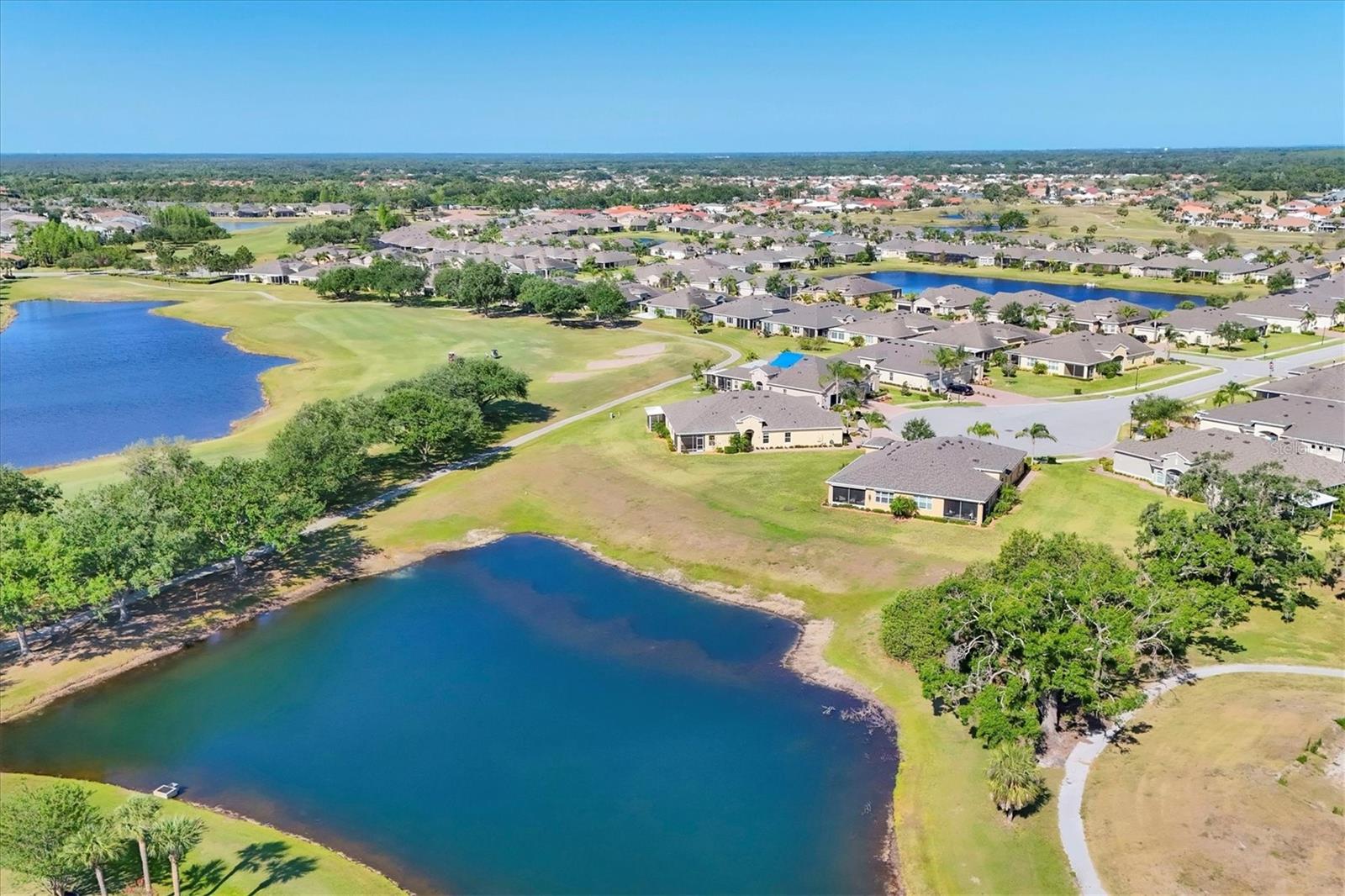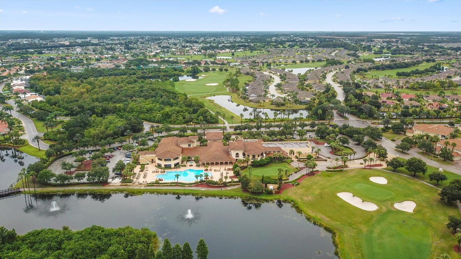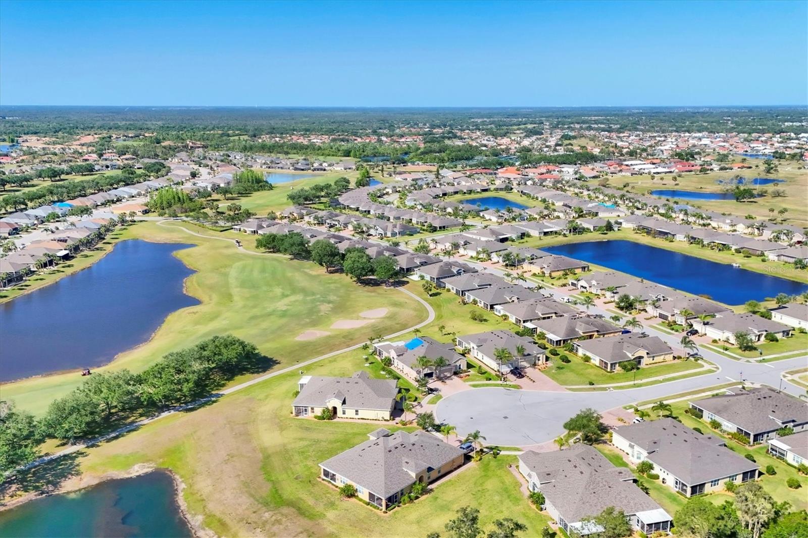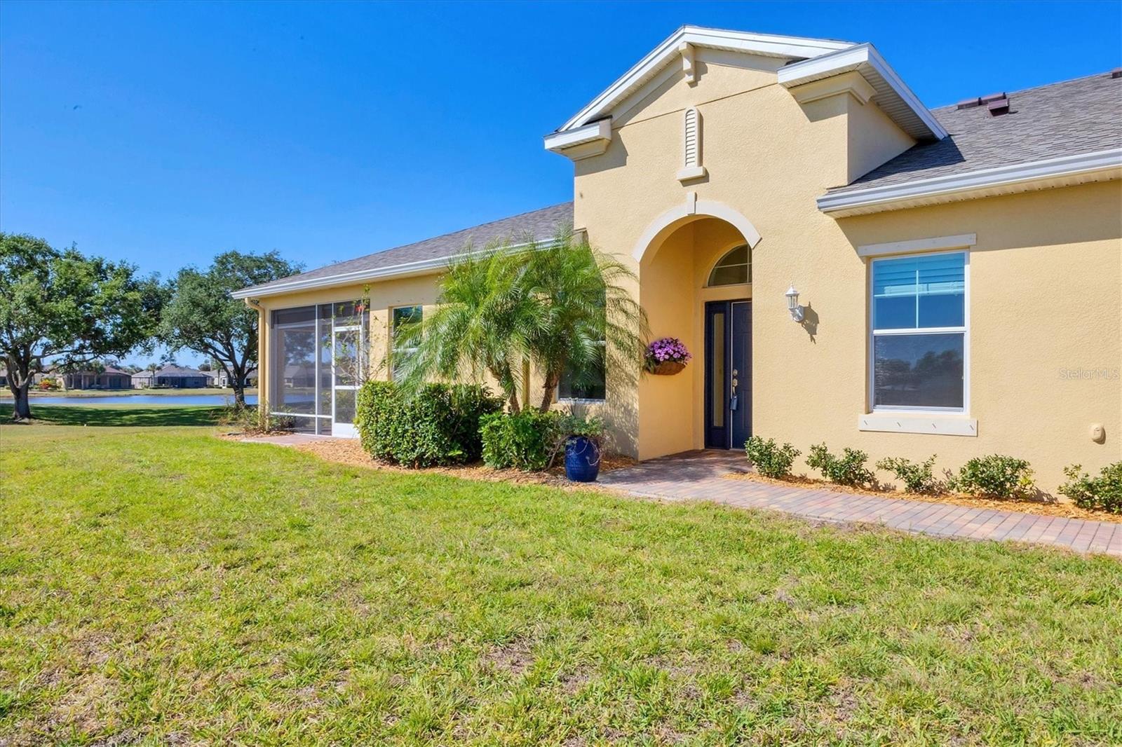 Welcome to your Dream Villa in the charming gated 55+ community of Verona in Sun City Center. This beautifully designed Buttonwood Model home located on a cul-de-sac, seemlessly blends modern elegance with comfortable living. This well maintained 3 bedroom, 2 bathroom home with a spacious 2 car garage has been lovingly cared for by the original owner who never had pets and is smoke-free. You can't help but notice as you walk up the oversized brick paved driveway how much distance is between you and your neighbor. When you step inside the home you will love the open floor plan with tall ceilings, neutral colors, 18" tile and plenty of natural light that create a warm, cohesive flow throughout. The kitchen, perfect for daily living and entertaining, is a chef's dream featuring solid white wood cabinets with crown molding, pull out drawers for pots and pans, granite countertops, pretty tile backsplash, upgraded stainless steel appliances, spacious island, and a large pantry with abundant storage. The well-equipped laundry room provides added convenience with ample storage and a counter for folding clothes. In the great room, you'll find a tray ceiling, sliding glass doors, and easy access to the large fully screened-in paver lanai that has BREATHTAKING WATER VIEWS overlooking two serene ponds and the RENAISSANCE Golf Course, an ideal spot to unwind and relax while enjoying the sunset and peaceful nature in your backyard retreat. The electric shades are an added feature allowing shade and privacy when needed. The owners suite is a tranquil escape located in the back of the home with amazing water views, complete with a tray ceiling and NEW laminate flooring (2023). The ensuite bathroom offers a spa-like ambiance, featuring double sinks, sleek glass-enclosed shower and a huge walk-in closet with plenty of space for all your personal belongings. The 2nd bedroom is on the opposite end of the home which has a pocket door to offer privacy and comfort. The 3rd bedroom has double glass doors with custom blinds that can also be used as an office/den. Additional features include a whole-home water softener, in-wall pest control system, 5 1/4" baseboards, security system and shutters which give the homeowner peace of mind. This Villa has many upgrades including a NEW Electric Water Heater (2021), NEW Roof (2022), Exterior Freshly Painted (2023), Disposal (2022), Kitchen Faucet & Drain (2024) and many more. Verona HOA has their very own heated pool and pool house and offers hassle free living covering lawn cutting, weeding, fertilization, and trimming of bushes and trees. Exterior upkeep is also included, with house painting every 7 years and routine roof replacements. Verona residents also have access to the incredible amenities at Club Renaissance with a resort-style heated pool with food and drink service, a private fine dining restaurant, and a 24 hour state of the art fitness center offering exercise classes, sauna, steam room and full-service spa, just to name a few. You'll also have the enjoyment of all the Sun City Center amenities, such as numerous social clubs, pickleball, a library, shopping, restaurants and so much more. This exceptional villa boasts Spectacular water views from every window in the home and truly offers the best of Florida living. This villa is move-in ready and waiting for you to call it HOME!