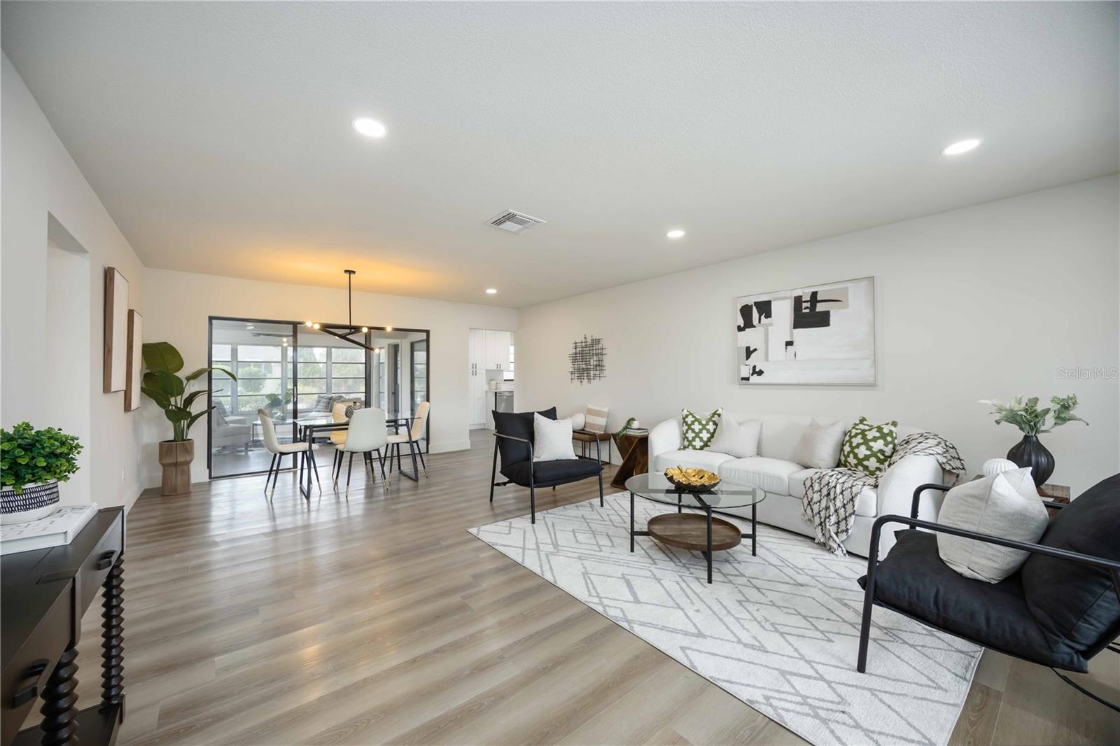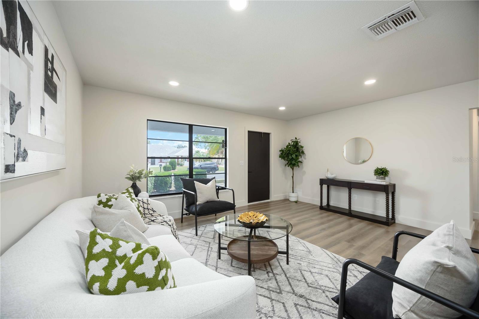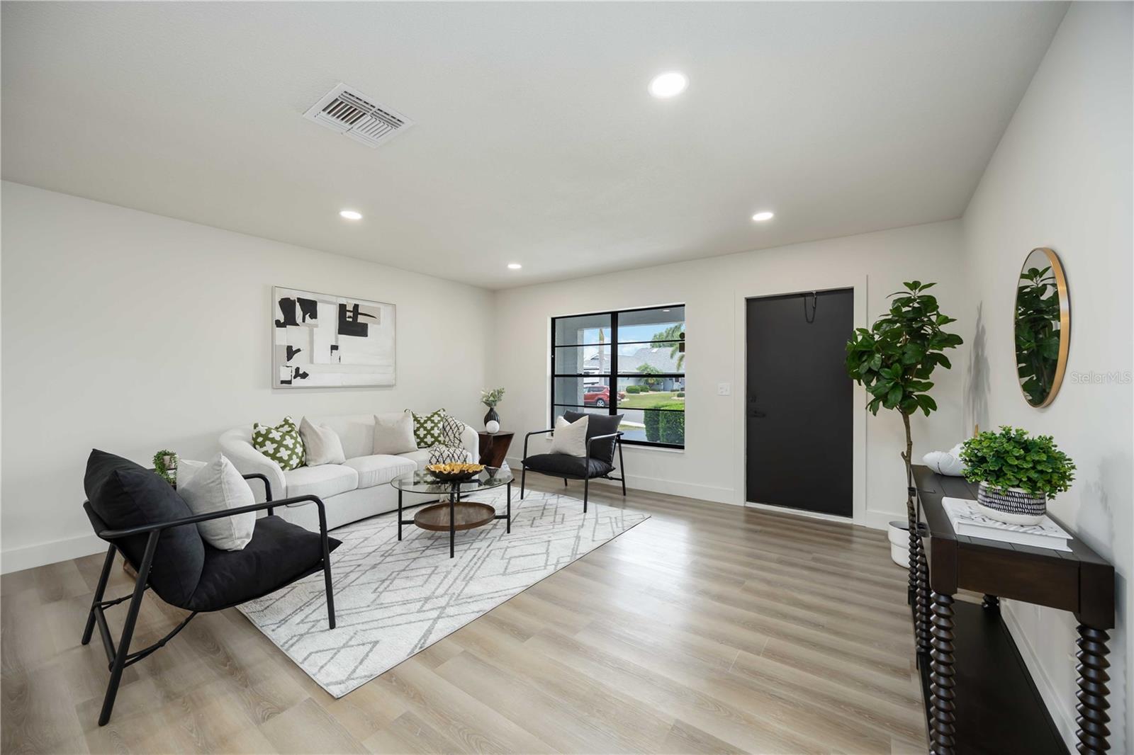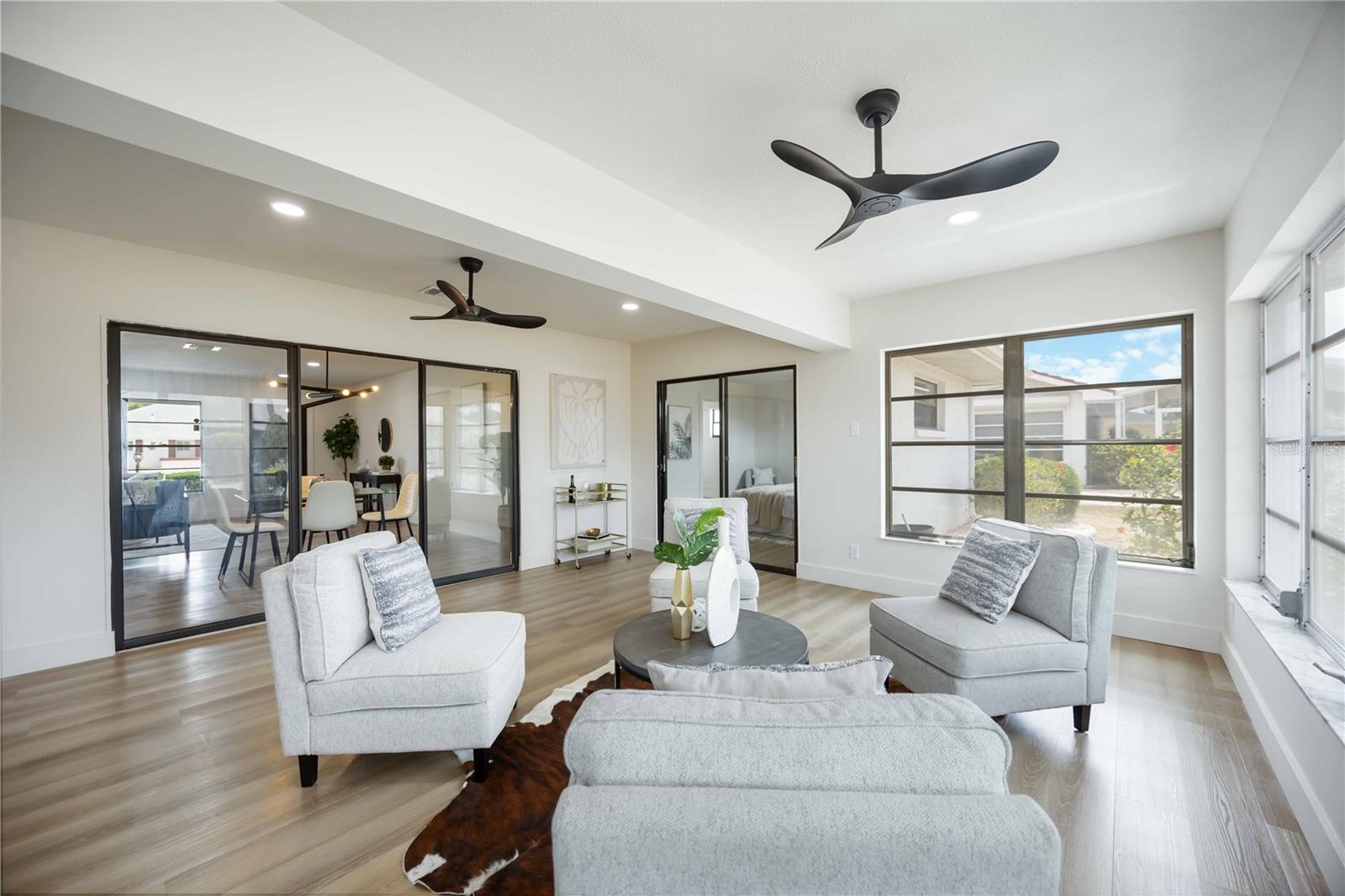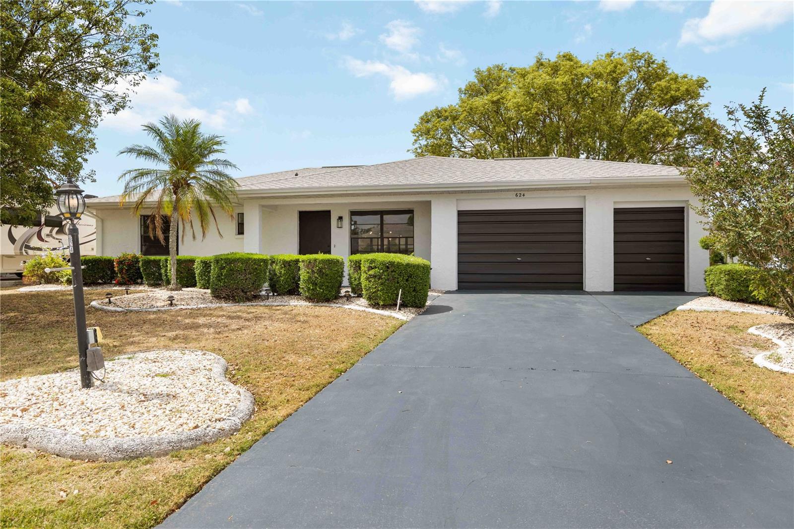 Welcome to your dream home! This stunning renovated single-family residence offers a perfect blend of style and functionality. Enjoy brand new flooring throughout, a gorgeous updated kitchen featuring quartz countertops, a spacious farmhouse sink, and modern cabinetry. The open layout is perfect for everyday living and entertaining. This home boasts two fully renovated bathrooms, a generous laundry room, and a cozy sunroom — the ideal spot for morning coffee or evening chats with family and friends. The attached garage provides ample space for your car and golf cart, making it easy to access nearby courses. The beautifully landscaped yard adds to the charm and curb appeal, and the convenient location puts you just minutes from local golf, shopping, and dining. Don't miss out on this incredible opportunity —Priced to sell schedule your showing today!