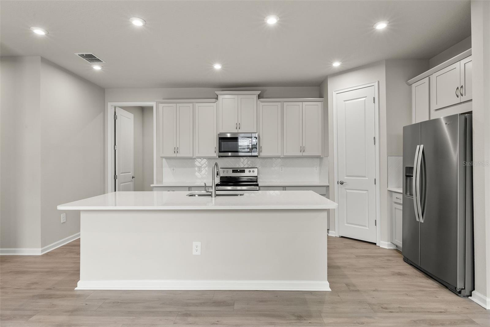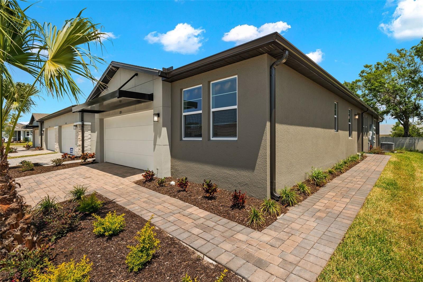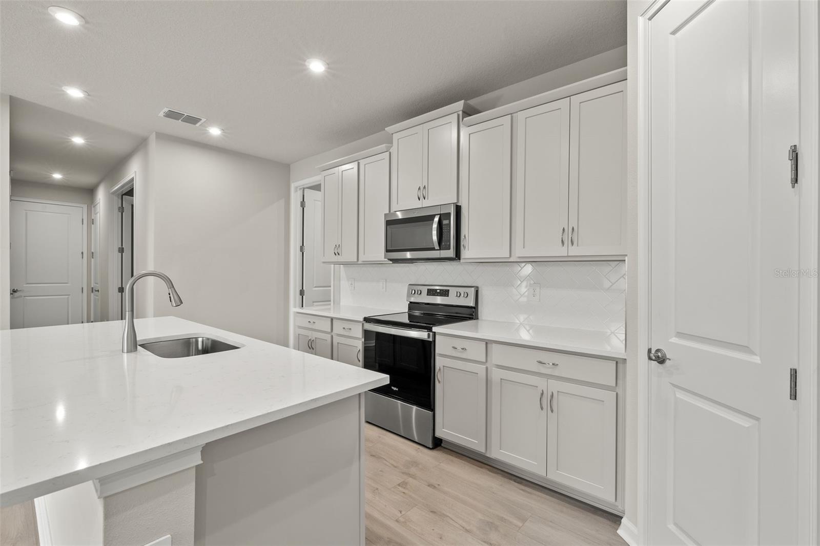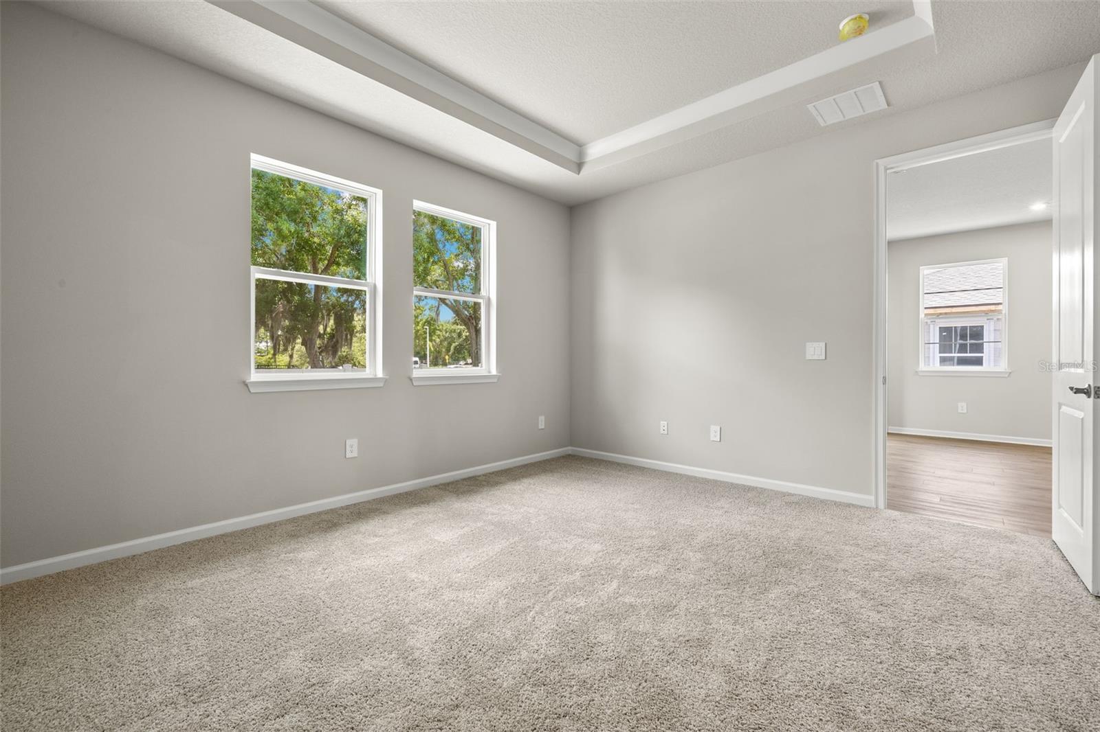 The Topsail model is an end unit villa with an open floor plan and lots of windows for natural light. This home boasts a Contemporary exterior and offers 3 bedrooms, 2 bathrooms, a dedicated study with 8’ French doors and a 2-car garage. The kitchen features light gray Harbor painted cabinetry, Carrara Marmi quartz countertops and has plenty of storage including a large pantry. The kitchen is open to the dining area that flows right into the great room and overlooks the paver screened lanai through 12’ sliding glass doors. All the main living area features luxury vinyl plank tile flooring. The lanai is a perfect spot for a morning cup of coffee or a relaxing evening. The owner’s suite is located at the rear of the villa for optimum privacy. The en suite bathroom offers a dual sink, raised vanity, a large shower, a private water closet and an oversized closet! There is lots of room in this 1,765 square foot home for guests. With this low-maintenance lifestyle, the gated community also offers pickleball, a pool with lap lines, a spa, fire pit area and is golf cart friendly. Photos, renderings and plans are for illustrative purposes only, and should never be relied upon and may vary from the actual home. All dimensions and square footage are approximate. The photos are from a furnished model home and not the home offered for sale. Room Feature: Linen Closet In Bath (Primary Bedroom).