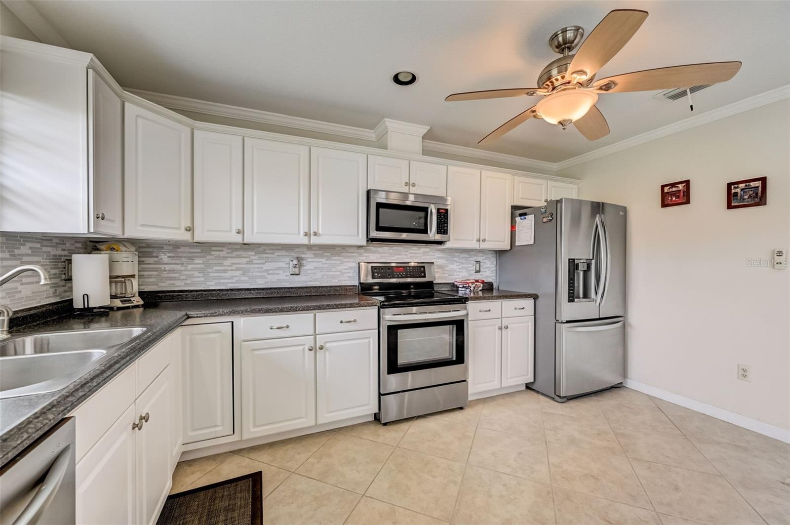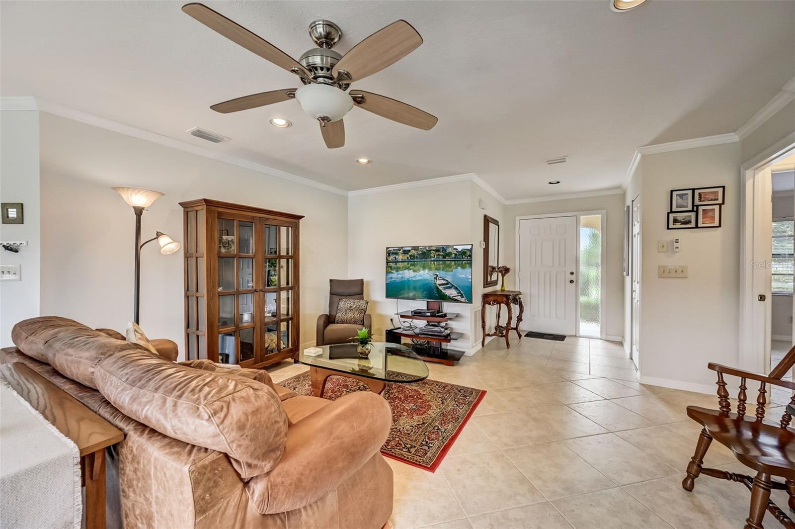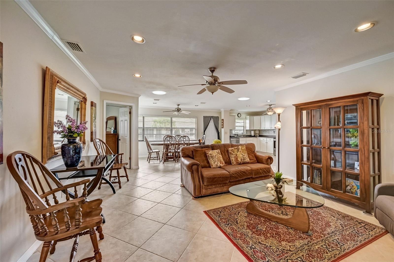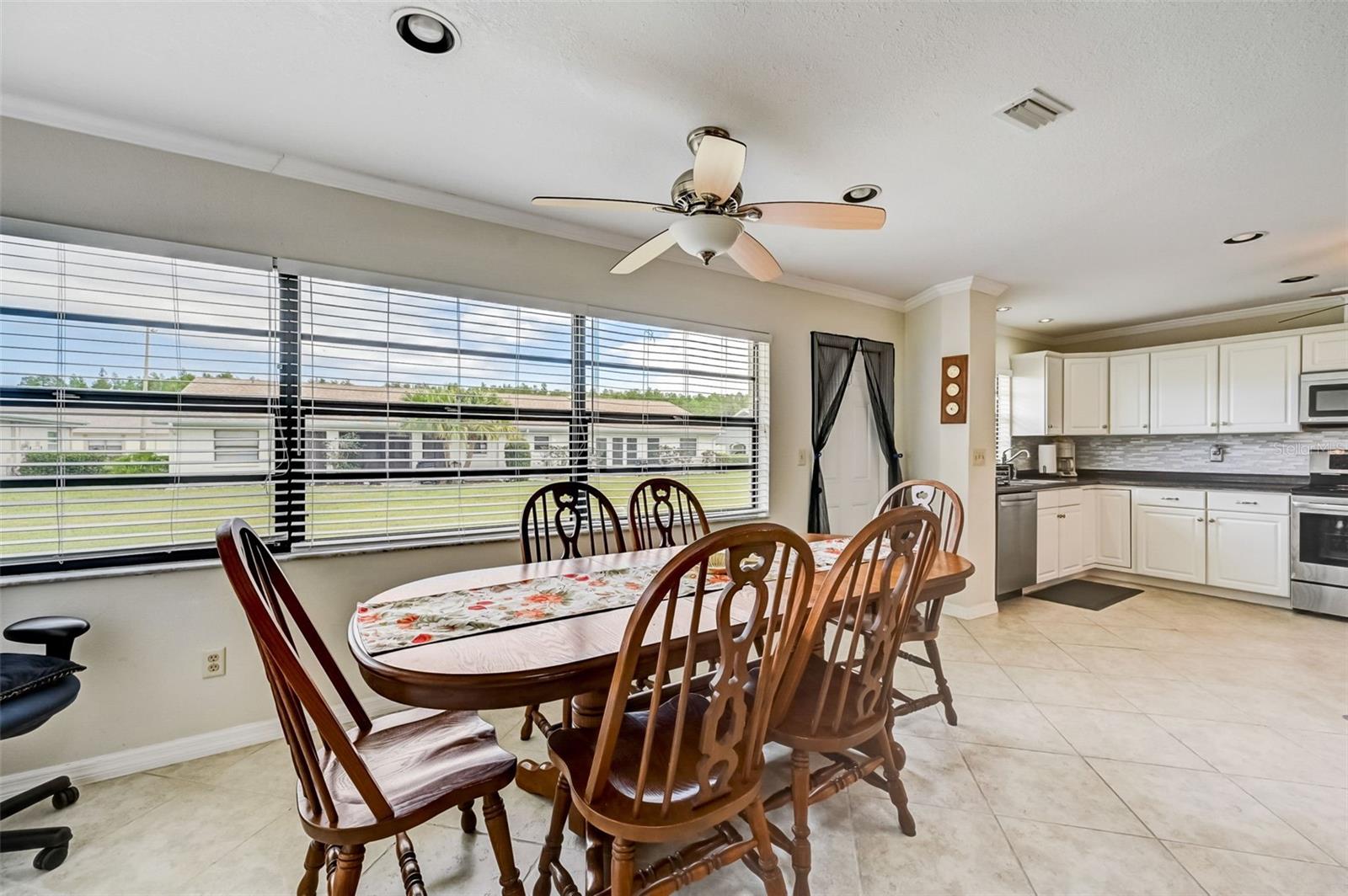 Welcome to this open floorplan Somerset model located in the quiet Highgate IV community of our gated Kings Point in Sun City Center. As you enter the home you become immediately aware of the tile flooring on the diagonal, freshly painted walls with attractive crown molding throughout. Recessed lighting and updated ceiling fans are complemented with two skylight solar tubes bringing a nice bright feel. The updated kitchen is complemented with a fresh light cabinet color and stainless appliance finishes. Plenty of room for the cooking savant. The dining room is conveniently located nearby for serving family or friends with a beautiful outdoor view. The bedroom plan locates the primary bedroom on the northwest side of the home. Plenty of room for a king size setting along with a 6' x 8.5' walk-in closet. The second bedroom is a spacious 11' x 12' and located next to the full size guest bathroom. As for laundry, there is a washer dryer located steps from the inside door entry to the garage with a ceiling fan and lighting. The 1.5 garage is designed for a full car and golf cart. Kings Point is a resort-style active retirement community. With two beautiful clubhouses, an 850-seat Veterans Theater, six indoor and outdoor pools, hot tubs, a spa, RV, and boat storage, tennis courts, 27 holes of golf, billiards, pickle ball, state-of-the-art fitness centers, and over 50 unique social clubs, groups, organizations, and classe that will keep you entertained year-round (there are two TV stations specially about Kings Points activities). This is a great opportunity to come join us at Kings Point. So, schedule your showing with us today to come see for yourself.