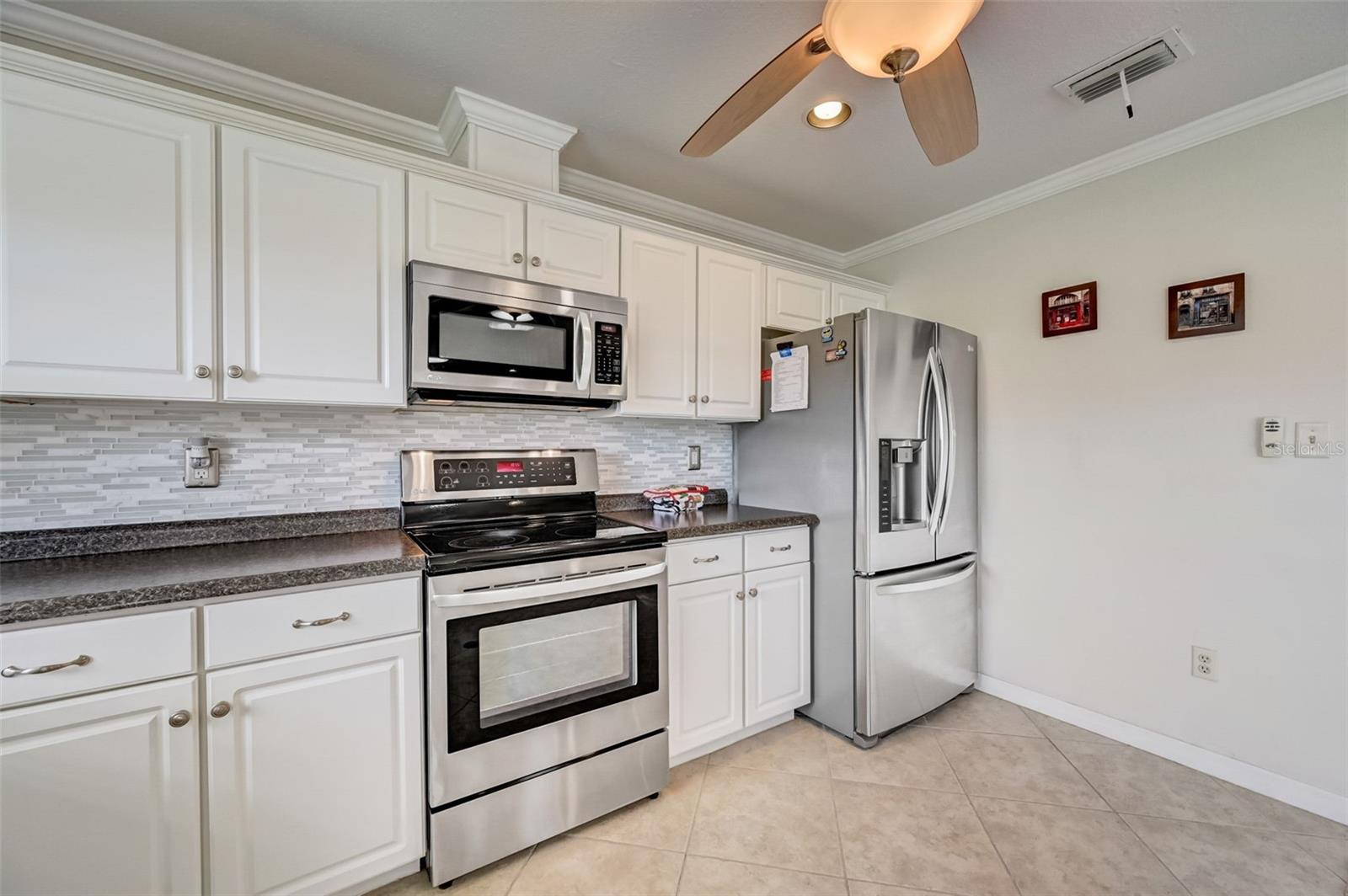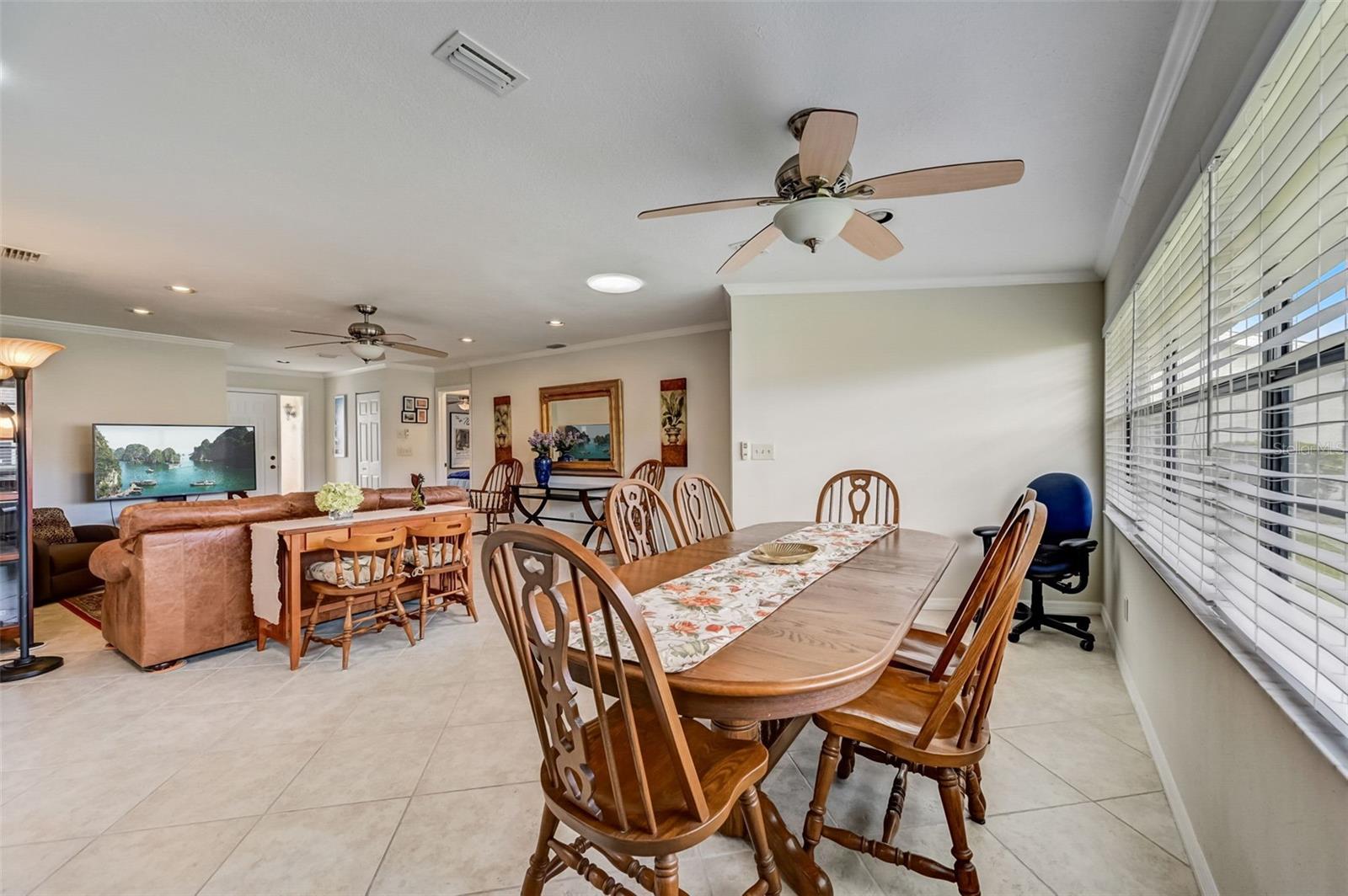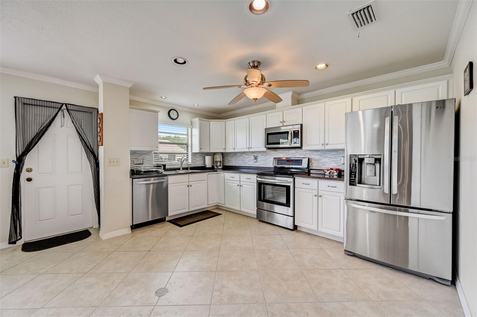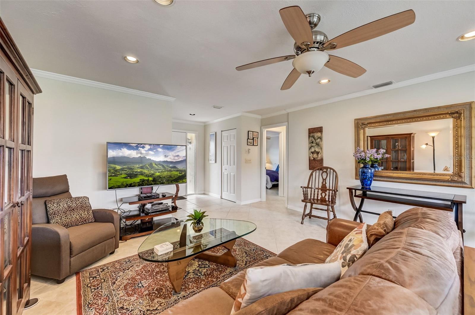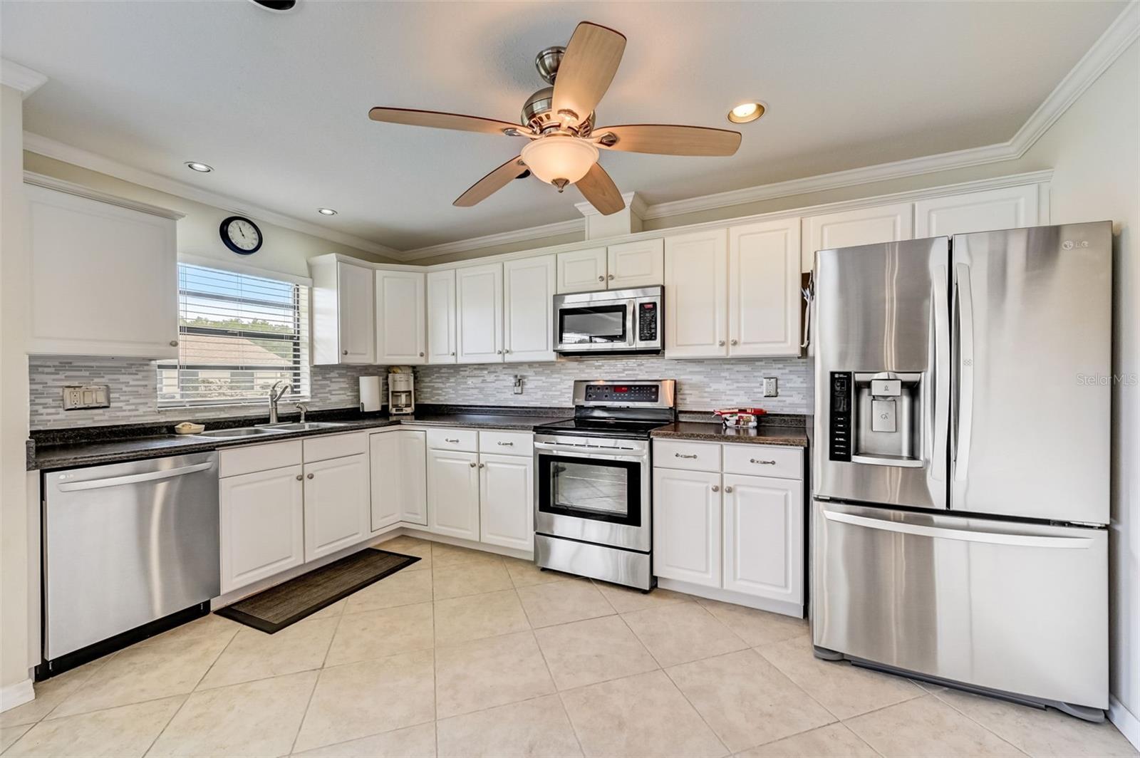 Welcome to this open floorplan Somerset model located in the quiet Highgate IV community of our gated Kings Point in Sun City Center. As you enter the home you become immediately aware of the tile flooring on the diagonal, freshly painted walls with attractive crown molding throughout. Recessed lighting and updated ceiling fans are complemented with two skylight solar tubes bringing a nice bright feel. The updated kitchen is complemented with a fresh light cabinet color and stainless appliance finishes. Plenty of room for the cooking savant. The dining room is conveniently located nearby for serving family or friends with a beautiful outdoor view. The bedroom plan locates the primary bedroom on the northwest side of the home. Plenty of room for a king size setting along with a 6' x 8.5' walk-in closet. The second bedroom is a spacious 11' x 12' and located next to the full size guest bathroom. As for laundry, there is a washer dryer located steps from the inside door entry to the garage with a ceiling fan and lighting. The 1.5 garage is designed for a full car and golf cart. Kings Point is a resort-style active retirement community. With two beautiful clubhouses, an 850-seat Veterans Theater, six indoor and outdoor pools, hot tubs, a spa, RV, and boat storage, tennis courts, 27 holes of golf, billiards, pickle ball, state-of-the-art fitness centers, and over 50 unique social clubs, groups, organizations, and classe that will keep you entertained year-round (there are two TV stations specially about Kings Points activities). This is a great opportunity to come join us at Kings Point. So, schedule your showing with us today to come see for yourself.