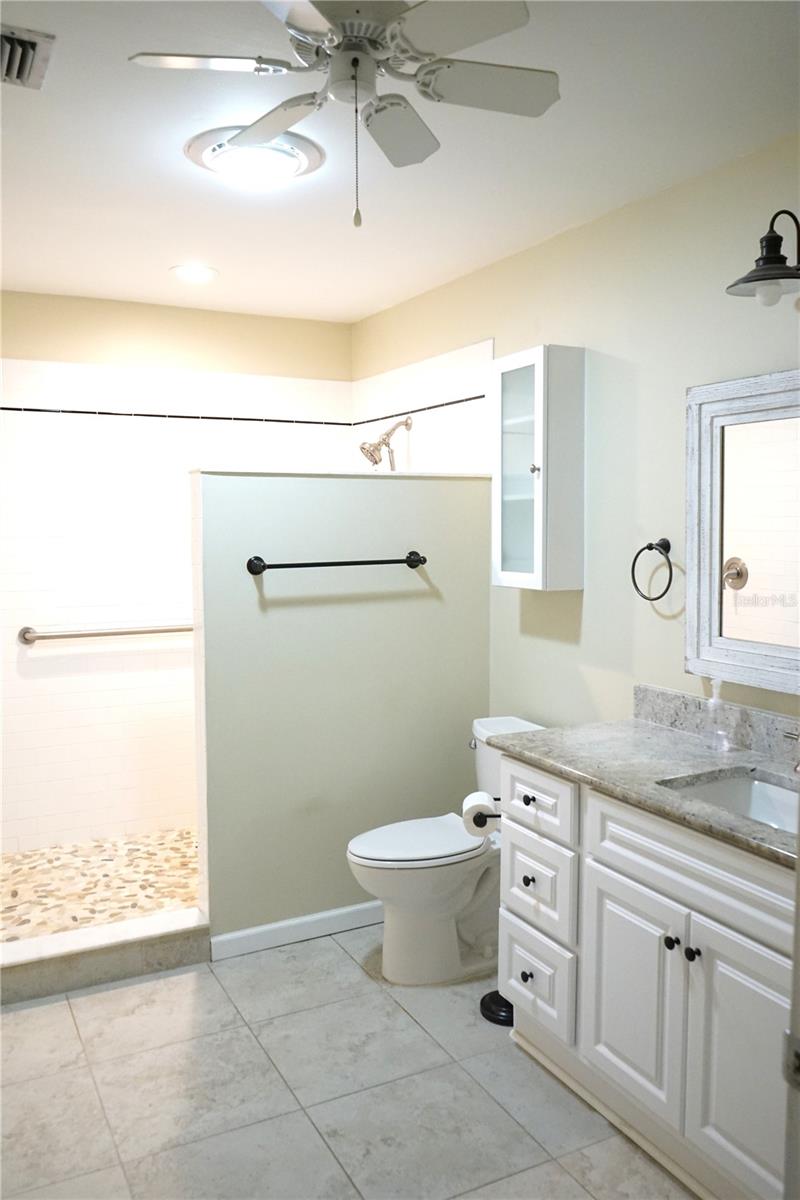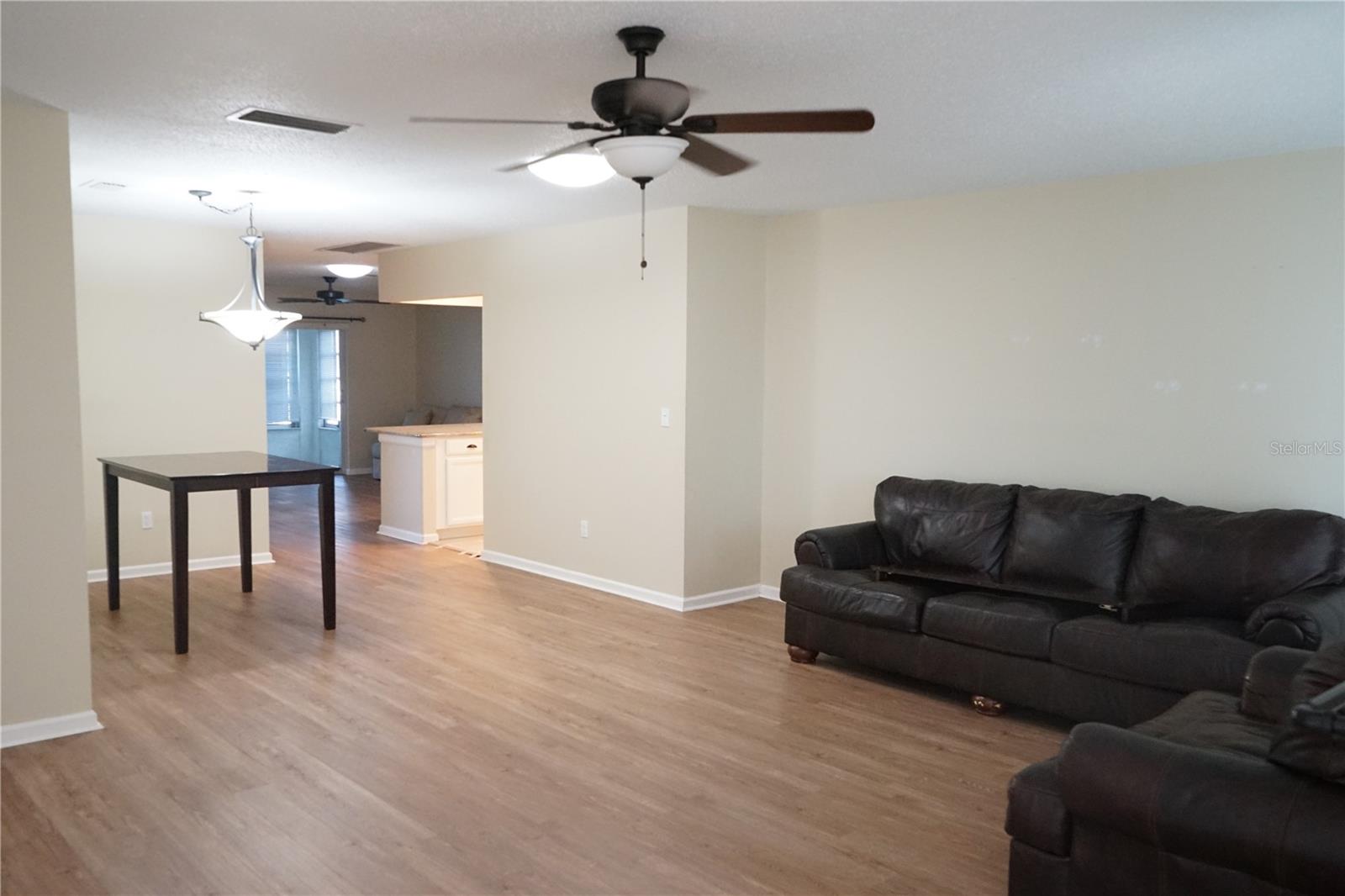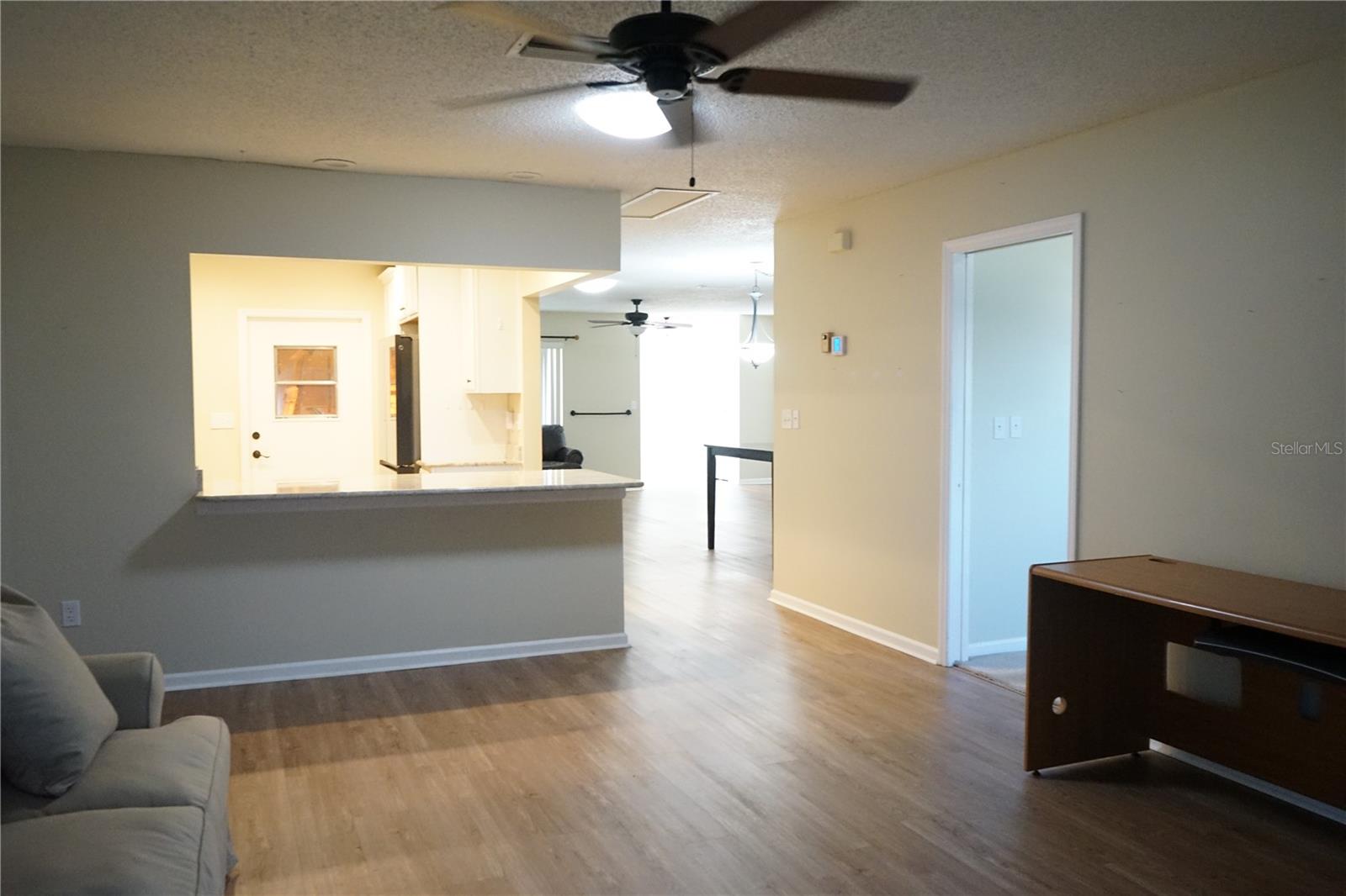 This popular Dedham floor plan has been redone and just needs your new paint color ! You'll have a large front porch to sit and watch the sunrise, then into the large living area with laminate floors here and the shared dining space. Next to this is the newer kitchen with rollouts, stainless appliances, lots of drawers, stone counters and a pantry for extra space. The roof is 2021, breakers 2023, ac 2011, copper pipes, water tank 2015. There's even an eating bar for a quick breakfast or lunch. The 2 bedrooms are on opposite sides and they each have their own full bath. The owners en suite has a large walk in shower and the guest is a tub/shower combo both with newer whit cabinets and the primary bedroom has 2 closets with custom shelving. There is a family room between them then you can go out through the slider to the glass enclosed lanai you can use as an office or hobby area. From there is a concrete pad for the grill too ! The 2 car garage is a little extra long and has a laundry room with a storage closet here too. The home has alLot to offer so come and take a look at this as is home today.