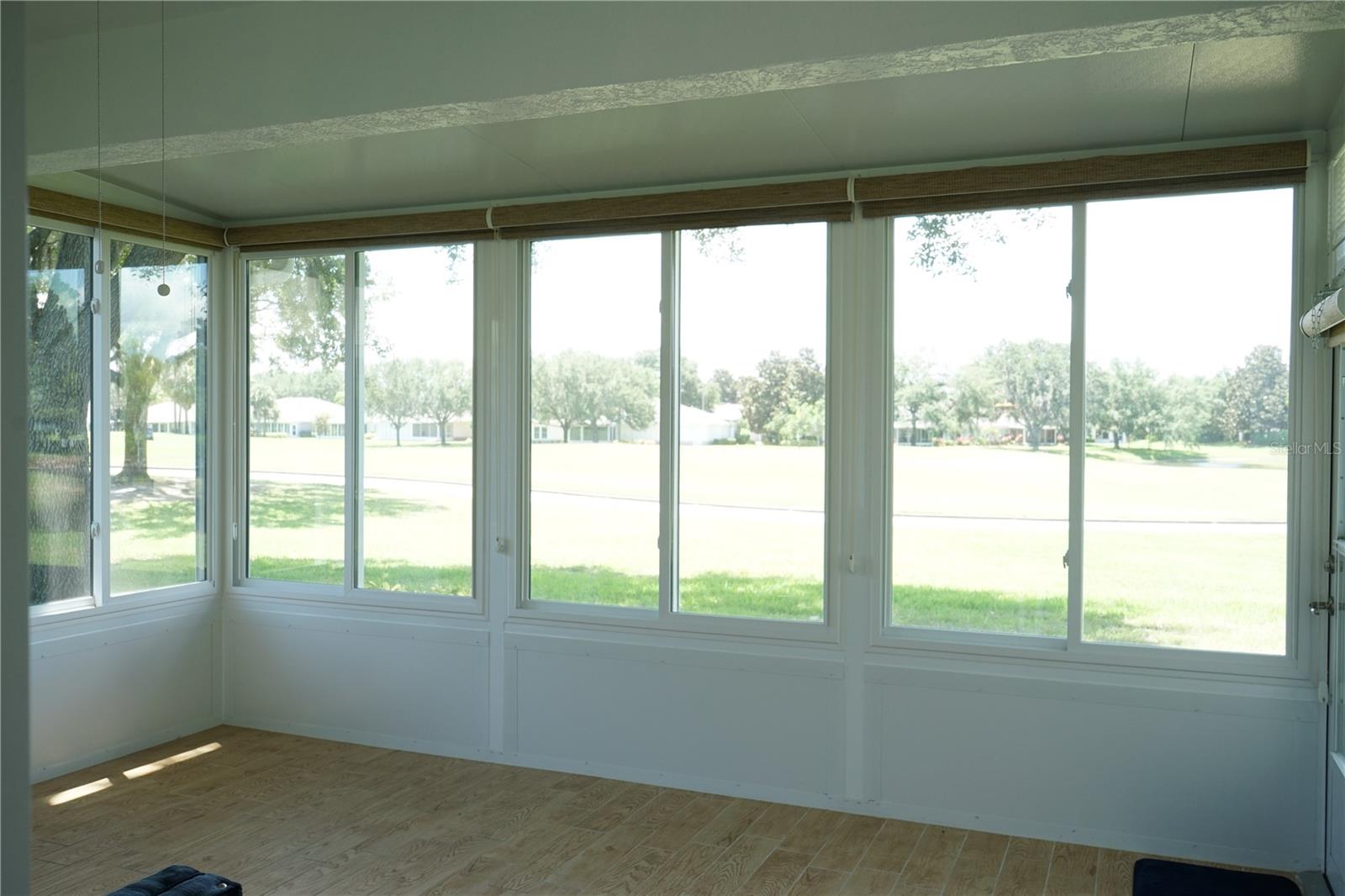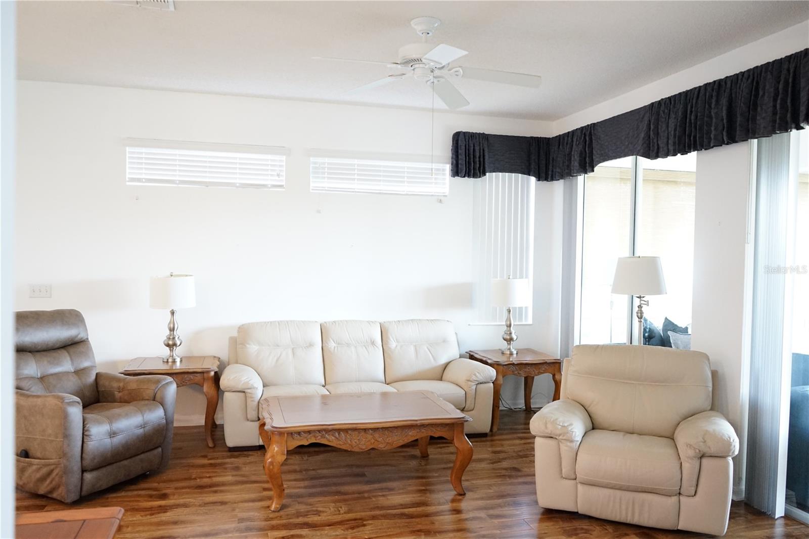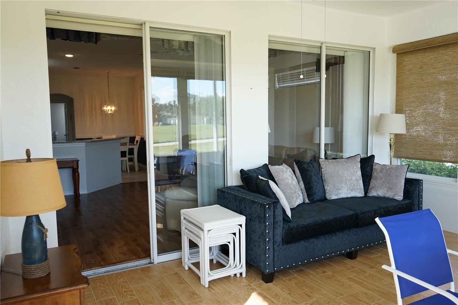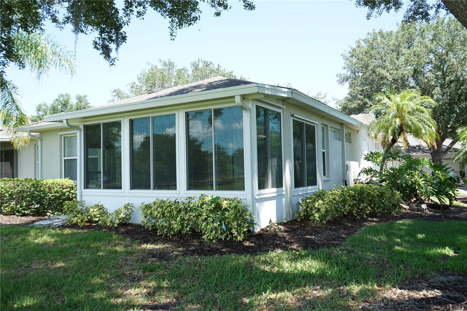 If you are looking for a peaceful view this is it ! The monthly fee here includes cable tv, internet, water, sewer, trash, recreation buildings, roofs, exterior painting and much more. This Westport floor plan features the primary bedroom at the back of the home and 2 bedrooms at the front for privacy. The screened entry brings you into the living room with beautiful floors and lots of light coming from the extended lanai overlooking golf and water behind you. The spacious kitchen also has the eating area with the laundry room and 2 closet pantry's taking you out to the 2 car garage. The EXTENDED Lanai is UNDER AIR adding to the square footage. The ceilings are high, the flooring is nice, the layout is great and the view is one of the best so don't miss this one ! Being sold as is, the home has cpvc pipes, siemens breakers, 2020 ac and an old water tank. The furniture can stay at no additional cost to buyer. Kings Point has plenty to do and we are less than an hour to 3 airports and multiple beaches.