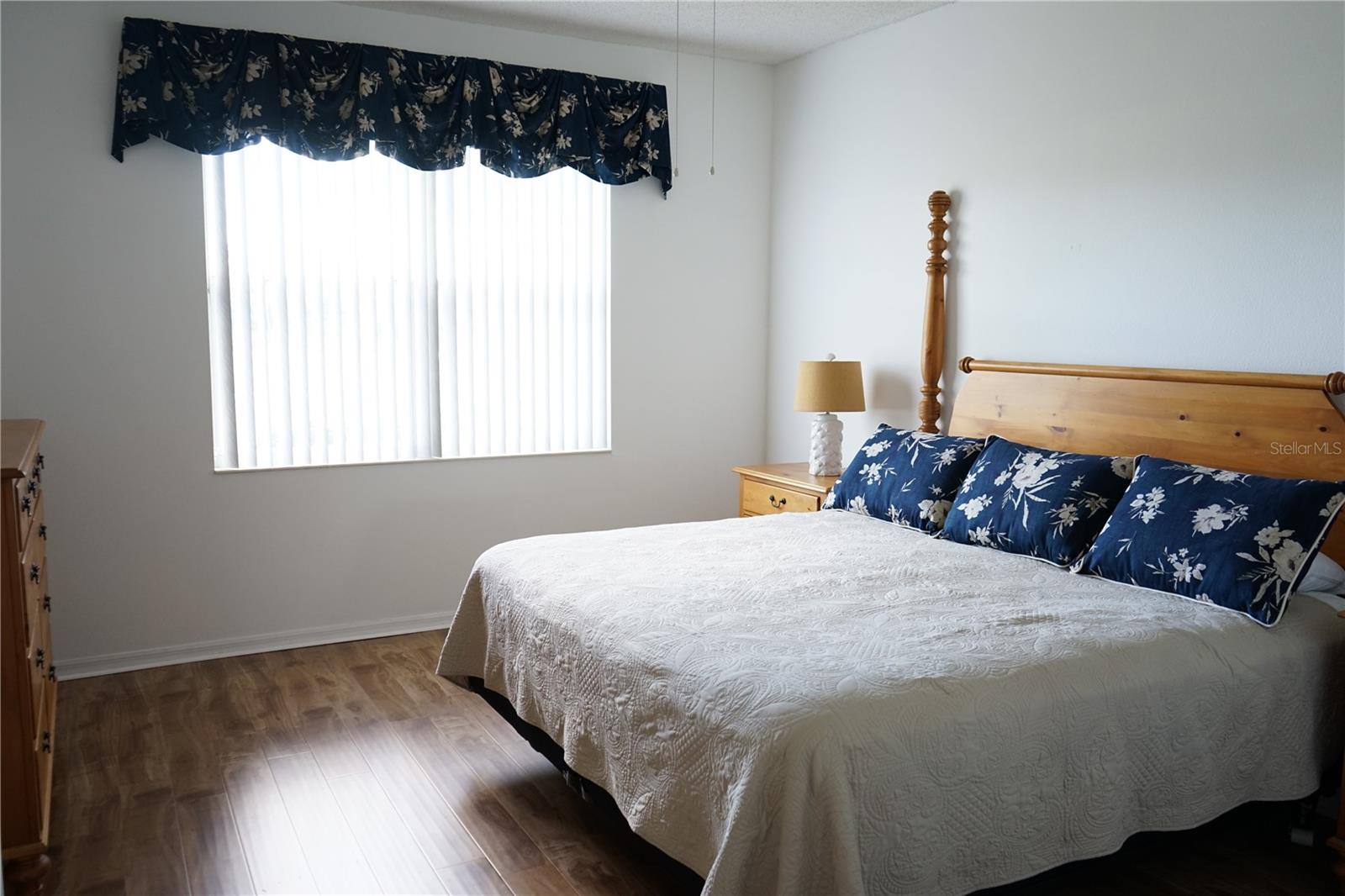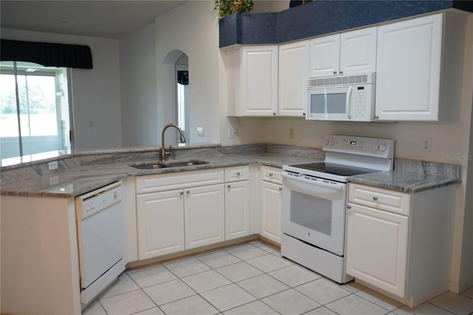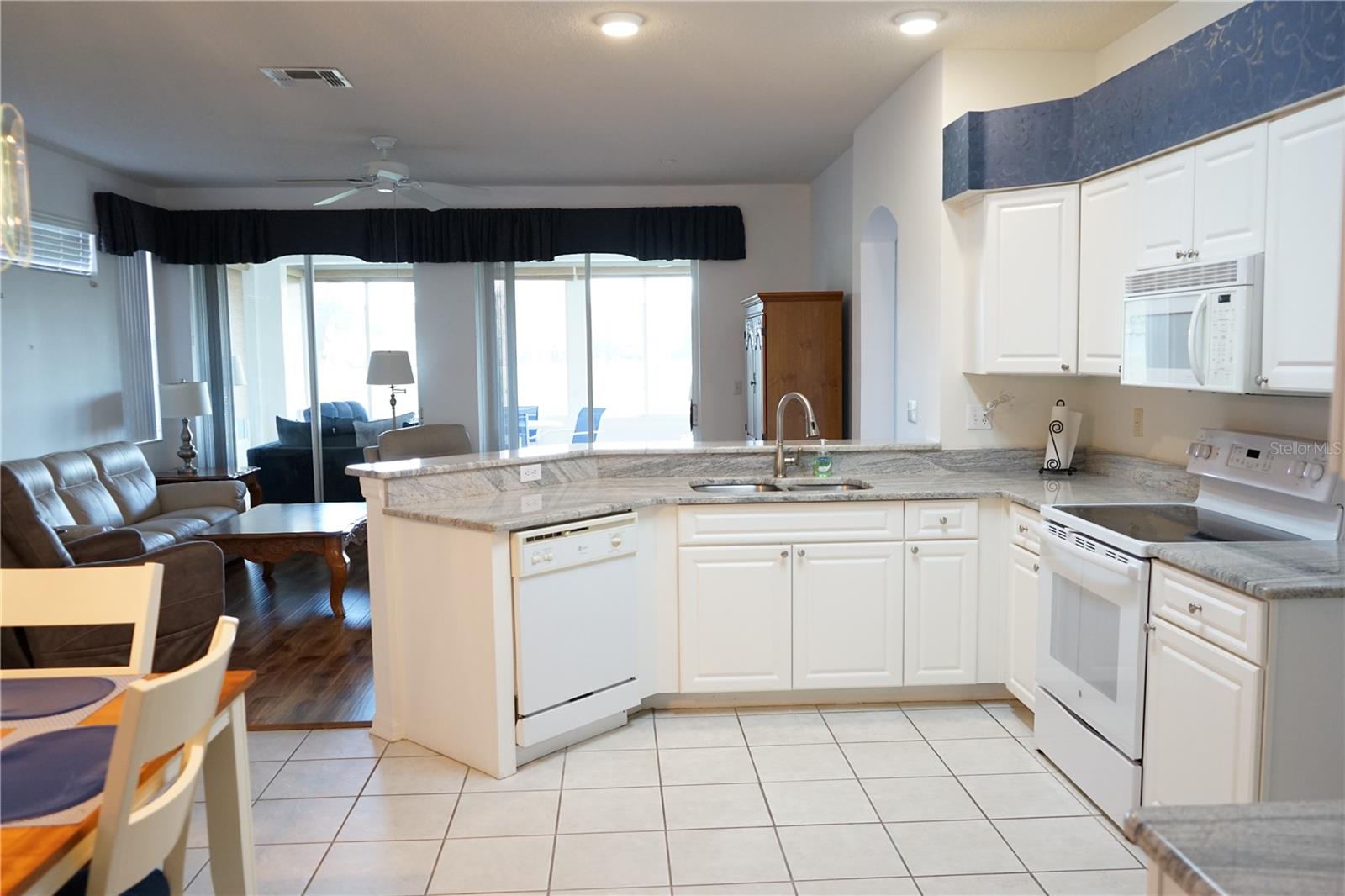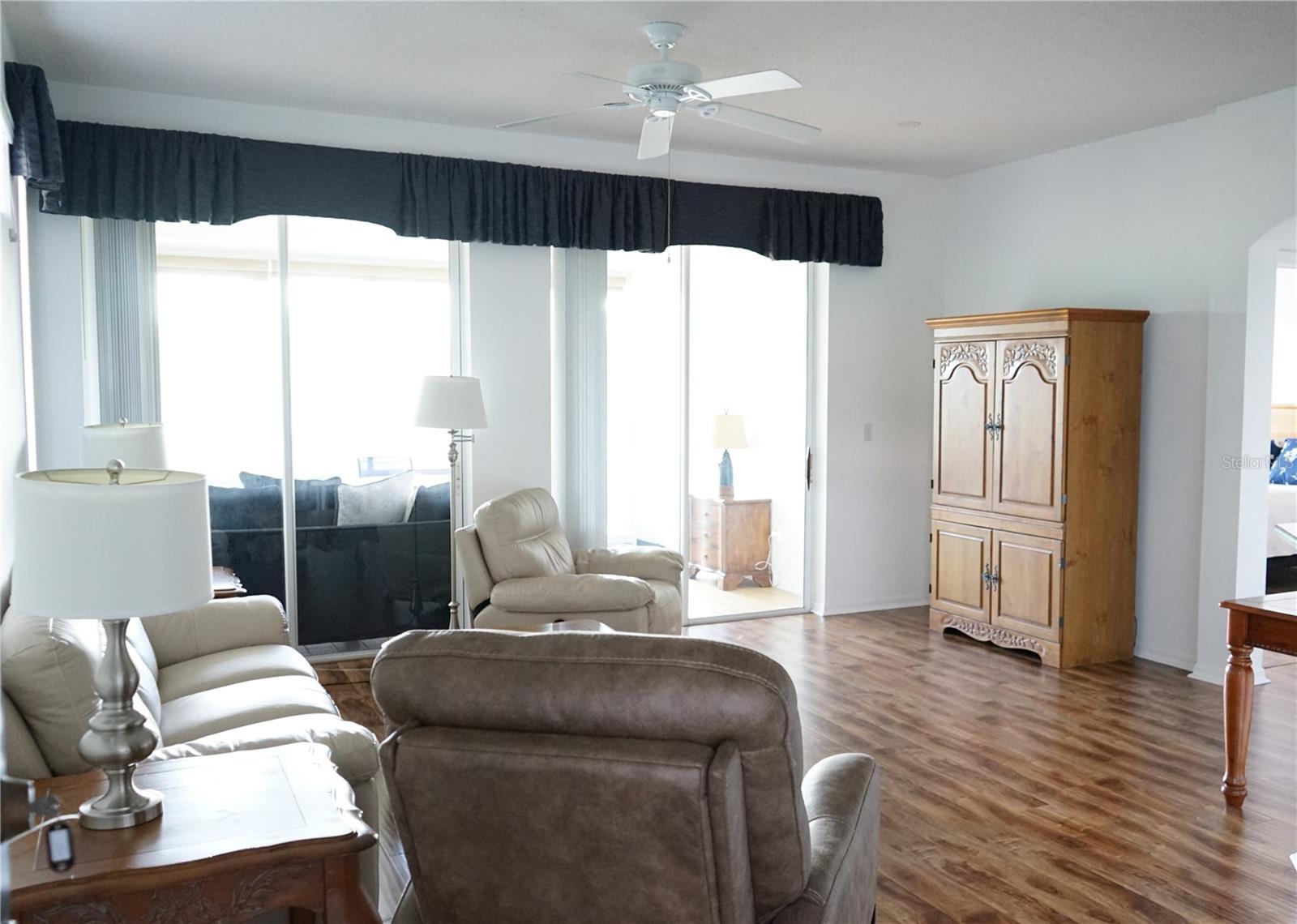 If you are looking for a peaceful view this is it ! The monthly fee here includes cable tv, internet, water, sewer, trash, recreation buildings, roofs, exterior painting and much more. This Westport floor plan features the primary bedroom at the back of the home and 2 bedrooms at the front for privacy. The screened entry brings you into the living room with beautiful floors and lots of light coming from the extended lanai overlooking golf and water behind you. The spacious kitchen also has the eating area with the laundry room and 2 closet pantry's taking you out to the 2 car garage. The EXTENDED Lanai is UNDER AIR adding to the square footage. The ceilings are high, the flooring is nice, the layout is great and the view is one of the best so don't miss this one ! Being sold as is, the home has cpvc pipes, siemens breakers, 2020 ac and an old water tank. The furniture can stay at no additional cost to buyer. Kings Point has plenty to do and we are less than an hour to 3 airports and multiple beaches.