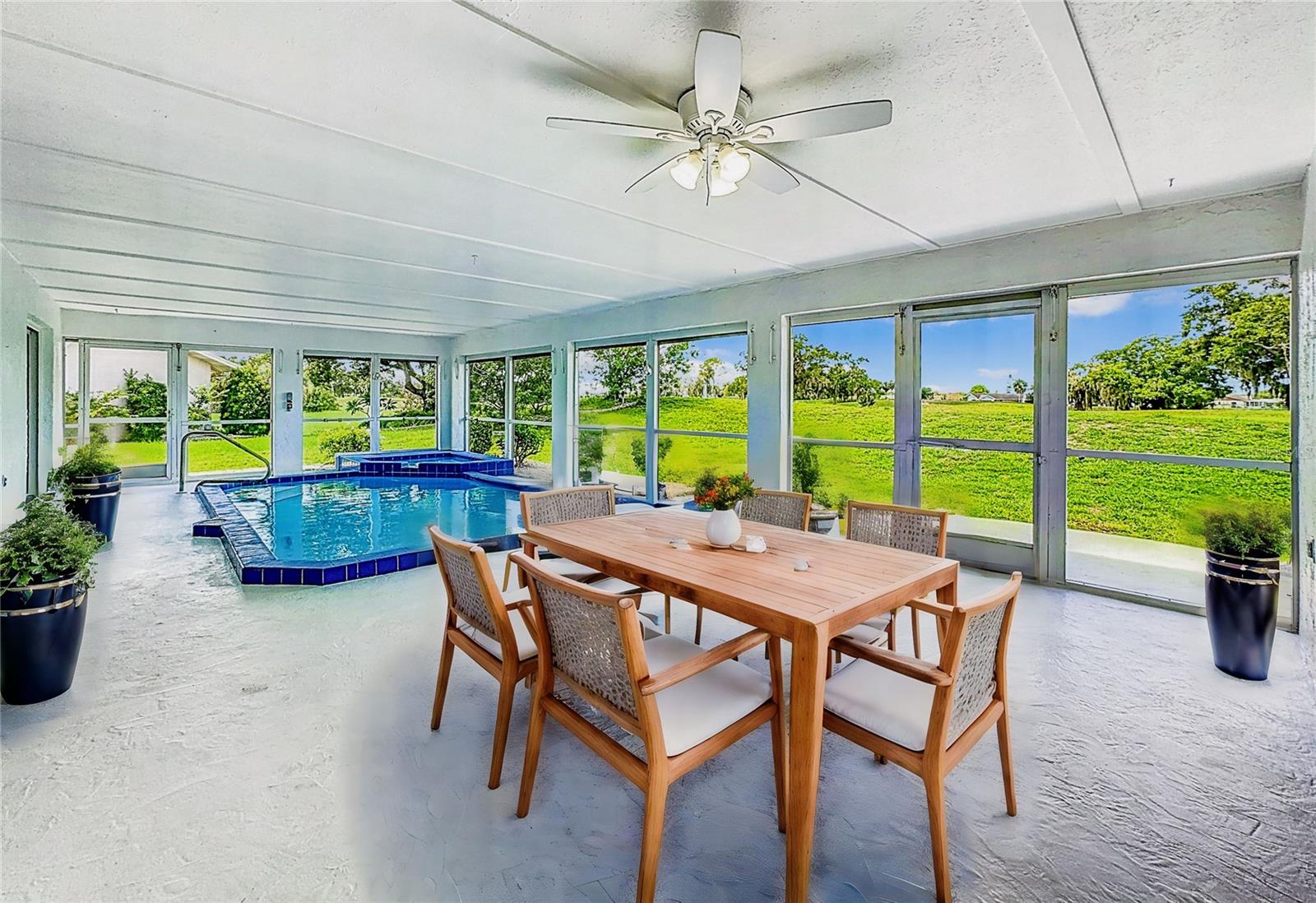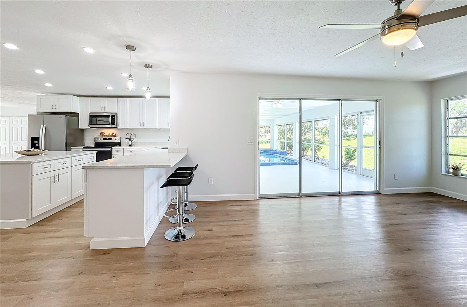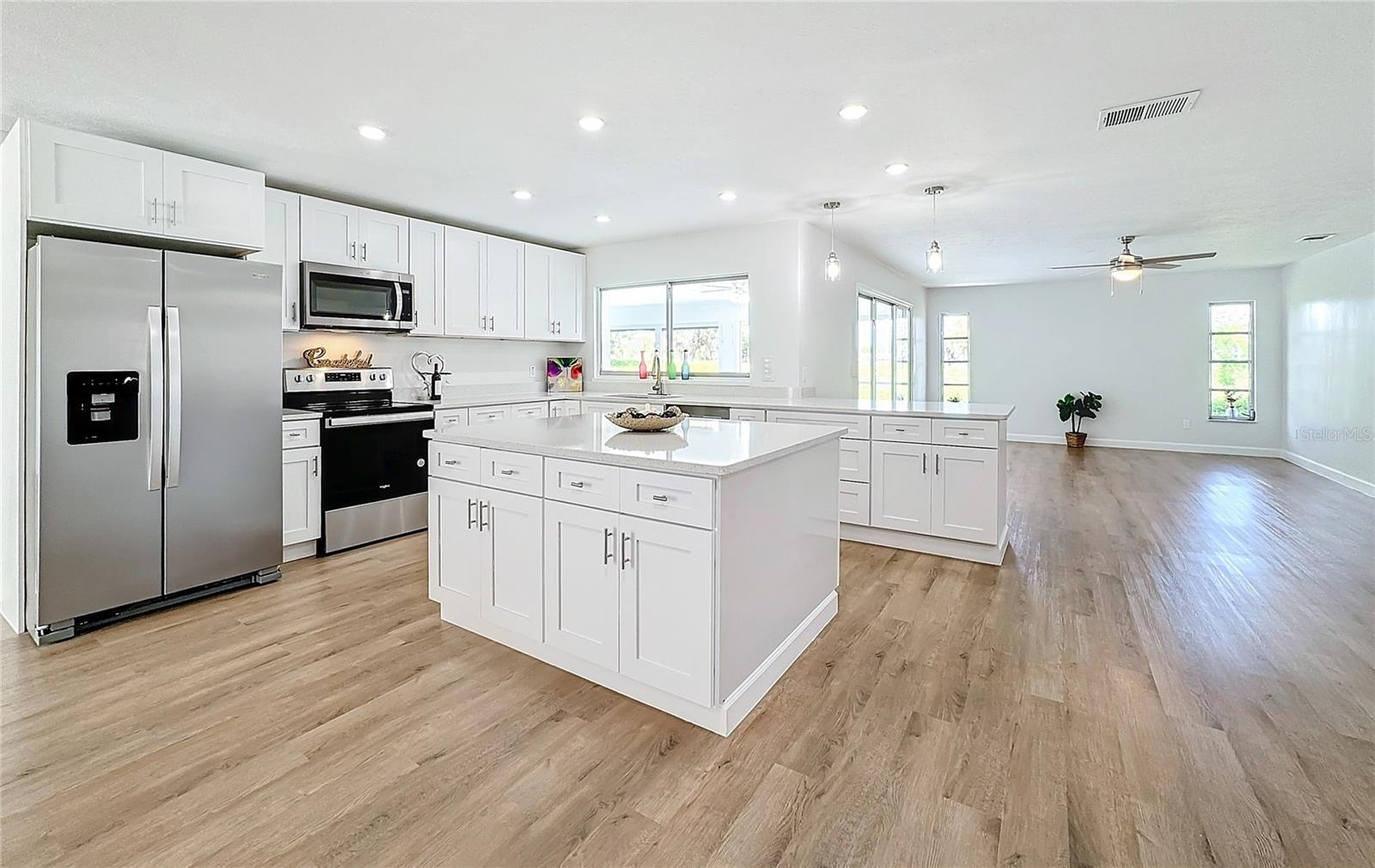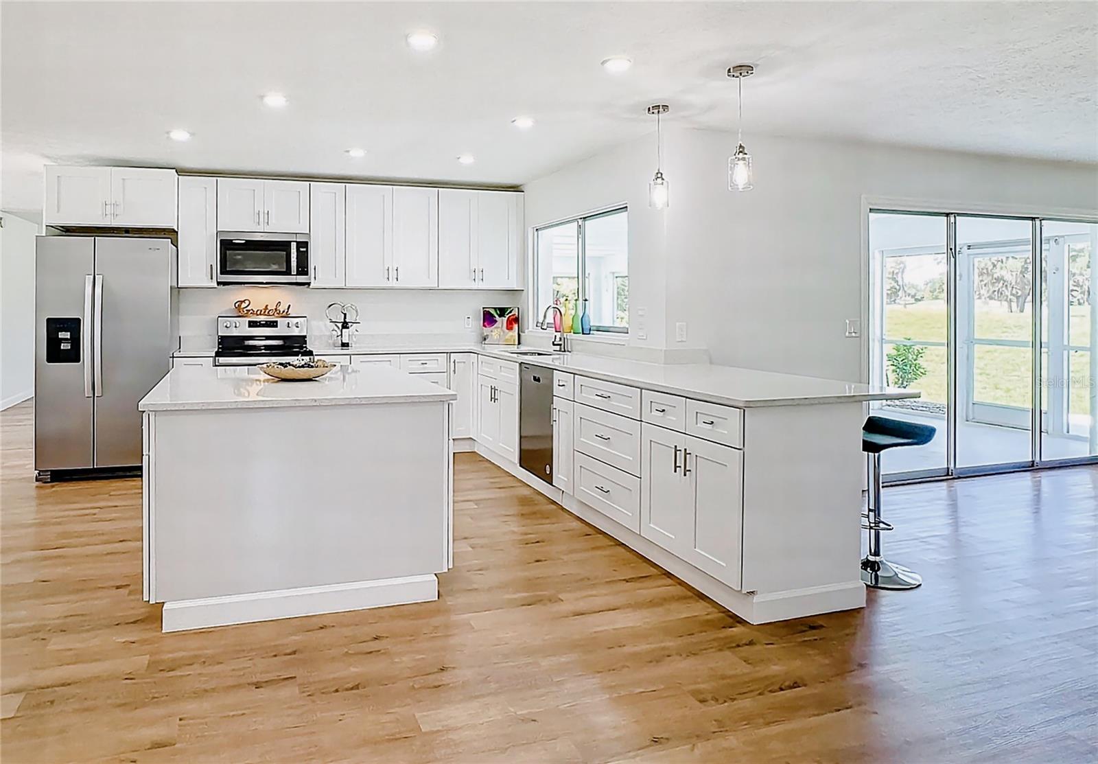 One or more photo(s) has been virtually staged. Come on over to your little piece of paradise with this spectacular newly renovated POOL HOME with a very private view, in the amenity rich community of Sun City Center! This wonderful 2500 sq.ft custom built home has it all! Roof replaced 2024, Pool resurfaced 2024, repipe in 2014 and the seller's are including a Home Warranty as well! The front door opens into the foyer, where you’ll be met with neutral color walls and new wood plank vinyl flooring, and an amazing view of the Sparkling pool and spa at the back of the home. White shaker cabinets and quartz countertops are the main attractions of the cook’s kitchen with large center island, new stainless-steel appliances, pantry and breakfast bar overlooking the dining area. In the light-filled Living room and dining area are an EXPANSIVE set of sliding patio doors that lead onto the beautiful lanai and pool. The spacious Master bedroom boasts 2 walk-in closets, along with an ensuite bathroom with dual sinks, quartz countertops, and a tiled walk-in shower. The split floorplan of this home provides privacy for guests, with two comfortable guest bedrooms and bathroom situated on the other side of the home. There is also a nice office/study with picture window of the landscaped courtyard. A good size indoor laundry room with washer and dryer hookups leads out to the 2-car garage with storage and golf cart door/access. Sun City Center is a 55+ community with 2 clubhouses, 3 pools, state-of-the-art fitness center, pickleball, Har-Tru tennis, over 200 clubs and activities and so much more!