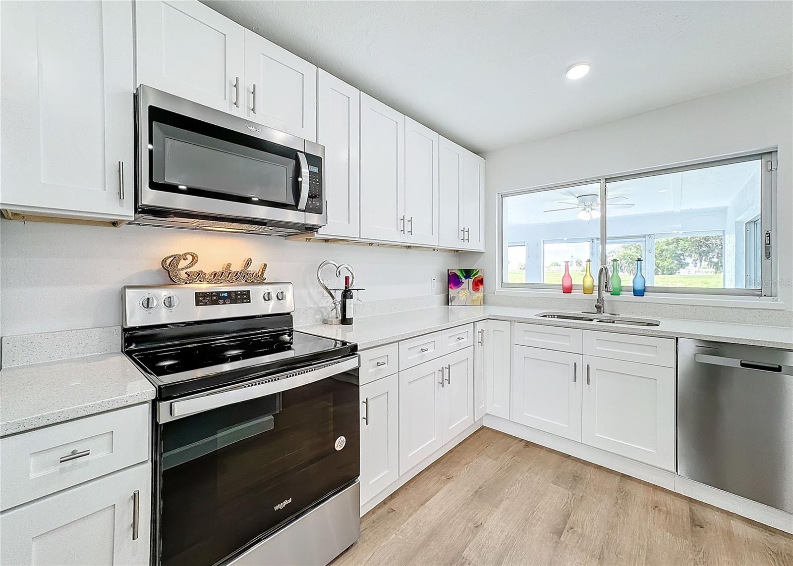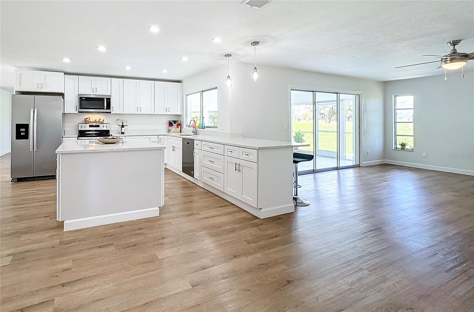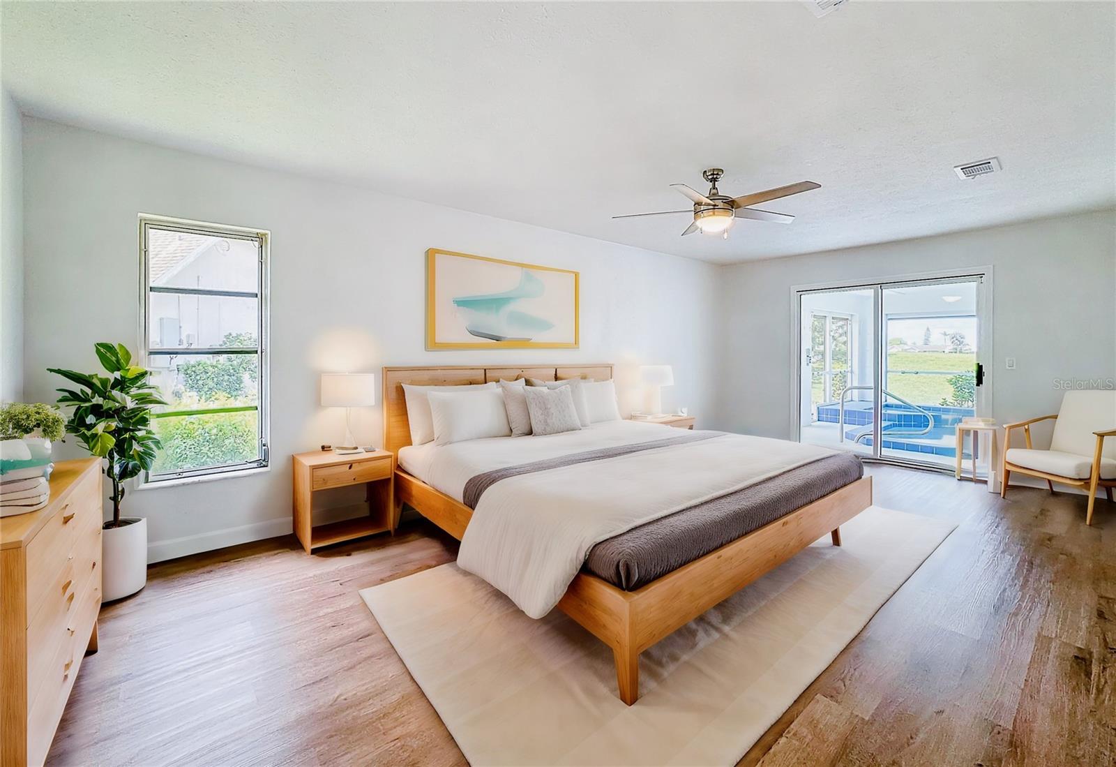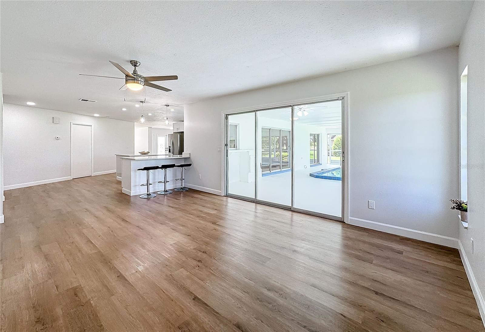 One or more photo(s) has been virtually staged. Come on over to your little piece of paradise with this spectacular newly renovated POOL HOME with a very private view, in the amenity rich community of Sun City Center! This wonderful 2500 sq.ft custom built home has it all! Roof replaced 2024, Pool resurfaced 2024, repipe in 2014 and the seller's are including a Home Warranty as well! The front door opens into the foyer, where you’ll be met with neutral color walls and new wood plank vinyl flooring, and an amazing view of the Sparkling pool and spa at the back of the home. White shaker cabinets and quartz countertops are the main attractions of the cook’s kitchen with large center island, new stainless-steel appliances, pantry and breakfast bar overlooking the dining area. In the light-filled Living room and dining area are an EXPANSIVE set of sliding patio doors that lead onto the beautiful lanai and pool. The spacious Master bedroom boasts 2 walk-in closets, along with an ensuite bathroom with dual sinks, quartz countertops, and a tiled walk-in shower. The split floorplan of this home provides privacy for guests, with two comfortable guest bedrooms and bathroom situated on the other side of the home. There is also a nice office/study with picture window of the landscaped courtyard. A good size indoor laundry room with washer and dryer hookups leads out to the 2-car garage with storage and golf cart door/access. Sun City Center is a 55+ community with 2 clubhouses, 3 pools, state-of-the-art fitness center, pickleball, Har-Tru tennis, over 200 clubs and activities and so much more!