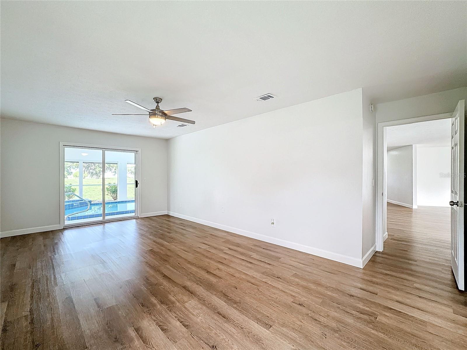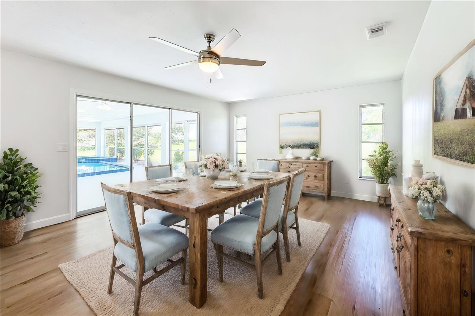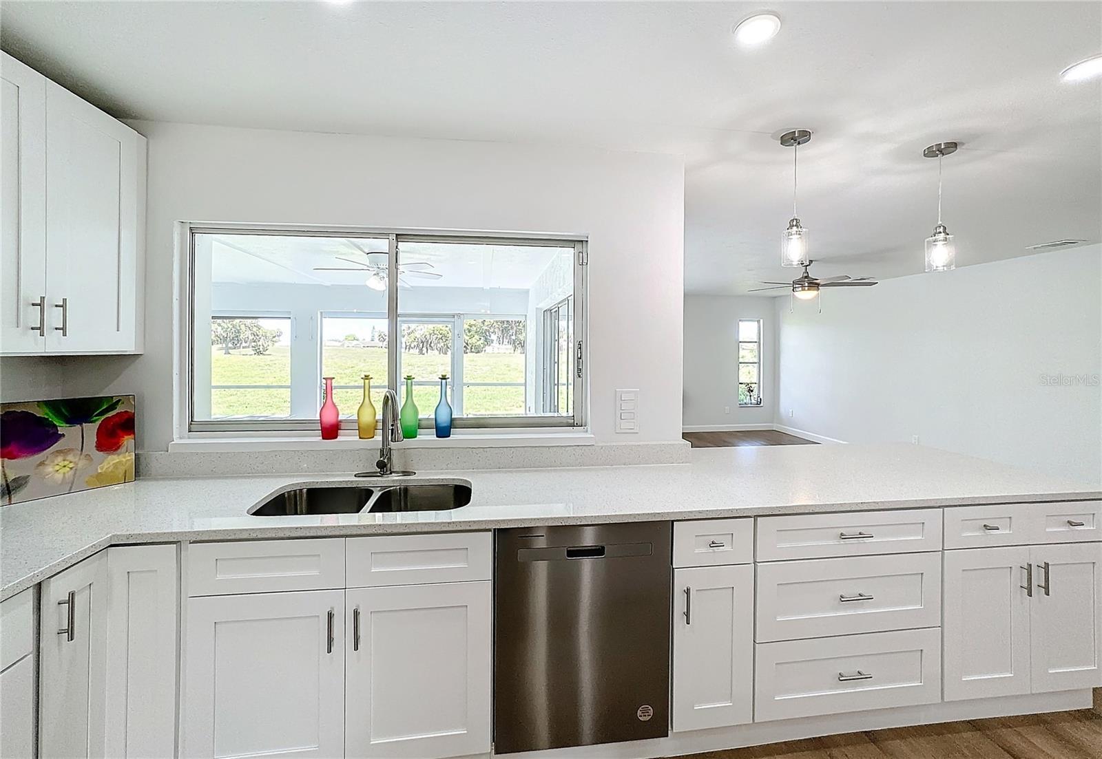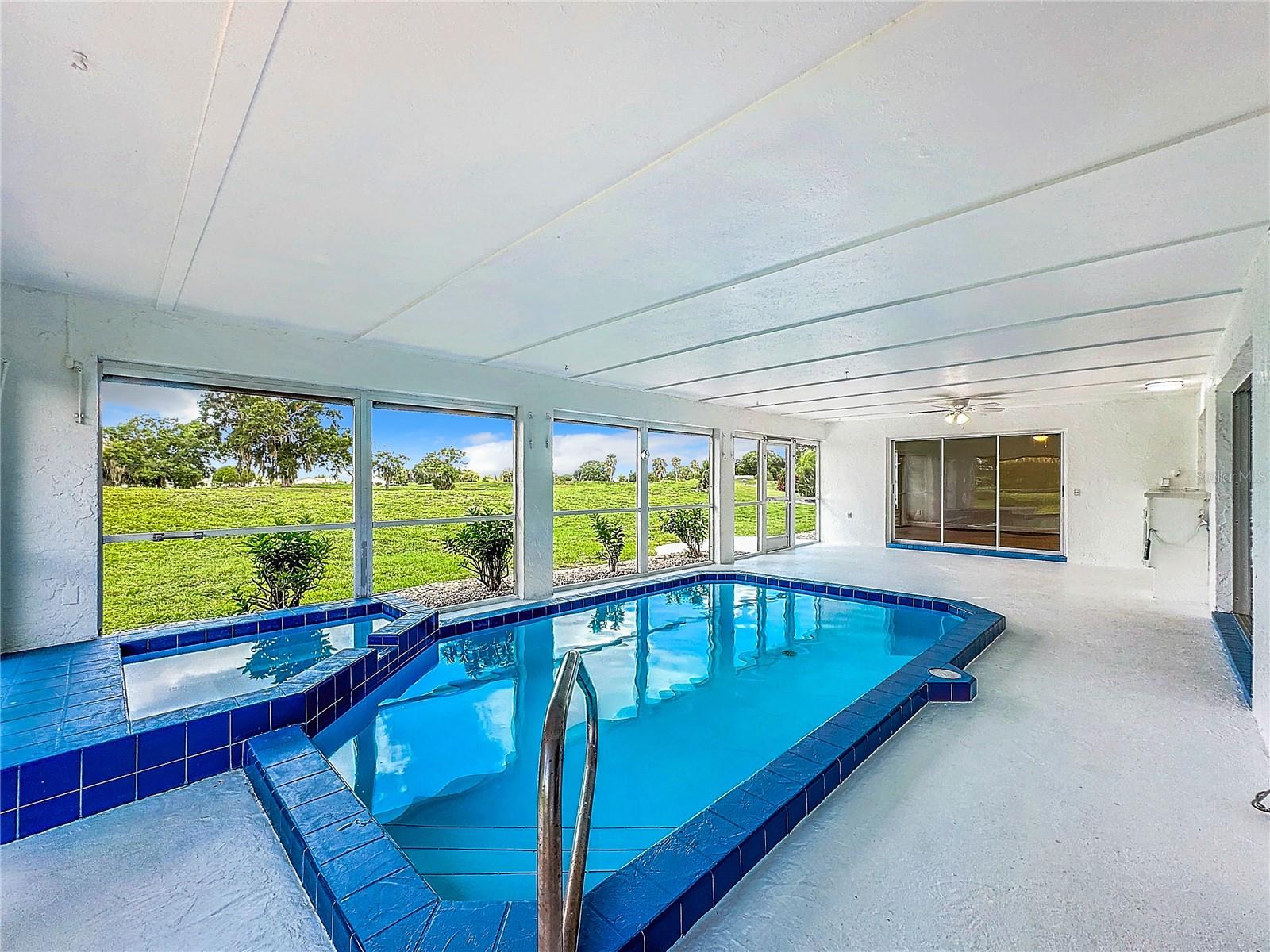 One or more photo(s) has been virtually staged. Come on over to your little piece of paradise with this spectacular newly renovated POOL HOME with a very private view, in the amenity rich community of Sun City Center! This wonderful 2500 sq.ft custom built home has it all! Roof replaced 2024, Pool resurfaced 2024, repipe in 2014 and the seller's are including a Home Warranty as well! The front door opens into the foyer, where you’ll be met with neutral color walls and new wood plank vinyl flooring, and an amazing view of the Sparkling pool and spa at the back of the home. White shaker cabinets and quartz countertops are the main attractions of the cook’s kitchen with large center island, new stainless-steel appliances, pantry and breakfast bar overlooking the dining area. In the light-filled Living room and dining area are an EXPANSIVE set of sliding patio doors that lead onto the beautiful lanai and pool. The spacious Master bedroom boasts 2 walk-in closets, along with an ensuite bathroom with dual sinks, quartz countertops, and a tiled walk-in shower. The split floorplan of this home provides privacy for guests, with two comfortable guest bedrooms and bathroom situated on the other side of the home. There is also a nice office/study with picture window of the landscaped courtyard. A good size indoor laundry room with washer and dryer hookups leads out to the 2-car garage with storage and golf cart door/access. Sun City Center is a 55+ community with 2 clubhouses, 3 pools, state-of-the-art fitness center, pickleball, Har-Tru tennis, over 200 clubs and activities and so much more!