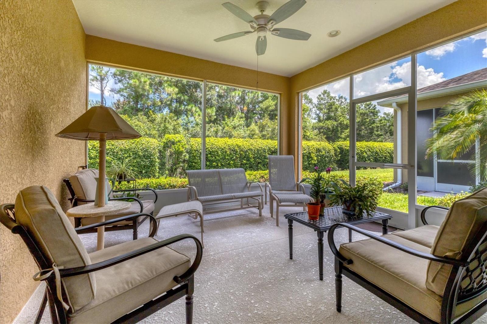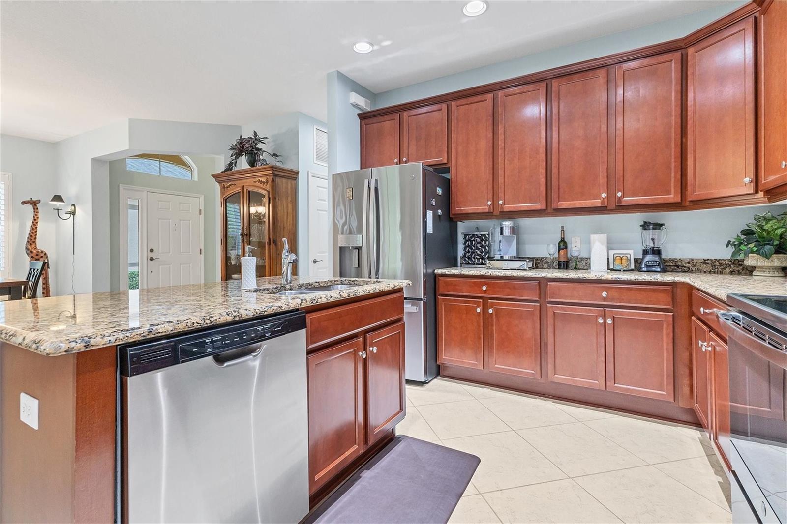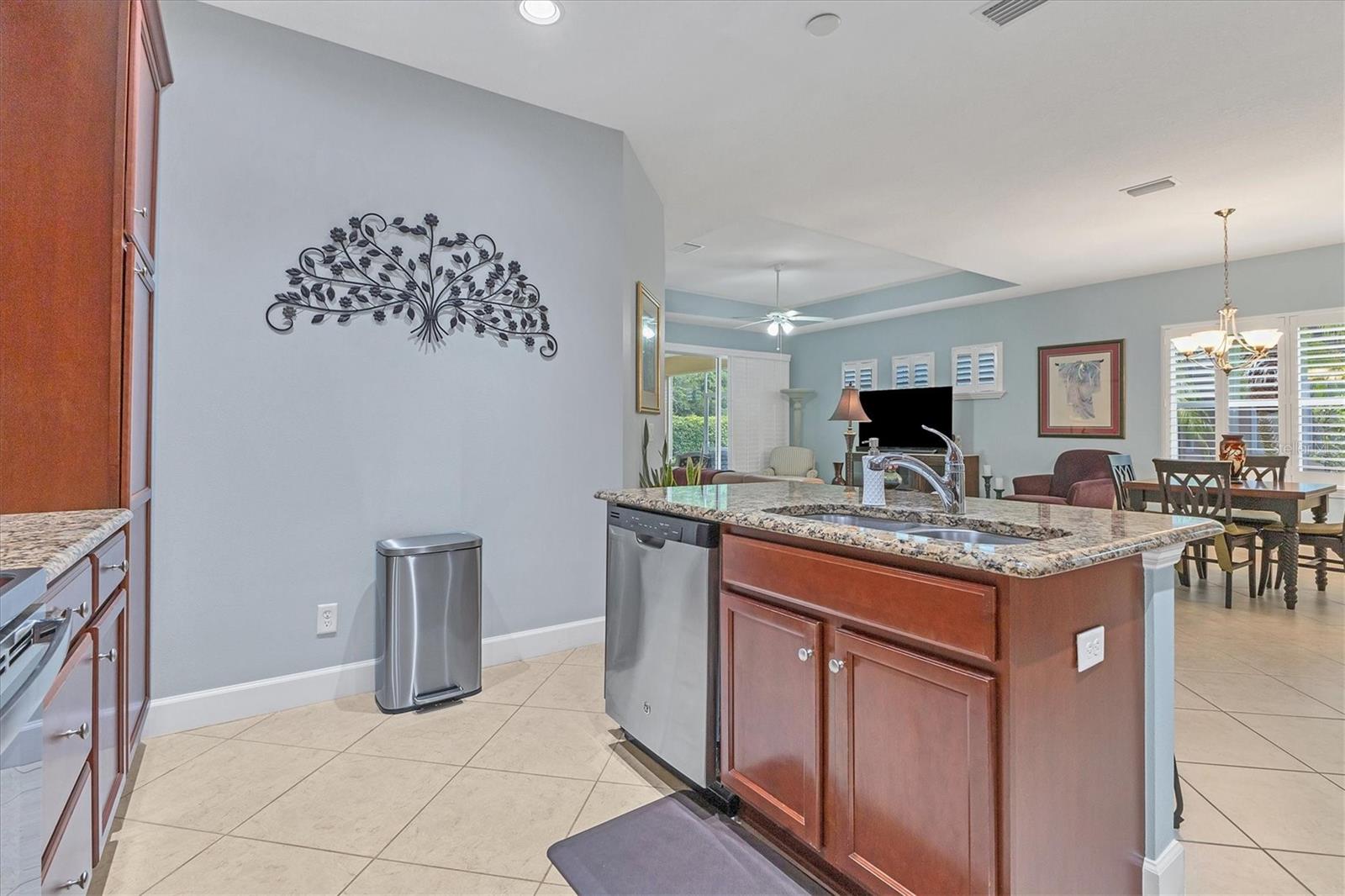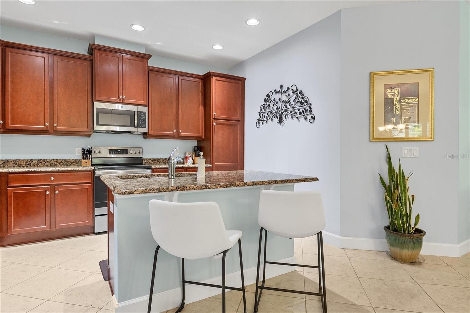 Beautiful 3 bed, 2 full bath, 2+ car plus room for a golf cart garage Kings Point 55+ condo! This Banyan floorplan features split bedrooms and an open kitchen/dining/living room layout and a new roof! Tile floors are on the diagonal throughout the living space while cozy carpet covers the bedroom floors. The kitchen has newer stainless appliances (2021), tall 42" cabinets with undermount lighting, lower cabinets with pull outs, granite countertops, and an island equipped with outlets. The large primary bedroom has a tray ceiling and fan and slatted blinds for the window. The ensuite bathroom has split vanities with granite tops, water closet, walk-in shower, and walk-in closet. The second bedroom could be another private suite since the second bath has a second door into the bedroom! Unique! The second bath has a brand new walk-in show with tile surround. The third bedroom has a built in closet, ceiling fan, and an arched window with slatted blinds. The living room is airy and has a triple slider which opens to the screened lanai. The view from the spacious lanai is green and calm. This laundry room is very large and equipped with plenty of cabinetry, newer washer and dryer (2021), and a functional utility sink. The garage has enough room for two cars PLUS golf cart storage. Since the home was built in 2013, the roof, A/C, electric panel, and water pipes are all original and up to code. Hurricane shutters for all windows and sliders come with this unit as well. Located in the very back of the community near the Manatee State Park, on a cul-de-sac, this street is quiet. One monthly fee covers all exterior maintenance, roof reserves, exterior structure insurance, lawn care, tree trimming, irrigation, water, basic cable tv, internet, all Kings Point facilities and common areas, private roads and security. You only pay your other bills for electric, interior insurance, and property tax. Kings Point is an active 55+ community with two beautiful clubhouses, auditorium, restaurant, bistro, pools, gym, pickleball courts, art facilities, library, and clubs galore to join or explore! Take a minibus tour to see a show or a ballgame. Sun poolside and listen to live music. Play a round of golf (Scepter is a Clublink owned course). Learn a new craft or develop a hobby. Ride your bike or walk the trails. Play cornhole. Whatever your interest, it's here! Golf carts are a main mode of transportation in the community and surrounding areas. Golf carts can access local shopping centers, banks, groceries, medical facilities and doctors offices, and houses of worship. Located just east of I-75 and between Hwy 41 and 301, vehicle travel is convenient. Tampa is just to the north west. Sarasota with its world-class beaches is to the south. Disney is less than 90 miles away. Little Manatee State Park borders Sun City Center to the south. E.G Simmons Park along the Bay is 10 miles west. So much to do here! So affordable! Enjoy 55+ life on your terms starting today!
