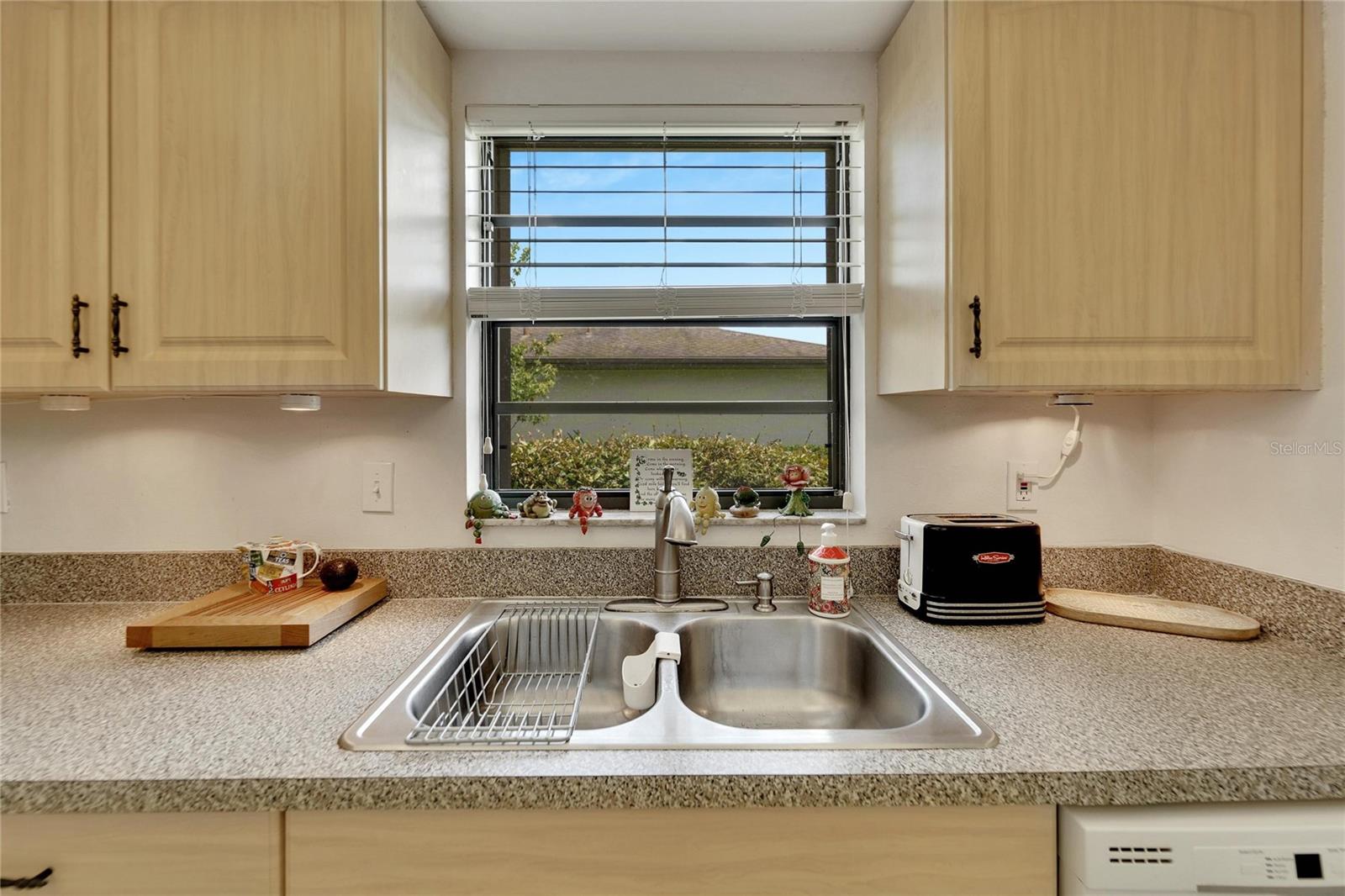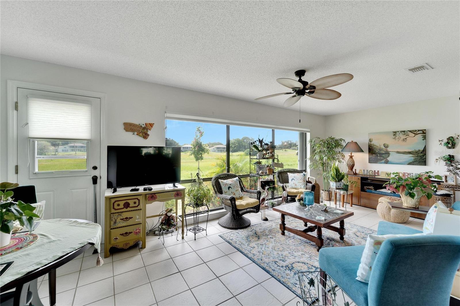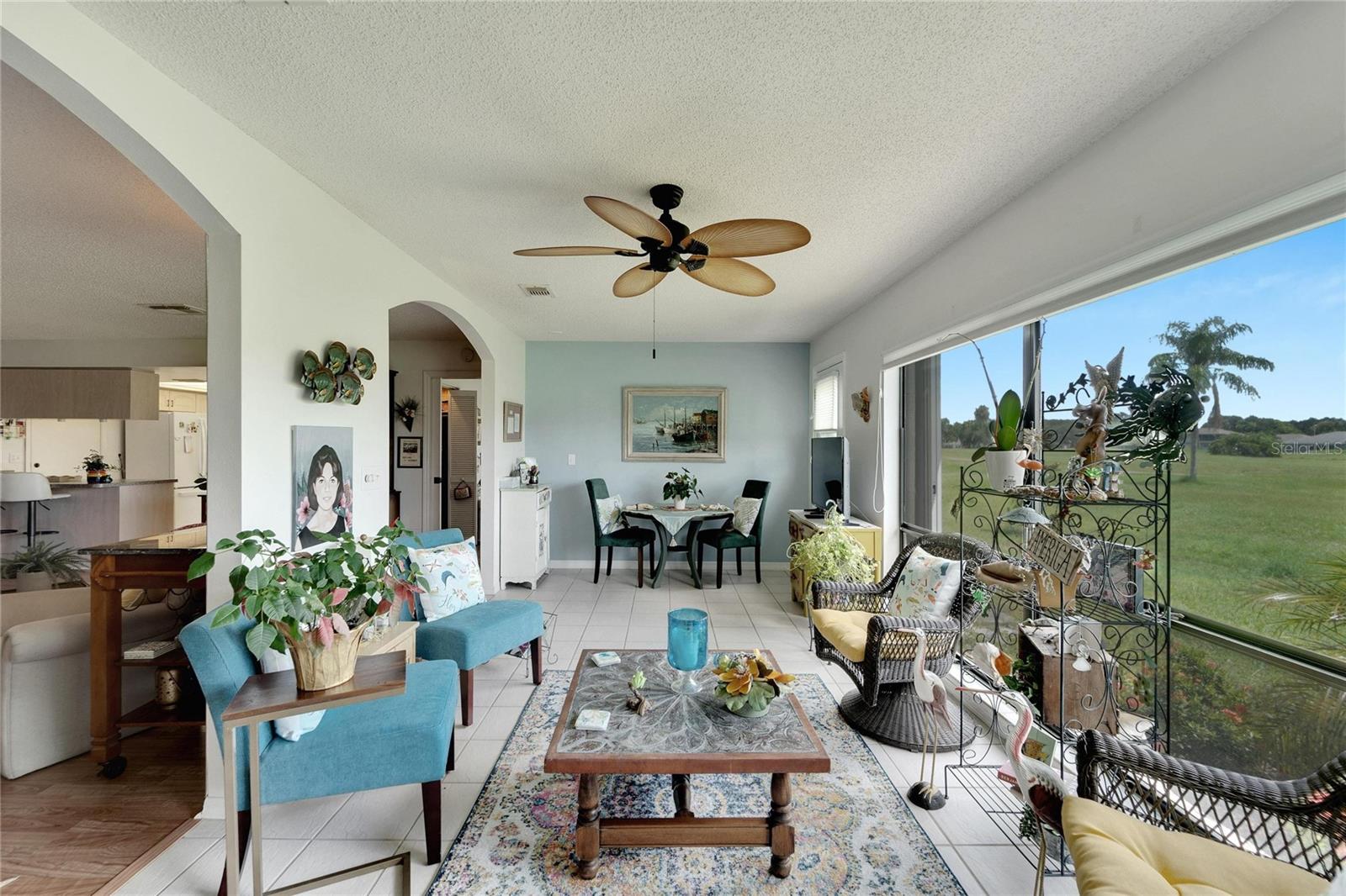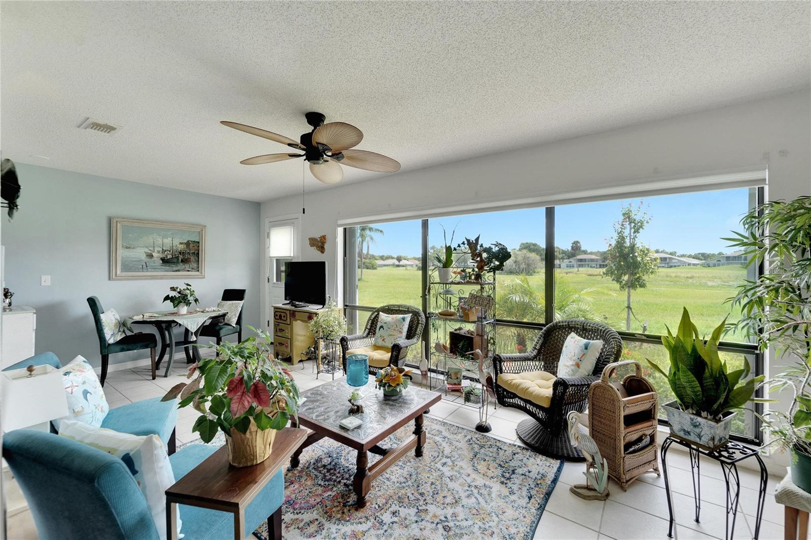 WELCOME TO YOUR DESIRABLE MAINTENANCE FREE HOME! This updated & exceptionally well cared for Sunsetter II split floor plan unit is in a lovely & serene area of Kings Point. It has a peaceful open rear green space view that makes your enclosed Lanai the perfect place to sit & sip your coffee while you contemplate & plan your day. As you drive up to this charmer, you will love its curb appeal and soon to be installed brick paver driveway. Walk thru the lovely, screened porch & step thru the decorative glass beveled front door and you will be delighted by its great Florida vibes, the open living/dining room, neutral color scheme, upgraded fans & fixtures, and roomy kitchen that is large enough for an island workspace. The kitchen boasts foiled grain cabinets, breakfast bar, under the counter lighting, & newer appliances. The primary bedroom has walk in closet and leads to your ensuite bath that has a seamless shower door. Another great feature of this home is the spacious enclosed rear lanai with even tile flooring & the removal of the Primary bedroom slider that was replaced with an interior wall, giving the room more usable space. There is still an ample amount of windows for basking in the sunlight or enjoying warm seasonal breezes. The rear exterior door leads you to your cozy garden area and the expansive public green space behind this unit. Your 2-car garage has multiple storage cabinets which provide you with extra storage space and has a handy an electric roll down screen. Because this home has the ideal amount of space to live comfortably and truly has “form & function” you won't be overwhelmed with household chores or home maintenance; allowing more time to spend with family & friends as you engage in all the fun Kings Point happenings enjoying social activities, join clubs, or participate in any of the many recreational pursuits that may be of interest and help keep you fit. Your condo fees include internet/cable, water, pest management, outside maintenance, & depending on the KP maintenance plan, all inside maintenance can be cared for too…truly stress-free living. Kings Point is a highly sought after active 55+ golf & golf cart community which offers a North & South Clubhouse, resort style pools/spas, fitness center, restaurant, bar & café, a huge array of arts, crafts, clubs, and an array of indoor & outdoor sports with exceptional Pickleball courts. Whether you visit their spectacular Clubhouse, dine at their tasty restaurant, or quench your thirst in their friendly bar. You will love socializing & making new friends! Start living & loving Retirement & Kings Point Living. Kings Point is close to beaches, shopping, & big city activities & entertainment. Don't wait, schedule your showing…You don’t want to miss your opportunity to call this lovely gem home.....The only thing missing is you!