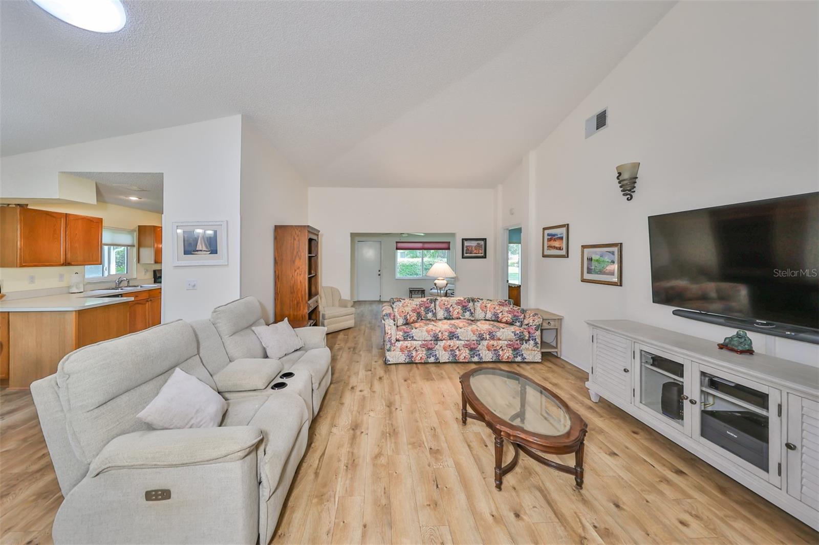 Ready to retire and enjoy a fun maintenance free lifestyle? This beautiful 2 bedroom, 2 bathroom, 2 car garage turn key condominium in the heart of KingsPoint comes with a transferrable KingsPoint Gold Warranty! The HVAC was installed October 2019 and is covered under the KP warranty. Re-piped 2018. This well loved home has a screened front entry, paver driveway, dual pane hurricane windows installed throughout in 2020, and gorgeous wood look laminate flooring. The spacious interior has vaulted ceilings, and a semi open floor plan with the living room and eat-in kitchen seemlessly connecting to the Florida room which leads to a screened patio. The large primary bedroom is located at the rear of the home for privacy and has a vaulted ceiling, and both a walk-in and a built-in with closet. The primary bathroom includes has a walk-in shower, linen closet, and a dual sink vanity. The large second bedroom is light and bright, has a Murphy bed, and a built-in closet. The guest bathroom has a tub/shower combo. The back door opens to a lovely shaded lawn area, providing a tranquil outdoor space. Additionally, this home is a short walk or bike ride to the popular South Clubhouse. This inviting home offers a practical yet comfortable living experience in the heart of Kings Point. Don't miss your chance to make it your own! You'll love the KingsPoint community which has amazing amenities and facilities, indoor & outdoor pools, two well appointed Clubhouses, and numerous clubs and activities just waiting for you to come and enjoy! Conveniently located between Sarasota, Tampa, and St. Petersburg, this is the perfect location to enjoy all that the Tampa Bay area is known for; airports, great shopping, dining, professional sports, and award-winning, sandy beaches. This is the best of all worlds but without the stress. Even if you are still working, you can leave it all behind and start enjoying a maintenance free resort lifestyle in one of Florida's most affordable 55+ golf cart friendly communities! Motivated Seller. Call today for a private tour!