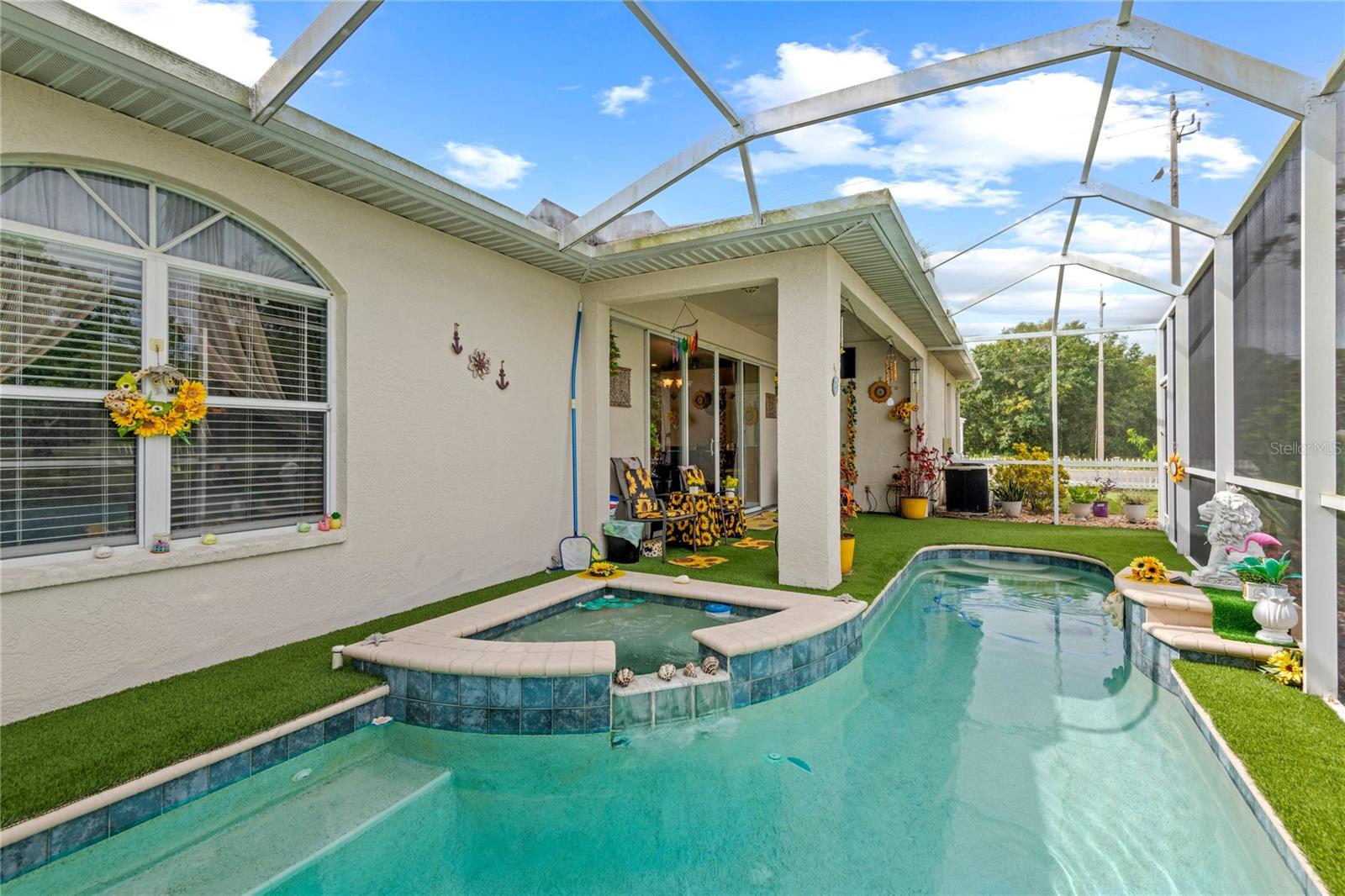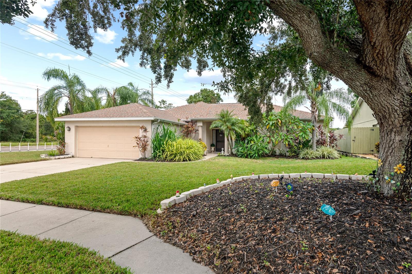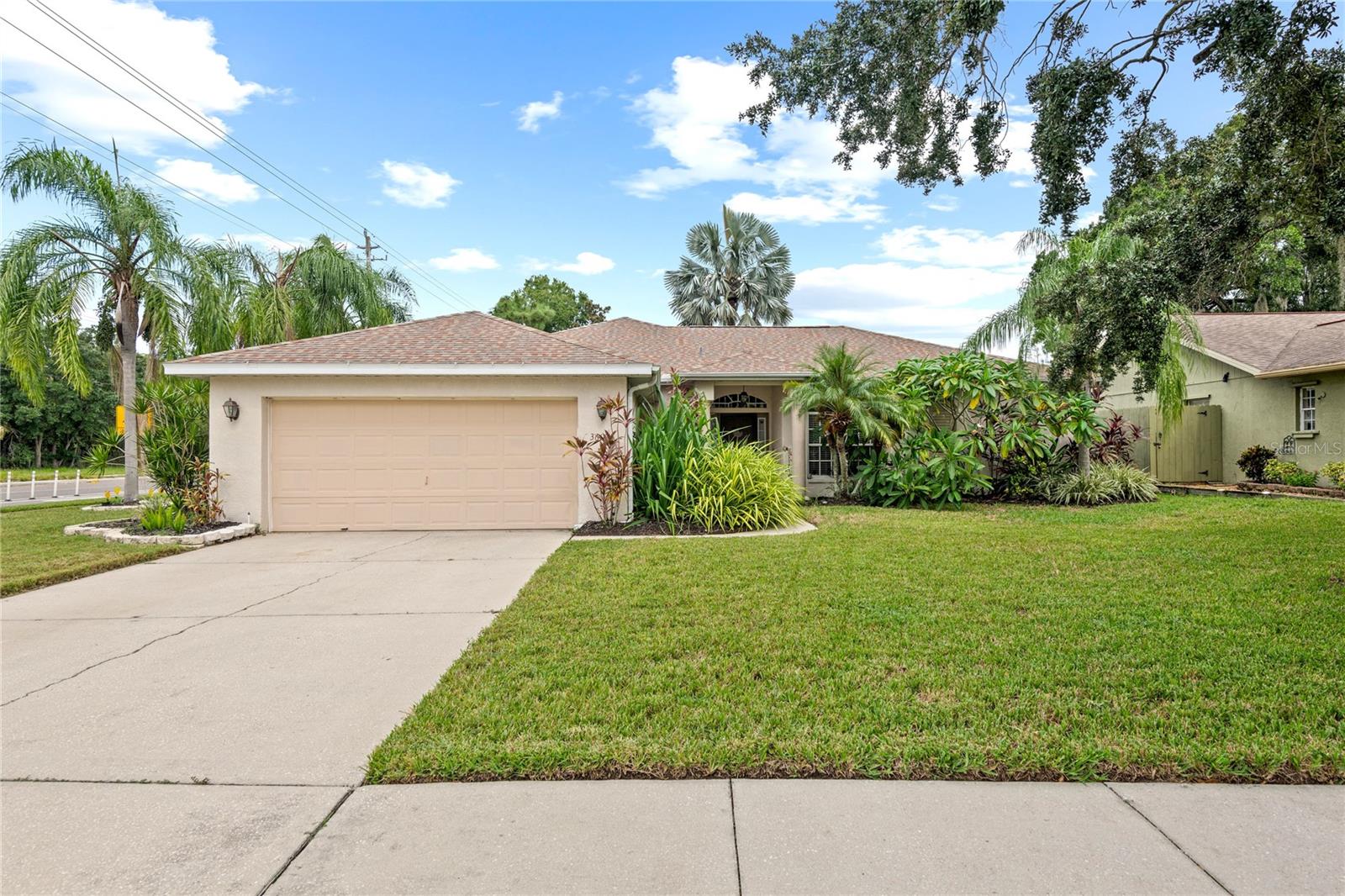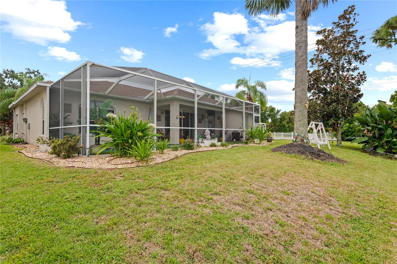 NO CDD AND VERY LOW HOA! This home is situated on a lovely corner lot, nearly 1/4 acre, at the end of a quiet cul-de-sac with only 12 homes. It's a peaceful neighborhood, perfect for walking, biking, and golfing. The golf course is just a few streets away, and the pro shop is a short golf cart ride from the home. The master suite features dual sinks, a Roman tub, a walk-in shower with a built-in seat, and two walk-in closets. The split floor plan with a pocket door offers privacy for guests and other rooms, while the guest bath conveniently opens to the lanai. This home has been meticulously cared for and maintained. It features new top-of-the-line carpet and padding in the bedrooms, engineered wood, and tile flooring in the main areas. The kitchen boasts stainless steel appliances, and there’s an irrigation timer for the beautiful bedding plants with drip lines. The guest wing includes a pocket door for privacy from the main living areas, with a guest bath that opens to the lanai and pool. The home has been freshly painted and is move-in ready—just bring your swimsuit and relax by the screened-in pool. There’s also a separate entrance into the garage with parking for your golf cart. Additionally, the home features a separate laundry room with a laundry tub. This property is minutes from shopping, dining, golf courses, and beaches, all while being located on a street with only 12 homes, low HOA fees, and no CDD.