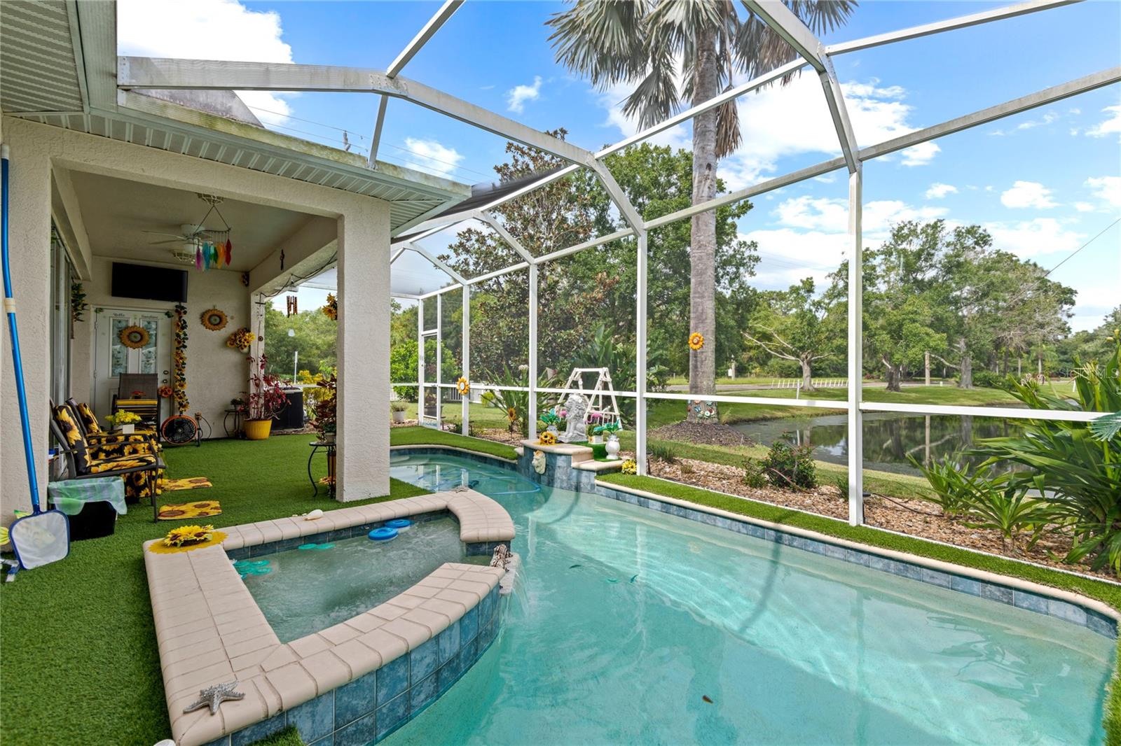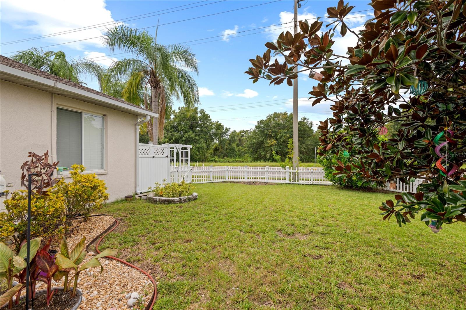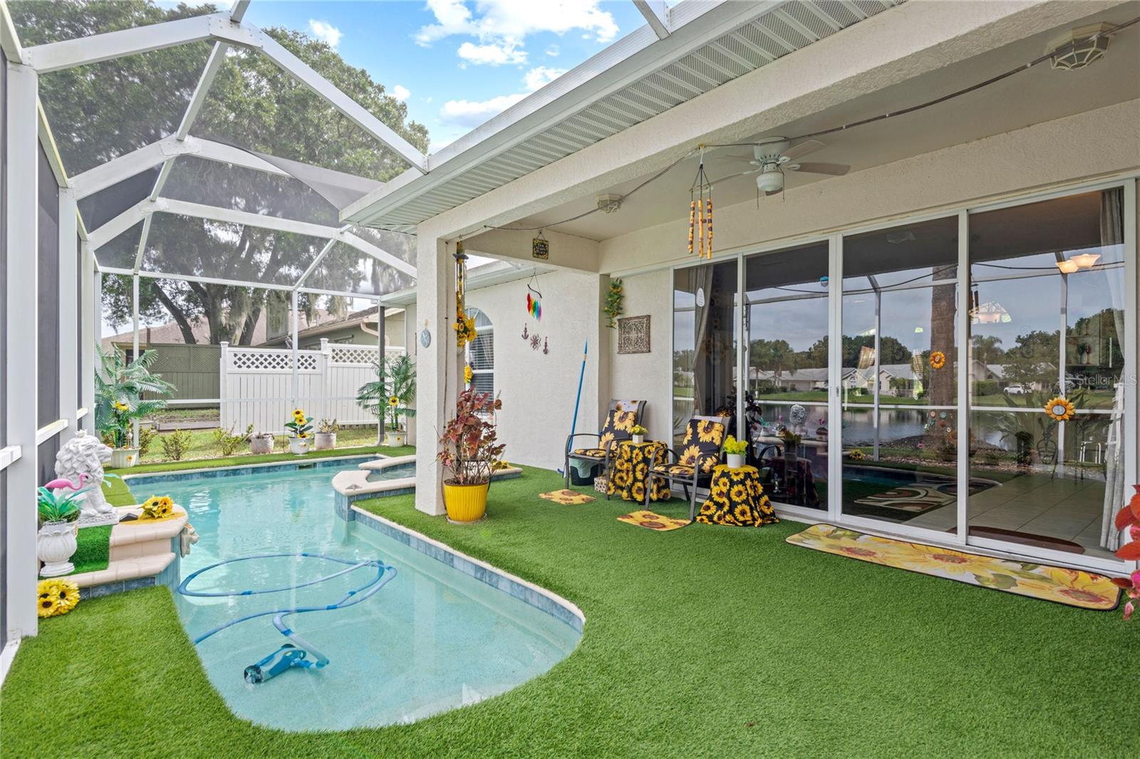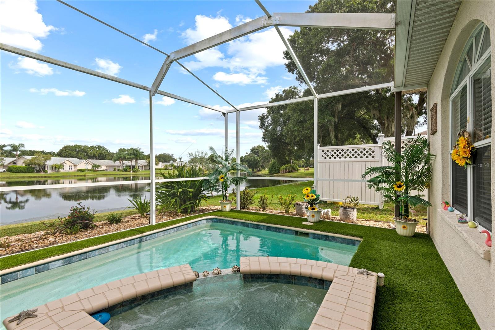 NO CDD AND VERY LOW HOA! This home is situated on a lovely corner lot, nearly 1/4 acre, at the end of a quiet cul-de-sac with only 12 homes. It's a peaceful neighborhood, perfect for walking, biking, and golfing. The golf course is just a few streets away, and the pro shop is a short golf cart ride from the home. The master suite features dual sinks, a Roman tub, a walk-in shower with a built-in seat, and two walk-in closets. The split floor plan with a pocket door offers privacy for guests and other rooms, while the guest bath conveniently opens to the lanai. This home has been meticulously cared for and maintained. It features new top-of-the-line carpet and padding in the bedrooms, engineered wood, and tile flooring in the main areas. The kitchen boasts stainless steel appliances, and there’s an irrigation timer for the beautiful bedding plants with drip lines. The guest wing includes a pocket door for privacy from the main living areas, with a guest bath that opens to the lanai and pool. The home has been freshly painted and is move-in ready—just bring your swimsuit and relax by the screened-in pool. There’s also a separate entrance into the garage with parking for your golf cart. Additionally, the home features a separate laundry room with a laundry tub. This property is minutes from shopping, dining, golf courses, and beaches, all while being located on a street with only 12 homes, low HOA fees, and no CDD.