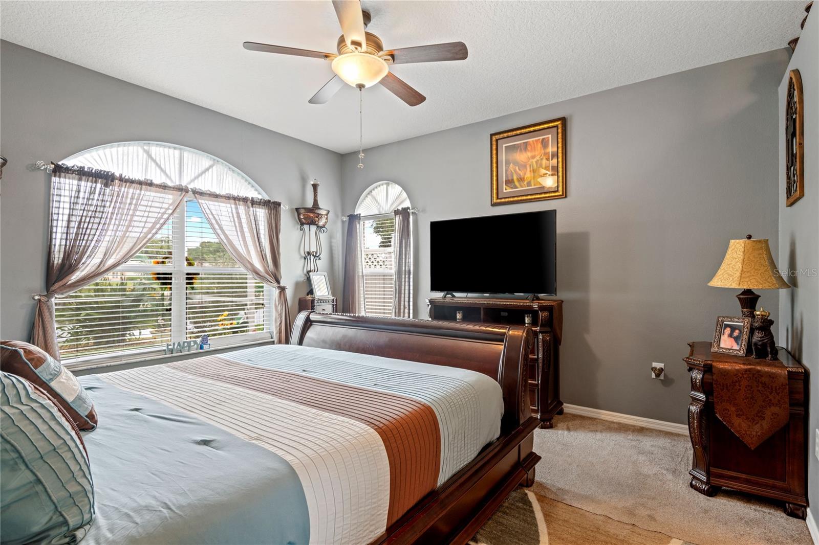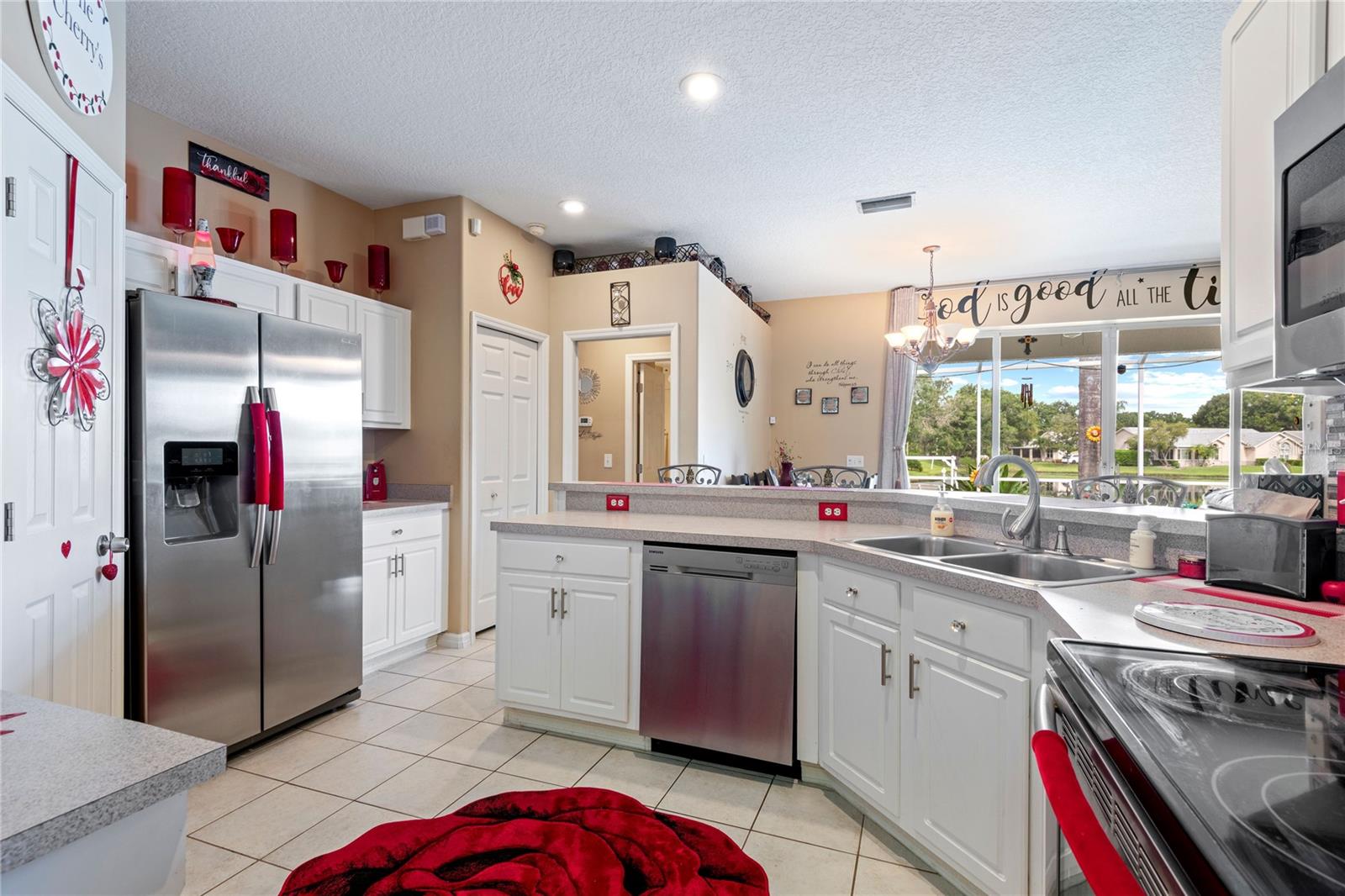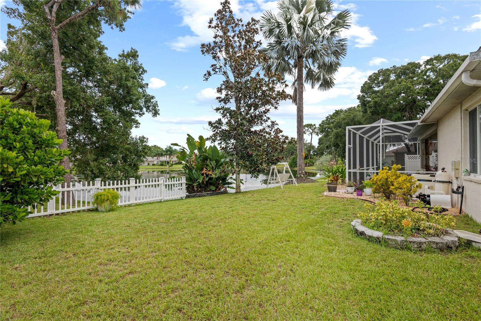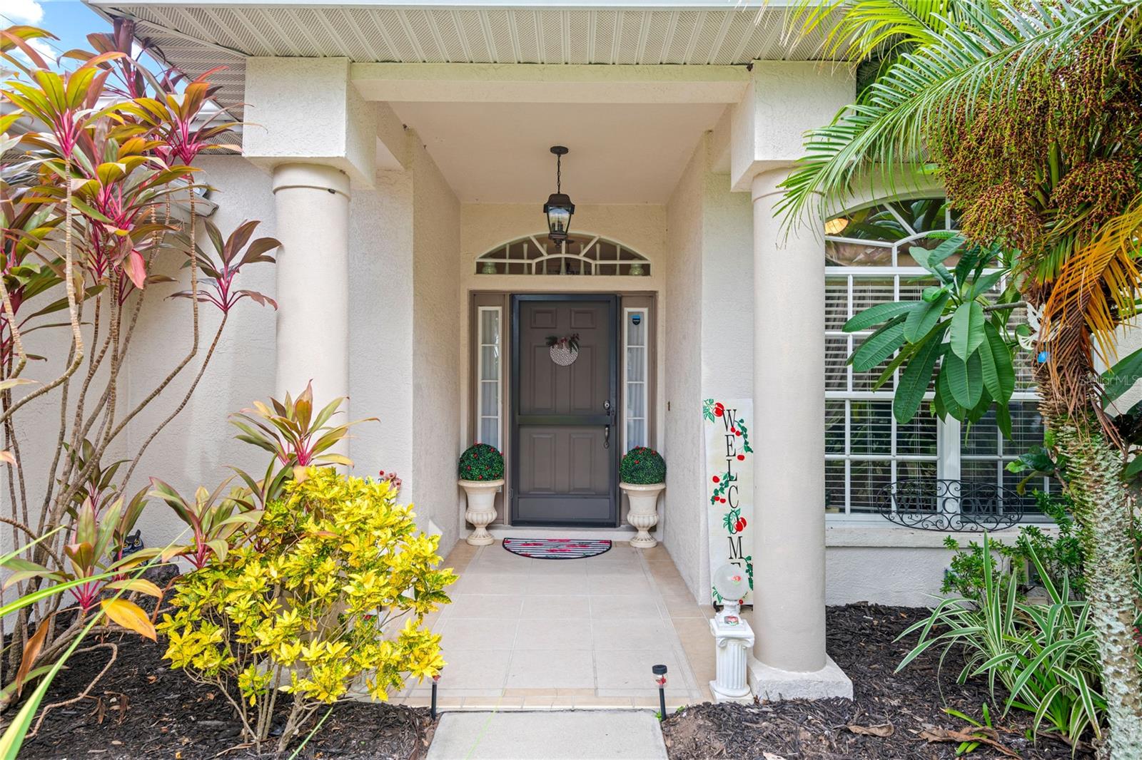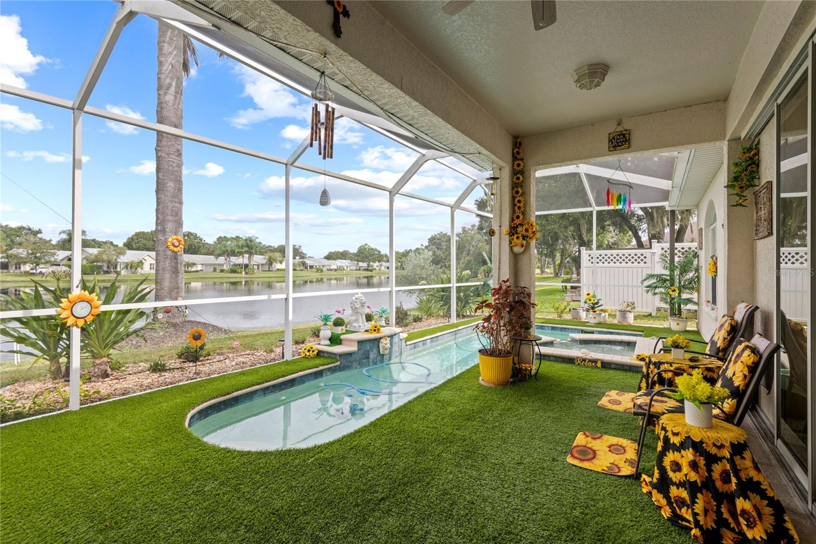 NO CDD AND VERY LOW HOA! This home is situated on a lovely corner lot, nearly 1/4 acre, at the end of a quiet cul-de-sac with only 12 homes. It's a peaceful neighborhood, perfect for walking, biking, and golfing. The golf course is just a few streets away, and the pro shop is a short golf cart ride from the home. The master suite features dual sinks, a Roman tub, a walk-in shower with a built-in seat, and two walk-in closets. The split floor plan with a pocket door offers privacy for guests and other rooms, while the guest bath conveniently opens to the lanai. This home has been meticulously cared for and maintained. It features new top-of-the-line carpet and padding in the bedrooms, engineered wood, and tile flooring in the main areas. The kitchen boasts stainless steel appliances, and there’s an irrigation timer for the beautiful bedding plants with drip lines. The guest wing includes a pocket door for privacy from the main living areas, with a guest bath that opens to the lanai and pool. The home has been freshly painted and is move-in ready—just bring your swimsuit and relax by the screened-in pool. There’s also a separate entrance into the garage with parking for your golf cart. Additionally, the home features a separate laundry room with a laundry tub. This property is minutes from shopping, dining, golf courses, and beaches, all while being located on a street with only 12 homes, low HOA fees, and no CDD.