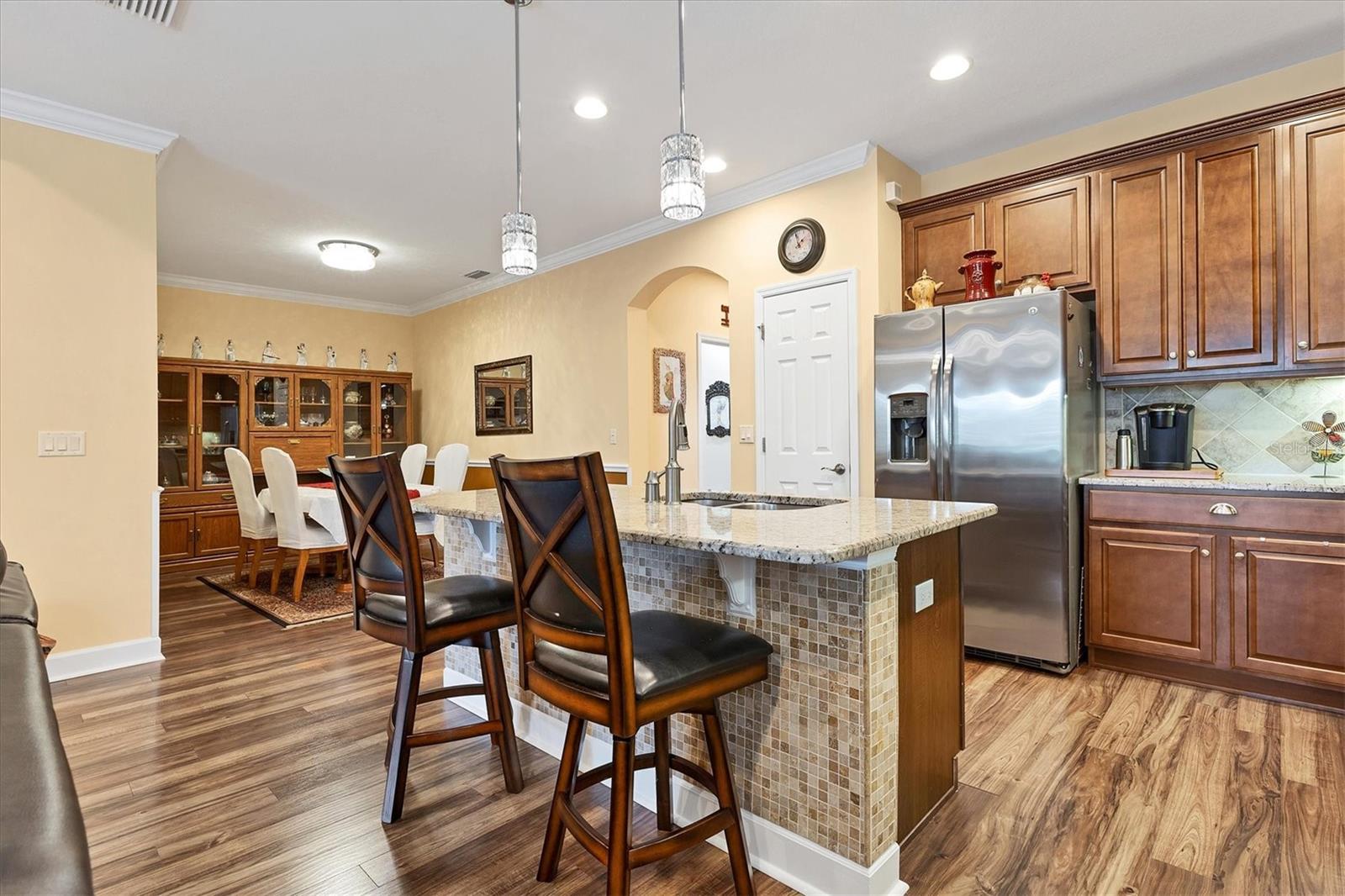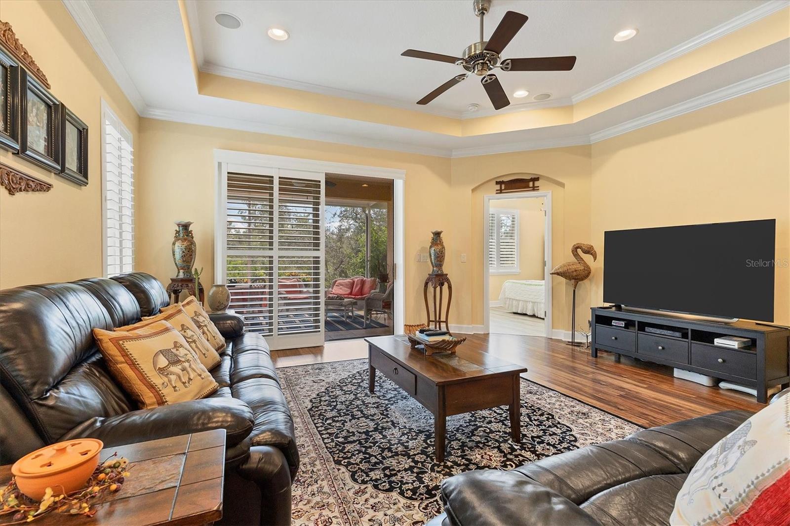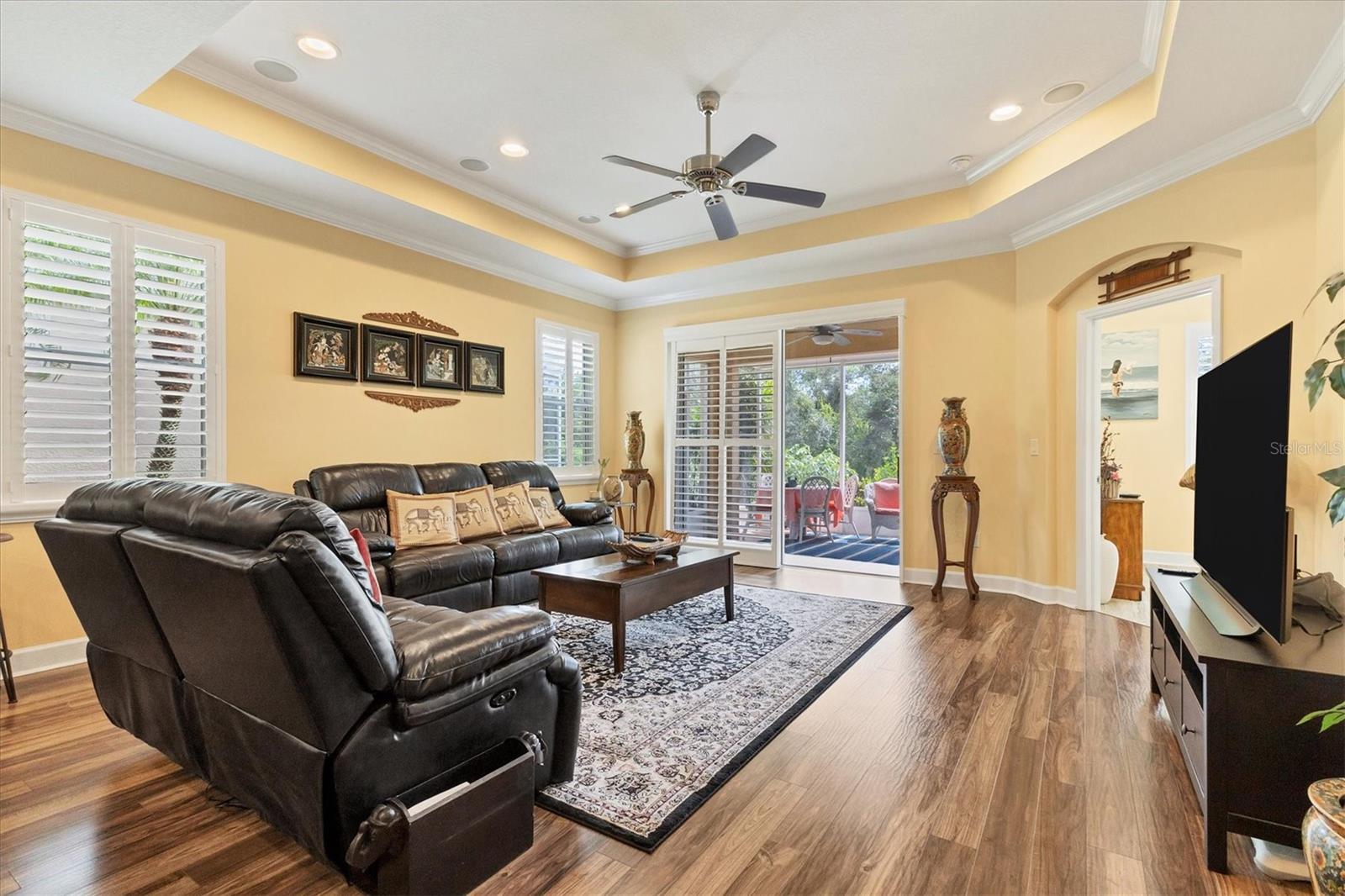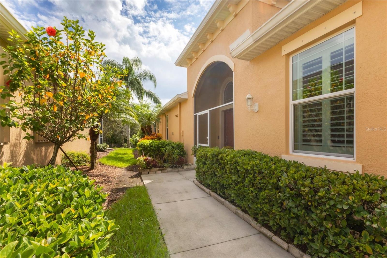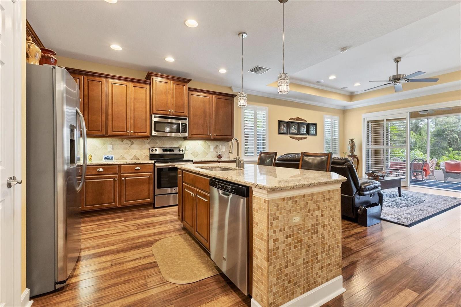 Lovely villa in the 55+ Kings Point community of Sun City Center. BRAND NEW ROOF! Situated on a dead-end street in the very back end of the community, this home abuts the Little Manatee State Park with privacy and natural beauty. This 2013 Mahogany model has high ceilings, crown moulding, knock-down ceilings, recessed lighting, granite countertops, and is completely carpet-free! Enter the front door through a screen enclosure into the stunning foyer. The chandelier, crown moulding, transom window, and high arched doorway welcome you. Straight ahead, double doors open to a den illuminated by a solatube. To the left, the open concept kitchen/living room and dining room await you. The dining room nook sparkles with chandelier and wainscoting. The kitchen boasts wood cabinetry with pull outs, under cabinet lighting, granite countertops, tile backsplash, island with sink and breakfast bar seating, recessed and pendant lighting overhead, and stainless steel appliances. Ahead, the living room sports a tray ceiling, ceiling fan, beautiful plantation shutters and a peaceful view through the sliders of the Little Manatee State Park conservancy. Pass through the sliders to a spacious screened lanai. Lanai is tiled and has a ceiling fan for comfort and practicality. The primary bedroom has plantation shutters and a view of the conservancy. Overhead, is a tray ceiling and fan. Continue to the primary ensuite bathroom which has tall vanity, dual sinks, granite countertop, walk-in shower, and private toilet room. The bathroom opens to a good-sized primary walk-in closet. Cross over to second bedroom on the opposite end of the home. Find a comfortable space with built-in closet, overhead lighted fan, and plantation shutters. Move just down the hall to find a linen closet outside a second bathroom. The guest bath has tall vanity, granite counter, and tiled shower over tub area. On this end, find the nice-size laundry room with plenty of overhead cabinetry. Washer and dryer included! Now, enter the two car garage. You see an epoxy floor, overhead storage, a utility sink, and an extra refrigerator (included). The garage space is enhanced with the inclusion of an overhead automatic screen door. Think of how versatile this space is! If all that weren't enough, this property also has a Platinum KPW warranty in place. That means no worries about a/c, water heater, or appliances. They are covered! KPW can be transferred to new owner. All exterior paint, roofing, lawn, landscaping, irrigation, roads, recreational facilities, restaurant, cafe and clubhouses are maintained by the community. One monthly fee gets you all that PLUS cable tv, internet, and water. Explore the wide variety of cubs and activities which have nominal annual fees. Pickleball, cornhole, tennis, lawn bowling, swimming, model trains, art, dance, theater, book club, bridge, mahjong, travel clubs, mini-bus tours, golf .....and so much more! Don't let this time in your life pass you by. Come and enjoy a maintenance-free life!