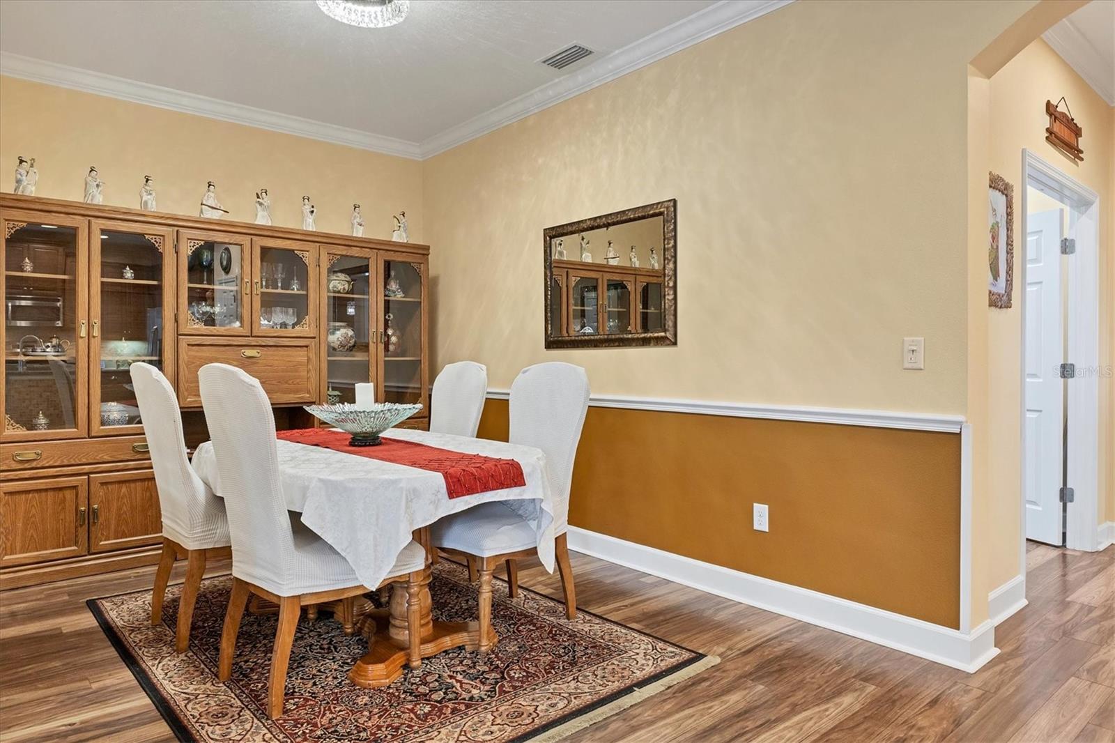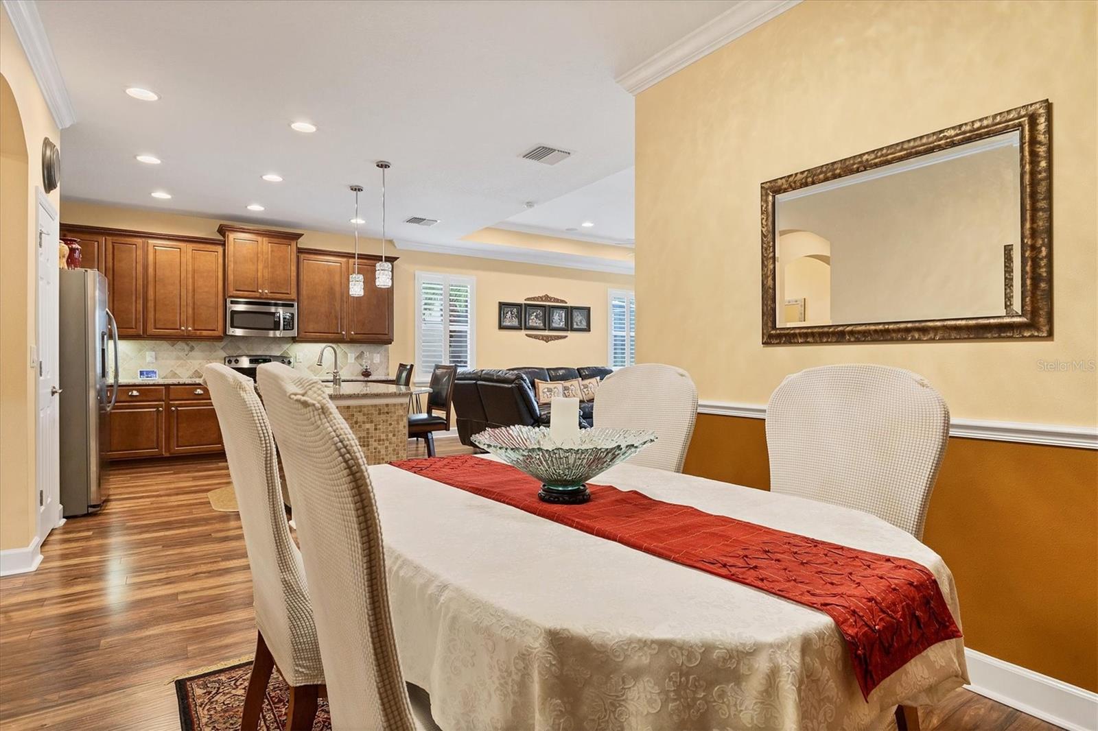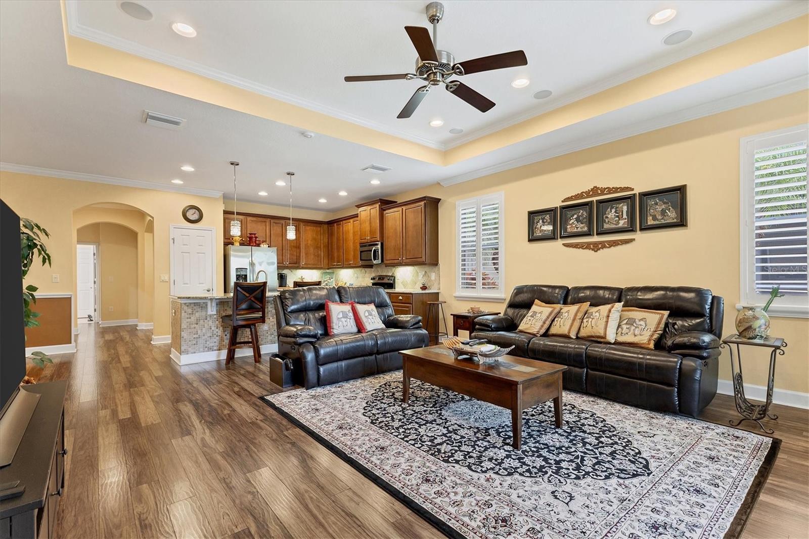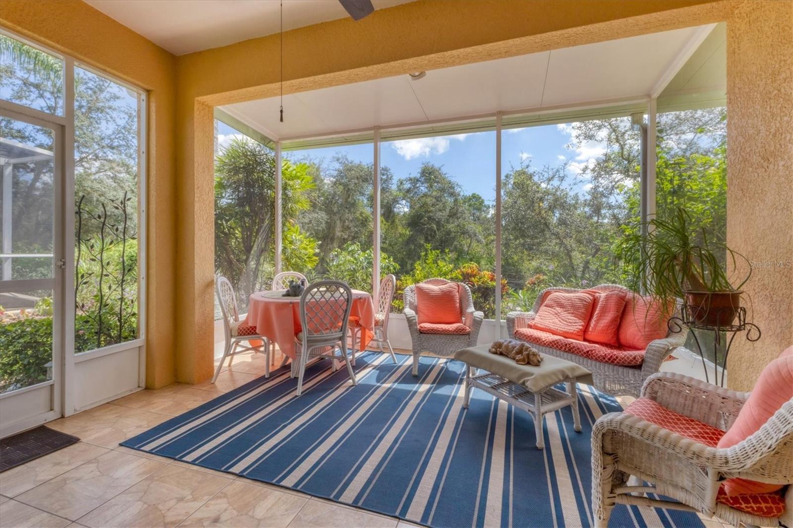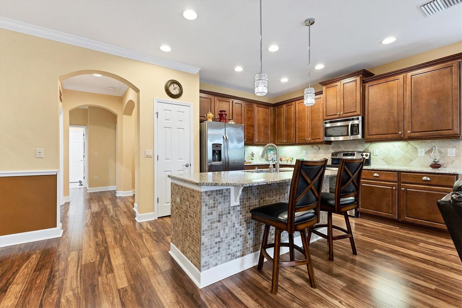 Lovely villa in the 55+ Kings Point community of Sun City Center. BRAND NEW ROOF! Situated on a dead-end street in the very back end of the community, this home abuts the Little Manatee State Park with privacy and natural beauty. This 2013 Mahogany model has high ceilings, crown moulding, knock-down ceilings, recessed lighting, granite countertops, and is completely carpet-free! Enter the front door through a screen enclosure into the stunning foyer. The chandelier, crown moulding, transom window, and high arched doorway welcome you. Straight ahead, double doors open to a den illuminated by a solatube. To the left, the open concept kitchen/living room and dining room await you. The dining room nook sparkles with chandelier and wainscoting. The kitchen boasts wood cabinetry with pull outs, under cabinet lighting, granite countertops, tile backsplash, island with sink and breakfast bar seating, recessed and pendant lighting overhead, and stainless steel appliances. Ahead, the living room sports a tray ceiling, ceiling fan, beautiful plantation shutters and a peaceful view through the sliders of the Little Manatee State Park conservancy. Pass through the sliders to a spacious screened lanai. Lanai is tiled and has a ceiling fan for comfort and practicality. The primary bedroom has plantation shutters and a view of the conservancy. Overhead, is a tray ceiling and fan. Continue to the primary ensuite bathroom which has tall vanity, dual sinks, granite countertop, walk-in shower, and private toilet room. The bathroom opens to a good-sized primary walk-in closet. Cross over to second bedroom on the opposite end of the home. Find a comfortable space with built-in closet, overhead lighted fan, and plantation shutters. Move just down the hall to find a linen closet outside a second bathroom. The guest bath has tall vanity, granite counter, and tiled shower over tub area. On this end, find the nice-size laundry room with plenty of overhead cabinetry. Washer and dryer included! Now, enter the two car garage. You see an epoxy floor, overhead storage, a utility sink, and an extra refrigerator (included). The garage space is enhanced with the inclusion of an overhead automatic screen door. Think of how versatile this space is! If all that weren't enough, this property also has a Platinum KPW warranty in place. That means no worries about a/c, water heater, or appliances. They are covered! KPW can be transferred to new owner. All exterior paint, roofing, lawn, landscaping, irrigation, roads, recreational facilities, restaurant, cafe and clubhouses are maintained by the community. One monthly fee gets you all that PLUS cable tv, internet, and water. Explore the wide variety of cubs and activities which have nominal annual fees. Pickleball, cornhole, tennis, lawn bowling, swimming, model trains, art, dance, theater, book club, bridge, mahjong, travel clubs, mini-bus tours, golf .....and so much more! Don't let this time in your life pass you by. Come and enjoy a maintenance-free life!