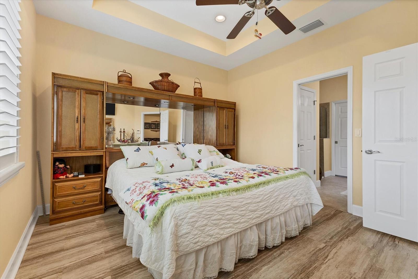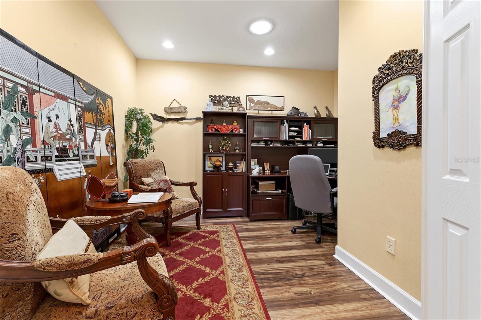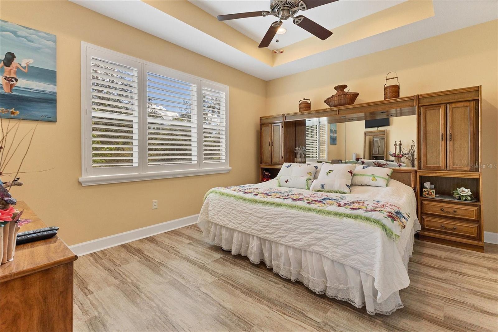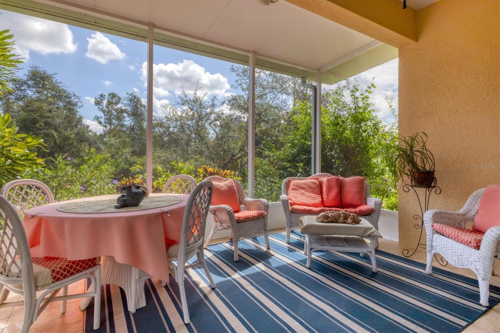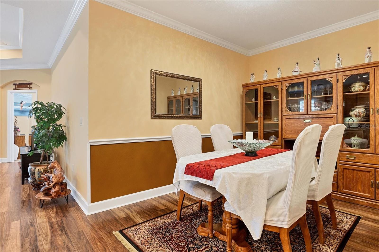 Lovely villa in the 55+ Kings Point community of Sun City Center. BRAND NEW ROOF! Situated on a dead-end street in the very back end of the community, this home abuts the Little Manatee State Park with privacy and natural beauty. This 2013 Mahogany model has high ceilings, crown moulding, knock-down ceilings, recessed lighting, granite countertops, and is completely carpet-free! Enter the front door through a screen enclosure into the stunning foyer. The chandelier, crown moulding, transom window, and high arched doorway welcome you. Straight ahead, double doors open to a den illuminated by a solatube. To the left, the open concept kitchen/living room and dining room await you. The dining room nook sparkles with chandelier and wainscoting. The kitchen boasts wood cabinetry with pull outs, under cabinet lighting, granite countertops, tile backsplash, island with sink and breakfast bar seating, recessed and pendant lighting overhead, and stainless steel appliances. Ahead, the living room sports a tray ceiling, ceiling fan, beautiful plantation shutters and a peaceful view through the sliders of the Little Manatee State Park conservancy. Pass through the sliders to a spacious screened lanai. Lanai is tiled and has a ceiling fan for comfort and practicality. The primary bedroom has plantation shutters and a view of the conservancy. Overhead, is a tray ceiling and fan. Continue to the primary ensuite bathroom which has tall vanity, dual sinks, granite countertop, walk-in shower, and private toilet room. The bathroom opens to a good-sized primary walk-in closet. Cross over to second bedroom on the opposite end of the home. Find a comfortable space with built-in closet, overhead lighted fan, and plantation shutters. Move just down the hall to find a linen closet outside a second bathroom. The guest bath has tall vanity, granite counter, and tiled shower over tub area. On this end, find the nice-size laundry room with plenty of overhead cabinetry. Washer and dryer included! Now, enter the two car garage. You see an epoxy floor, overhead storage, a utility sink, and an extra refrigerator (included). The garage space is enhanced with the inclusion of an overhead automatic screen door. Think of how versatile this space is! If all that weren't enough, this property also has a Platinum KPW warranty in place. That means no worries about a/c, water heater, or appliances. They are covered! KPW can be transferred to new owner. All exterior paint, roofing, lawn, landscaping, irrigation, roads, recreational facilities, restaurant, cafe and clubhouses are maintained by the community. One monthly fee gets you all that PLUS cable tv, internet, and water. Explore the wide variety of cubs and activities which have nominal annual fees. Pickleball, cornhole, tennis, lawn bowling, swimming, model trains, art, dance, theater, book club, bridge, mahjong, travel clubs, mini-bus tours, golf .....and so much more! Don't let this time in your life pass you by. Come and enjoy a maintenance-free life!