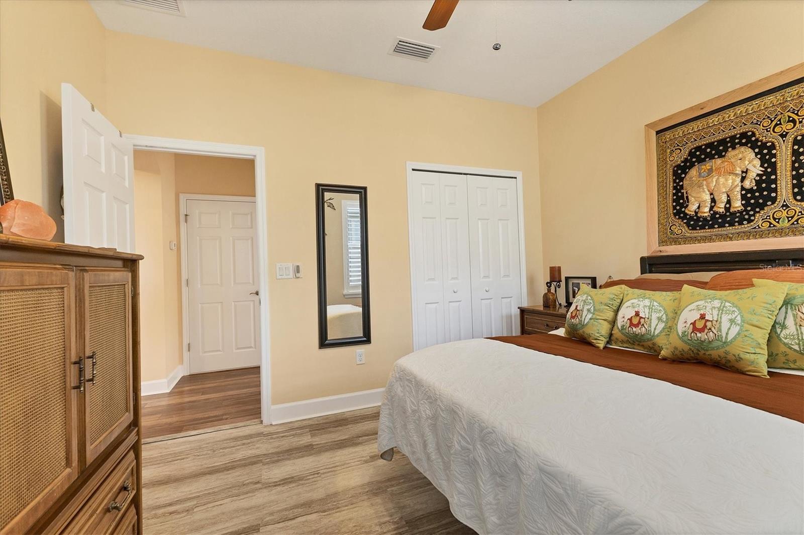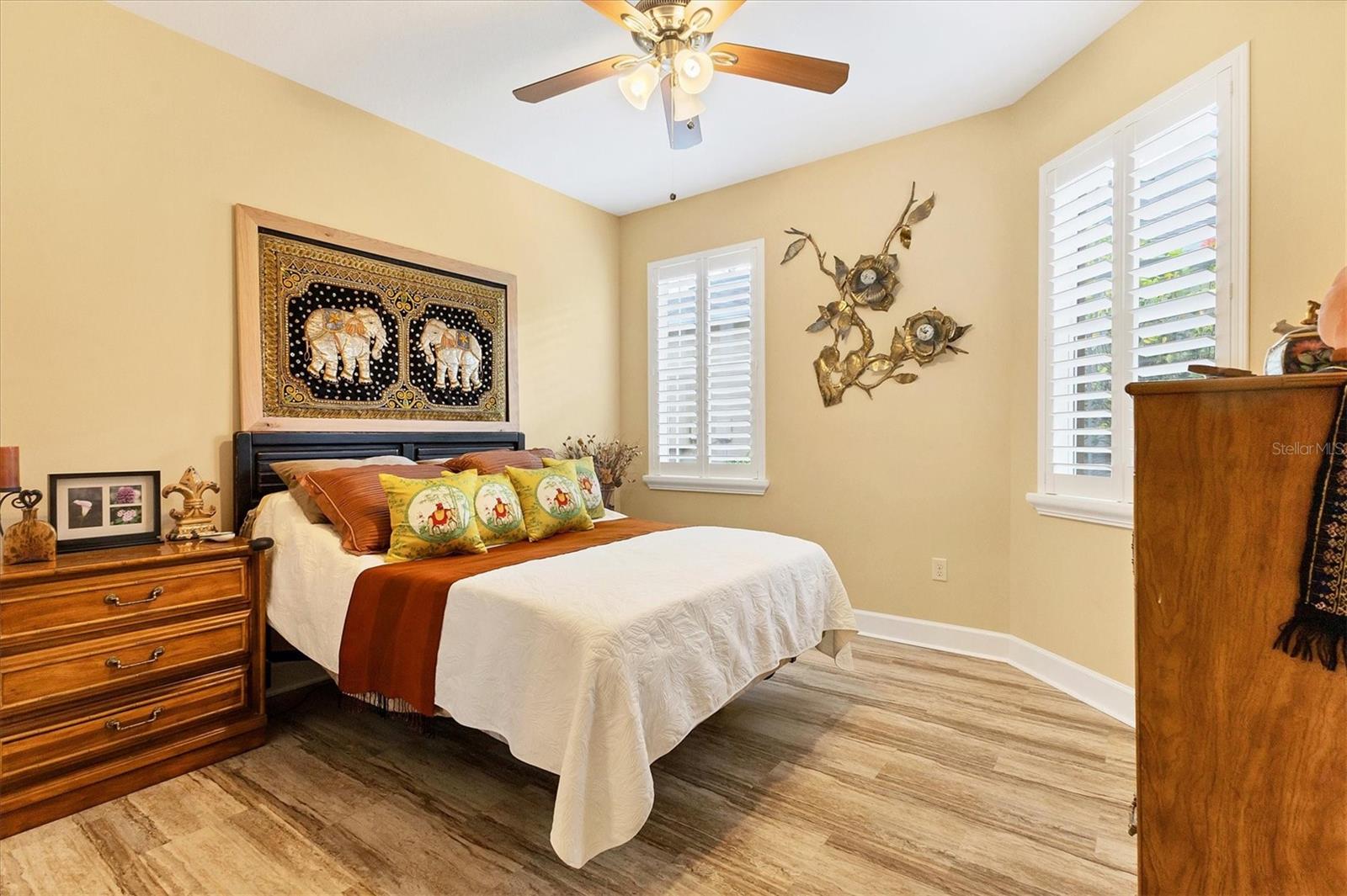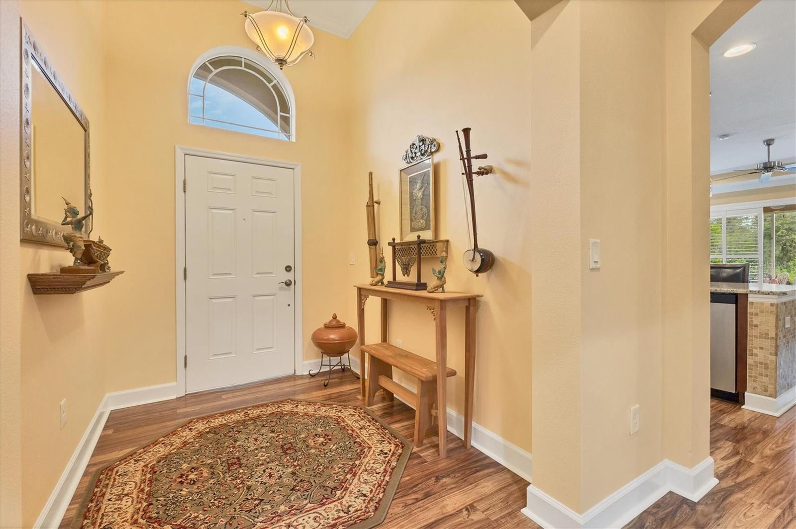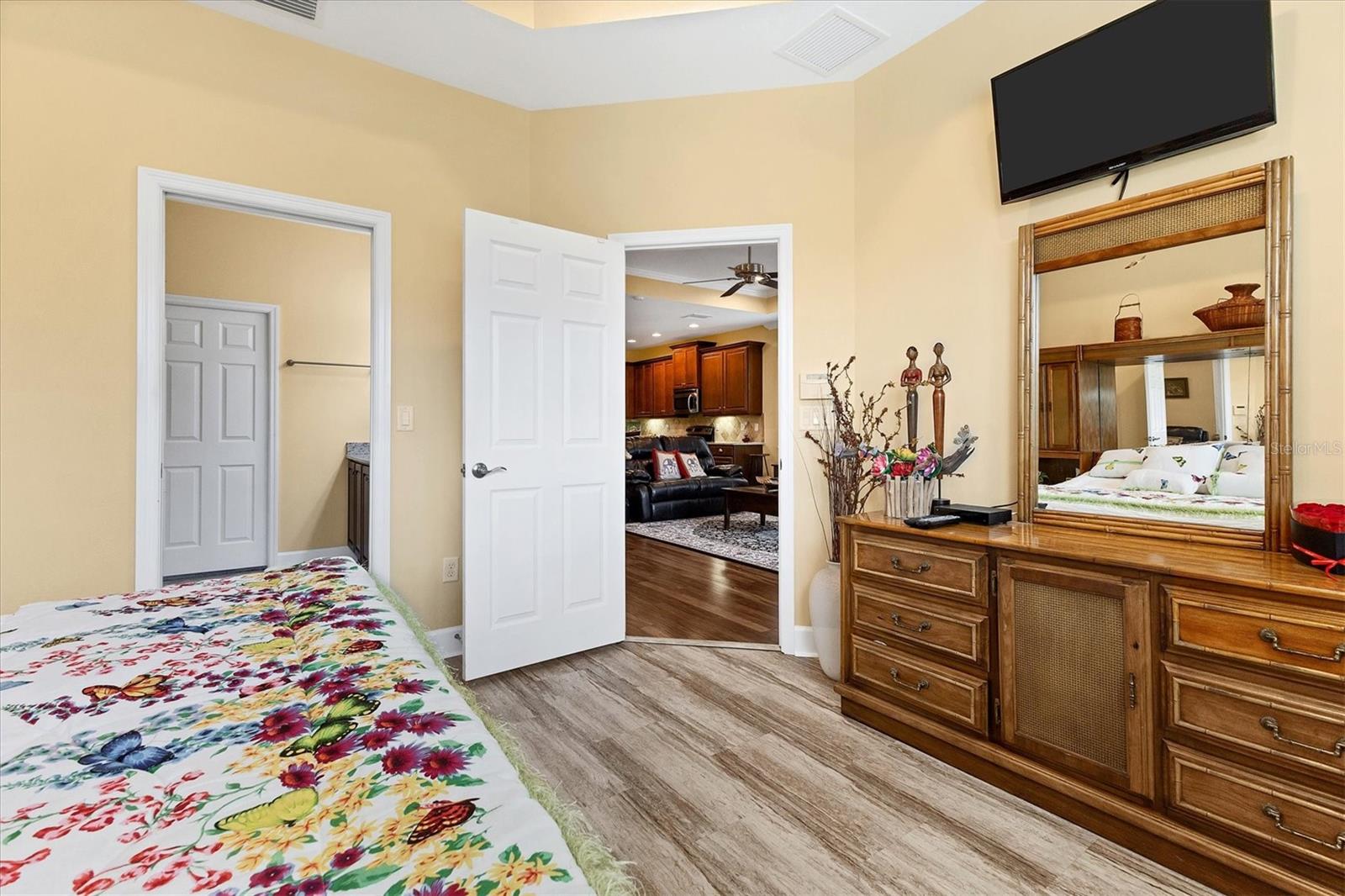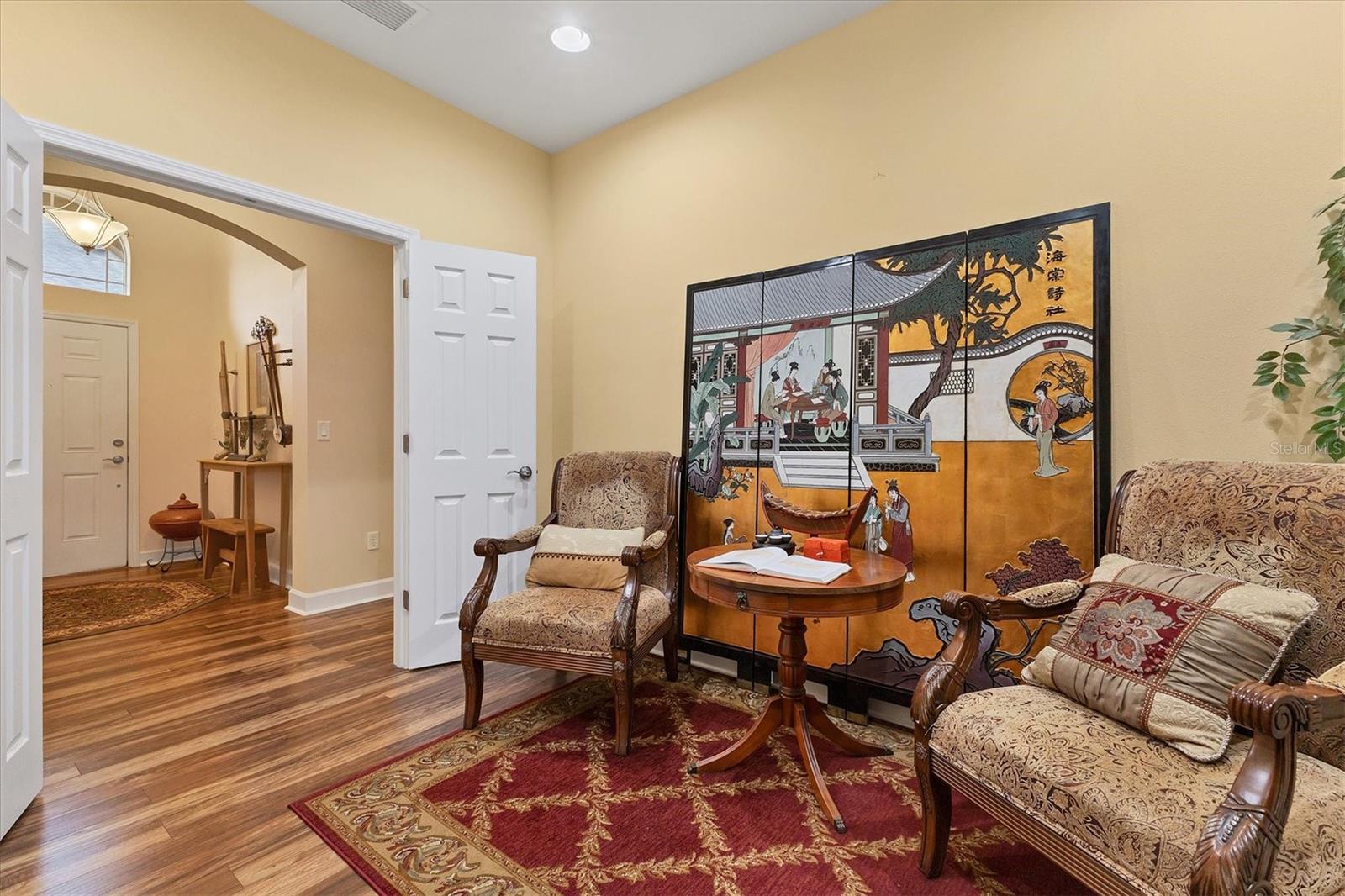 Lovely villa in the 55+ Kings Point community of Sun City Center. BRAND NEW ROOF! Situated on a dead-end street in the very back end of the community, this home abuts the Little Manatee State Park with privacy and natural beauty. This 2013 Mahogany model has high ceilings, crown moulding, knock-down ceilings, recessed lighting, granite countertops, and is completely carpet-free! Enter the front door through a screen enclosure into the stunning foyer. The chandelier, crown moulding, transom window, and high arched doorway welcome you. Straight ahead, double doors open to a den illuminated by a solatube. To the left, the open concept kitchen/living room and dining room await you. The dining room nook sparkles with chandelier and wainscoting. The kitchen boasts wood cabinetry with pull outs, under cabinet lighting, granite countertops, tile backsplash, island with sink and breakfast bar seating, recessed and pendant lighting overhead, and stainless steel appliances. Ahead, the living room sports a tray ceiling, ceiling fan, beautiful plantation shutters and a peaceful view through the sliders of the Little Manatee State Park conservancy. Pass through the sliders to a spacious screened lanai. Lanai is tiled and has a ceiling fan for comfort and practicality. The primary bedroom has plantation shutters and a view of the conservancy. Overhead, is a tray ceiling and fan. Continue to the primary ensuite bathroom which has tall vanity, dual sinks, granite countertop, walk-in shower, and private toilet room. The bathroom opens to a good-sized primary walk-in closet. Cross over to second bedroom on the opposite end of the home. Find a comfortable space with built-in closet, overhead lighted fan, and plantation shutters. Move just down the hall to find a linen closet outside a second bathroom. The guest bath has tall vanity, granite counter, and tiled shower over tub area. On this end, find the nice-size laundry room with plenty of overhead cabinetry. Washer and dryer included! Now, enter the two car garage. You see an epoxy floor, overhead storage, a utility sink, and an extra refrigerator (included). The garage space is enhanced with the inclusion of an overhead automatic screen door. Think of how versatile this space is! If all that weren't enough, this property also has a Platinum KPW warranty in place. That means no worries about a/c, water heater, or appliances. They are covered! KPW can be transferred to new owner. All exterior paint, roofing, lawn, landscaping, irrigation, roads, recreational facilities, restaurant, cafe and clubhouses are maintained by the community. One monthly fee gets you all that PLUS cable tv, internet, and water. Explore the wide variety of cubs and activities which have nominal annual fees. Pickleball, cornhole, tennis, lawn bowling, swimming, model trains, art, dance, theater, book club, bridge, mahjong, travel clubs, mini-bus tours, golf .....and so much more! Don't let this time in your life pass you by. Come and enjoy a maintenance-free life!