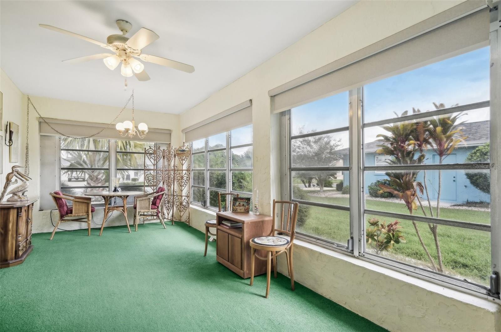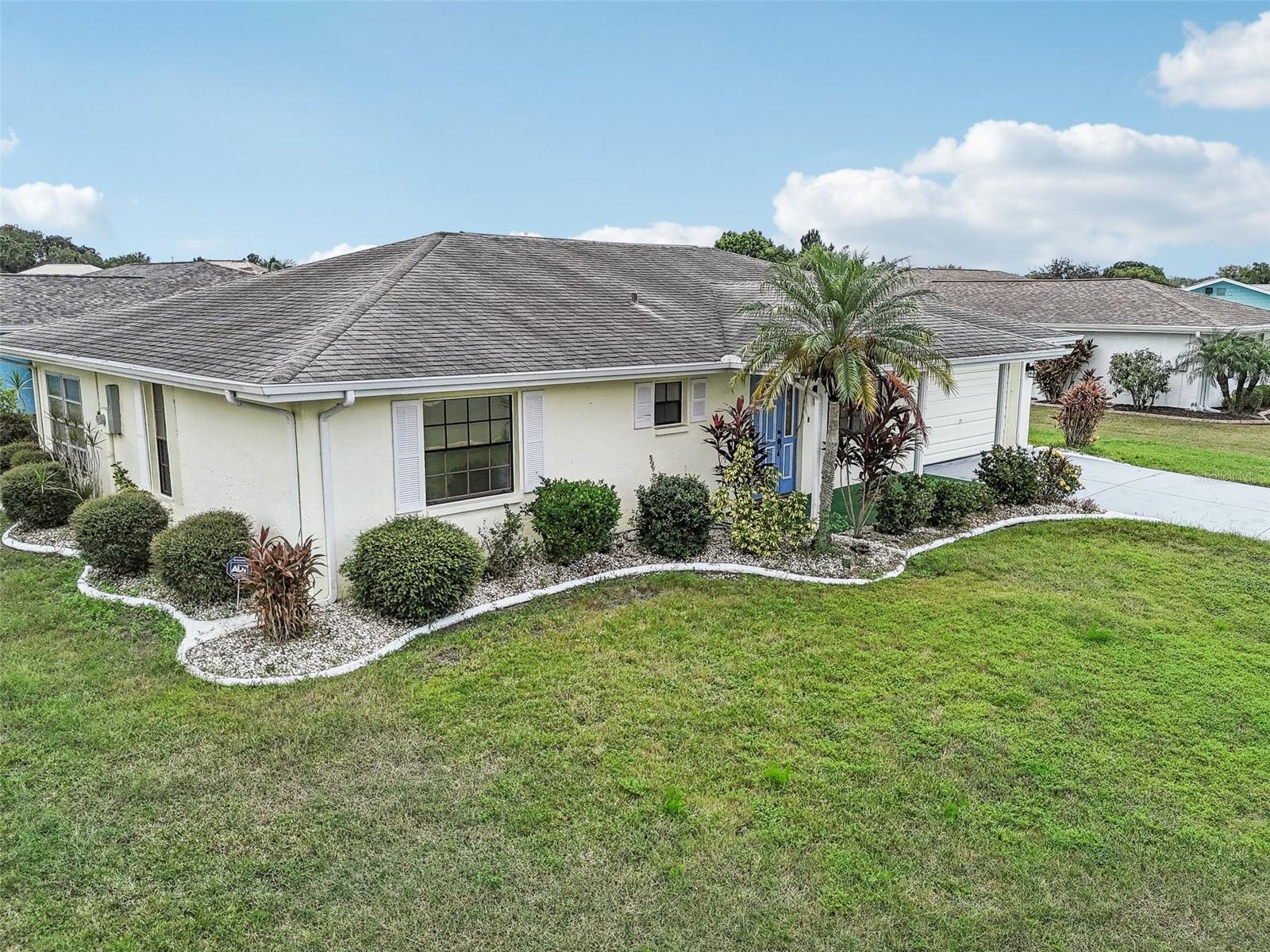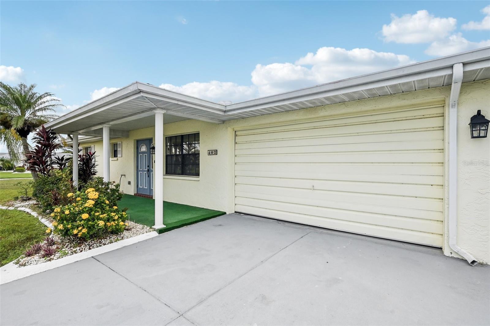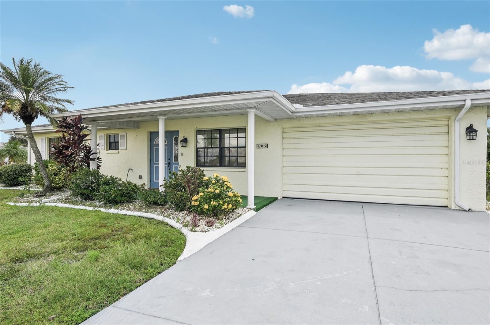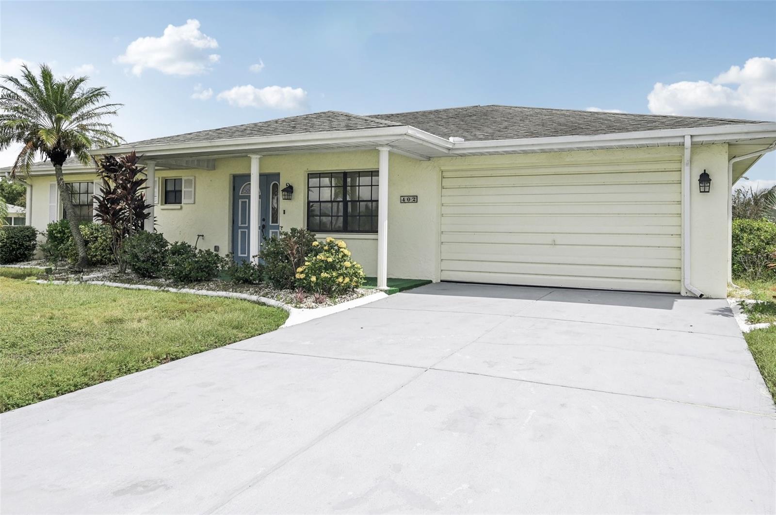 This 2-bedroom, 2-bathroom, 1,404 sq. ft. home is located in the desirable St. Andrews neighborhood of 55+ Sun City Center. With its large lot and low HOA fees, this property offers plenty of potential for comfortable living in a well-established community. As you approach, you'll notice the covered entryway and open front porch, perfect for enjoying the Florida weather. The home also features gutters and downspouts to help manage rainwater. Inside, the living room flows into the dining room, with laminate flooring throughout the main areas and neutral white walls that make it easy to decorate. The dining room has a large window providing lots of natural light. The eat-in kitchen offers a cozy space for casual dining. Just off the kitchen, you'll find a laundry room with additional storage cabinets and double doors to the garage, which has enough space for a car and a golf cart. The primary bedroom includes sliding doors open to an enclosed, carpeted lanai—extra-large and ideal for entertaining or a hobby room. The second bedroom, currently used as a den or office, provides flexibility to suit your needs. The first bathroom has a shower, while the second bathroom features a tub for relaxing. The neighborhood offers sidewalks for easy walks and is conveniently located near major grocery and department stores, making everyday errands a breeze. You’ll love Sun City Center with its amazing facilities, pools, and clubs just waiting for you to enjoy. Between Sarasota and Tampa, it is the perfect location for a convenient ride to airports, great shopping, dining, and professional entertainment. With easy access to award-winning, sandy beaches, this is the best of all worlds, but without the stress of big city life. Leave it all behind and enjoy your new life here in one of Florida’s most affordable 55 and better communities!