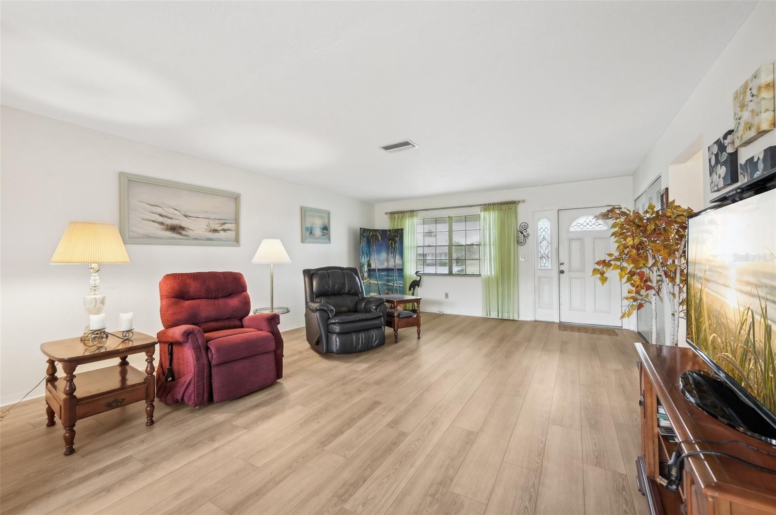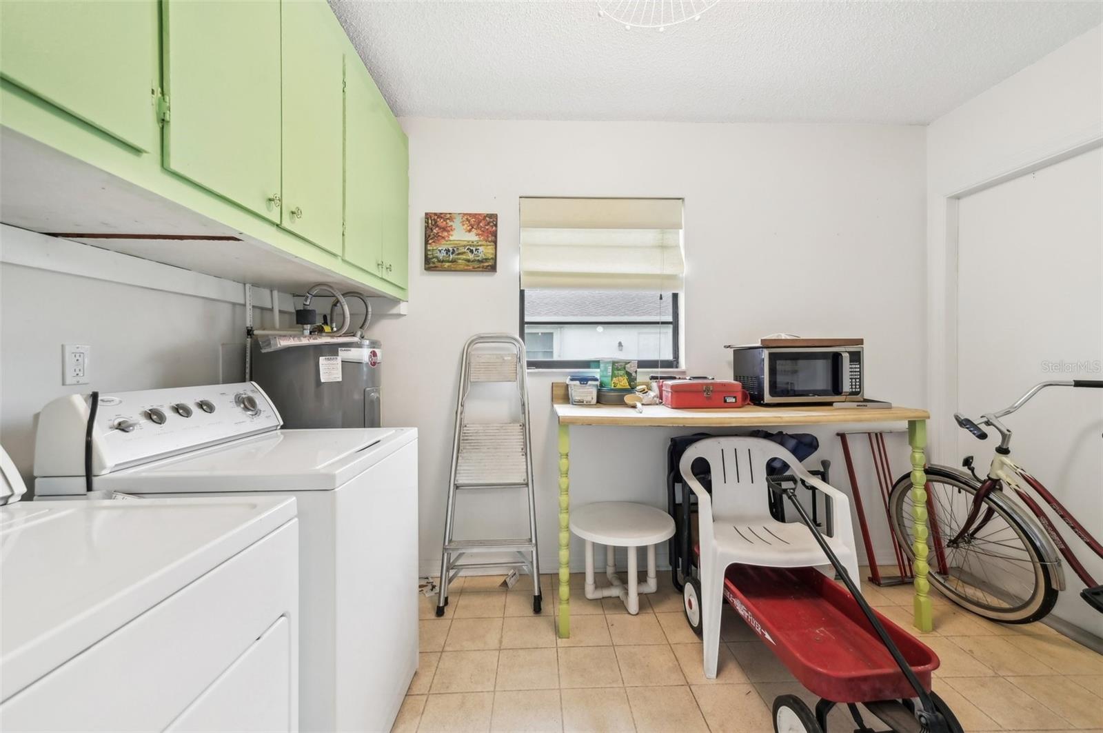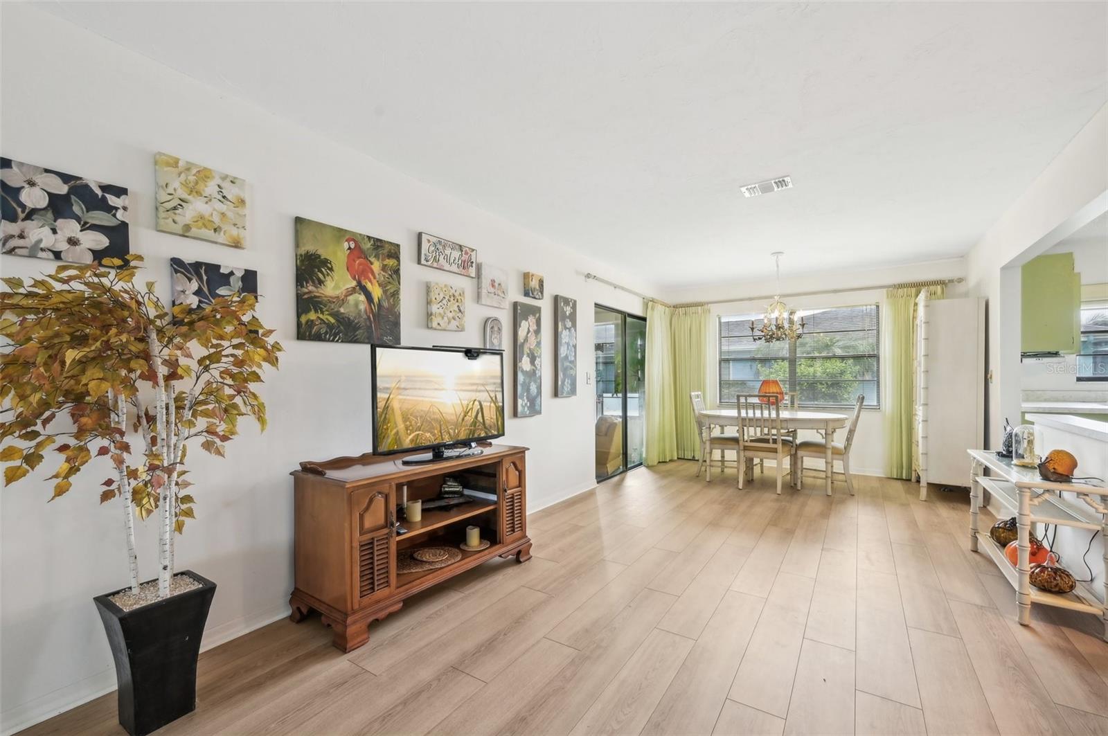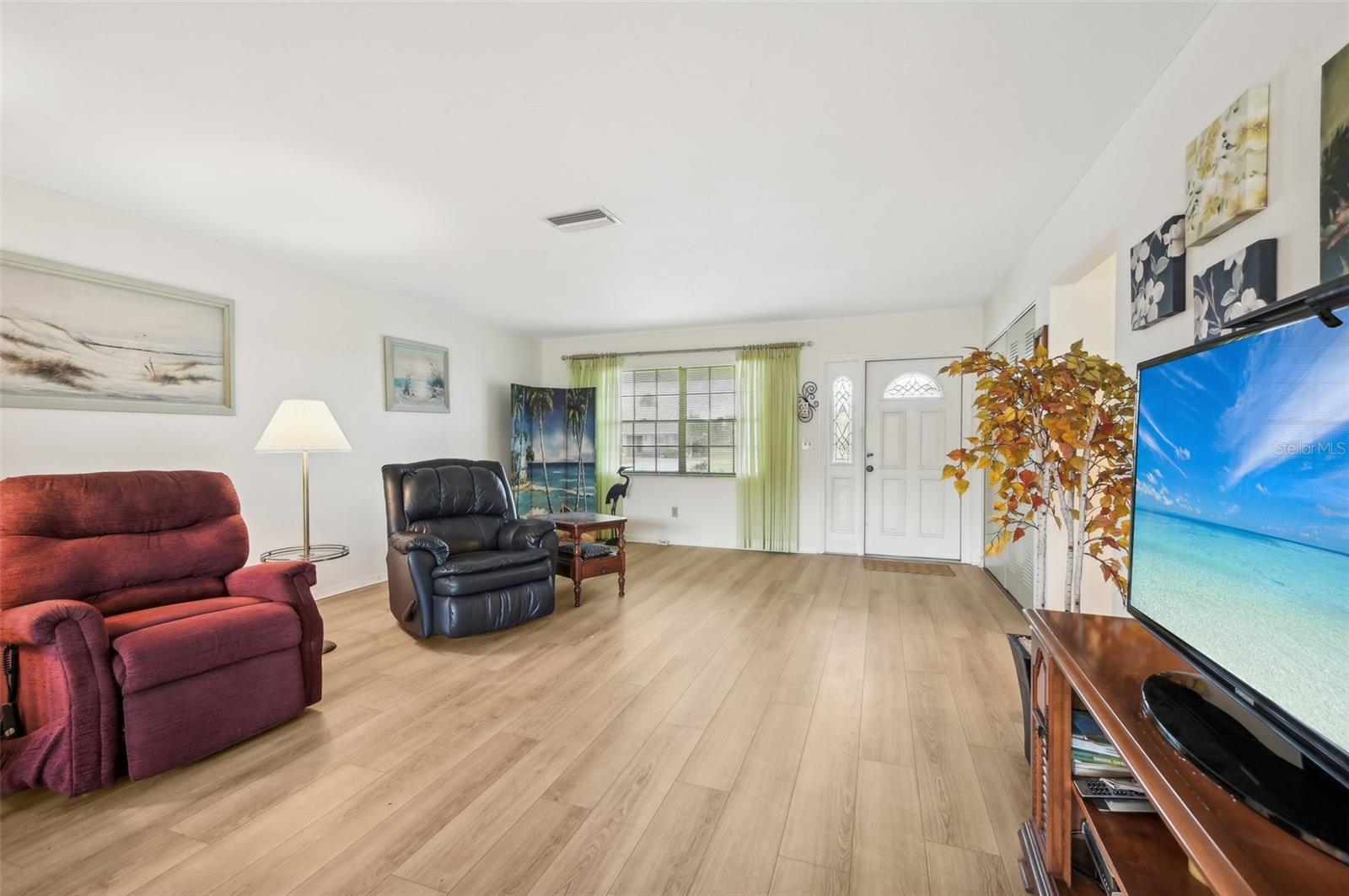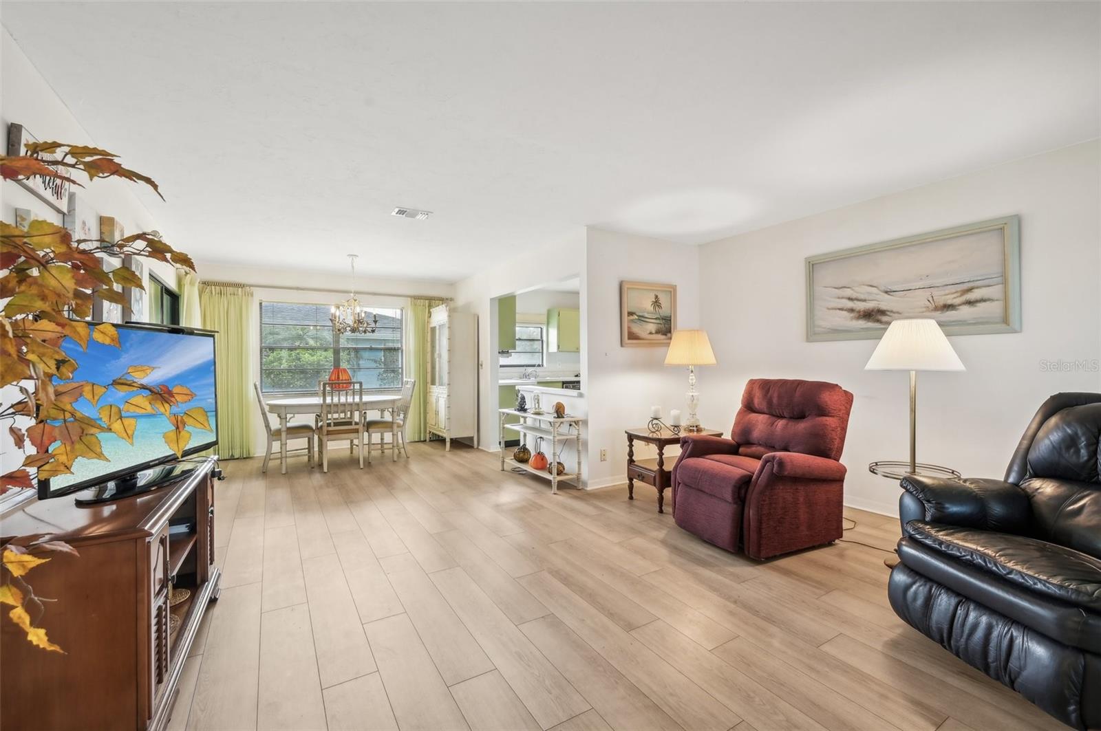 This 2-bedroom, 2-bathroom, 1,404 sq. ft. home is located in the desirable St. Andrews neighborhood of 55+ Sun City Center. With its large lot and low HOA fees, this property offers plenty of potential for comfortable living in a well-established community. As you approach, you'll notice the covered entryway and open front porch, perfect for enjoying the Florida weather. The home also features gutters and downspouts to help manage rainwater. Inside, the living room flows into the dining room, with laminate flooring throughout the main areas and neutral white walls that make it easy to decorate. The dining room has a large window providing lots of natural light. The eat-in kitchen offers a cozy space for casual dining. Just off the kitchen, you'll find a laundry room with additional storage cabinets and double doors to the garage, which has enough space for a car and a golf cart. The primary bedroom includes sliding doors open to an enclosed, carpeted lanai—extra-large and ideal for entertaining or a hobby room. The second bedroom, currently used as a den or office, provides flexibility to suit your needs. The first bathroom has a shower, while the second bathroom features a tub for relaxing. The neighborhood offers sidewalks for easy walks and is conveniently located near major grocery and department stores, making everyday errands a breeze. You’ll love Sun City Center with its amazing facilities, pools, and clubs just waiting for you to enjoy. Between Sarasota and Tampa, it is the perfect location for a convenient ride to airports, great shopping, dining, and professional entertainment. With easy access to award-winning, sandy beaches, this is the best of all worlds, but without the stress of big city life. Leave it all behind and enjoy your new life here in one of Florida’s most affordable 55 and better communities!