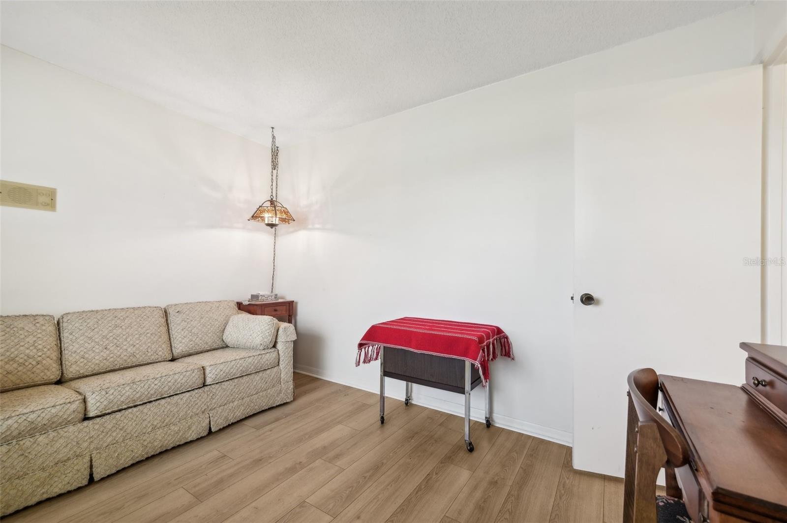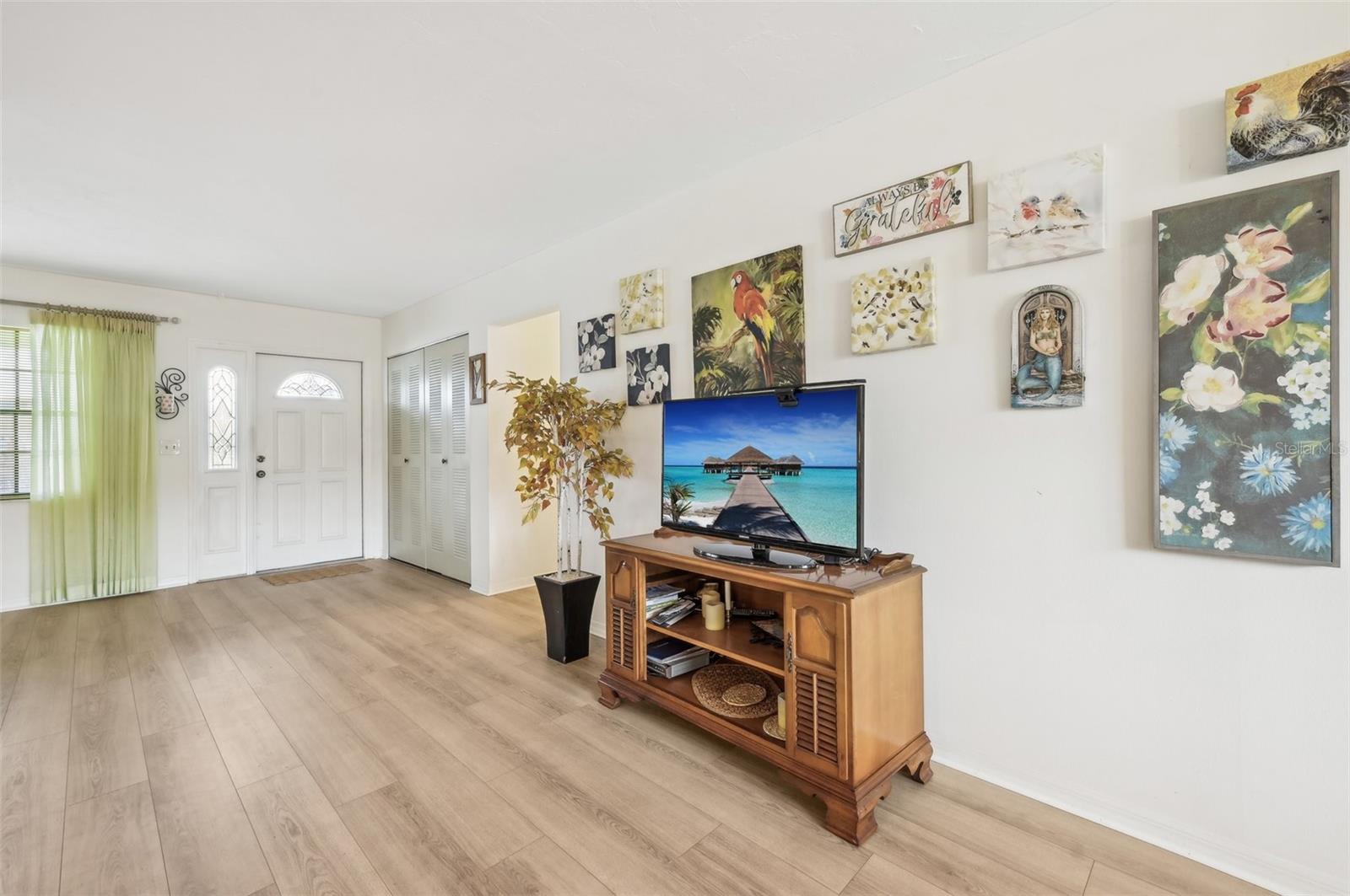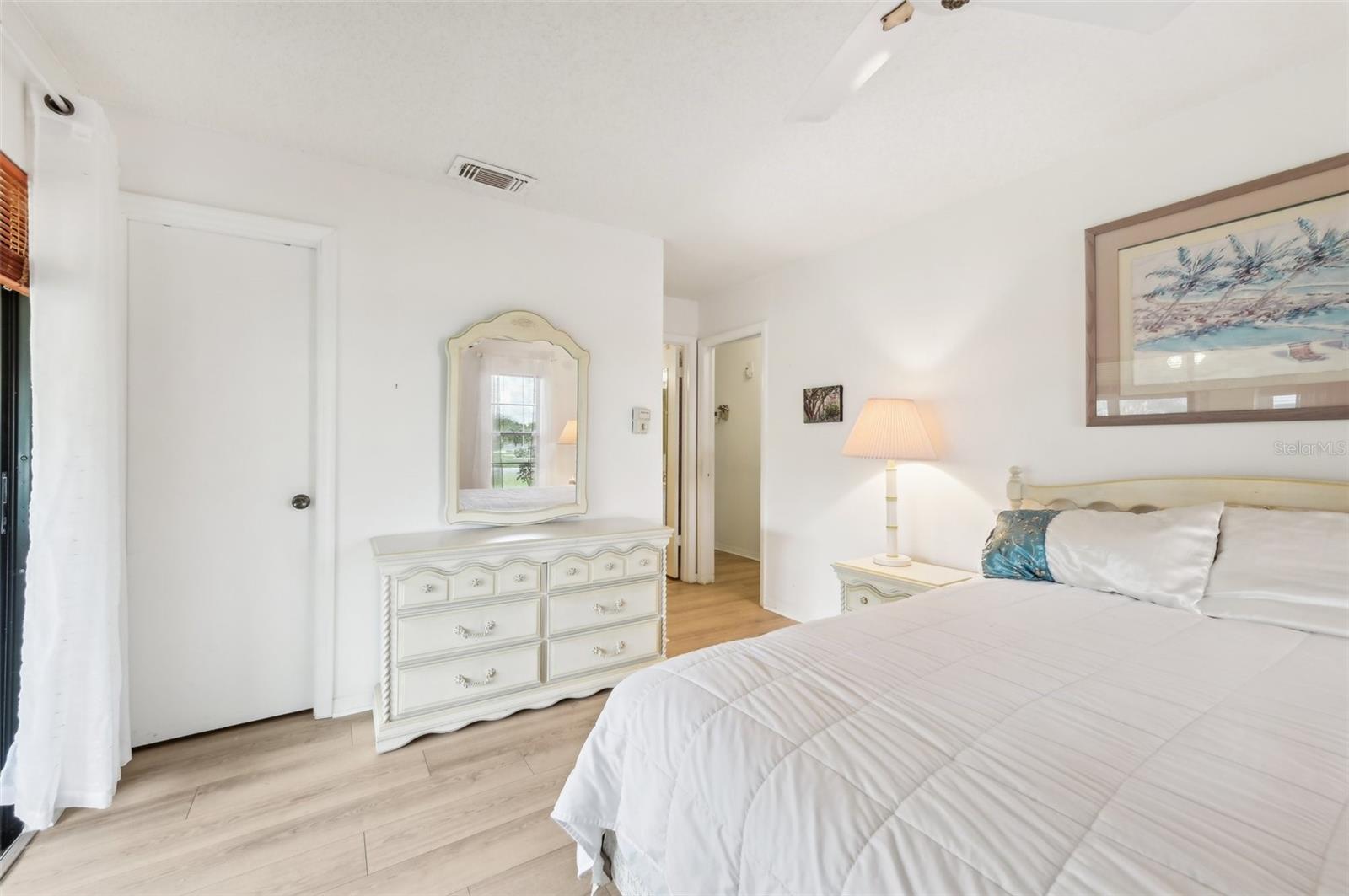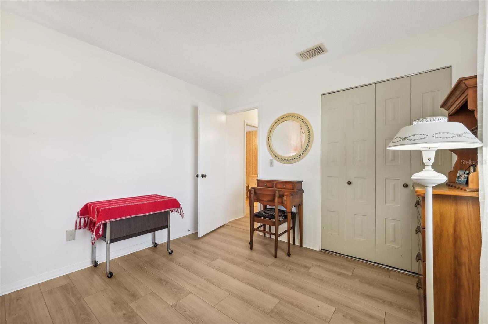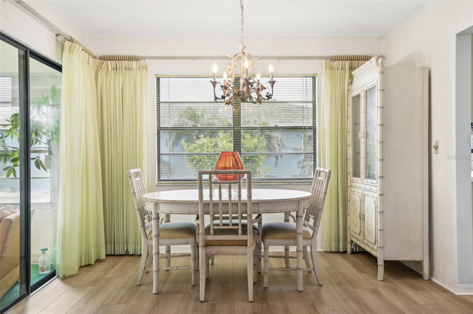 This 2-bedroom, 2-bathroom, 1,404 sq. ft. home is located in the desirable St. Andrews neighborhood of 55+ Sun City Center. With its large lot and low HOA fees, this property offers plenty of potential for comfortable living in a well-established community. As you approach, you'll notice the covered entryway and open front porch, perfect for enjoying the Florida weather. The home also features gutters and downspouts to help manage rainwater. Inside, the living room flows into the dining room, with laminate flooring throughout the main areas and neutral white walls that make it easy to decorate. The dining room has a large window providing lots of natural light. The eat-in kitchen offers a cozy space for casual dining. Just off the kitchen, you'll find a laundry room with additional storage cabinets and double doors to the garage, which has enough space for a car and a golf cart. The primary bedroom includes sliding doors open to an enclosed, carpeted lanai—extra-large and ideal for entertaining or a hobby room. The second bedroom, currently used as a den or office, provides flexibility to suit your needs. The first bathroom has a shower, while the second bathroom features a tub for relaxing. The neighborhood offers sidewalks for easy walks and is conveniently located near major grocery and department stores, making everyday errands a breeze. You’ll love Sun City Center with its amazing facilities, pools, and clubs just waiting for you to enjoy. Between Sarasota and Tampa, it is the perfect location for a convenient ride to airports, great shopping, dining, and professional entertainment. With easy access to award-winning, sandy beaches, this is the best of all worlds, but without the stress of big city life. Leave it all behind and enjoy your new life here in one of Florida’s most affordable 55 and better communities!