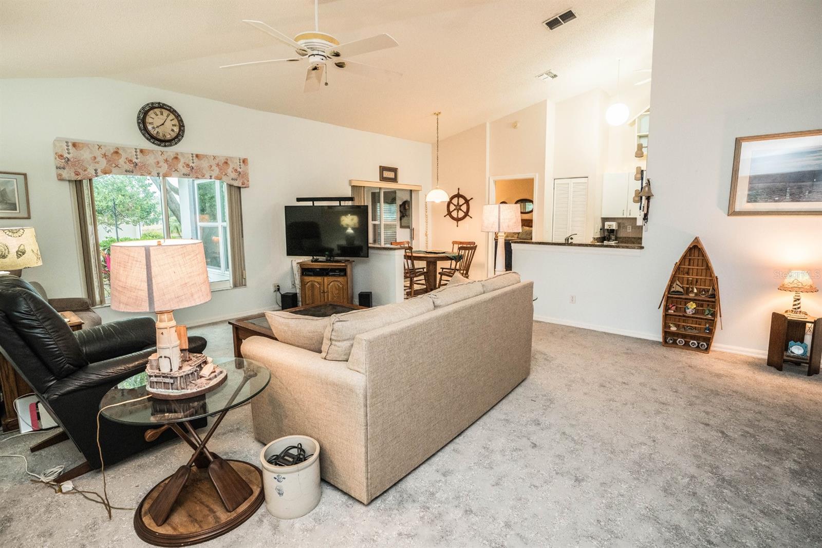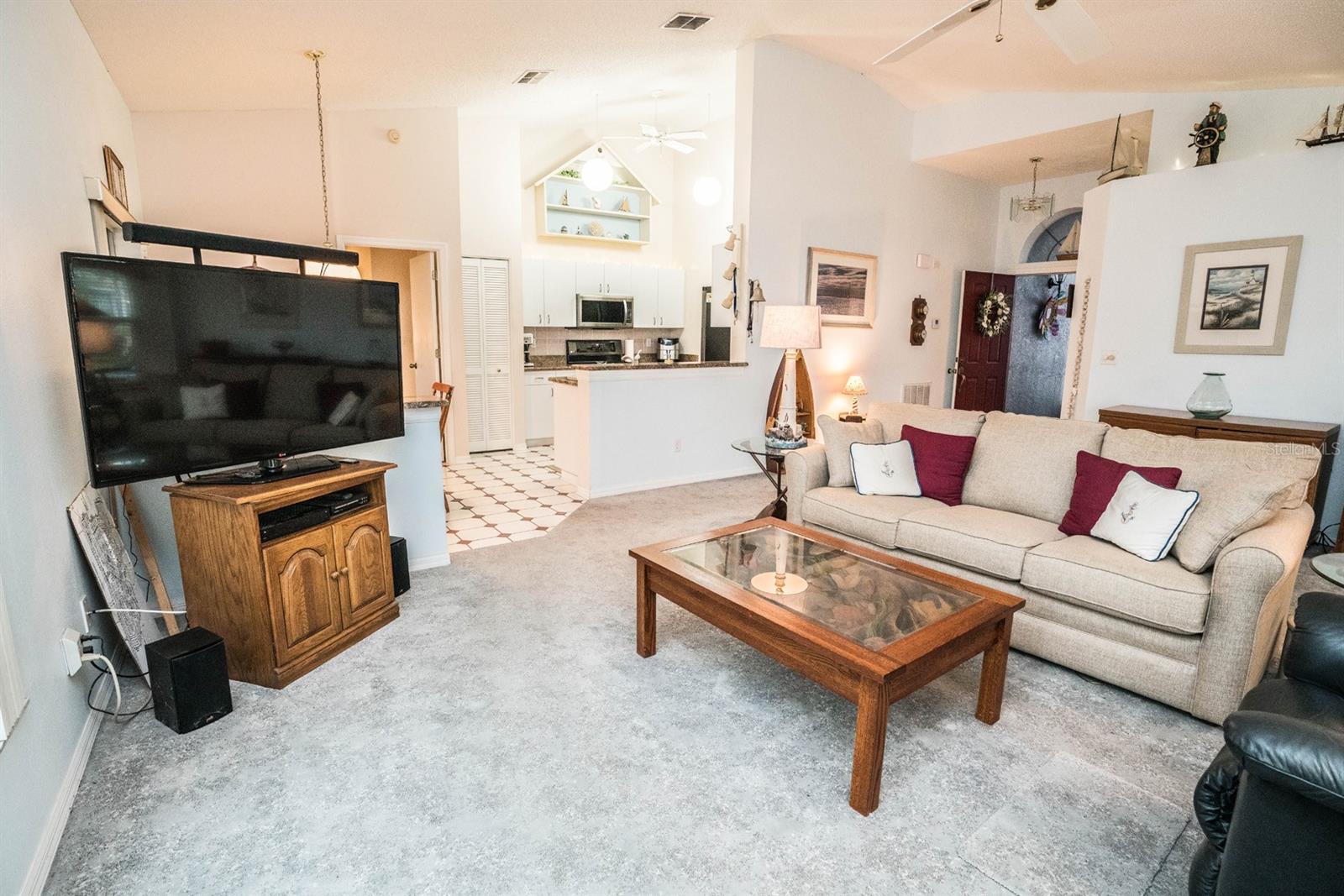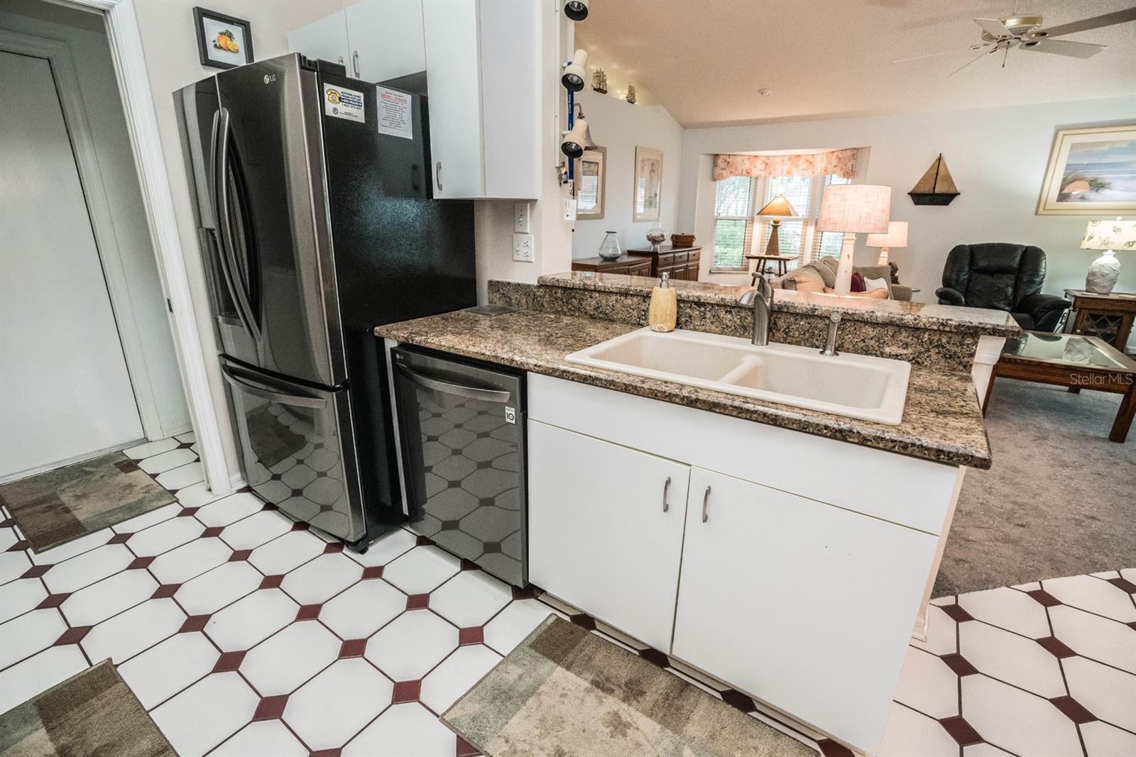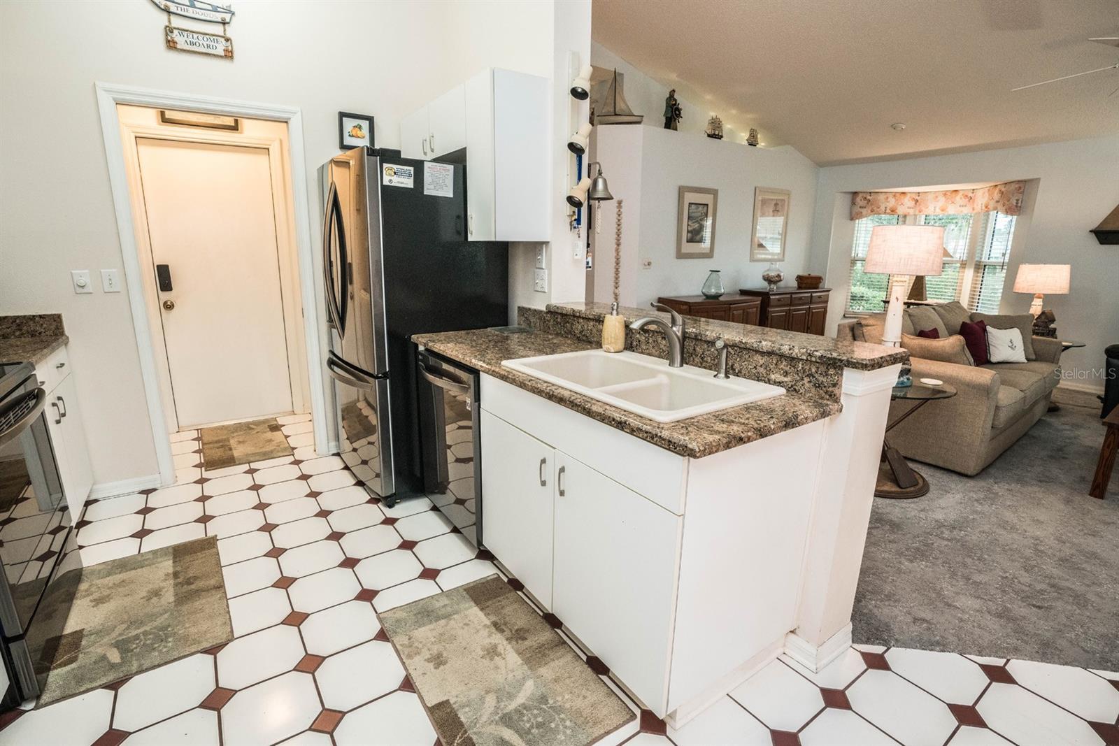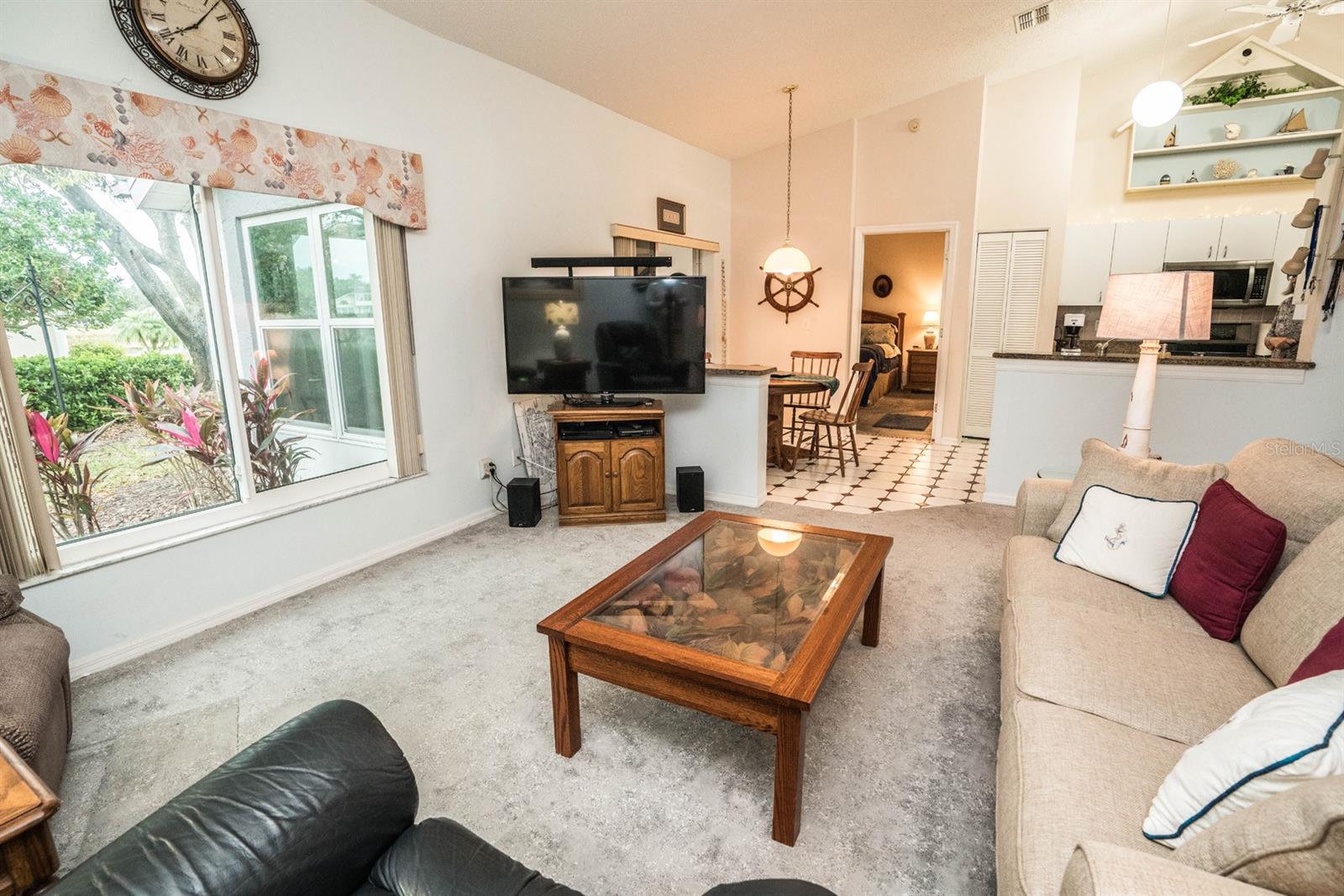 Beautifully updated 2-bedroom, 2-bath Yale Model with stunning water views, offering 1,291 sq. ft. of living space plus a 9x12 enclosed lanai overlooking a peaceful pond. The open floor plan with vaulted ceilings creates a spacious atmosphere perfect for entertaining family and friends. The large 20x18 living/dining room flows seamlessly, and the 14x13 master bedroom features a walk-in closet and a remodeled en-suite bath with dual sinks. Recent updates include Hurricane Windows, brand-new granite countertops in the kitchen, new carpeting throughout, and appliances that are just 3 years old, including a flat-top range, microwave, dishwasher, refrigerator, and disposal. The kitchen also offers a pantry for extra storage. A second refrigerator in the garage provides additional space for food storage. The laundry area includes a washer and dryer, and the 22x19 two-car garage comes with built-in cabinets for added convenience. Attic access with pull-down stairs offers even more storage options. This move-in ready home combines modern updates with a functional layout and picturesque water views for the perfect Florida lifestyle.