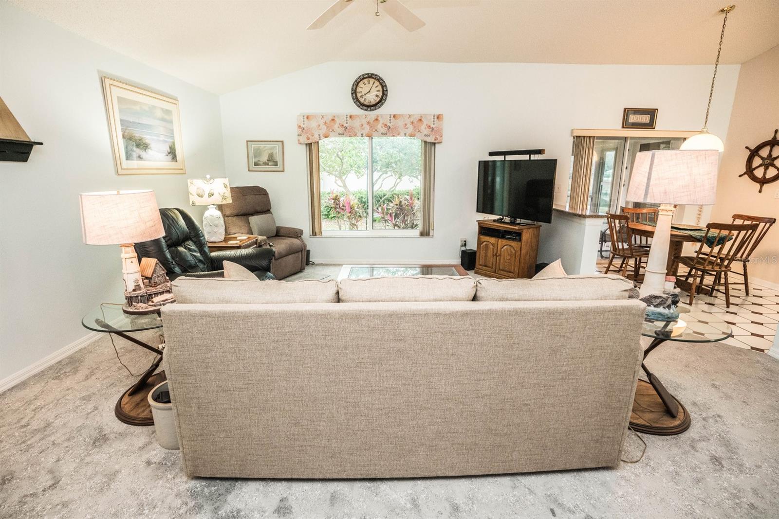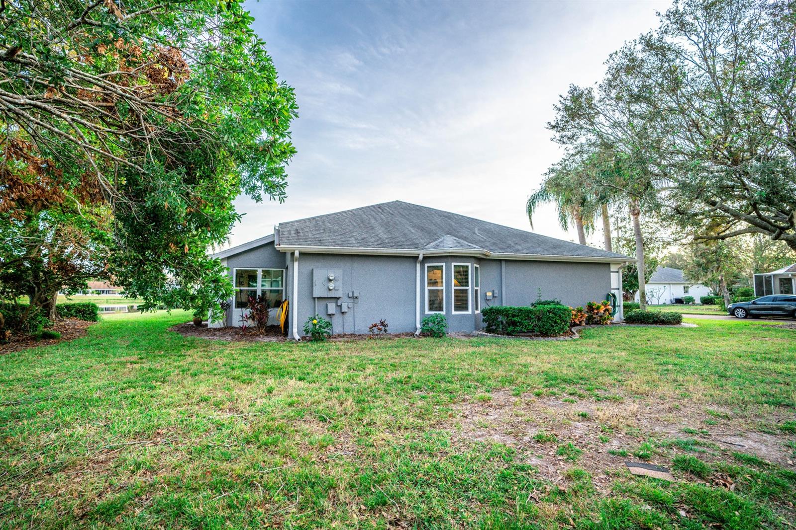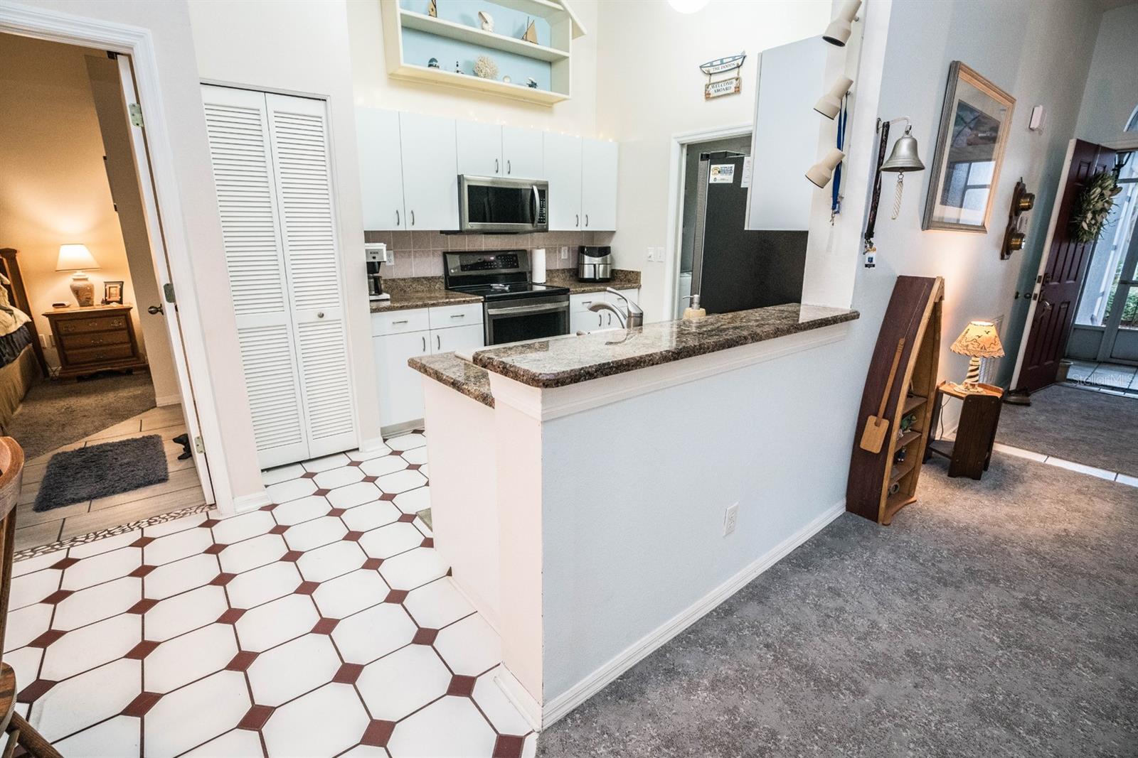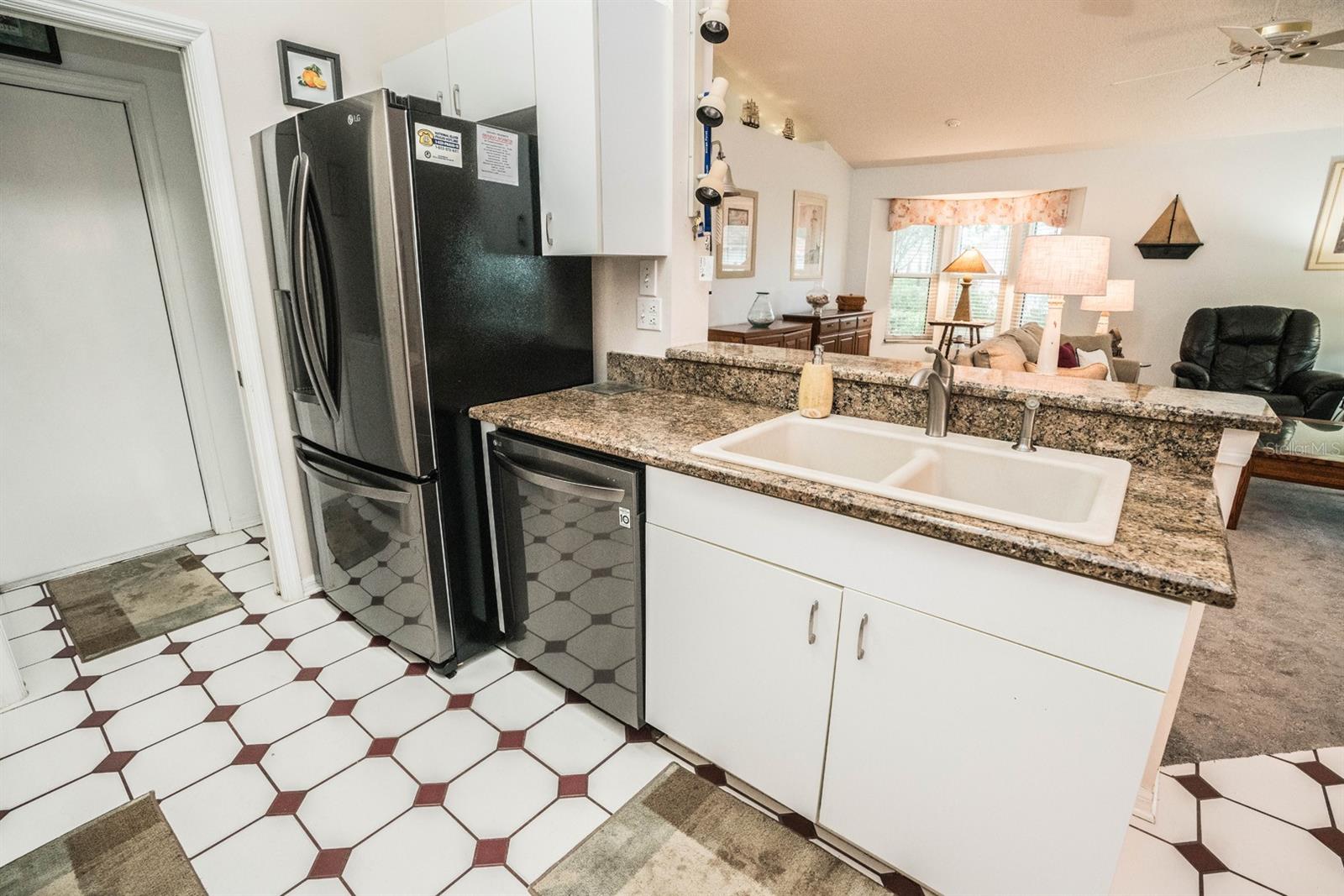 Beautifully updated 2-bedroom, 2-bath Yale Model with stunning water views, offering 1,291 sq. ft. of living space plus a 9x12 enclosed lanai overlooking a peaceful pond. The open floor plan with vaulted ceilings creates a spacious atmosphere perfect for entertaining family and friends. The large 20x18 living/dining room flows seamlessly, and the 14x13 master bedroom features a walk-in closet and a remodeled en-suite bath with dual sinks. Recent updates include Hurricane Windows, brand-new granite countertops in the kitchen, new carpeting throughout, and appliances that are just 3 years old, including a flat-top range, microwave, dishwasher, refrigerator, and disposal. The kitchen also offers a pantry for extra storage. A second refrigerator in the garage provides additional space for food storage. The laundry area includes a washer and dryer, and the 22x19 two-car garage comes with built-in cabinets for added convenience. Attic access with pull-down stairs offers even more storage options. This move-in ready home combines modern updates with a functional layout and picturesque water views for the perfect Florida lifestyle.