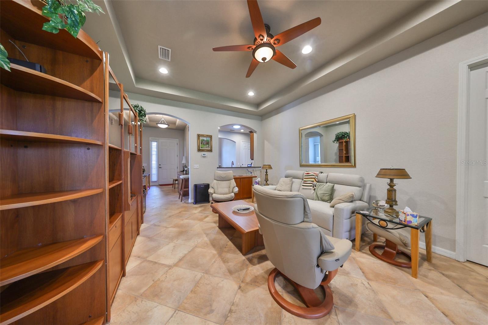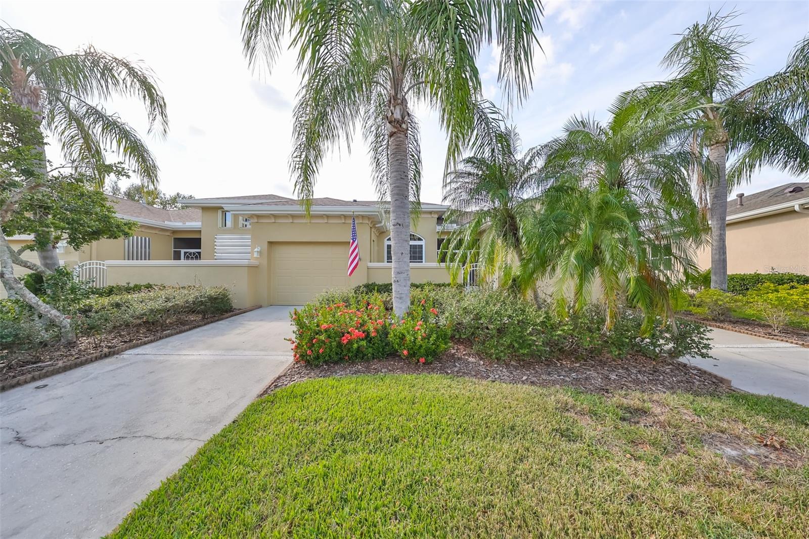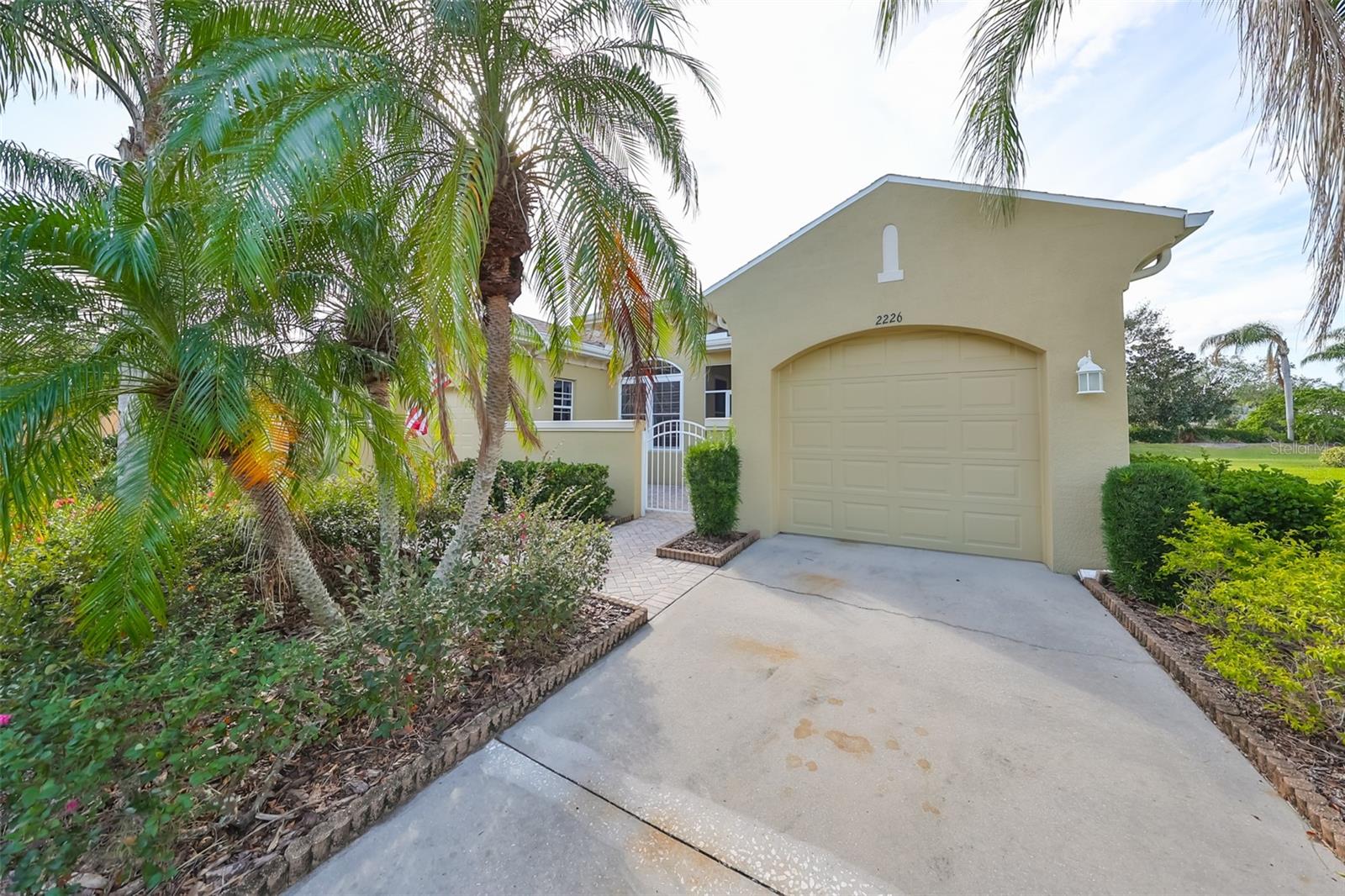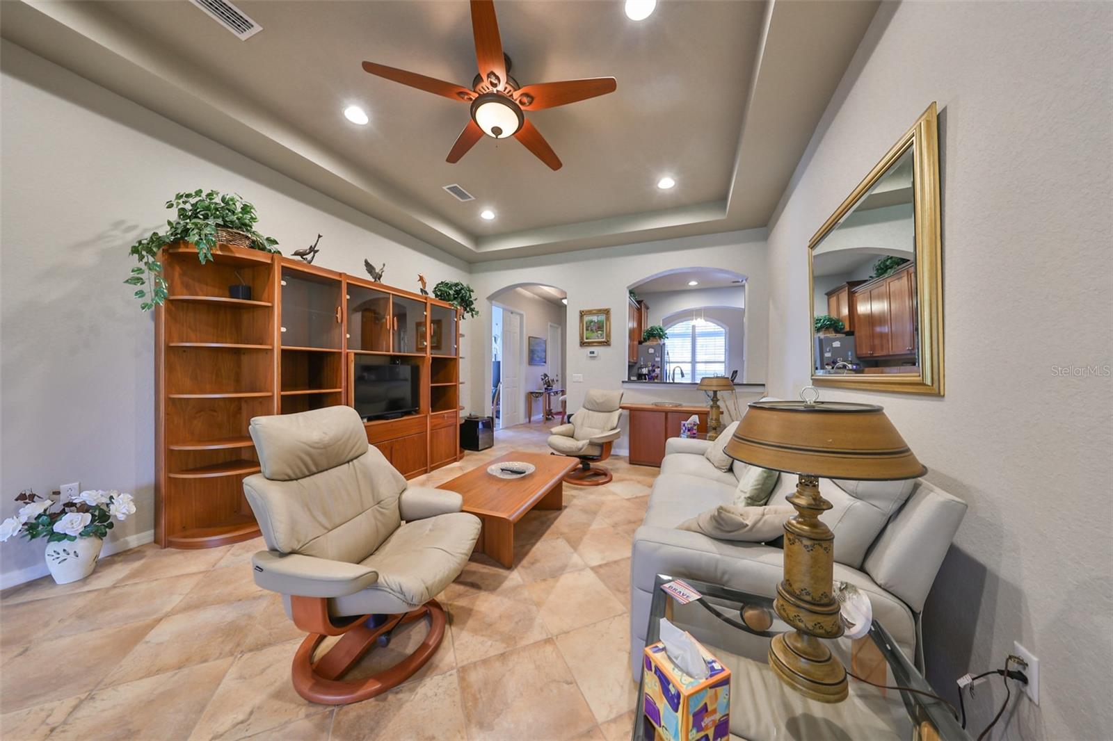 Welcome to this stunning Chelsea Model condo, gracefully nestled in the desirable 55+ gated Kings Point community. This residence offers a perfect blend of charm, elegance, and functionality, featuring 3 bedrooms and 2 bathrooms across 1,630 sq. ft. of thoughtfully designed, maintenance-free living space. Approaching the home, you’ll be welcomed by a gated brick courtyard that seamlessly connects to a two-car split garage, creating an inviting entryway. The private, walled-in courtyard is an ideal spot for morning coffee or friendly conversations with neighbors, while a screened-in front porch provides additional space to enjoy the serene surroundings. Step inside to be greeted by soaring tray ceilings and stunning earth-tone tile flooring, which flows through the foyer, kitchen, dining room, and living areas. The bright, open floor plan is perfect for both entertaining and everyday living. The living room, accented by elegant tray ceilings and abundant natural light, opens into a refined kitchen that will delight any chef. With upgraded 42-inch Beadboard wooden cabinets resembling shiplap, stone countertops, and stainless steel appliances, the kitchen seamlessly connects to the family room for easy gatherings. The primary suite offers a luxurious retreat with tray ceilings, a ceiling fan, and a spacious walk-in closet. The spa-like en-suite bathroom features dual vanities and a beautifully tiled, walk-in shower with a built-in seat. The split bedroom layout ensures privacy for all, with the versatile third bedroom functioning as a perfect office, den, or guest room. Both bathrooms are elegantly designed with matching earth-tone tile flooring, while additional bedrooms feature luxury vinyl flooring and ceiling fans. Recent updates include brand-new luxury vinyl flooring (2022) and a new washer and dryer (2024). Double-pane windows and architectural features such as arches and tray ceilings add sophistication. Enjoy energy efficiency with gas-powered heating, a gas dryer, and a hot water heater. The family room leads to a three-panel sliding glass door that opens onto a screened-in lanai, overlooking a lush, private backyard—a perfect setting for relaxation or outdoor gatherings. The beautiful brown leather couch in the den can also stay, adding both comfort and charm to your new space. Don’t miss this opportunity for luxury living, complete with these fabulous extras! Kings Point residents enjoy an active lifestyle with amenities that include two clubhouses, five swimming pools, multiple pickleball and tennis courts, fitness centers, and numerous clubs and activities. This golf cart-friendly community offers convenient access to Tampa, Sarasota, Gulf Coast beaches, and popular attractions like Disney World. This move-in-ready home is a rare find, offering modern amenities in a picturesque, gated setting. Schedule your showing today and discover the best of Florida living in this charming, well-appointed condo.