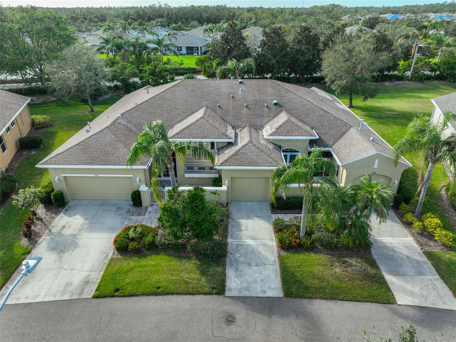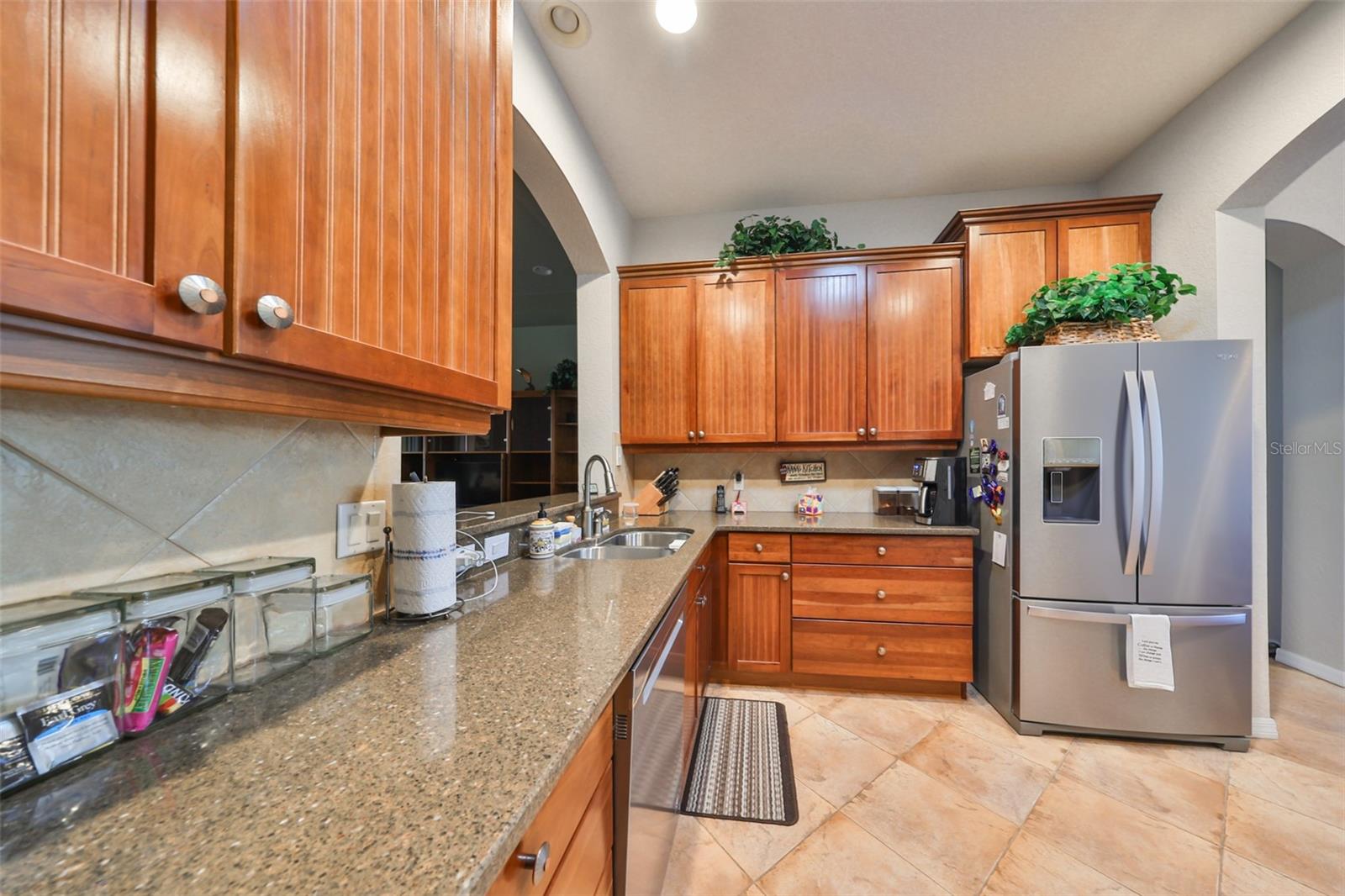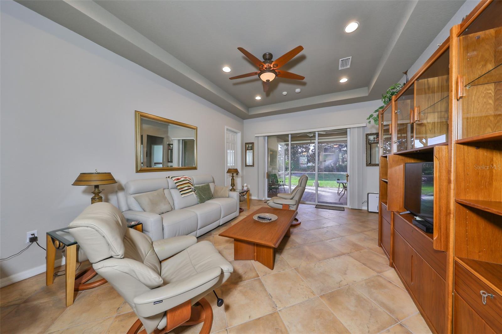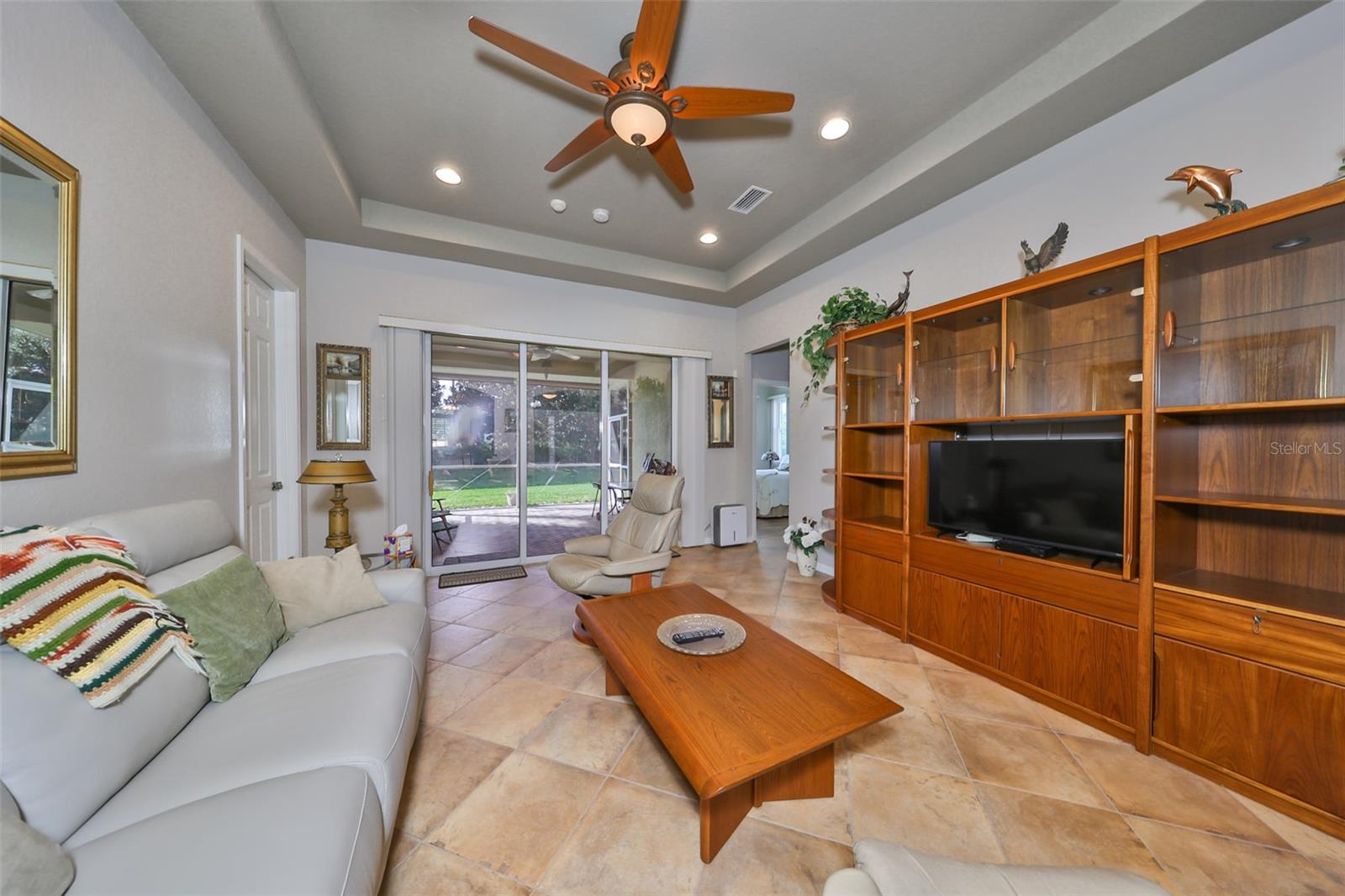 Welcome to this stunning Chelsea Model condo, gracefully nestled in the desirable 55+ gated Kings Point community. This residence offers a perfect blend of charm, elegance, and functionality, featuring 3 bedrooms and 2 bathrooms across 1,630 sq. ft. of thoughtfully designed, maintenance-free living space. Approaching the home, you’ll be welcomed by a gated brick courtyard that seamlessly connects to a two-car split garage, creating an inviting entryway. The private, walled-in courtyard is an ideal spot for morning coffee or friendly conversations with neighbors, while a screened-in front porch provides additional space to enjoy the serene surroundings. Step inside to be greeted by soaring tray ceilings and stunning earth-tone tile flooring, which flows through the foyer, kitchen, dining room, and living areas. The bright, open floor plan is perfect for both entertaining and everyday living. The living room, accented by elegant tray ceilings and abundant natural light, opens into a refined kitchen that will delight any chef. With upgraded 42-inch Beadboard wooden cabinets resembling shiplap, stone countertops, and stainless steel appliances, the kitchen seamlessly connects to the family room for easy gatherings. The primary suite offers a luxurious retreat with tray ceilings, a ceiling fan, and a spacious walk-in closet. The spa-like en-suite bathroom features dual vanities and a beautifully tiled, walk-in shower with a built-in seat. The split bedroom layout ensures privacy for all, with the versatile third bedroom functioning as a perfect office, den, or guest room. Both bathrooms are elegantly designed with matching earth-tone tile flooring, while additional bedrooms feature luxury vinyl flooring and ceiling fans. Recent updates include brand-new luxury vinyl flooring (2022) and a new washer and dryer (2024). Double-pane windows and architectural features such as arches and tray ceilings add sophistication. Enjoy energy efficiency with gas-powered heating, a gas dryer, and a hot water heater. The family room leads to a three-panel sliding glass door that opens onto a screened-in lanai, overlooking a lush, private backyard—a perfect setting for relaxation or outdoor gatherings. The beautiful brown leather couch in the den can also stay, adding both comfort and charm to your new space. Don’t miss this opportunity for luxury living, complete with these fabulous extras! Kings Point residents enjoy an active lifestyle with amenities that include two clubhouses, five swimming pools, multiple pickleball and tennis courts, fitness centers, and numerous clubs and activities. This golf cart-friendly community offers convenient access to Tampa, Sarasota, Gulf Coast beaches, and popular attractions like Disney World. This move-in-ready home is a rare find, offering modern amenities in a picturesque, gated setting. Schedule your showing today and discover the best of Florida living in this charming, well-appointed condo.