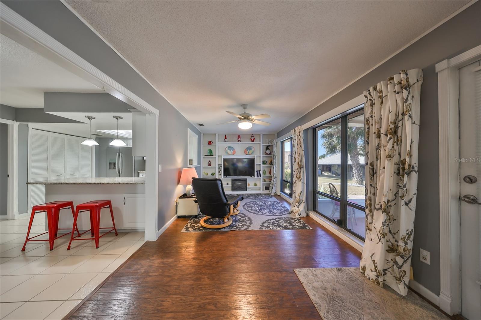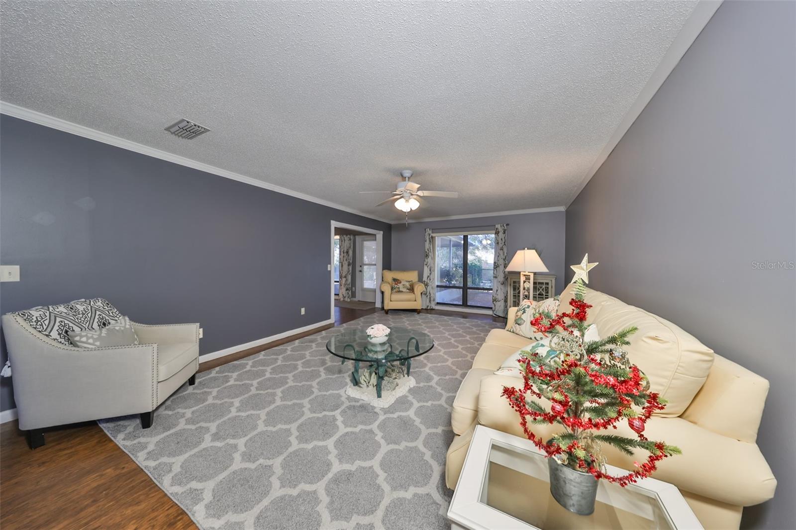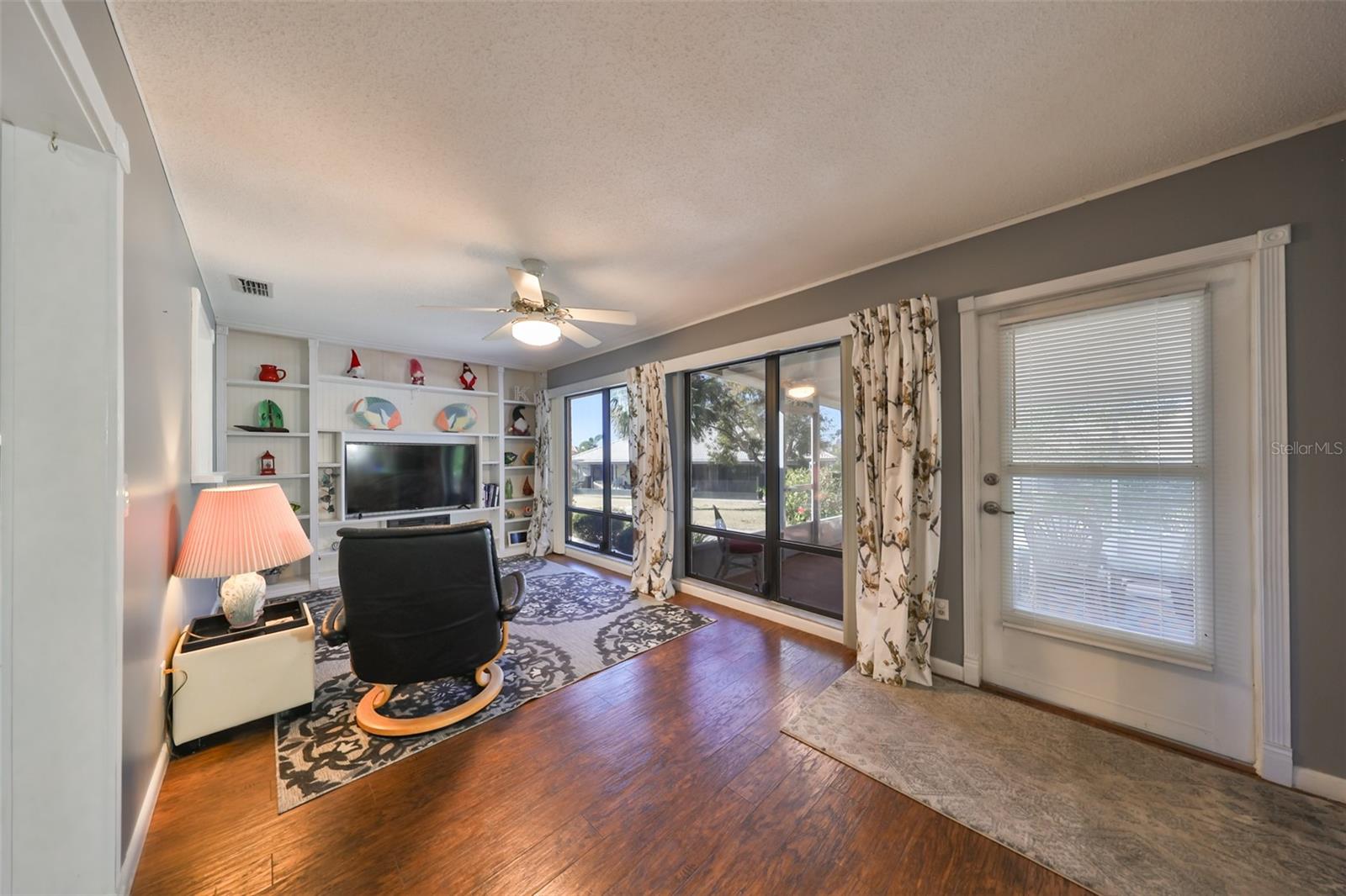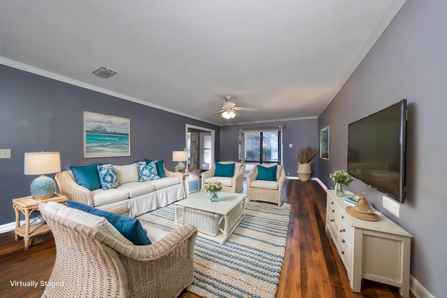 One or more photo(s) has been virtually staged. PRICE IMPROVEMENT, MOTIVATED SELLER! Don't Miss This Opportunity! Move right into this beautifully customized Augusta floor plan, 2-bedroom, 2-bath home featuring an 18x10 Florida/family room off the kitchen, available in the sought-after Greenbriar neighborhood of Sun City Center, a 55+ community, recently voted Americas #1 Retirement Community for 2024 by Realtor.com and Travel + Leisure Magazine. From the moment you arrive, you'll be captivated by this well-maintained home's curb appeal, highlighted by its flat tile roof (Installed in 2013), beautifully landscaped yard, and tiled walkway leading to a wood-look front door. This home offers abundant storage and features laminate flooring throughout, with tile in the wet areas. Elegant details include crown molding in the main living areas and master bedroom, framed doorways, and a built-in bookcase in the Florida/family room. The kitchen is light and bright, enhanced by a solar tube, white cabinetry, solid surface countertops, and newer stainless-steel appliances. It also boasts plenty of storage with drawers, a lazy Susan, and convenient design. Both bathrooms feature tall vanities with updated faucets, and the master bath includes a granite countertop with double sinks. Step outside to enjoy the private, covered, screened patio (added in 2021), measuring 17x15, overlooking the beautifully landscaped backyard. Additional updates include a newer HVAC system installed in 2019. The garage has built in cabinets and workbench with lighting. Greenbriar residents enjoy a low HOA fee of just $115 per year. Sun City Center is one of Florida's most affordable and vibrant active-living communities, offering an array of amenities, including three heated pools, a state-of-the-art fitness center, a sports complex, an arts and crafts building, two clubhouses, top-tier medical facilities, shopping, golf courses, and over 150 social and sports clubs?all accessible by golf cart! Located conveniently near Tampa, Sarasota, St. Petersburg, Tampa International Airport, world-class beaches, shopping, dining, theaters, and more, Sun City Center is the perfect place to call home. Come have fun under the Florida sun!