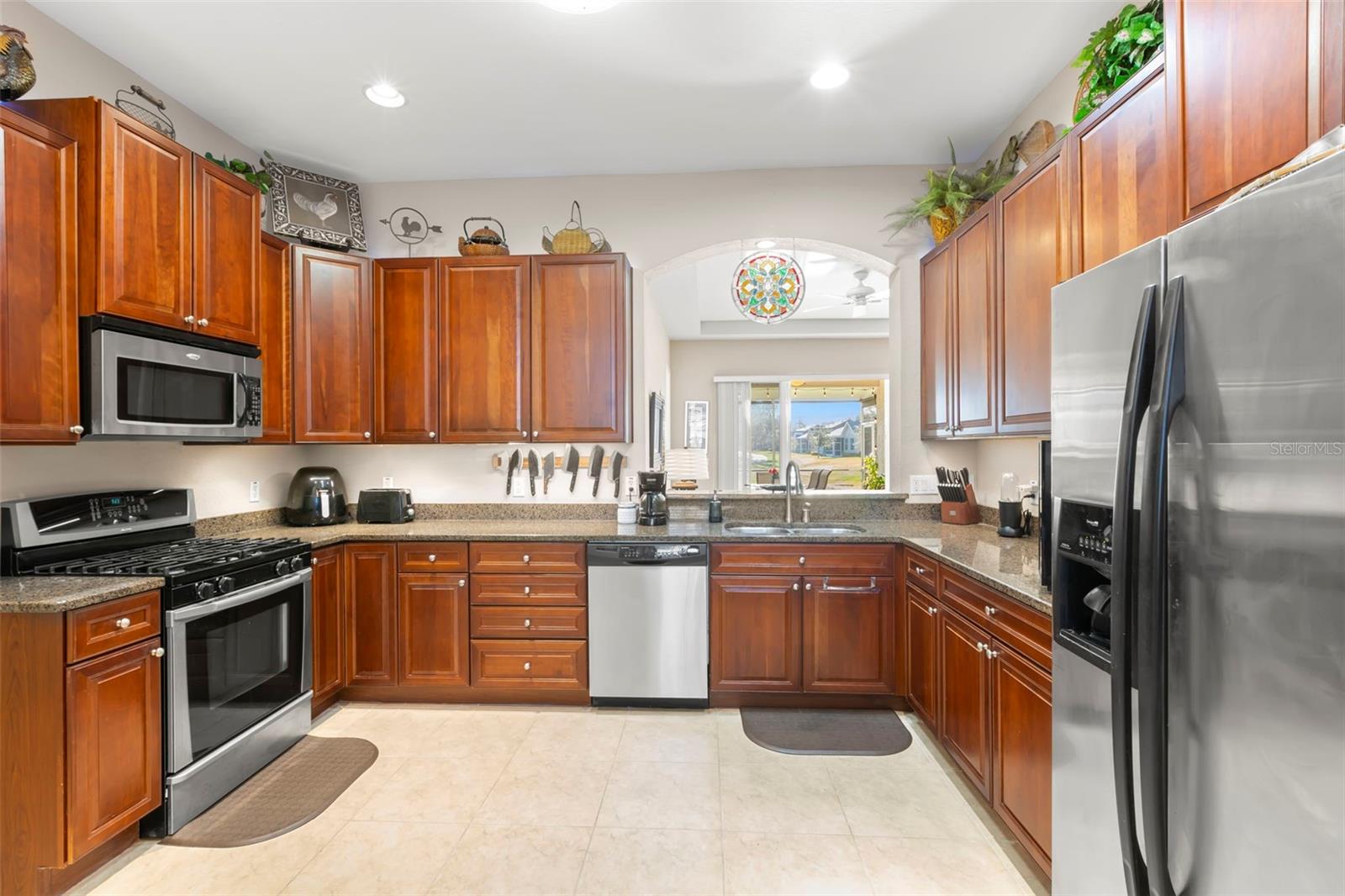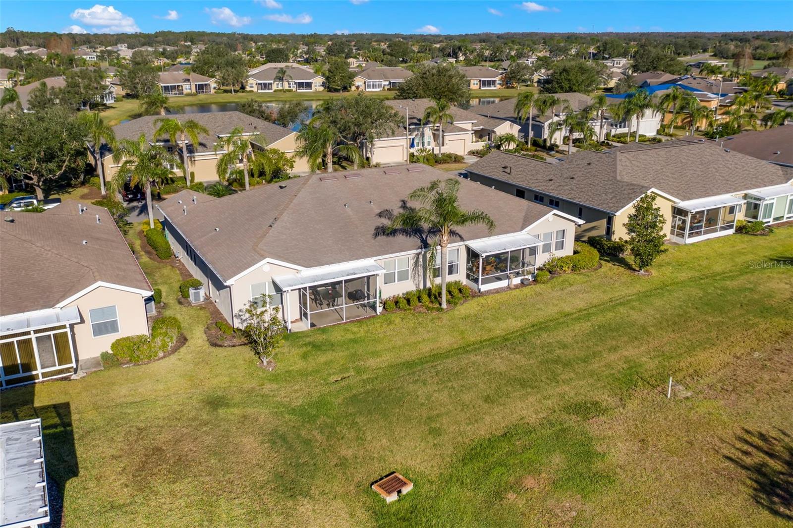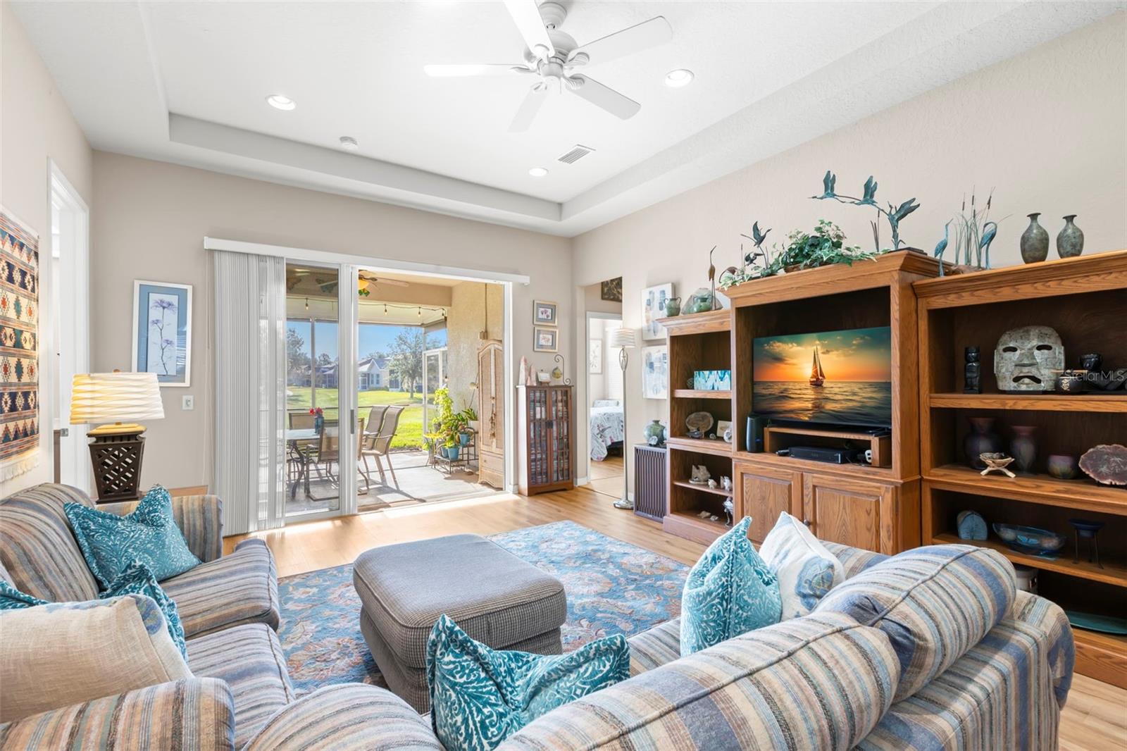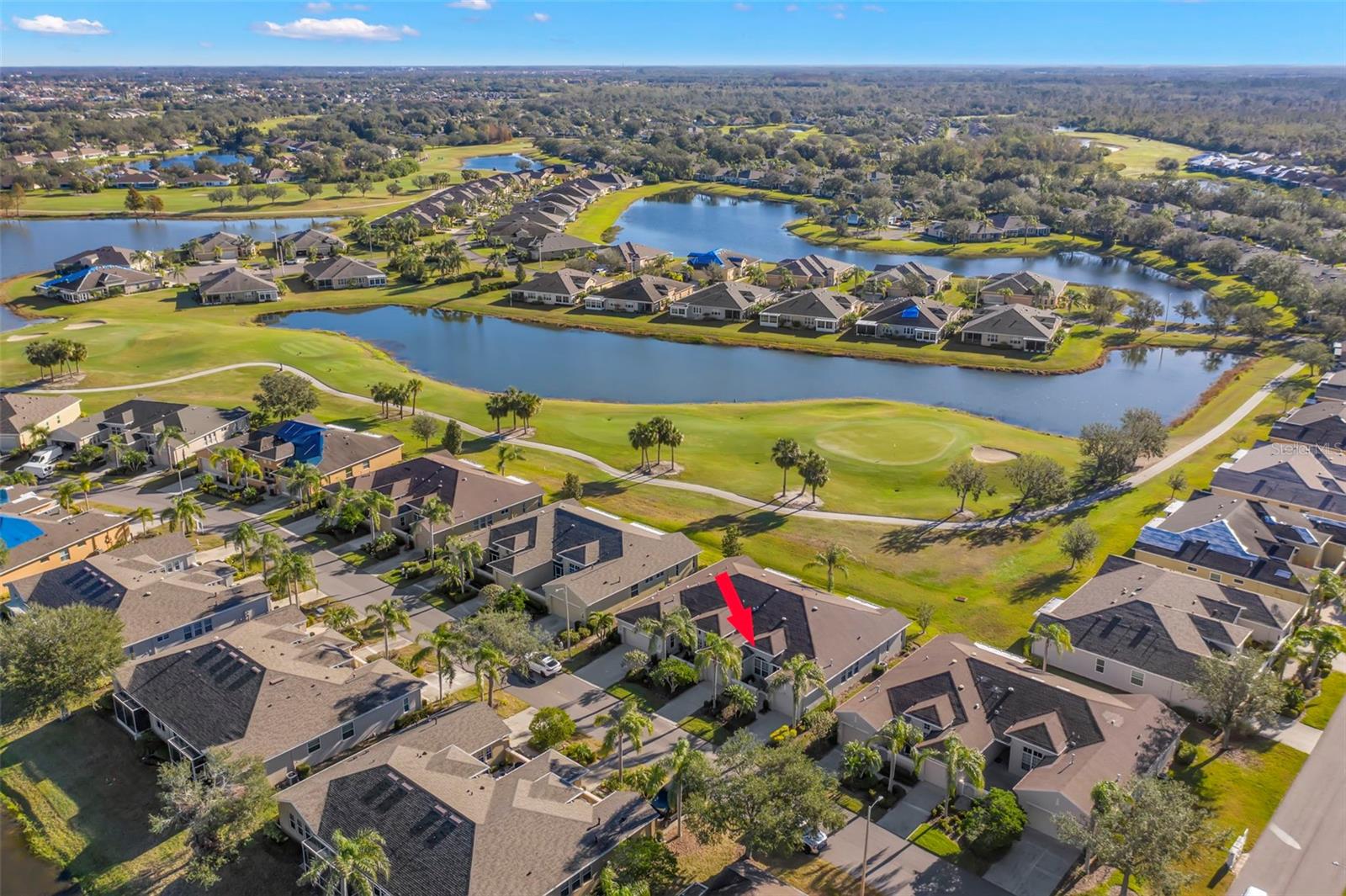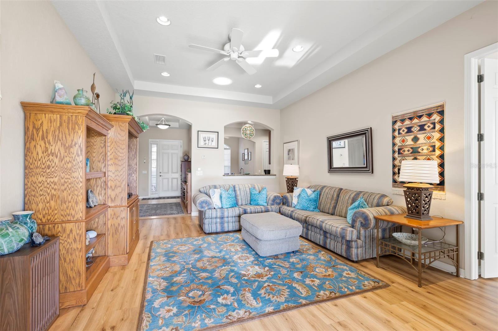 Motivated Seller offering a $7,500 reduction with a quick closing! Discover a great opportunity located in the NUMBER ONE Rated Retirement Community in America! This home is located in Kings Point and overlooks the 9th hole of the Osprey course in this PET FRIENDLY location! (2 pets allowed with no weight restrictions) In addition, there is no CDD, No Flood Zone, short term rentals allowed and part of the 80/20 rule where an AGE WAIVER is possible if under 55! This Chelsea floor plan features one of the most sought-after options: a front courtyard that not only welcomes your guests but also offers an additional outdoor living area. Additionally, there is a screened and covered breezeway that provides shelter for your packages. Inside, your eye will be directed to the view of the GOLF COURSE from the moment you enter! The foyer greets you with impressive tray-accented high ceilings measuring 10 feet 8 inches, along with ample space designed for a drop zone and bench seating. The living room features the same impressive high tray ceiling as the foyer and has space for oversized furniture without feeling cramped. The kitchen is truly a chef’s dream with Granite countertops, GAS range, stainless steel appliances and loads of wood cabinetry with Lazy Susan corner cabinets and roll out shelving. There is a pass-through into the Great Room which makes for ease of serving and the dining overlooks the courtyard. The lanai has been expanded and now measures an impressive 14 x 16.8 feet. You will love watching golfers and observing nature, including a variety of birds, thanks to the unobstructed view and absence of immediate neighbors! The split floor plan includes a spacious primary bedroom that can easily fit king-size furniture, provides space for a sitting area, and boasts a tray ceiling. The en-suite bathroom has tall cabinetry, GRANITE countertops, dual sinks, a walk-shower with glass enclosure and a separate water closet. Storage is no issue with the spacious walk-in closet featuring wrap around shelving and 10’ ceilings. The second bedroom is filled with natural light, has several windows, a walk-in closet, and a nook that’s perfect for storing some of your furniture out of sight. This room has quick access to the second full bathroom which offers the same finishes as the primary along with a tub/shower enclosure. The third bedroom has double door access, a wall of windows that floods the space with natural light, and ample room to create an office while still accommodating a third sleeping area. The laundry room is equipped with the same updated cabinetry as the rest of the home. The TWO garages (12x21 each) and extended driveways provide more storage room and ease of parking than a two-car garage! This home is located close to the second entrance and South Clubhouse. Additional features and updates include solar tubes, arched doorways, ceiling fans throughout, no carpet and a KPW Platinum Warranty that can be transferred at the time of Closing. Fees include cable, internet, exterior insurance, maintenance grounds, pest control, private road, security, water, trash, sewer & more! Activities include over 200 clubs, multiple indoor/outdoor HEATED pools, fitness, pickle ball, an onsite SALON and multiple restaurants and so much more! If you plan on venturing out there is quick access to restaurants, SHOPPING, beaches & 30 minutes to Tampa International Airport, less than an hour to the Sarasota shops and 20 minutes to Ellenton Prime Outlets!