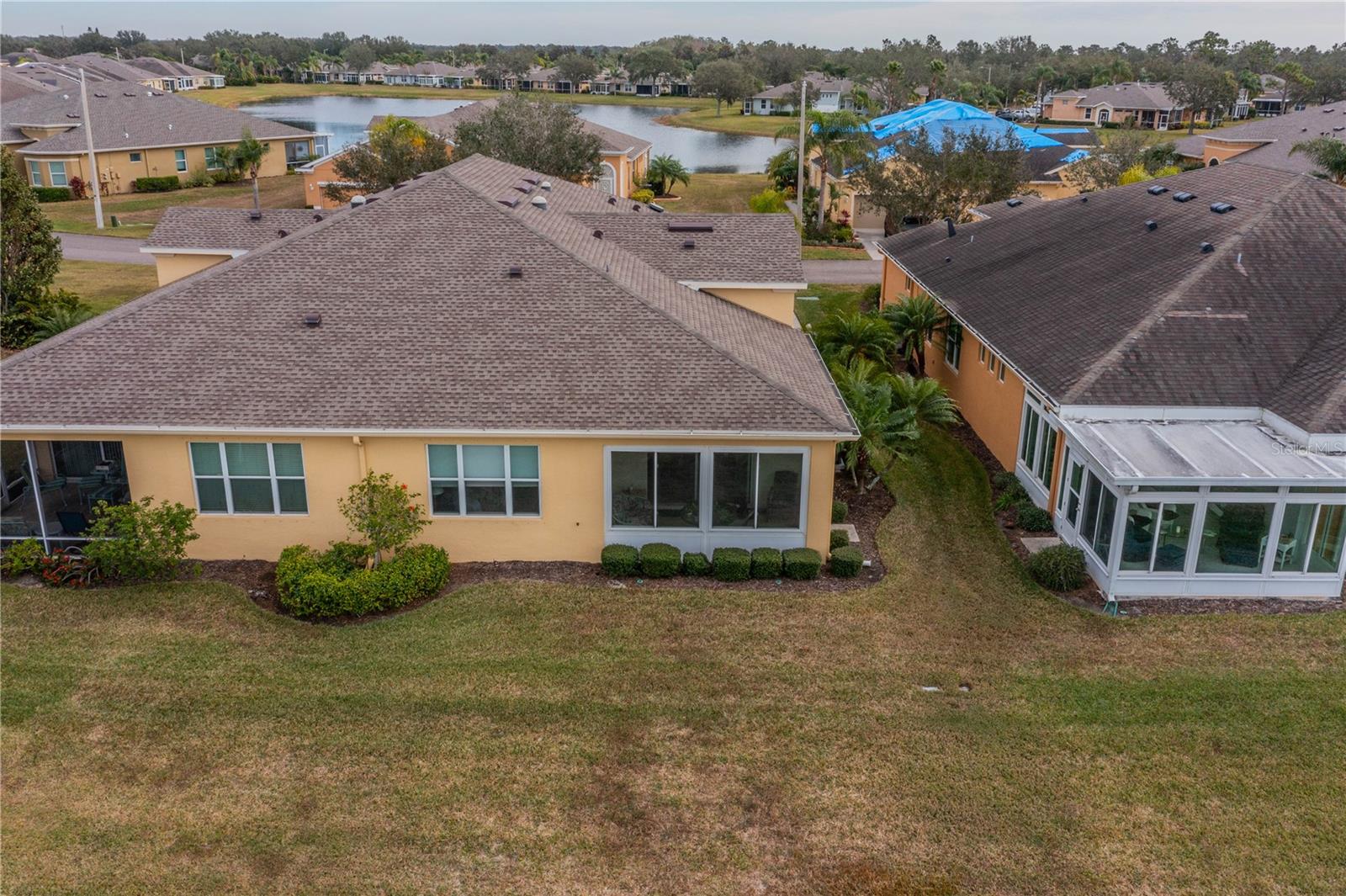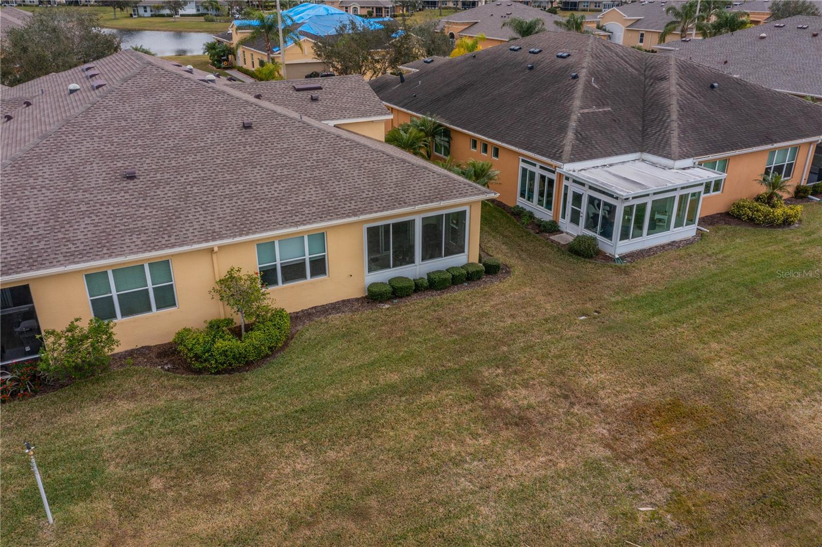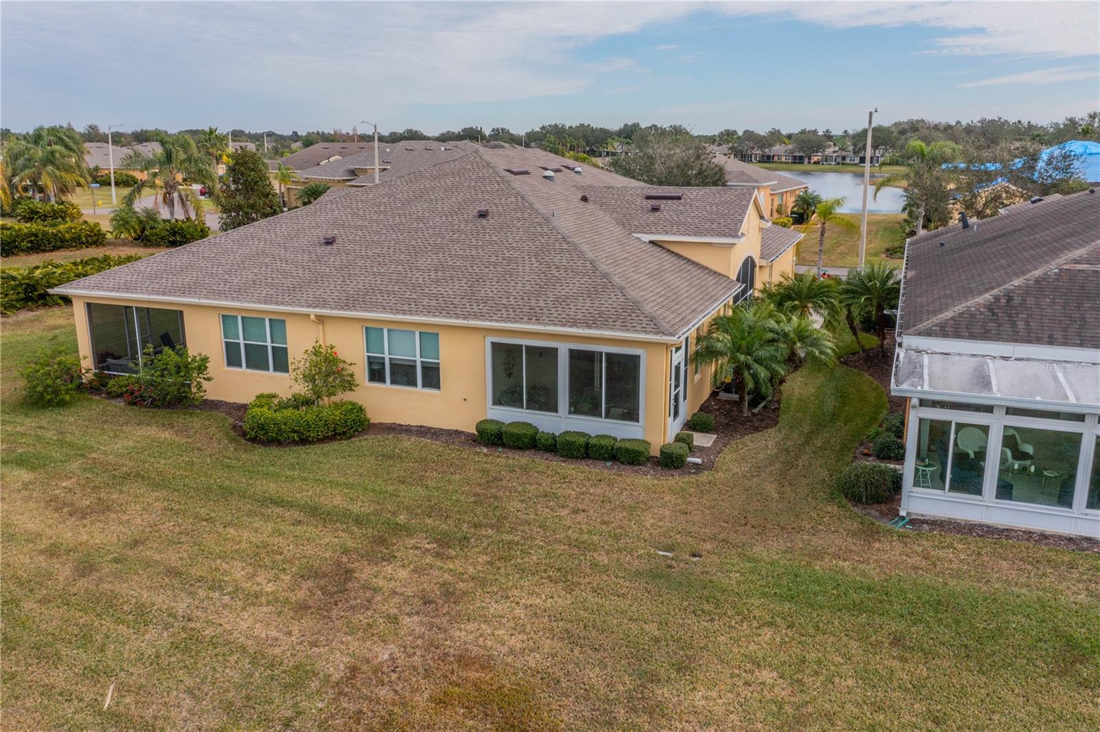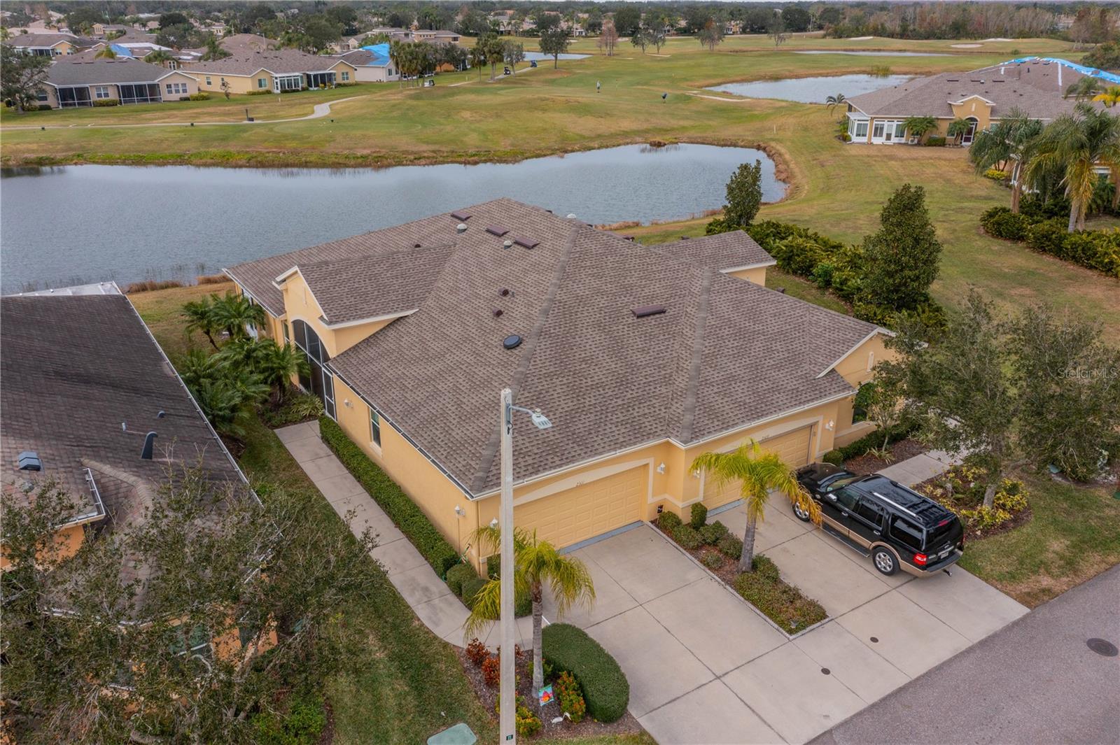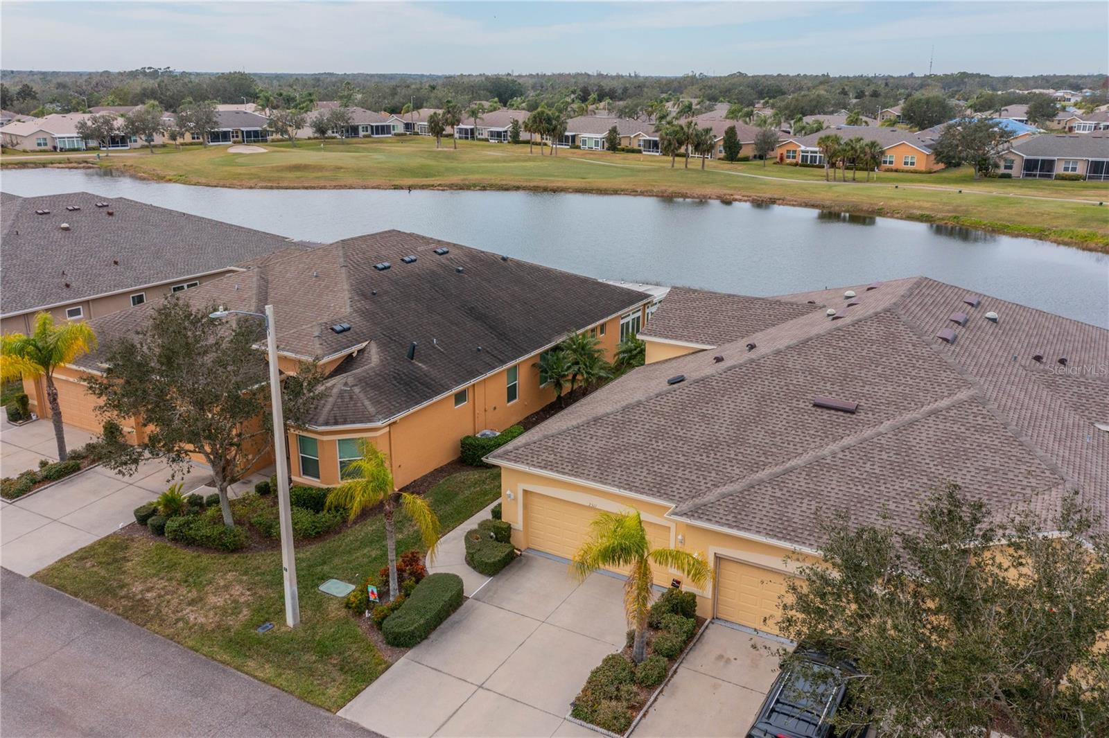 NO HOA FEES FROM APRIL 1 to MARCH 31, 2026! New roof in 2023. This beautiful Minto home in the great Nottingham Villas of Kings Point has a lovely screened entryway large enough to sit and enjoy the fresh air. Entering the home you will find a very nice living room, dining room, and kitchen area in an open floorplan. The kitchen is a chef's dream with lots of cabinets and counter space and a large solar tube with lots of light. The living room leads to a terrific Florida room under air. The view of the pond and golf course makes it a great place to sit and enjoy morning coffee or evening cocktail. The primary bedroom is at the back of the home with the second bedroom and den/study at the other end giving lots of privacy to guests visiting you in your sunny Florida home. The primary bath has a very large walk-in closet. The garage has a water softener and the home is equipped with a reverse osmosis system. This home has been very well maintained by the original owner. It is close to the South Clubhouse, pools, and restaurant, and also near the back gate. Kings Point, between Sarasota and Tampa, is an ideal location. The 55+ gated community has terrific facilities, including five pools, two fitness centers, and over 200 clubs for your enjoyment. It is convenient to shopping, world class museums, Busch Gardens, Orlando, sports, and entertainment with wonderful beaches nearby. Come enjoy the Florida lifestyle! Schedule your viewing today!