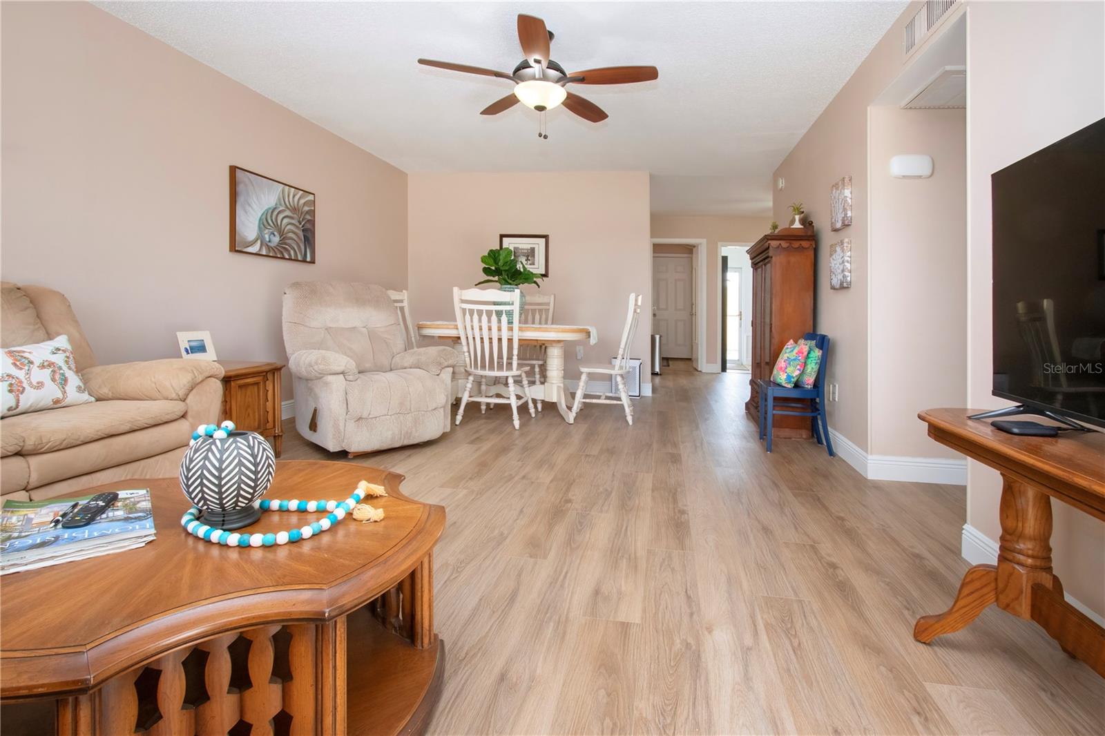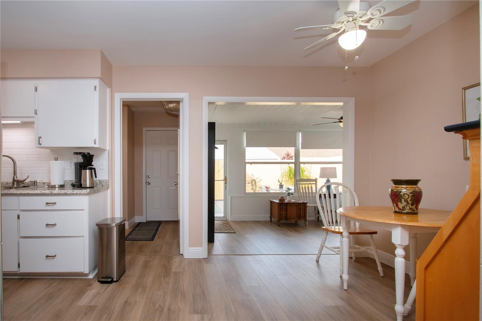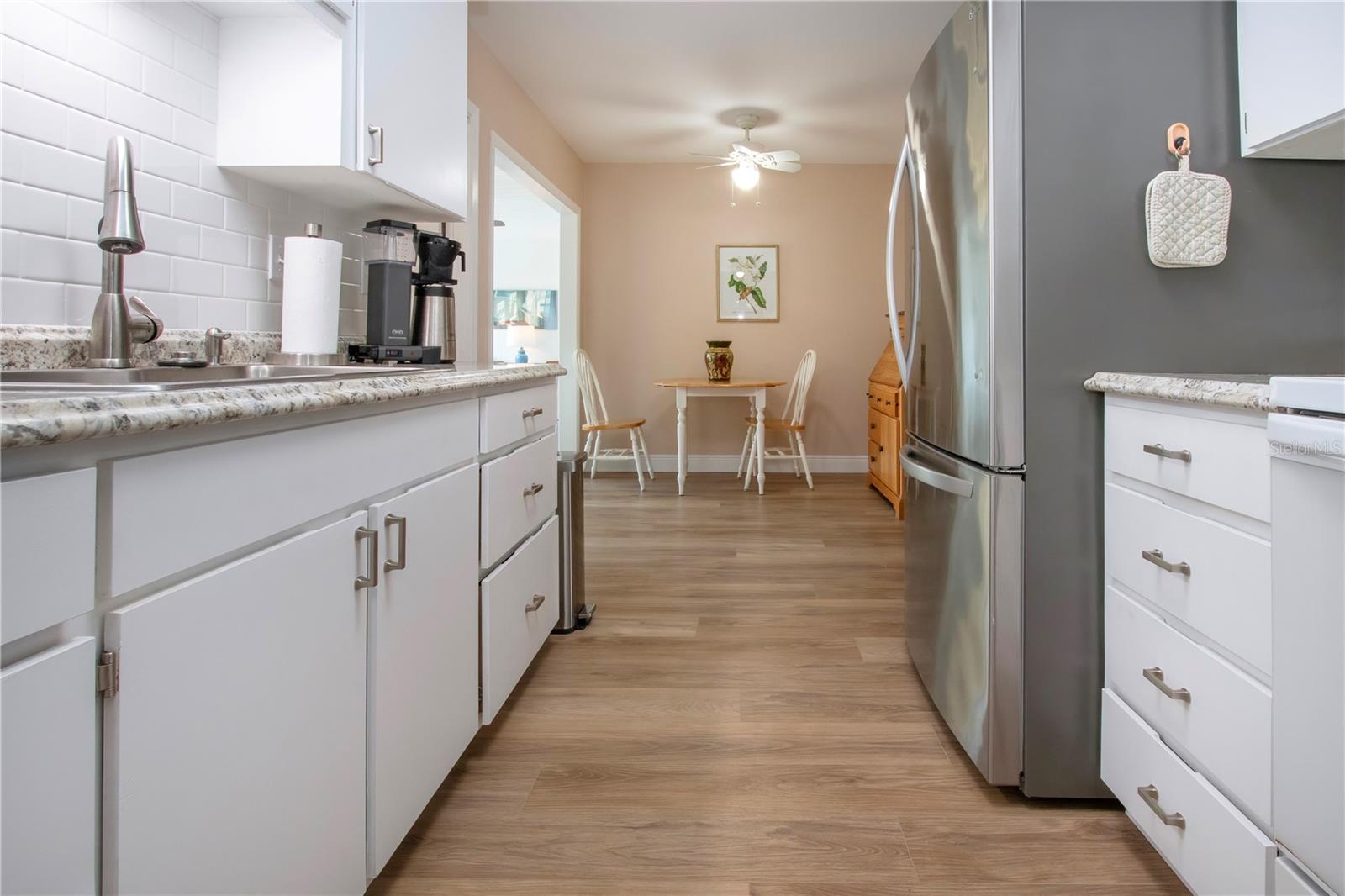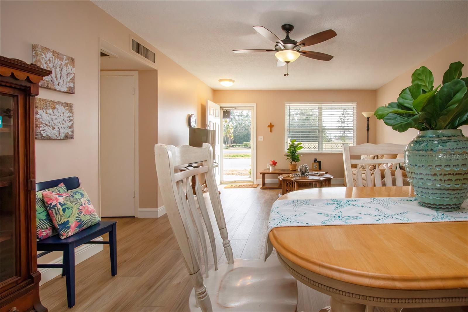 Experience the charm of this beautifully updated and furnished 2 bedroom home in the desirable community of Sun City Center. Featuring fresh paint, stylish luxury vinyl plank flooring throughout, new contemporary baseboards and an upgraded kitchen, this home boasts spacious walk-in closets in both bedrooms. Enjoy your paver block private patio for plants and sun bathing. This home is turnkey furnished and wonderfully updated. New roof 2019, CPVC plumbing 2005, new LG refrigerator 2021, new clothes washer 2020, new garage door 2024. The interior utility room with storage is part of the house under heat and air conditioning. With an affordable HOA fee and a prime location near shopping and activities, this delightful condo is your perfect retirement oasis - schedule a tour today. Sun City Center is a total golf cart community featuring pools, pickleball, volleyball, many sports and over 200 clubs for your enjoyment. We have been named "Florida's #1 Retirement Community". Home of the new Moffitt Cancer Center, active golf courses, close proximity to Tampa and St Petersburg beaches and airports. This home is walking distance to drug stores, doctors and grocery stores.