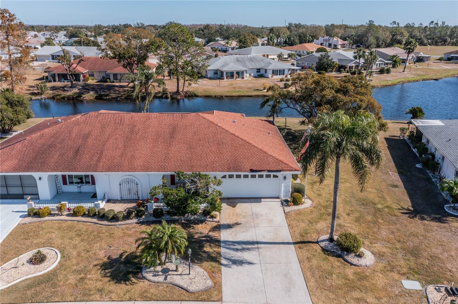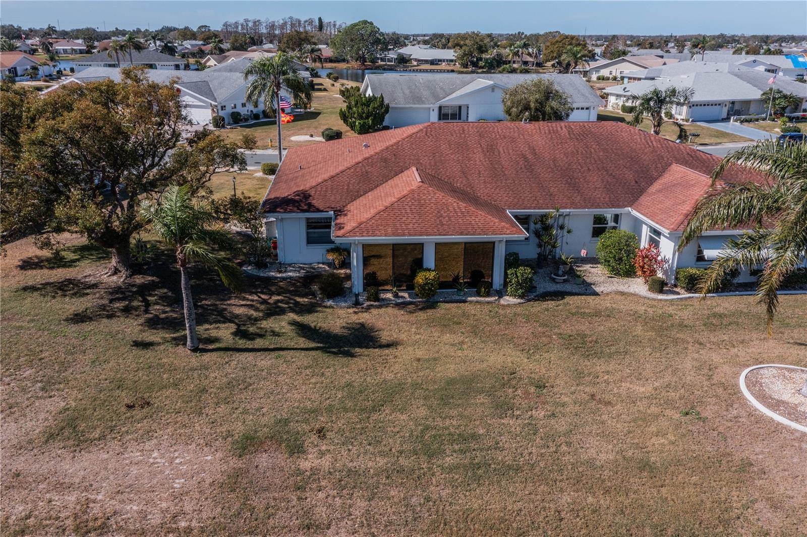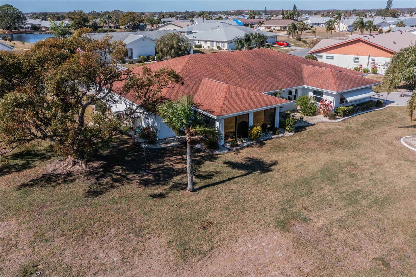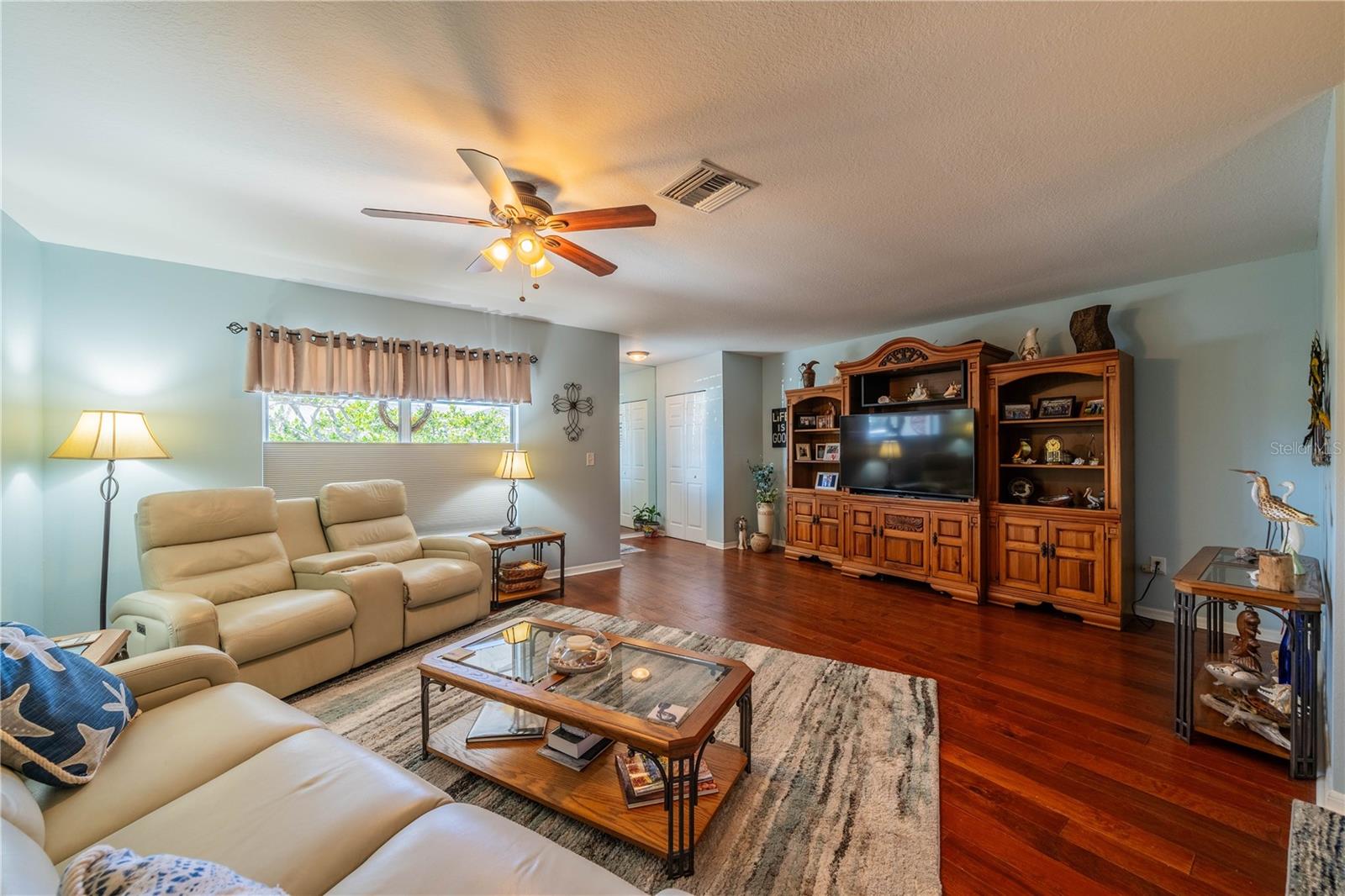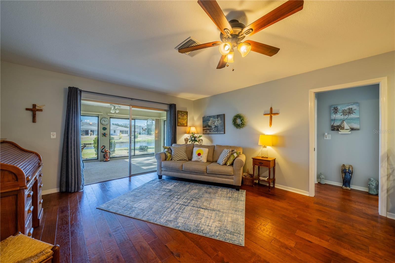 This one-of-a-kind Twintree model home, located in the quiet, serene Bluewater neighborhood is a must see. The minute you walk in, you’ll experience the warm inviting feeling of this home. The rich wood flooring throughout the living room, dining room and den lead to the glass enclosed, heat/AC, lanai with a fabulous view of one of the Acacia Lakes in the backyard. The pocket doors to each bedroom ensuite give added privacy for you and your guests. The reimagined kitchen will delight any chef. The Hickory cabinets with soft close doors and drawers and ample counter space are timeless. There are two lazy susan’s and several pull-out shelves in the lower cabinets. The lovely glass backsplash adds a touch of class. The French door refrigerator has been recessed into the garage offering more floor space and countertop. While washing your dishes enjoy the awesome view of the birds on the backyard pond. The raised counter offers eating space for four. The laundry room off the kitchen has a utility sink and an abundance of extra storage including a pantry, closet, and cabinets over the washer and dryer. The included window treatments are high quality pleated blinds. The home is equipped with a whole house Culligan water treatment system and the lawn is watered from the pond which saves on cost of water. This home is truly a delight. Come see for yourself.