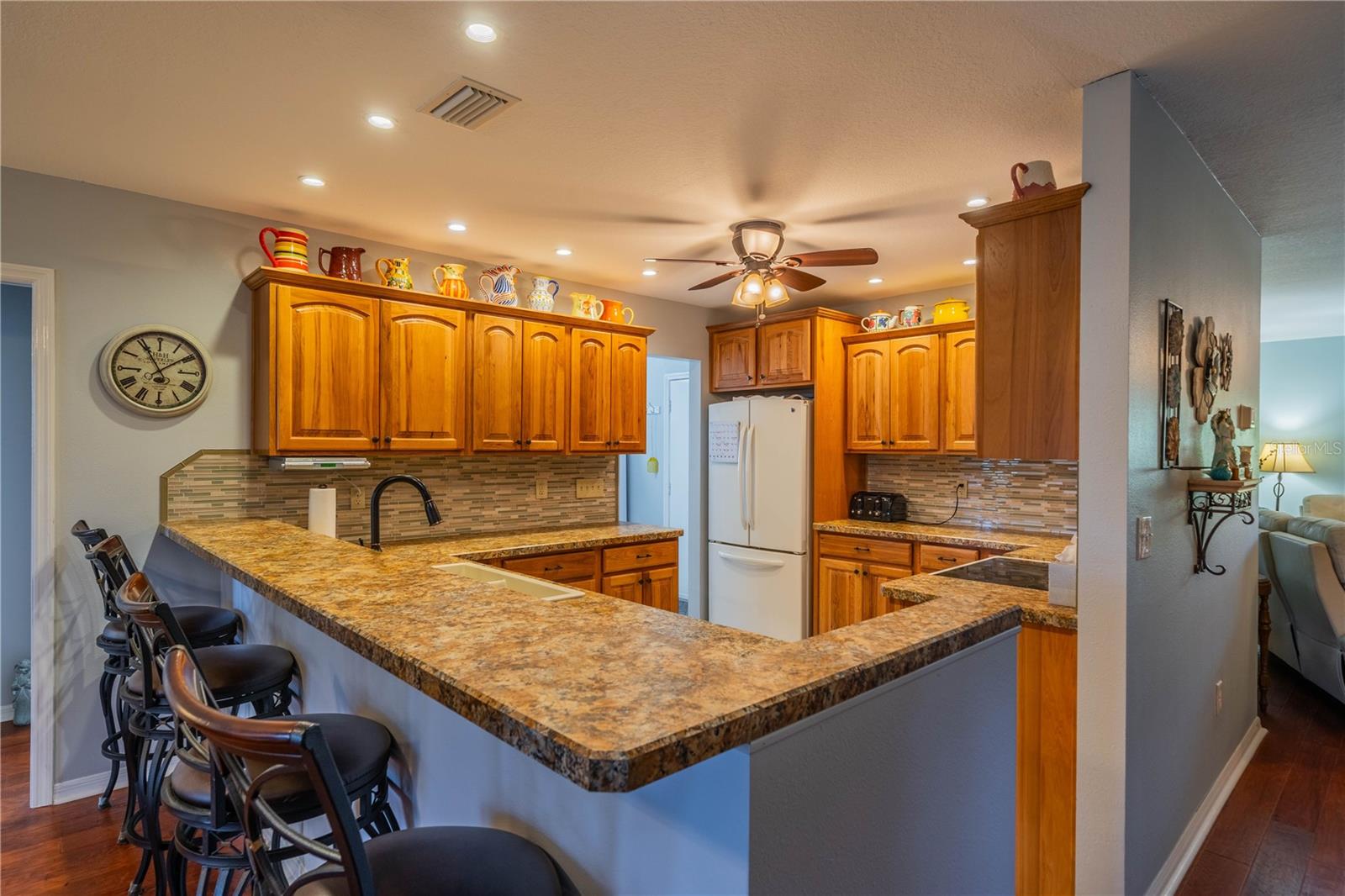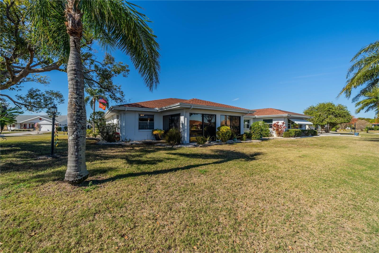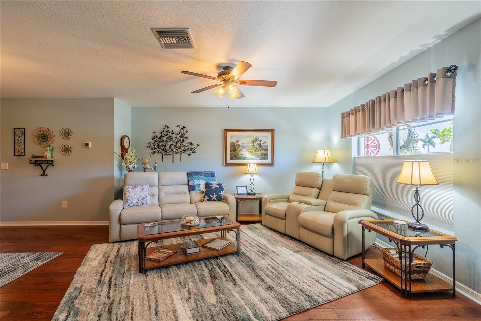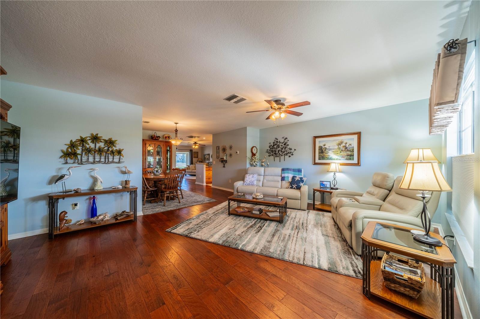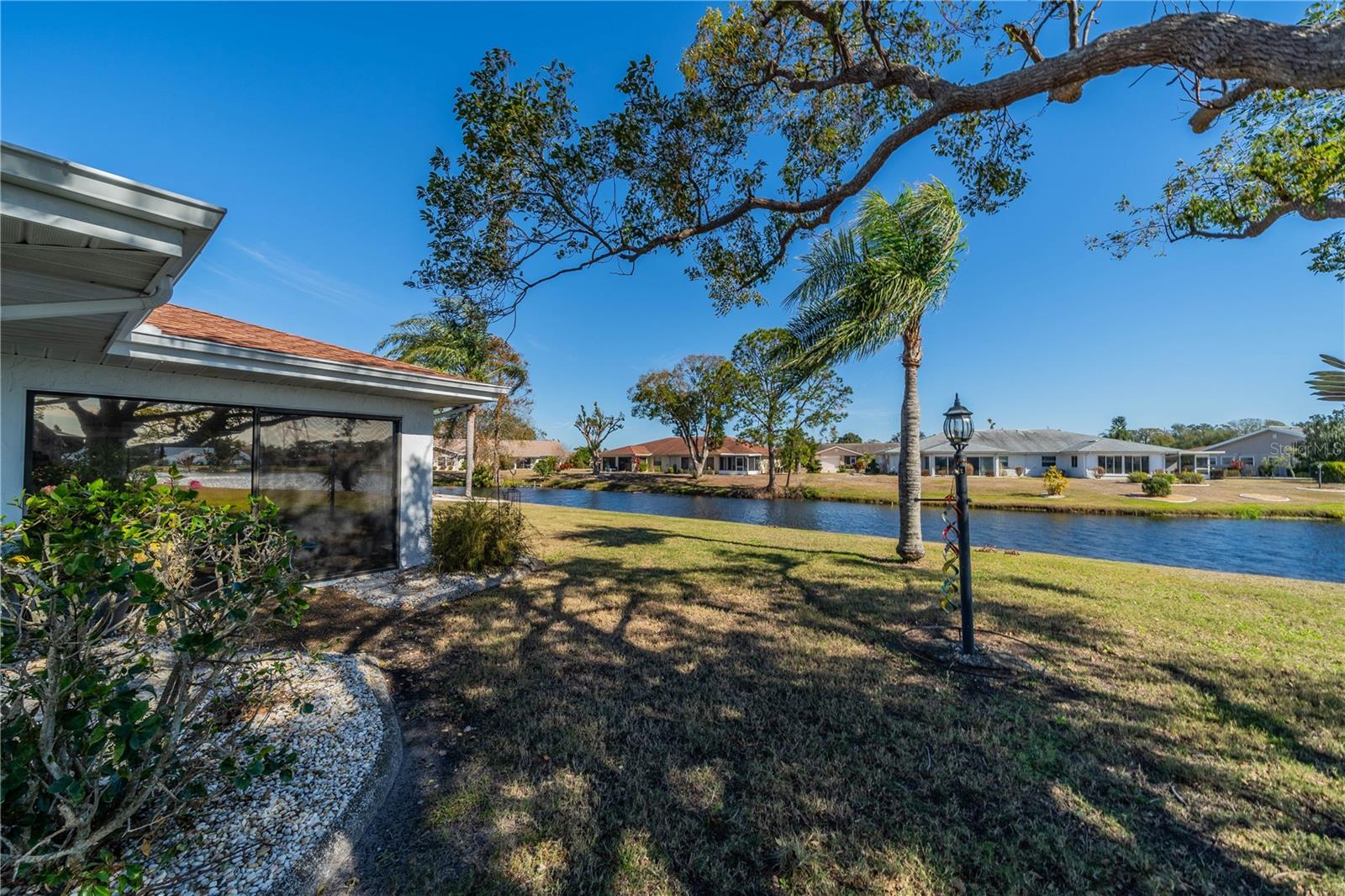 This one-of-a-kind Twintree model home, located in the quiet, serene Bluewater neighborhood is a must see. The minute you walk in, you’ll experience the warm inviting feeling of this home. The rich wood flooring throughout the living room, dining room and den lead to the glass enclosed, heat/AC, lanai with a fabulous view of one of the Acacia Lakes in the backyard. The pocket doors to each bedroom ensuite give added privacy for you and your guests. The reimagined kitchen will delight any chef. The Hickory cabinets with soft close doors and drawers and ample counter space are timeless. There are two lazy susan’s and several pull-out shelves in the lower cabinets. The lovely glass backsplash adds a touch of class. The French door refrigerator has been recessed into the garage offering more floor space and countertop. While washing your dishes enjoy the awesome view of the birds on the backyard pond. The raised counter offers eating space for four. The laundry room off the kitchen has a utility sink and an abundance of extra storage including a pantry, closet, and cabinets over the washer and dryer. The included window treatments are high quality pleated blinds. The home is equipped with a whole house Culligan water treatment system and the lawn is watered from the pond which saves on cost of water. This home is truly a delight. Come see for yourself.