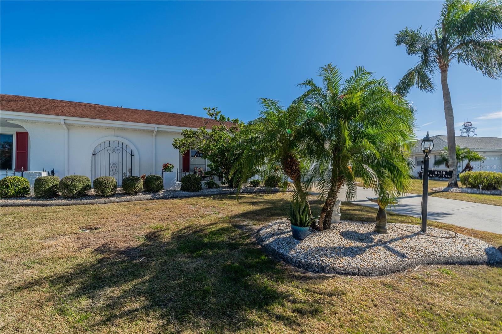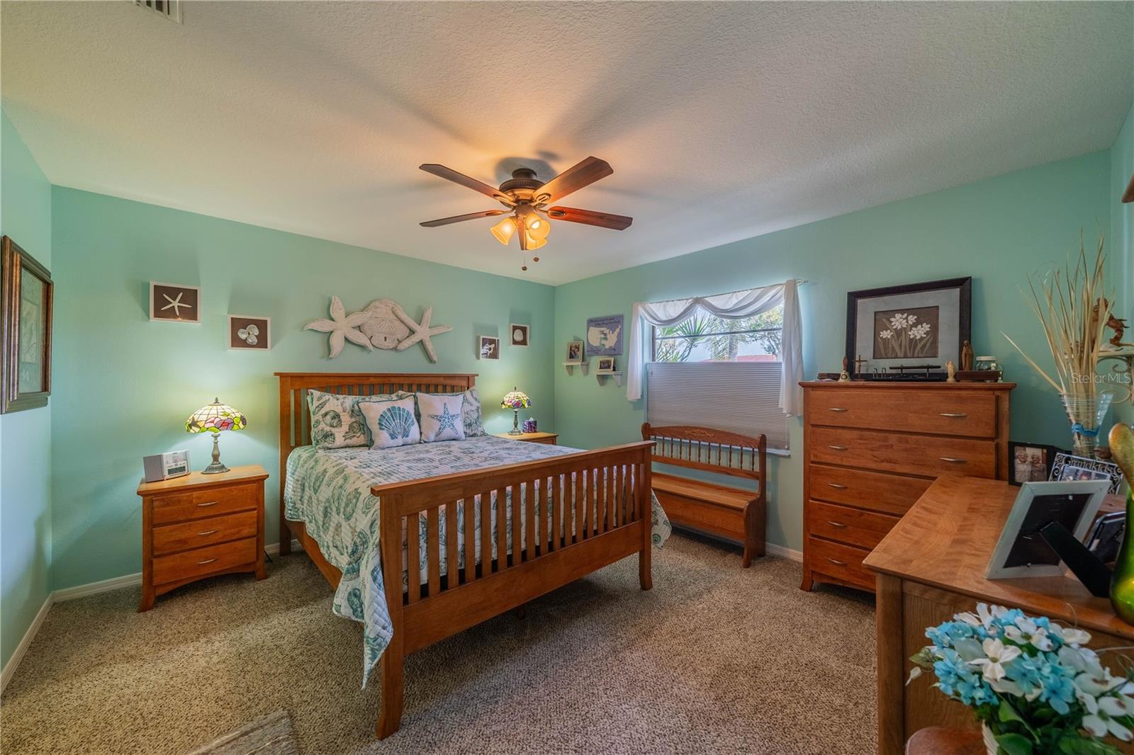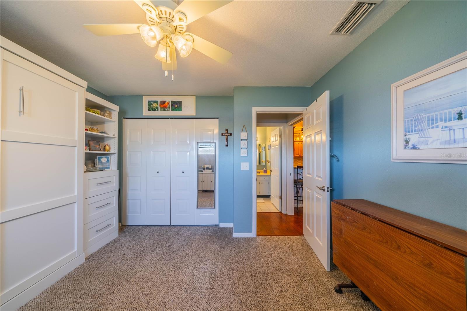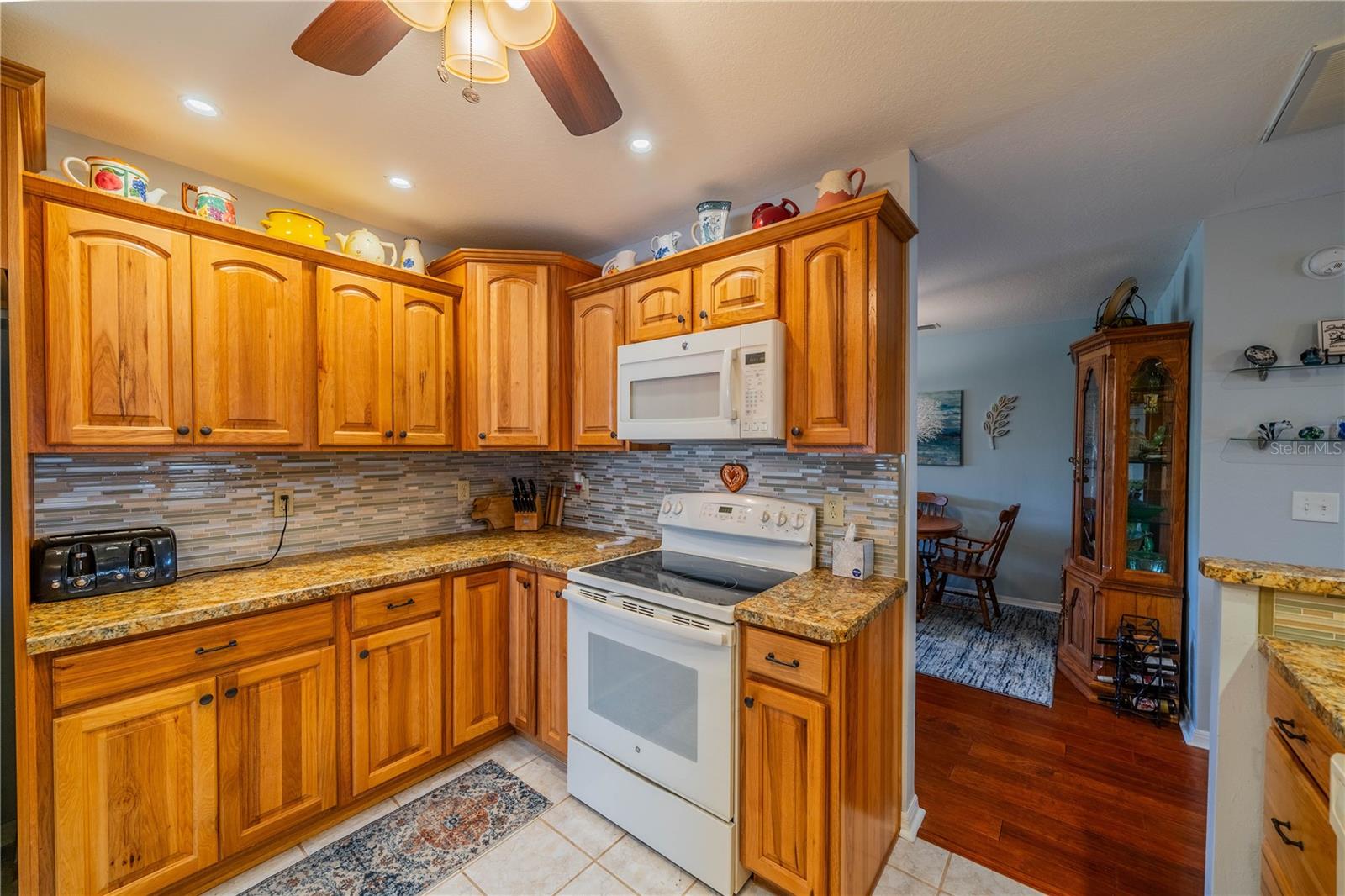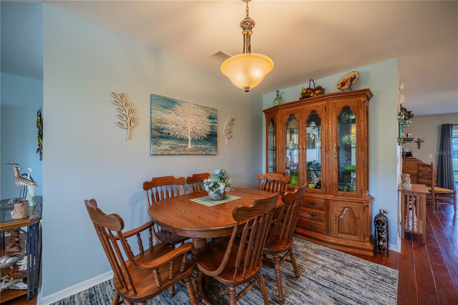 This one-of-a-kind Twintree model home, located in the quiet, serene Bluewater neighborhood is a must see. The minute you walk in, you’ll experience the warm inviting feeling of this home. The rich wood flooring throughout the living room, dining room and den lead to the glass enclosed, heat/AC, lanai with a fabulous view of one of the Acacia Lakes in the backyard. The pocket doors to each bedroom ensuite give added privacy for you and your guests. The reimagined kitchen will delight any chef. The Hickory cabinets with soft close doors and drawers and ample counter space are timeless. There are two lazy susan’s and several pull-out shelves in the lower cabinets. The lovely glass backsplash adds a touch of class. The French door refrigerator has been recessed into the garage offering more floor space and countertop. While washing your dishes enjoy the awesome view of the birds on the backyard pond. The raised counter offers eating space for four. The laundry room off the kitchen has a utility sink and an abundance of extra storage including a pantry, closet, and cabinets over the washer and dryer. The included window treatments are high quality pleated blinds. The home is equipped with a whole house Culligan water treatment system and the lawn is watered from the pond which saves on cost of water. This home is truly a delight. Come see for yourself.