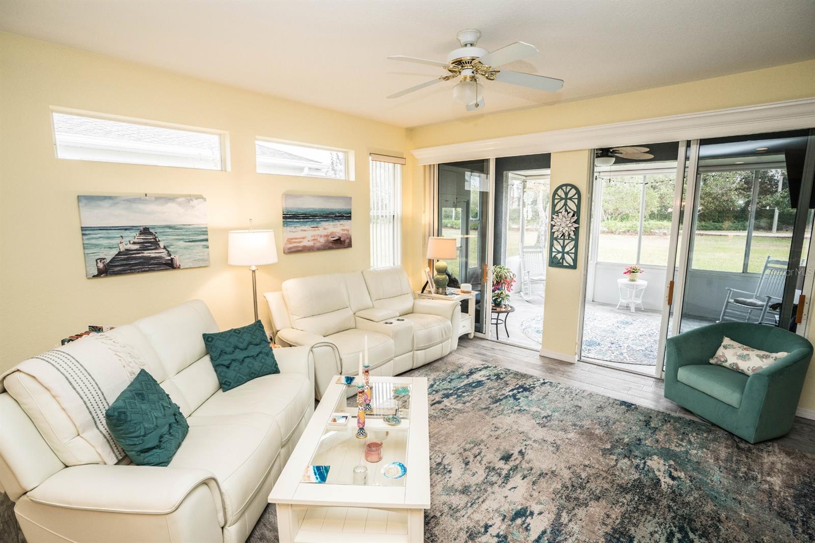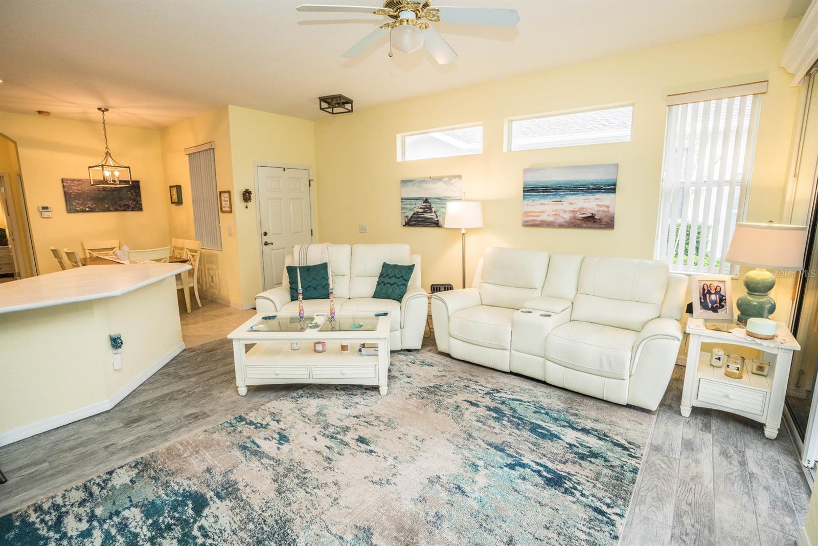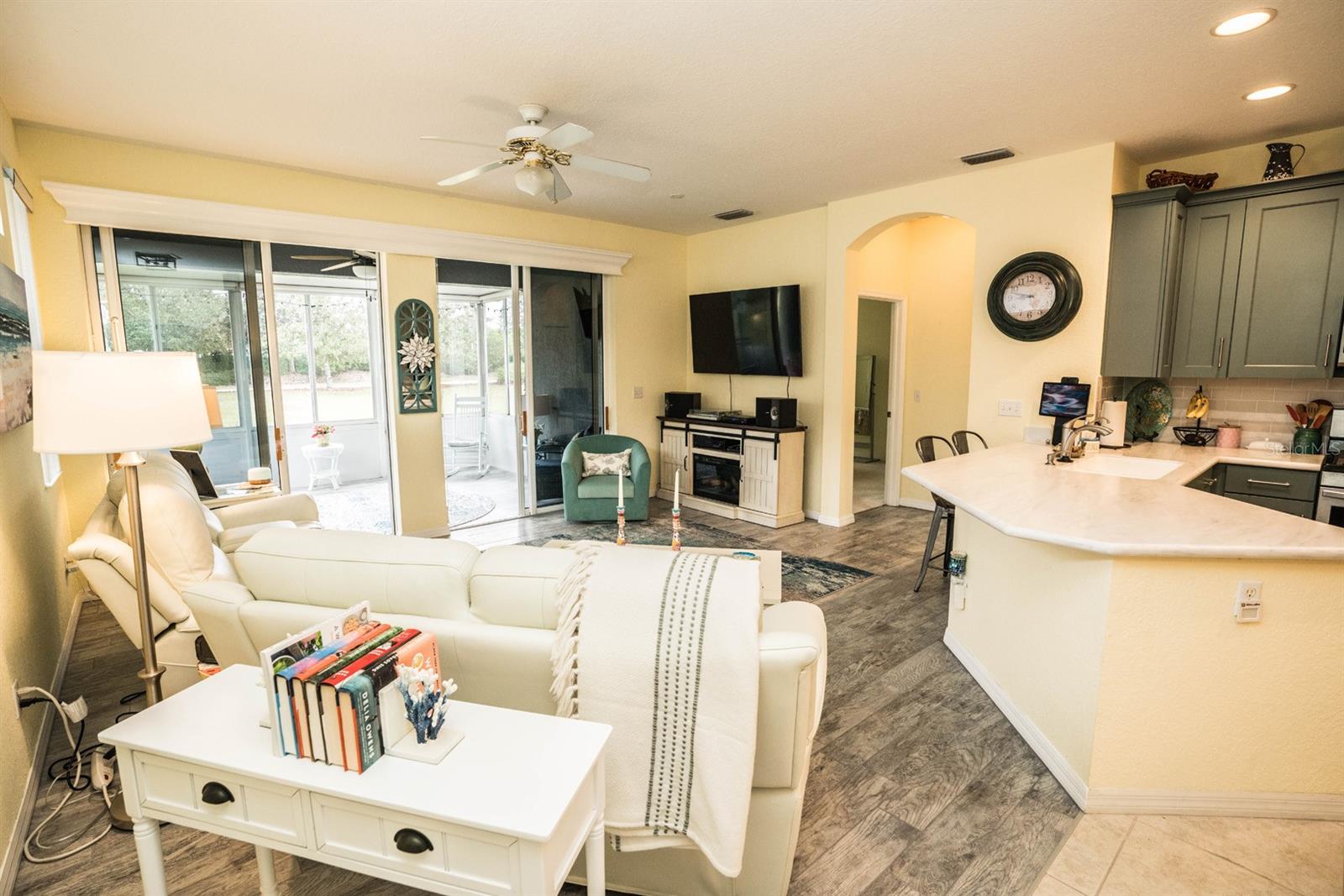 PRICE REDUCTION!!! Welcome to this beautifully maintained 3 bedroom, 2 bath, maintenance free condo in one of Florida's highest rated, 55 and over communities. The large open floorplan features wood plank tile in the great room, kitchen, lanai and bathrooms, with carpet in the 3 bedrooms. The primary bedroom has a large walk-in closet and an on suite bathroom. This chef's dream kitchen features, 42" cabinets, stainless steel appliances, light corian countertops with a breakfast bar, and a gas stove.. There is a reverse osmosis system for the sink and the refrigerator,. and a whole house water softener system. The extended enclosed lanai is under heat and air, with a wonderful pond view to enjoy your morning coffee. Kings Point is a 24hr gated, maintenance free, golf cart community, with 5 swimming pools. 3 outdoor and 2 indoor all heated. There are over 200 activities and clubs to participate in or join, ranging from pickleball, tennis, arts and crafts, gardening, ceramics and anything else you can think of. Located between Tampa and Sarasota you are only a short drive to airports, fine dining, and world class beaches. Schedule your showing today.