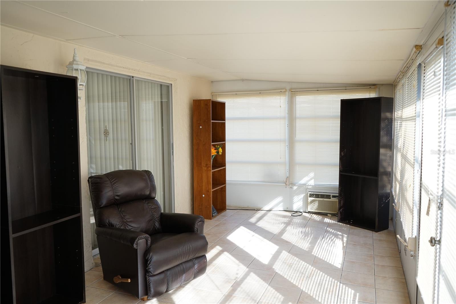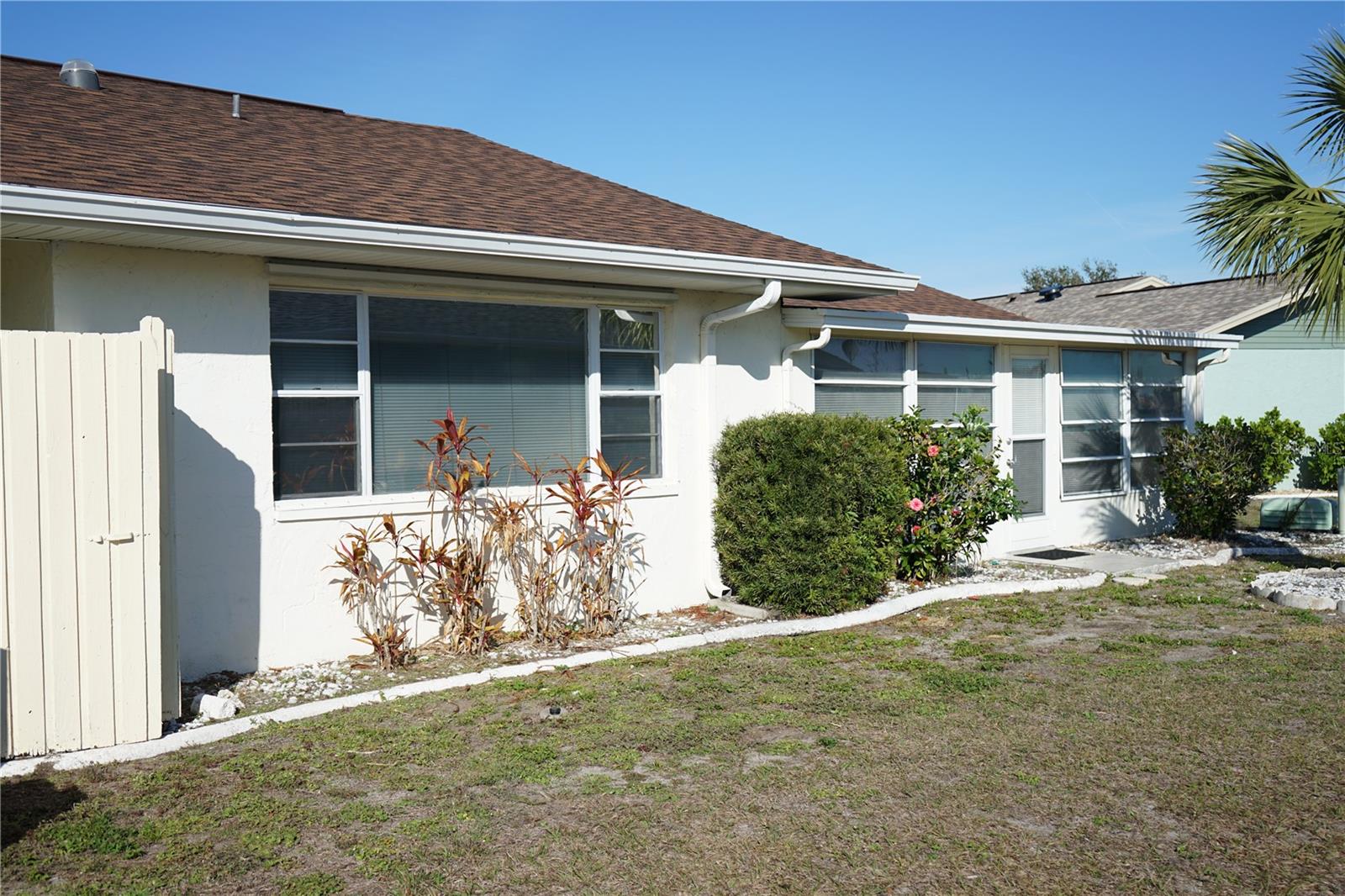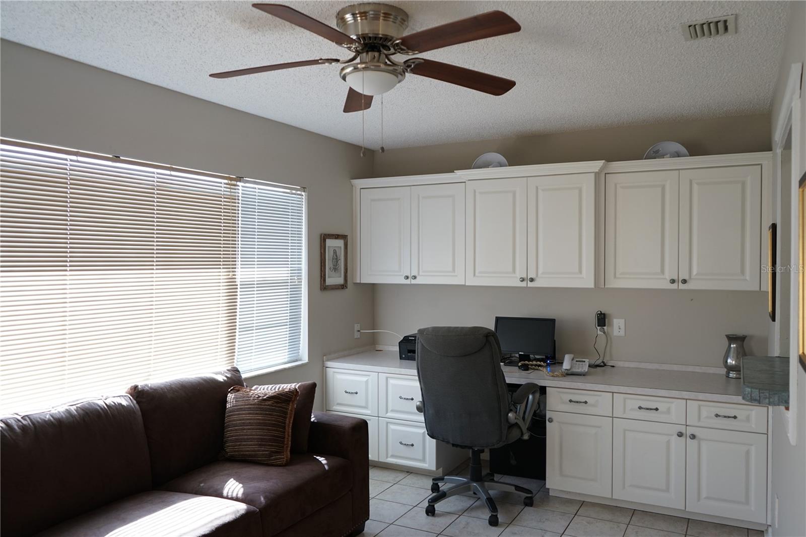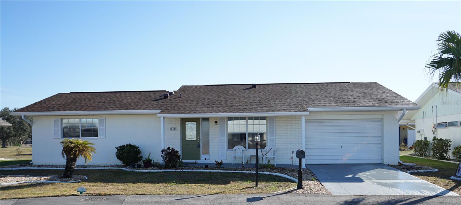 This home is located on a cul de sac and close to the clubhouse and shopping when needed. There is a front porch to enjoy your morning coffee taking you into the living area with laminate flooring. There is tile in the dining and kitchen area with a family room behind here with built in shelving and a desk. Through the sliding doors is a large lanai where you can set up another office or a hobby area. The two bedrooms are a good size and the primary has a walk in closet. There is a one car garage with a laundry room large enough to store beach gear or hobby supplies. A small fenced space out back will house your trash bins or bikes.